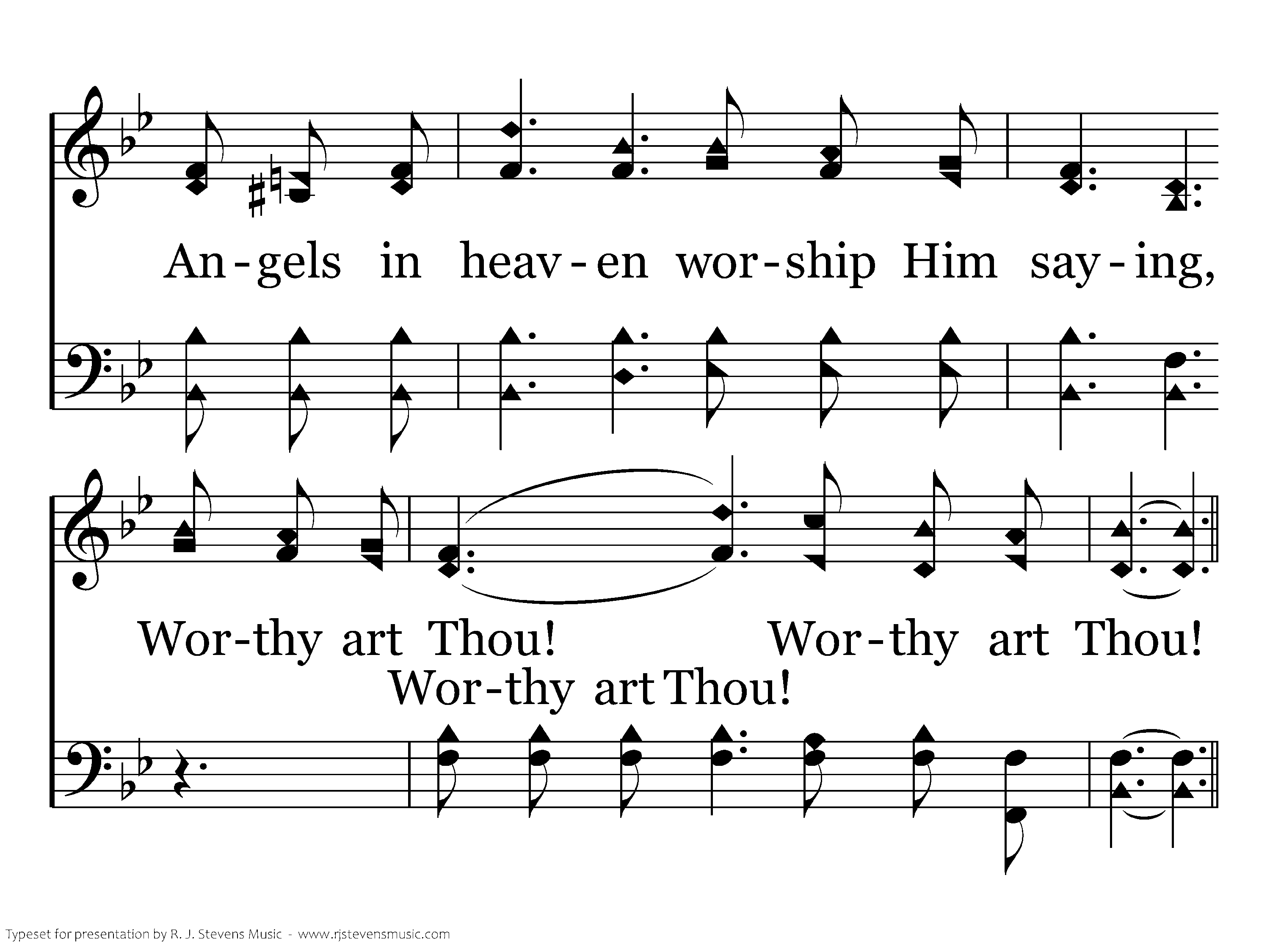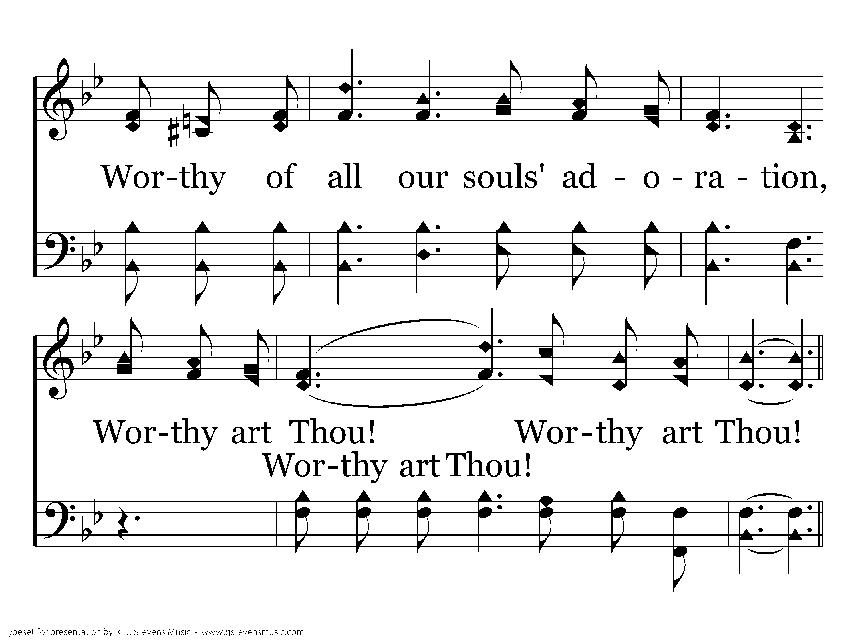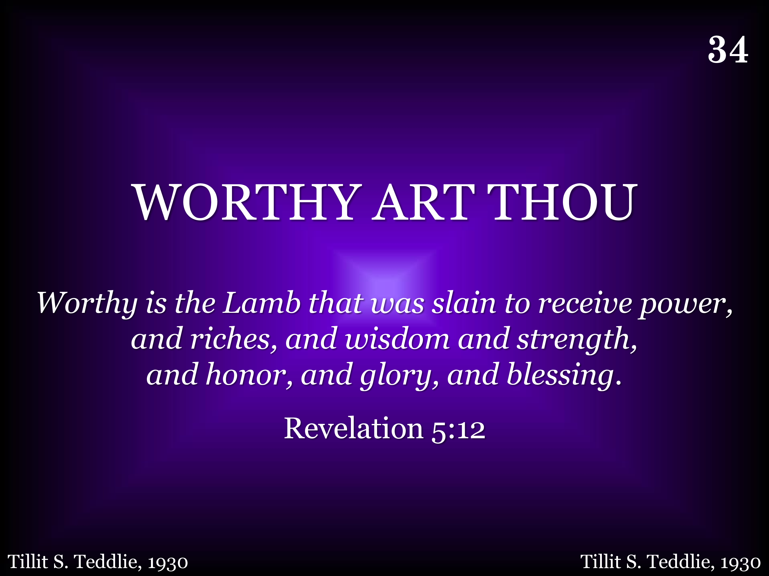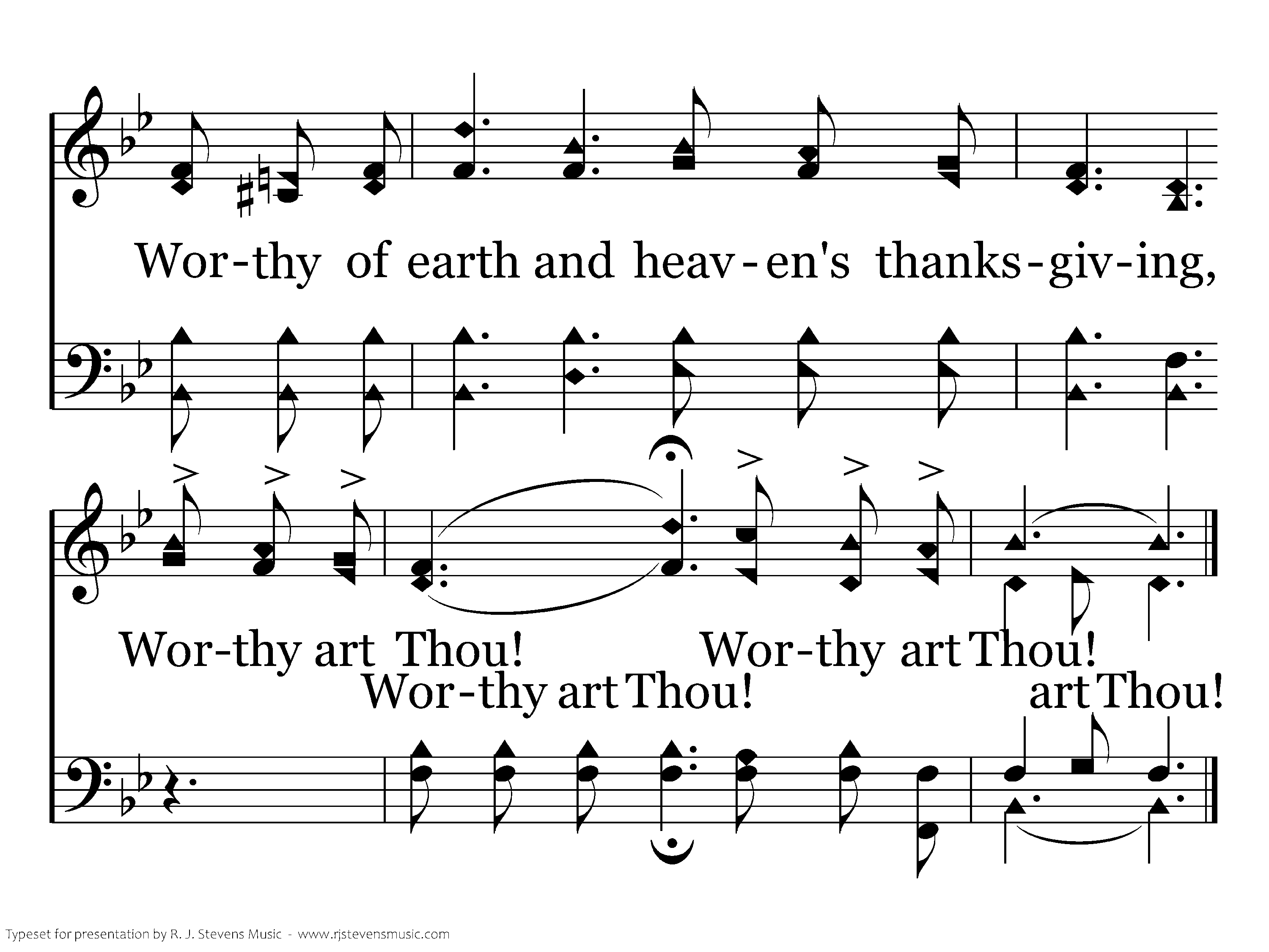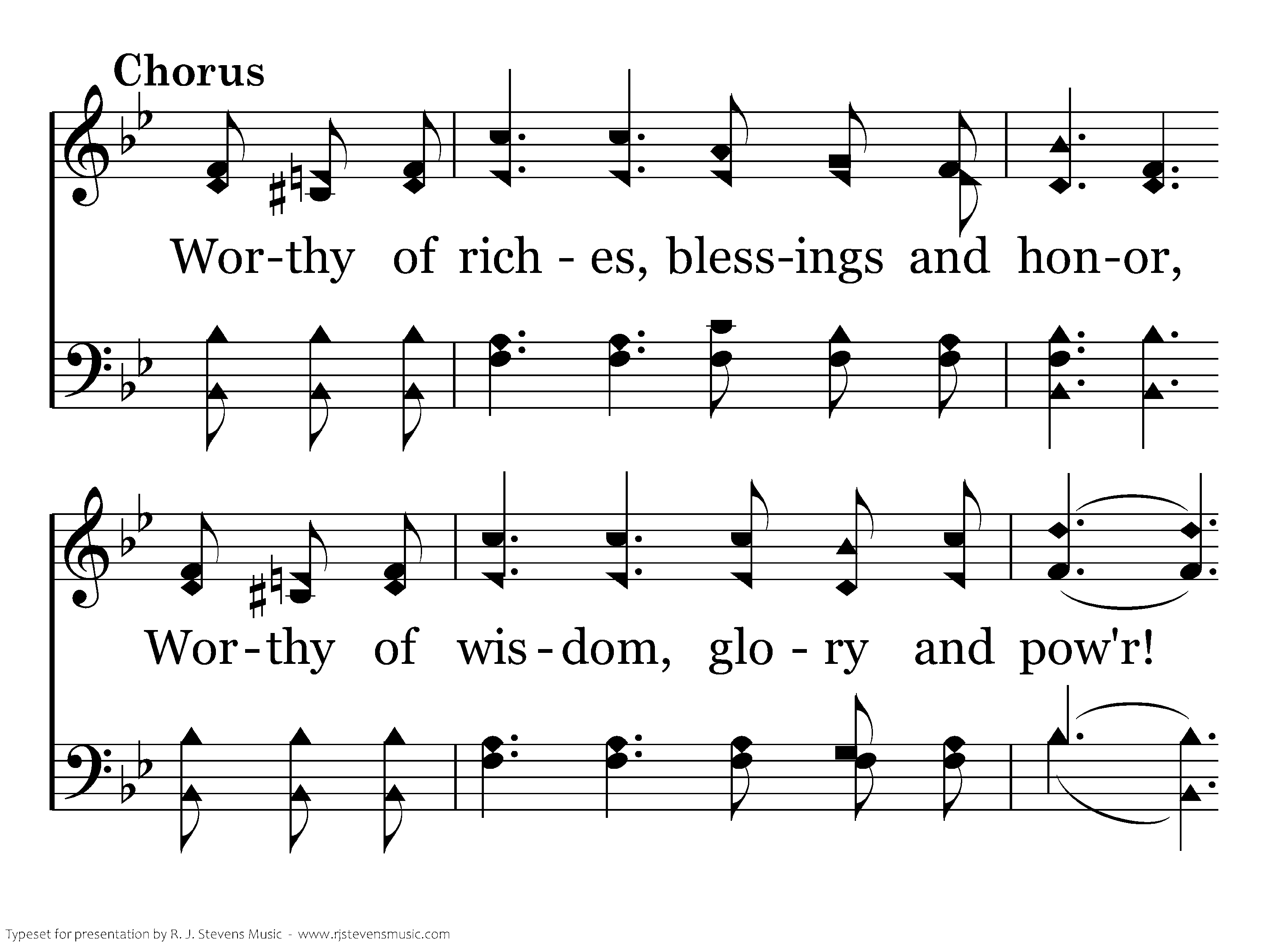 Worthy of riches, blessings and honor, worthy of wisdom, glory and pow'r! worthy of earth and heaven's thanksgiving worthy art Thou! Worthy art Thou!