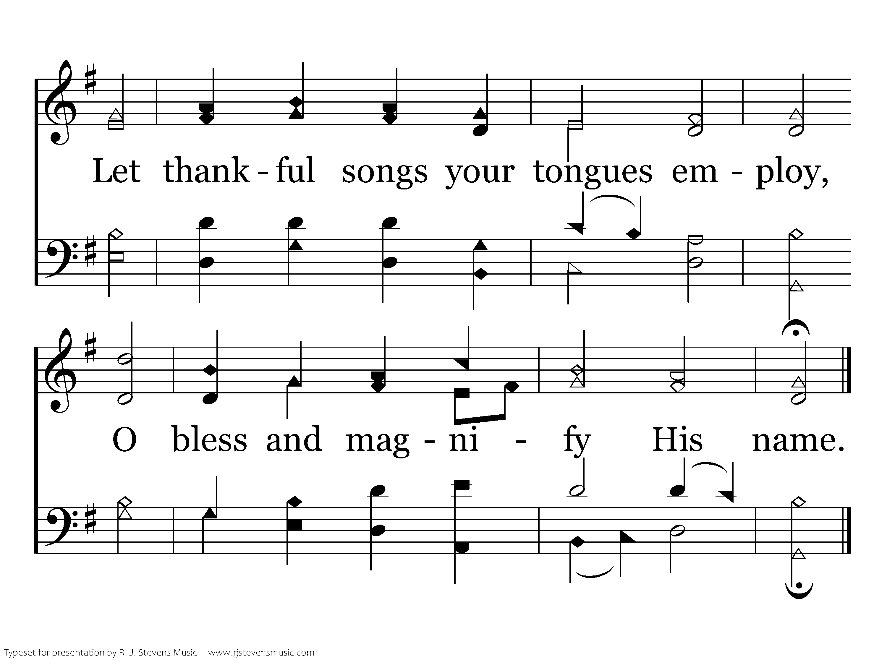 O enter then His gates with joy, Within His courts His praise proclaim: Let thankful songs your tongues employ, O bless and magnify His name.