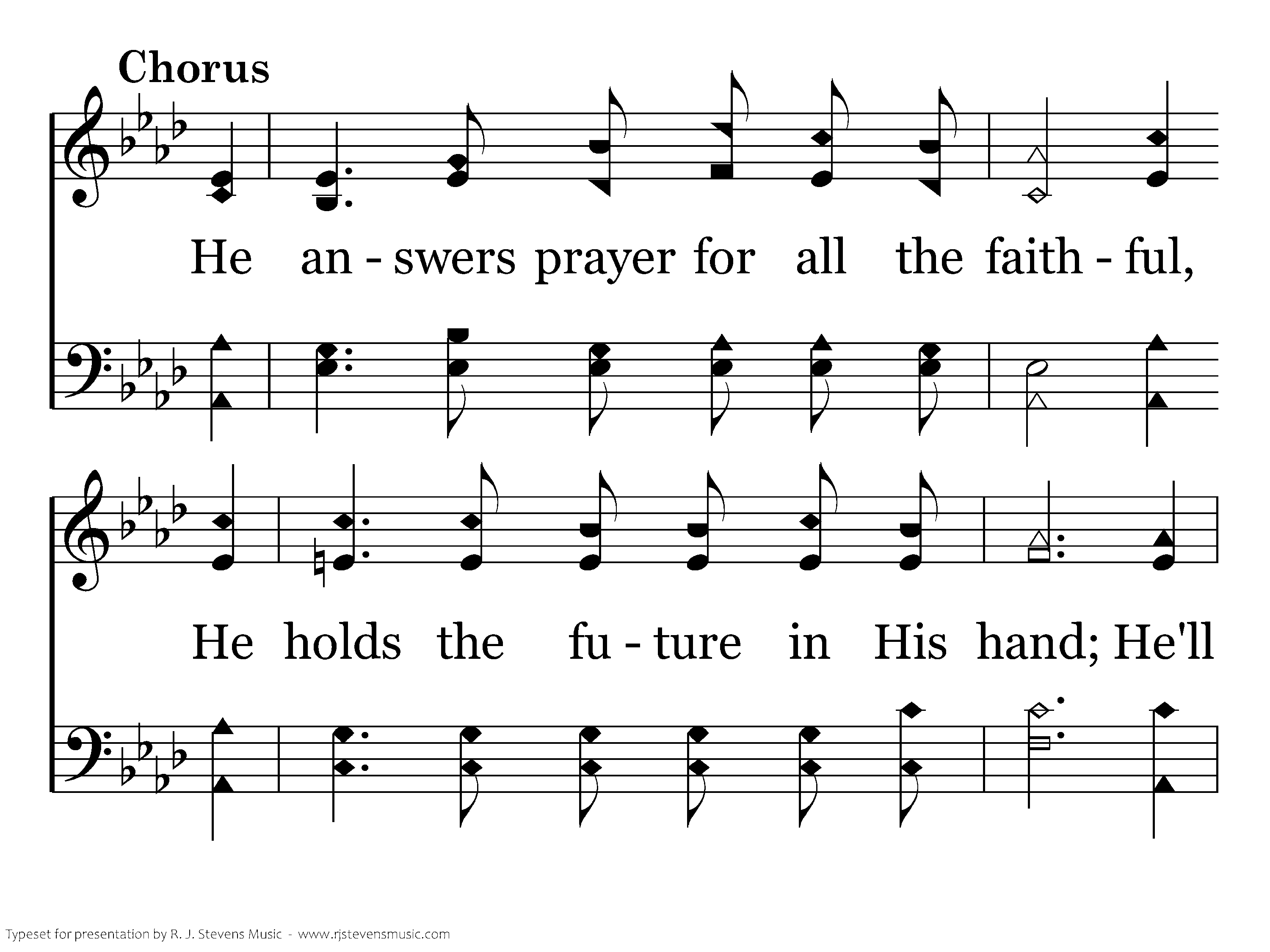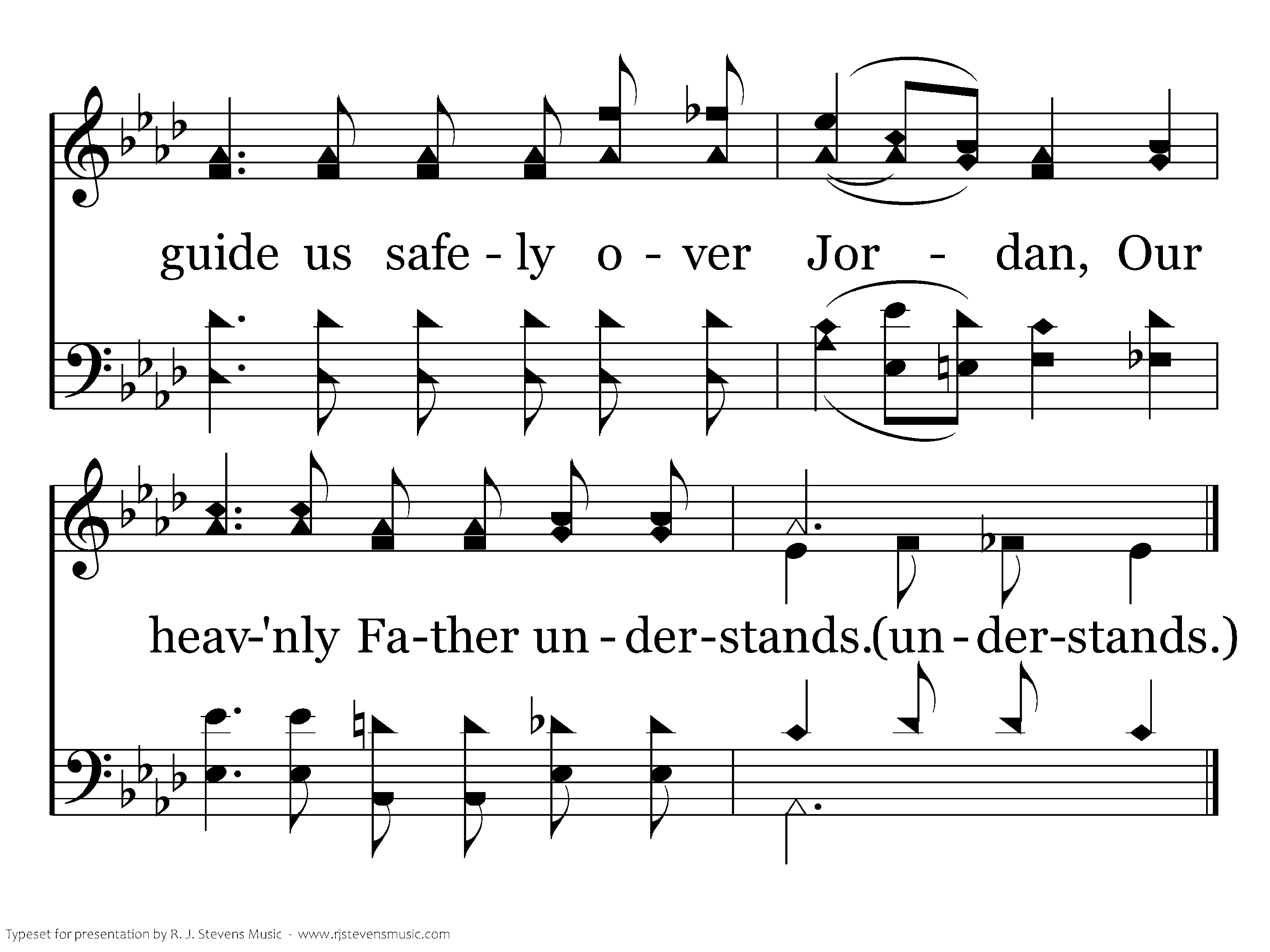 He answers prayer for all the faithful, He holds the future in His hand; He'll guide us safely over Jordan, Our heavenly Father understands, (understands.)