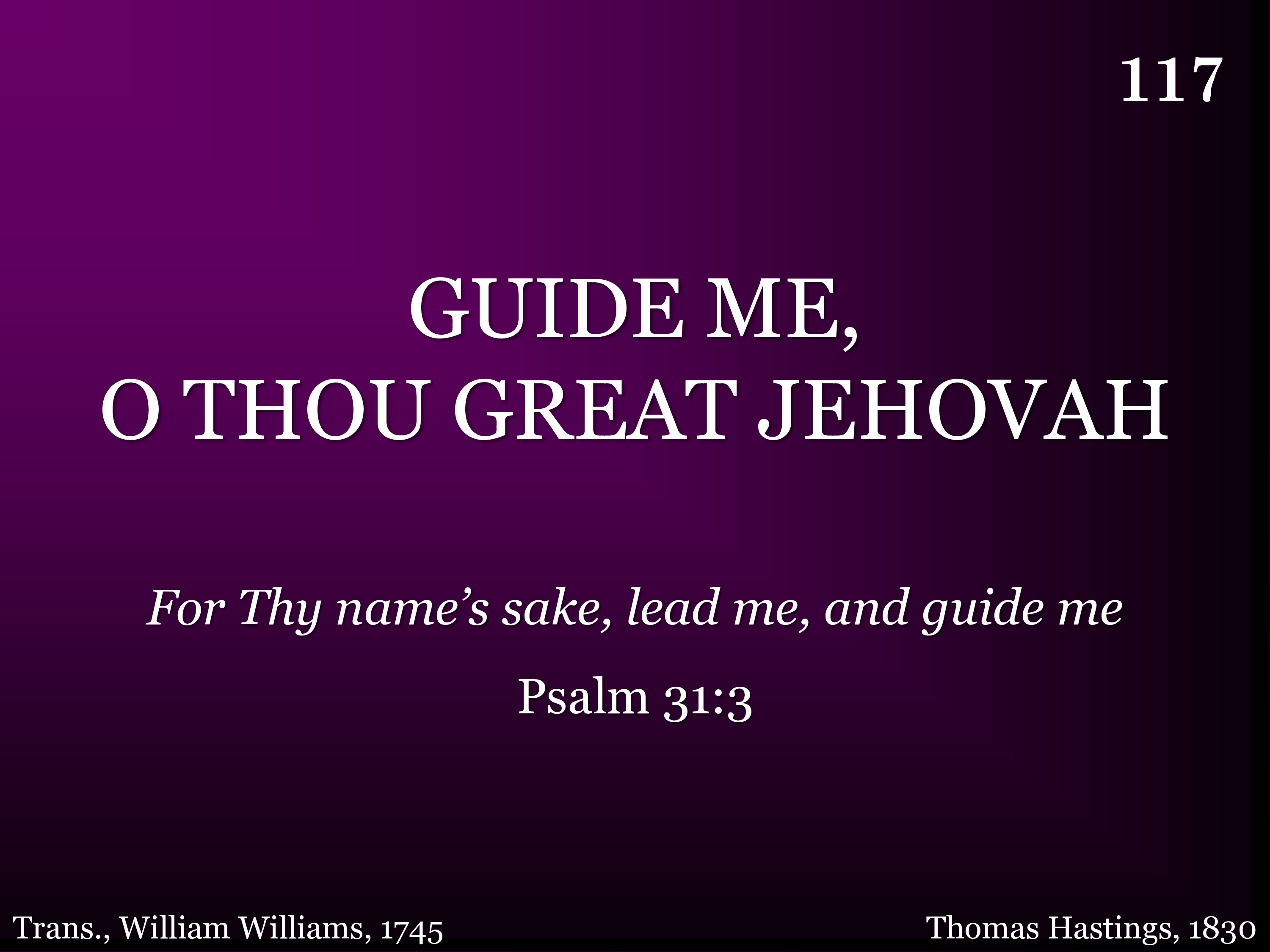 Guide me, O Thou great Jehovah, Pilgrim thru this barren land; I am weak, but Thou art mighty, Hold me with they powerful hand; Bread of heaven, Feed me till I want no more: Bread of heaven, Feed me till I want no more.