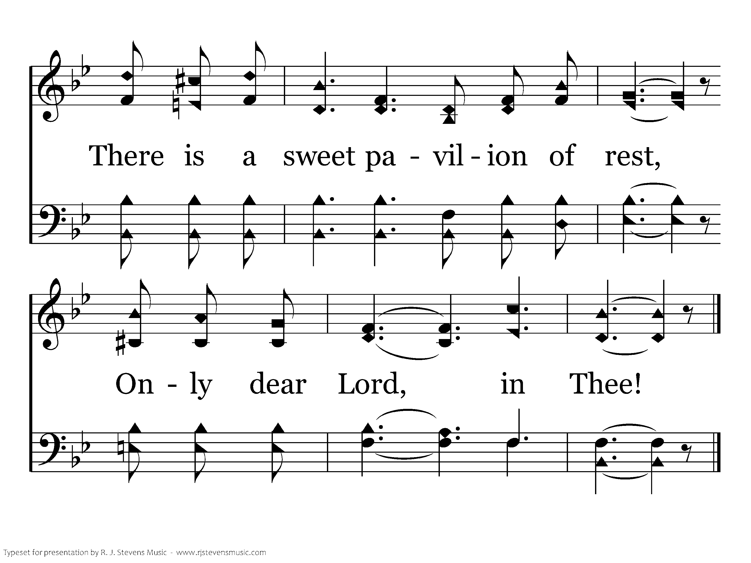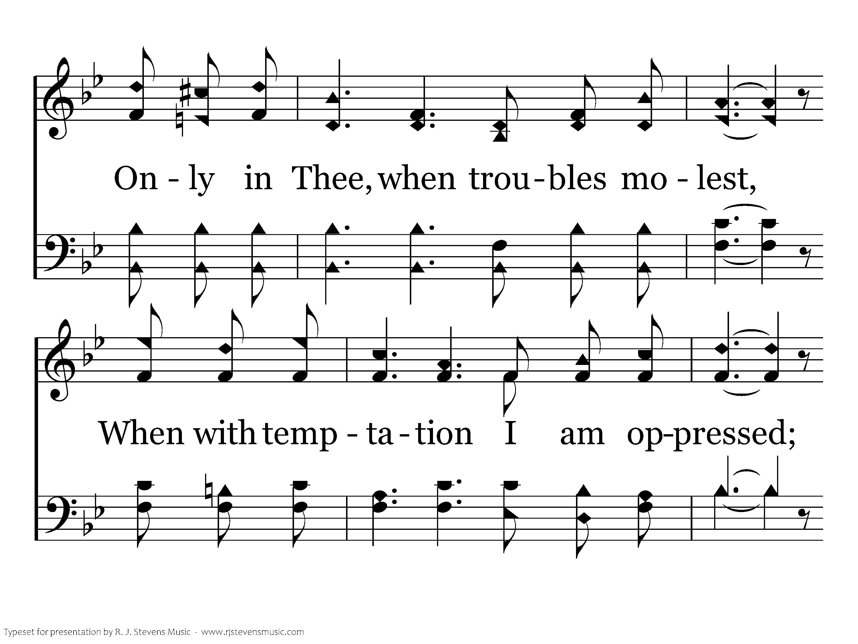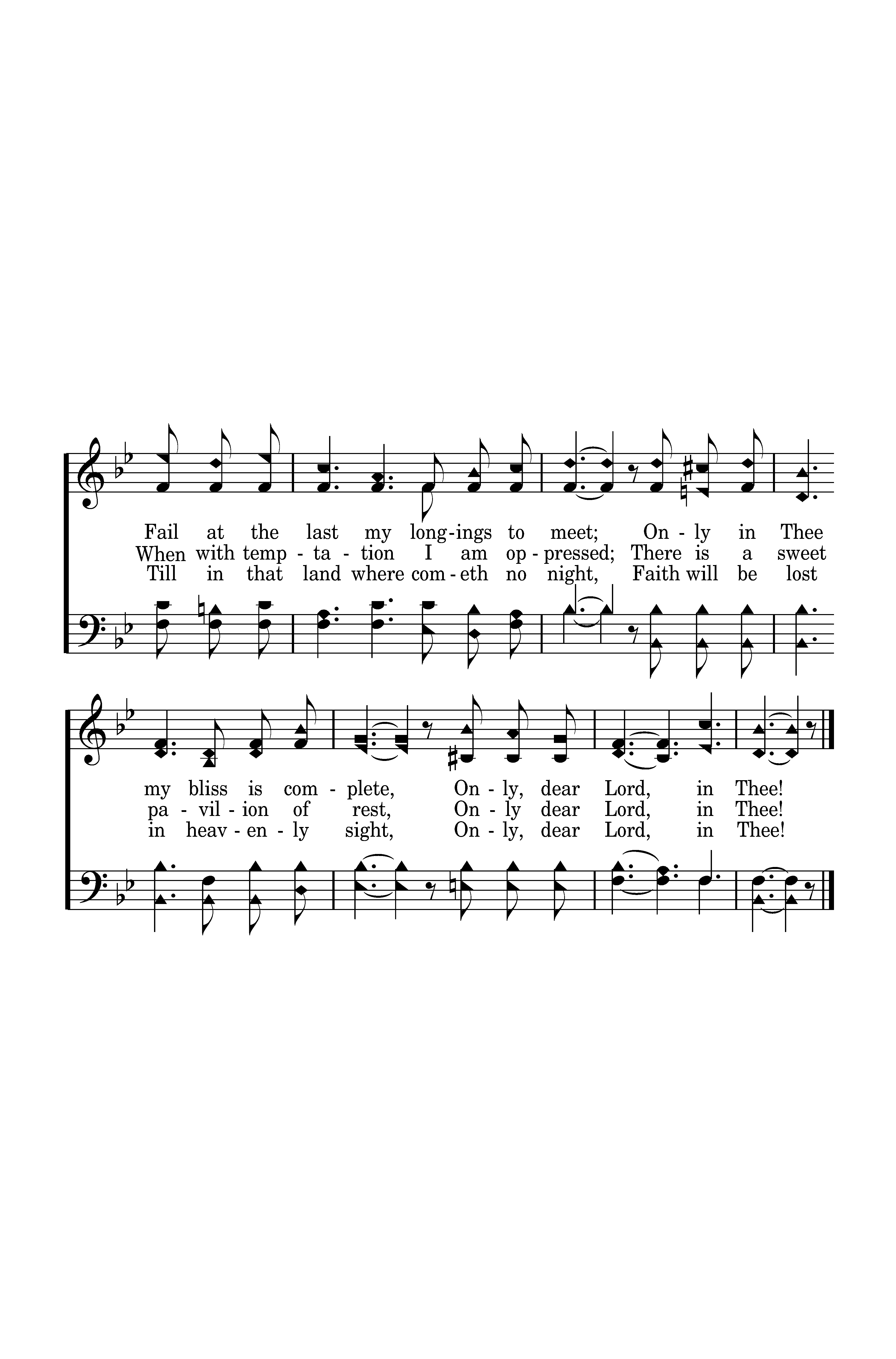 Only in Thee a radiance bright, Shines like a beacon in the night, Guiding my pilgrim bark aright, Over life's trackless sea. Only in Thee, when troubles molest, When with temptation I am oppressed; There is a sweet pavillion of rest, Only, dear Lord, in Thee!