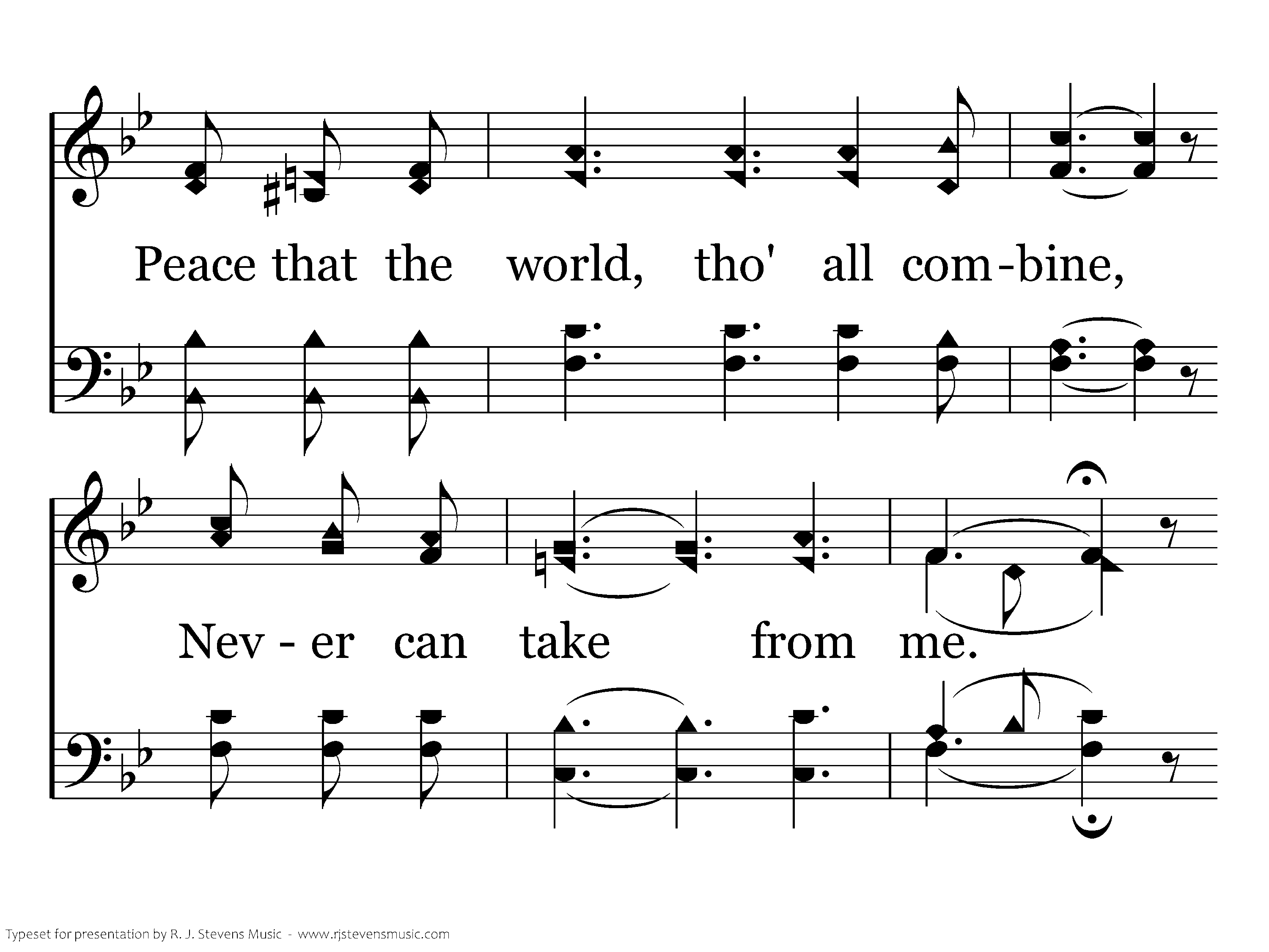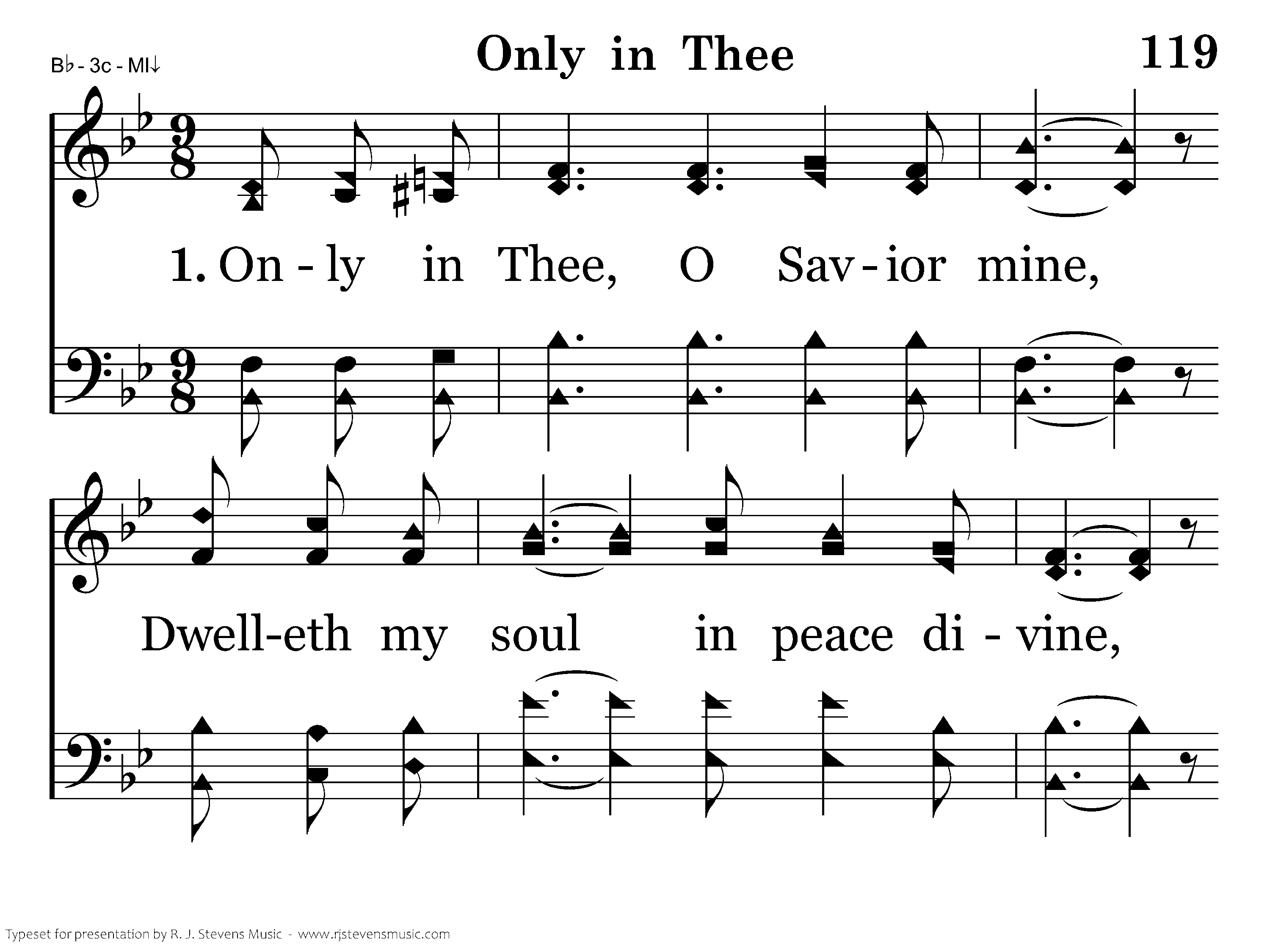 Only in Thee, O Savior mine, Dwelleth my soul in peace divine, Peace that the world, tho' all combine, Never can take from me. Pleasures of earth so seemingly sweet, Fail at the last my longing to meet; Only in Thee my bliss is complete, Only, dear Lord, in Thee!