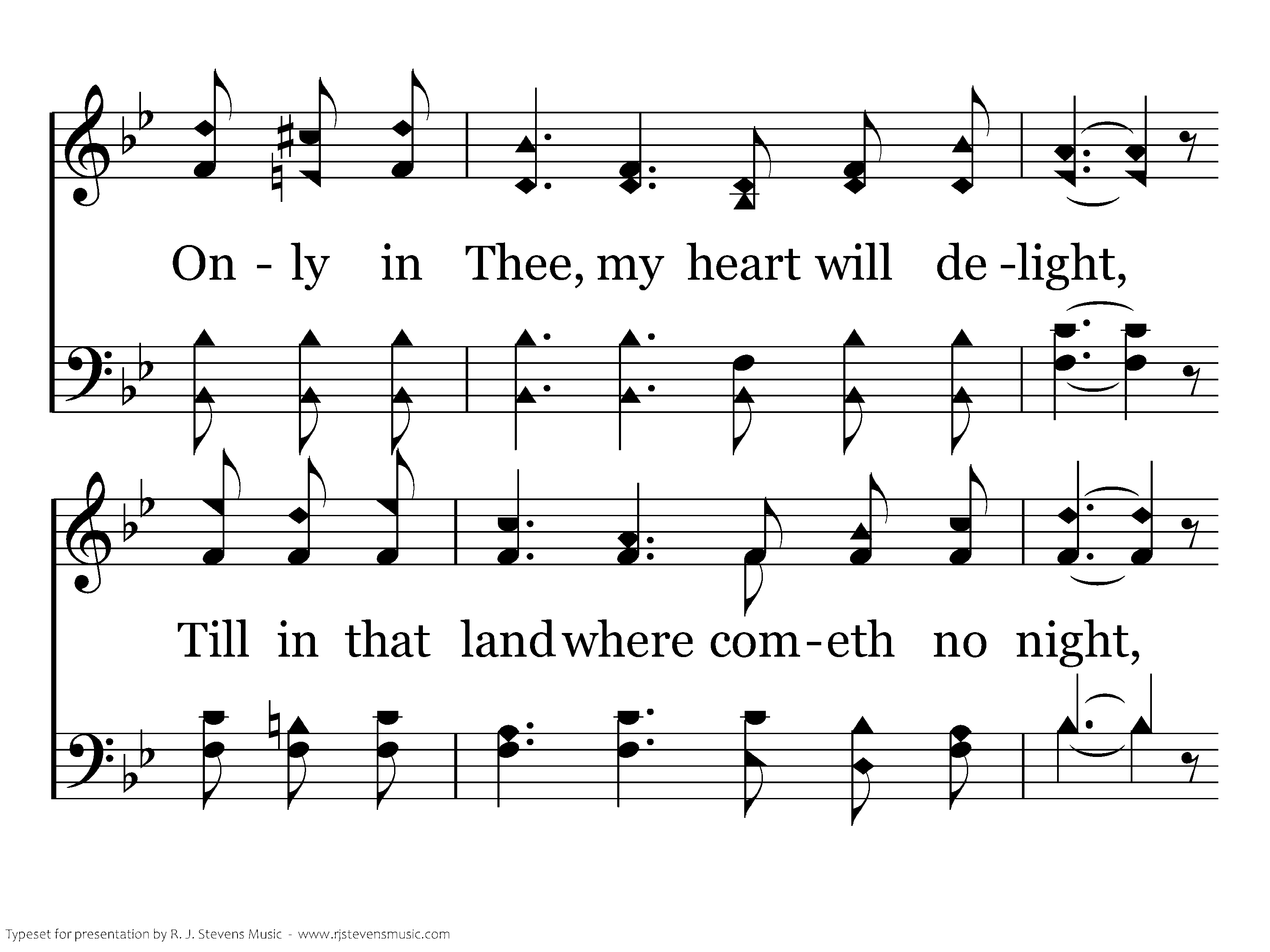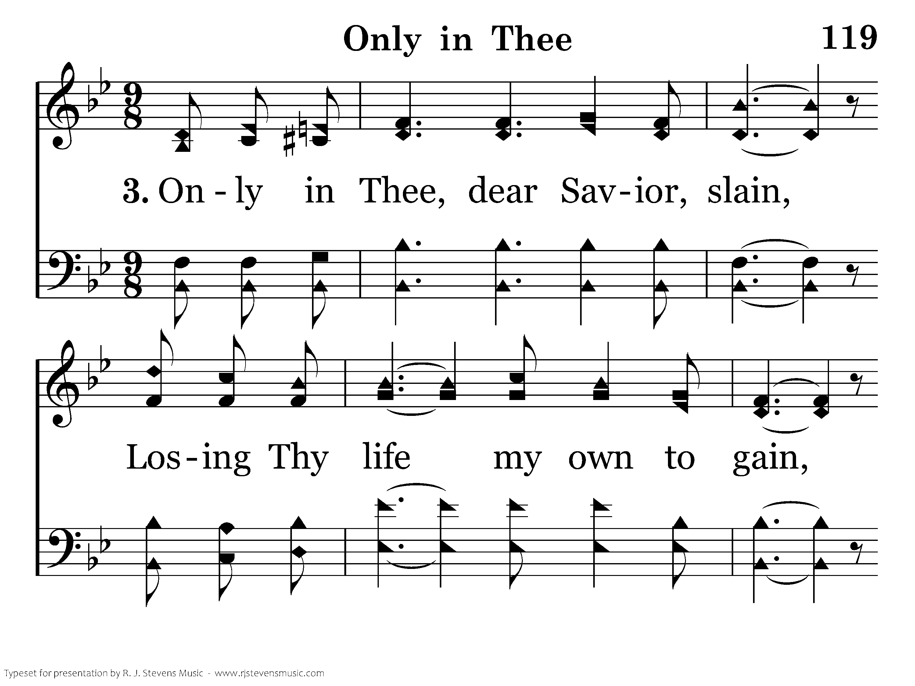 Only in Thee, dear Savior, slain, Losing Thy life my own to gain, Trusting, I'm cleansed from every stain; Thou art my only plea. Only in Thee, my heart will delight, Till in that land where cometh no night, Faith will be lost in heavenly sight, Only, dear Lord, in Thee!