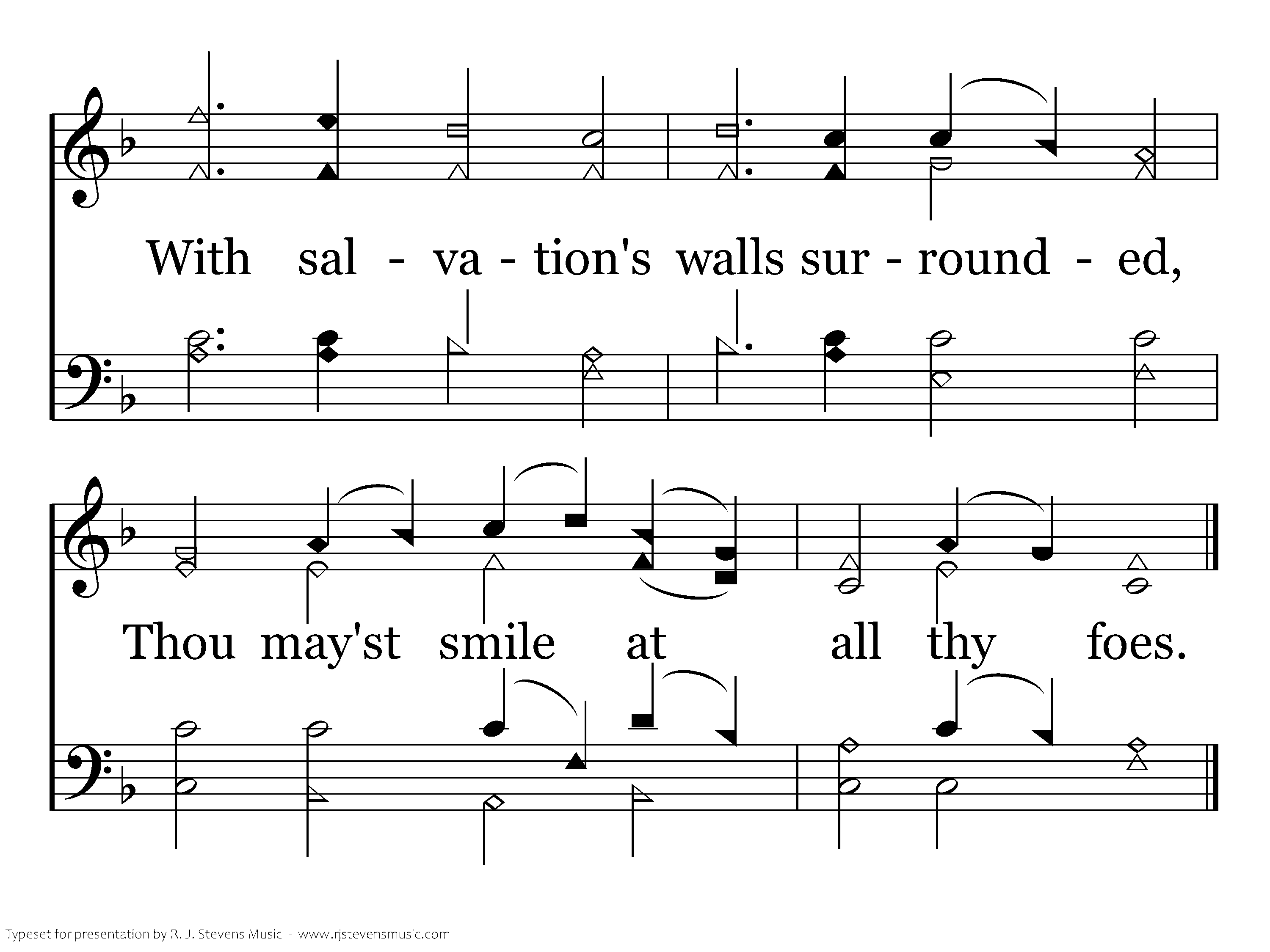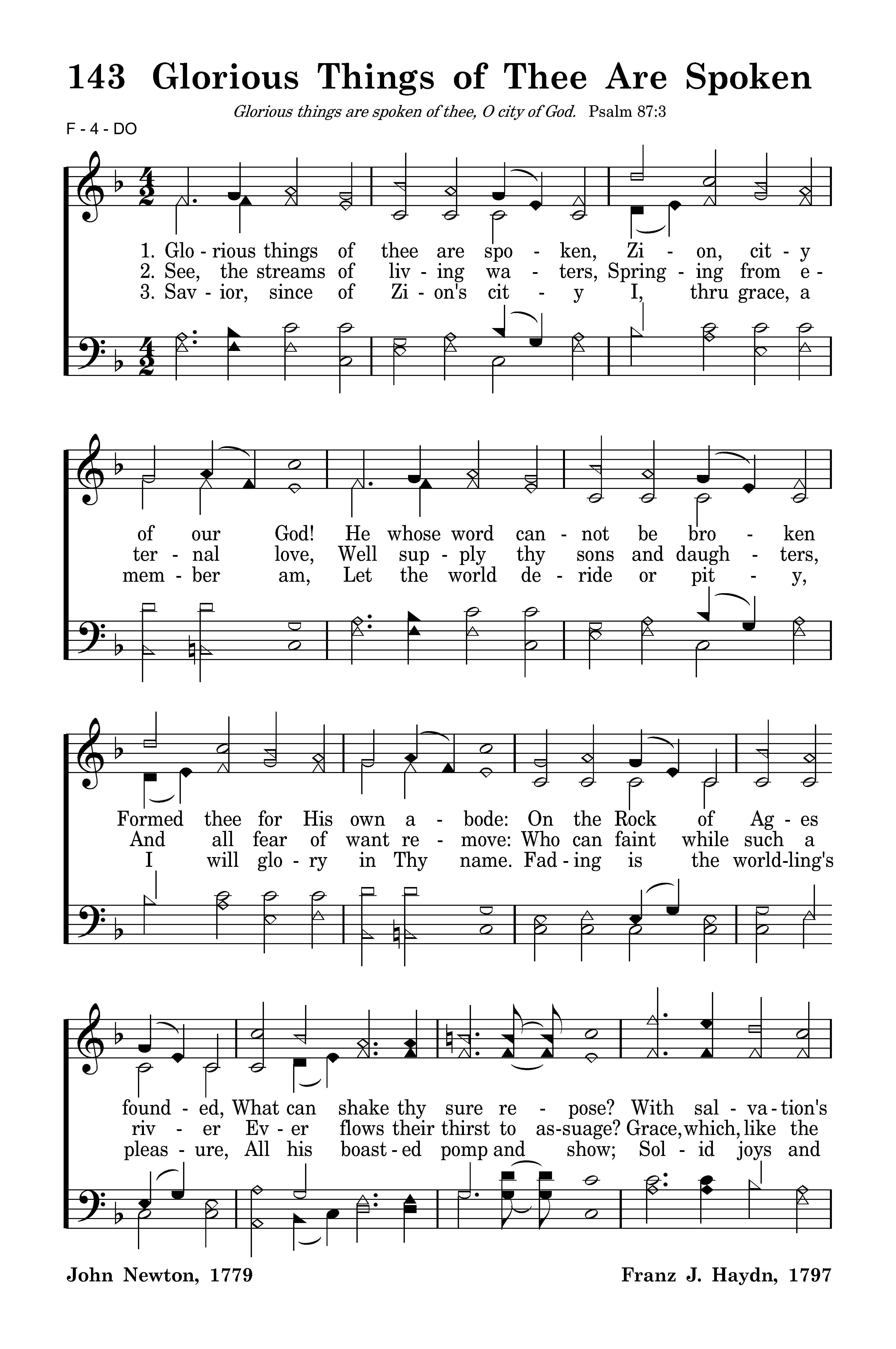 Glorious things of Thee are spoken, Zion, city of our God! He whose word cannot be broken Formed thee for His own abode: On the rock of ages founded, What can shake Thy sure repose? With salvation's walls surrounded, Thou may'st smile at all thy foes.