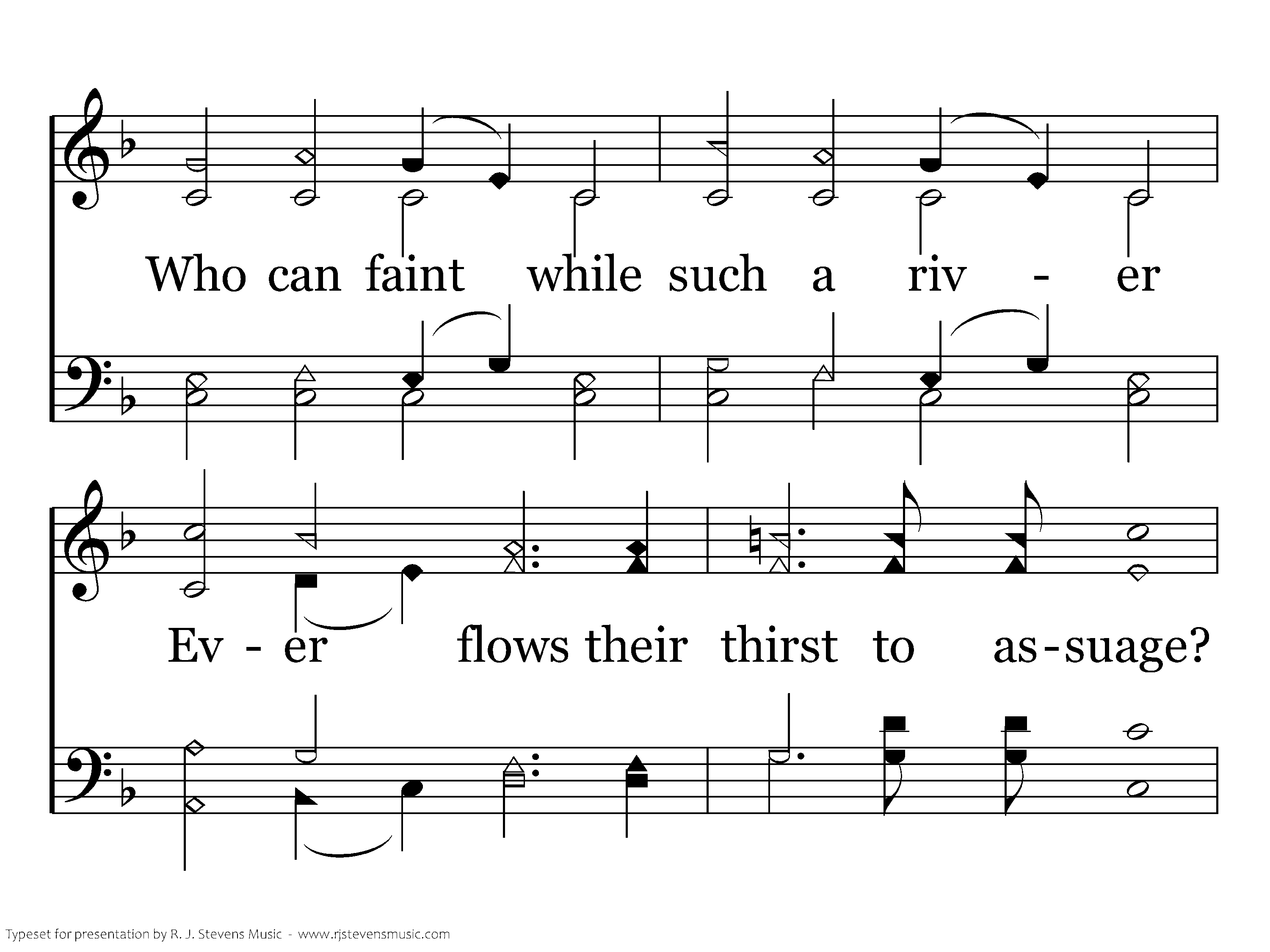 See, the streams of living waters, Springing from eternal love, Well supply the sons and daughters, And all fear and want remove: Who can faint while such a river Ever flows their thirst to assuage? Grace, which like the Lord the Giver, Never fails from age to age.