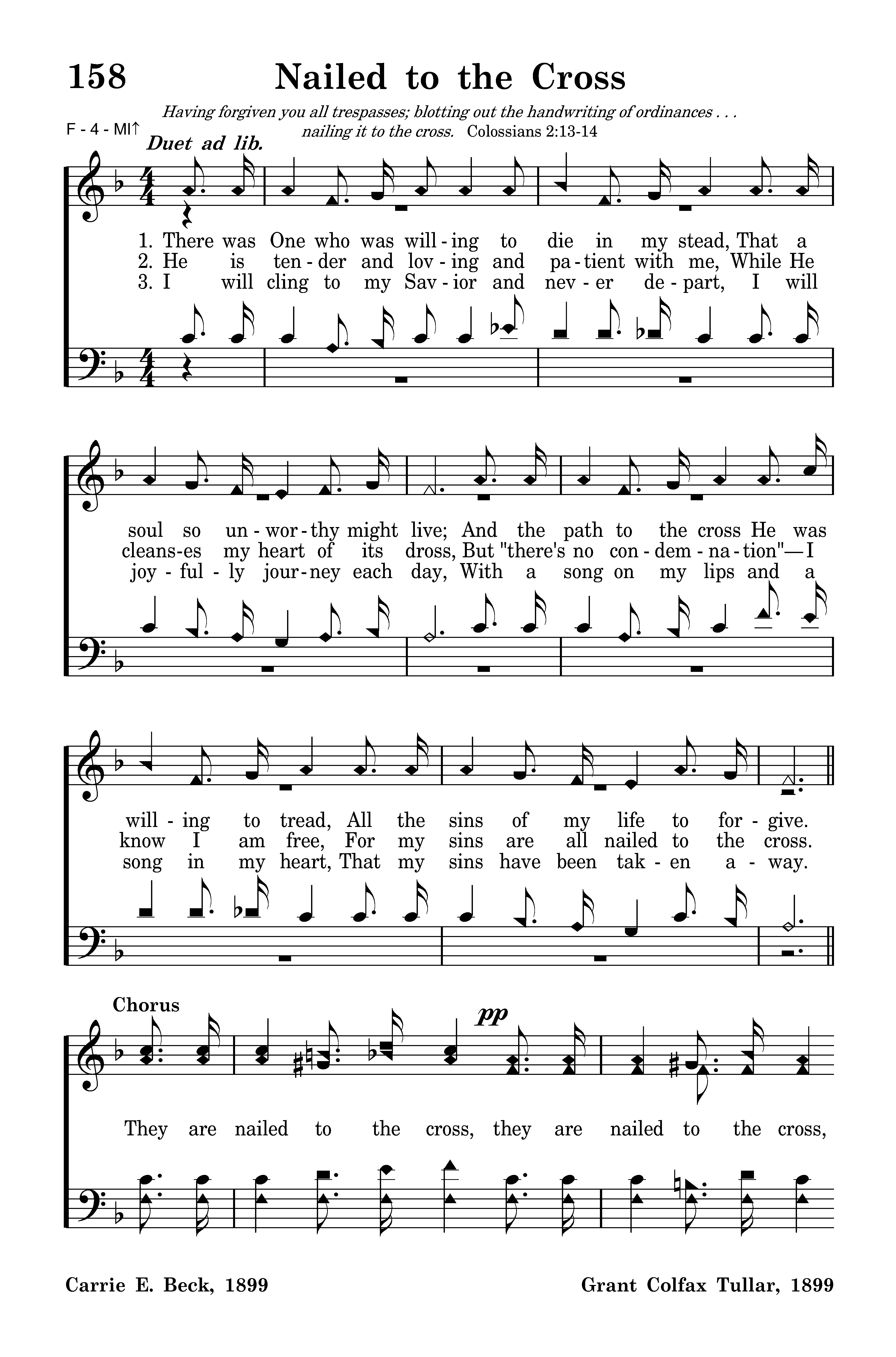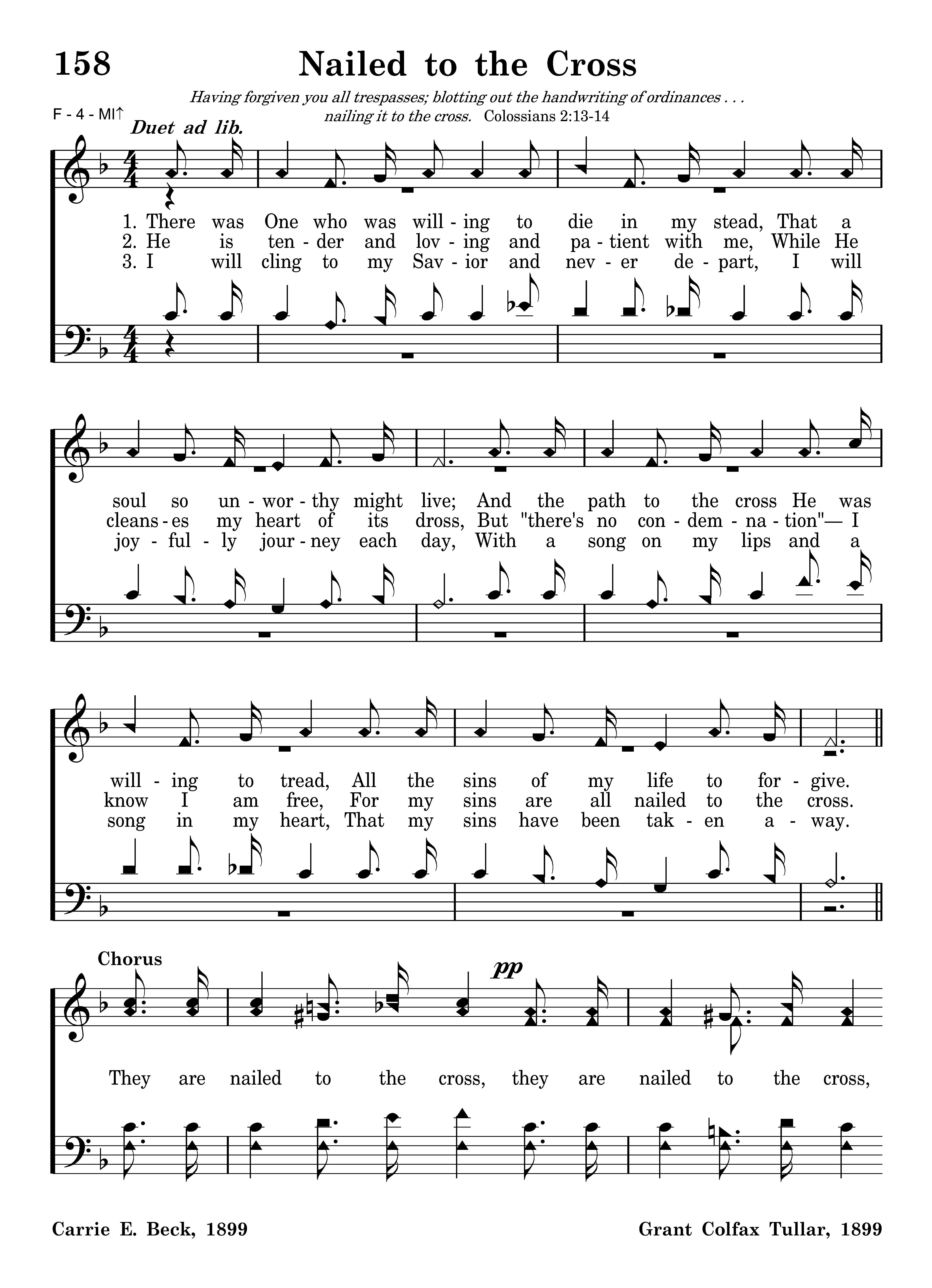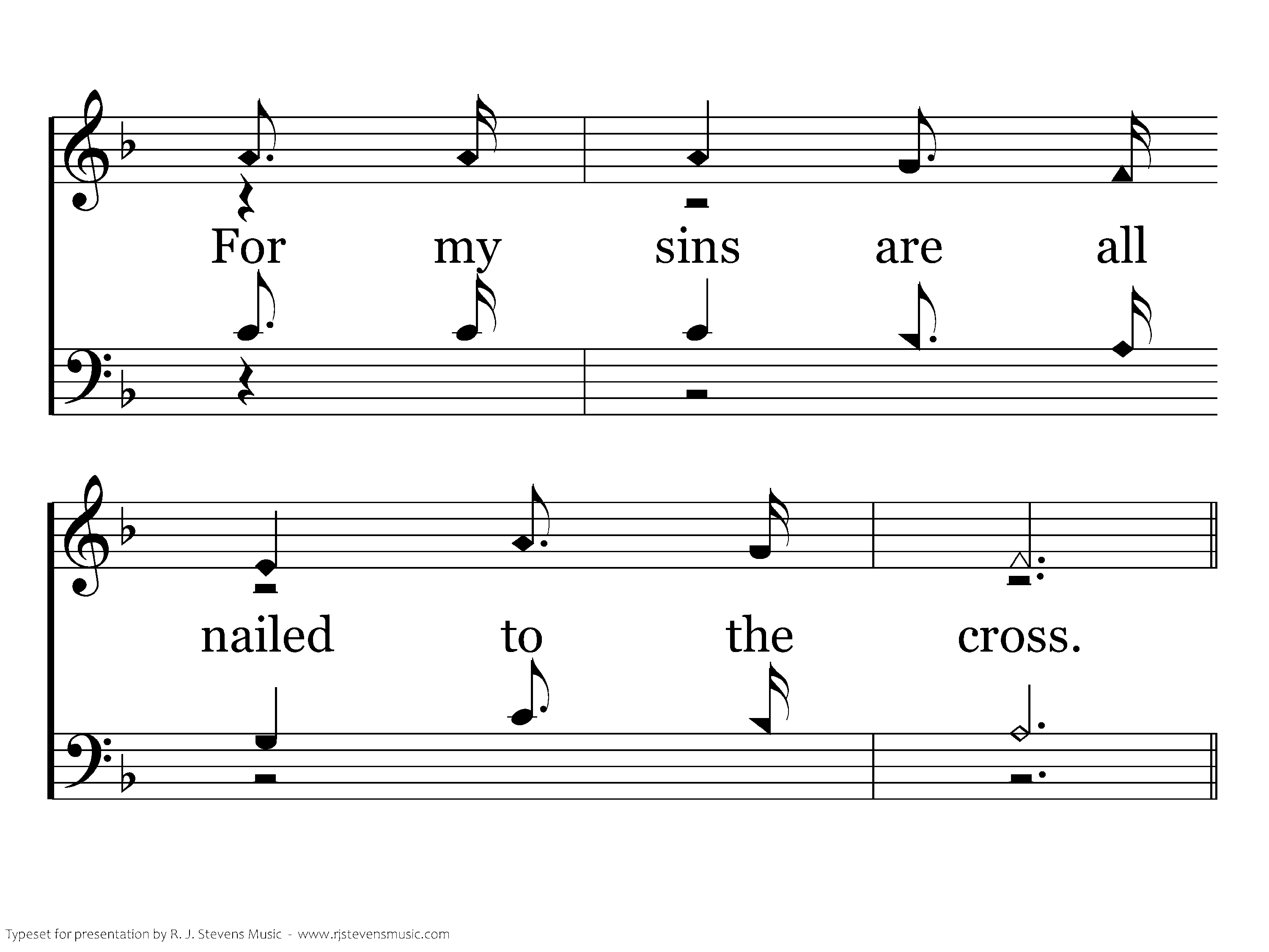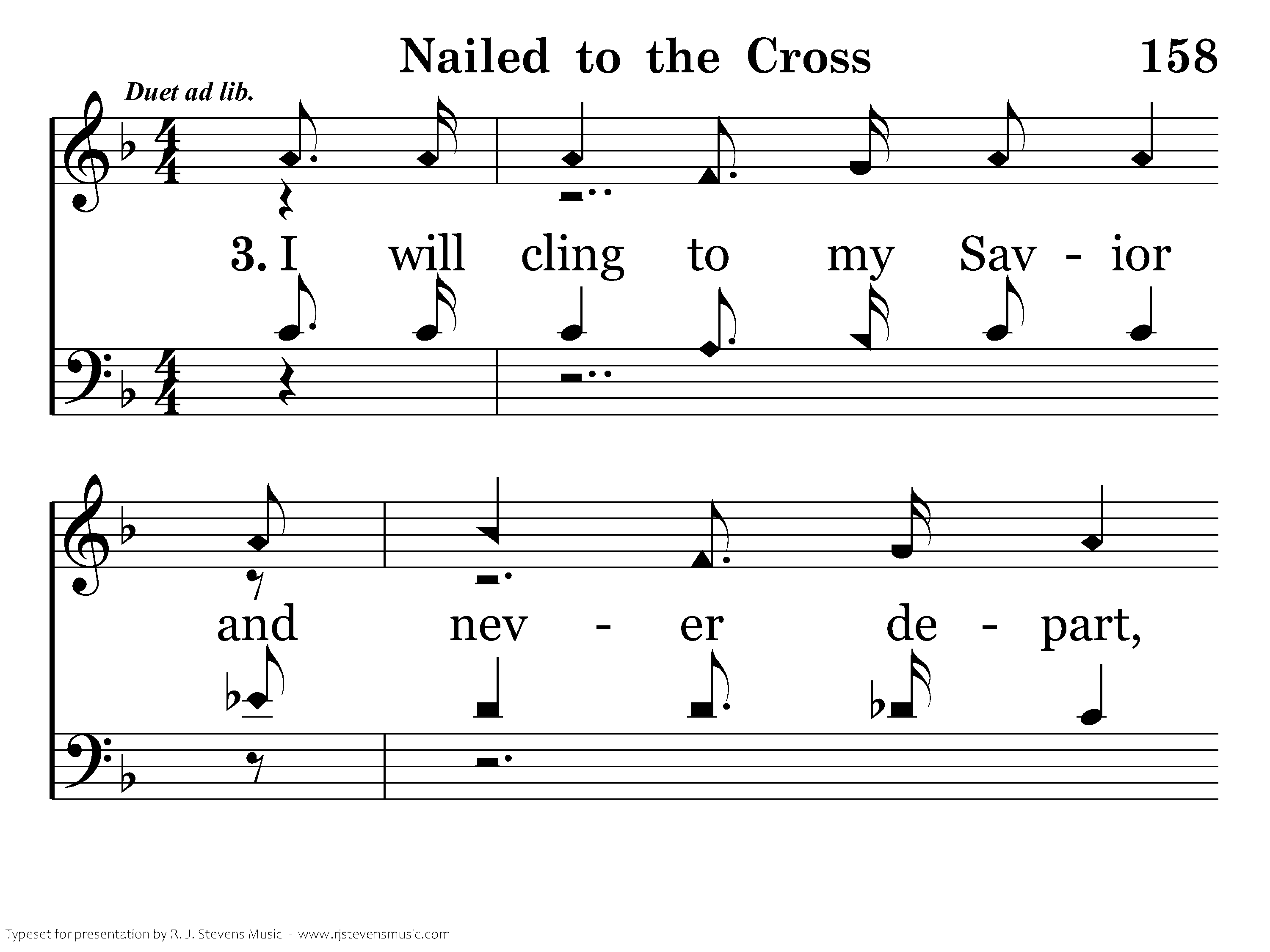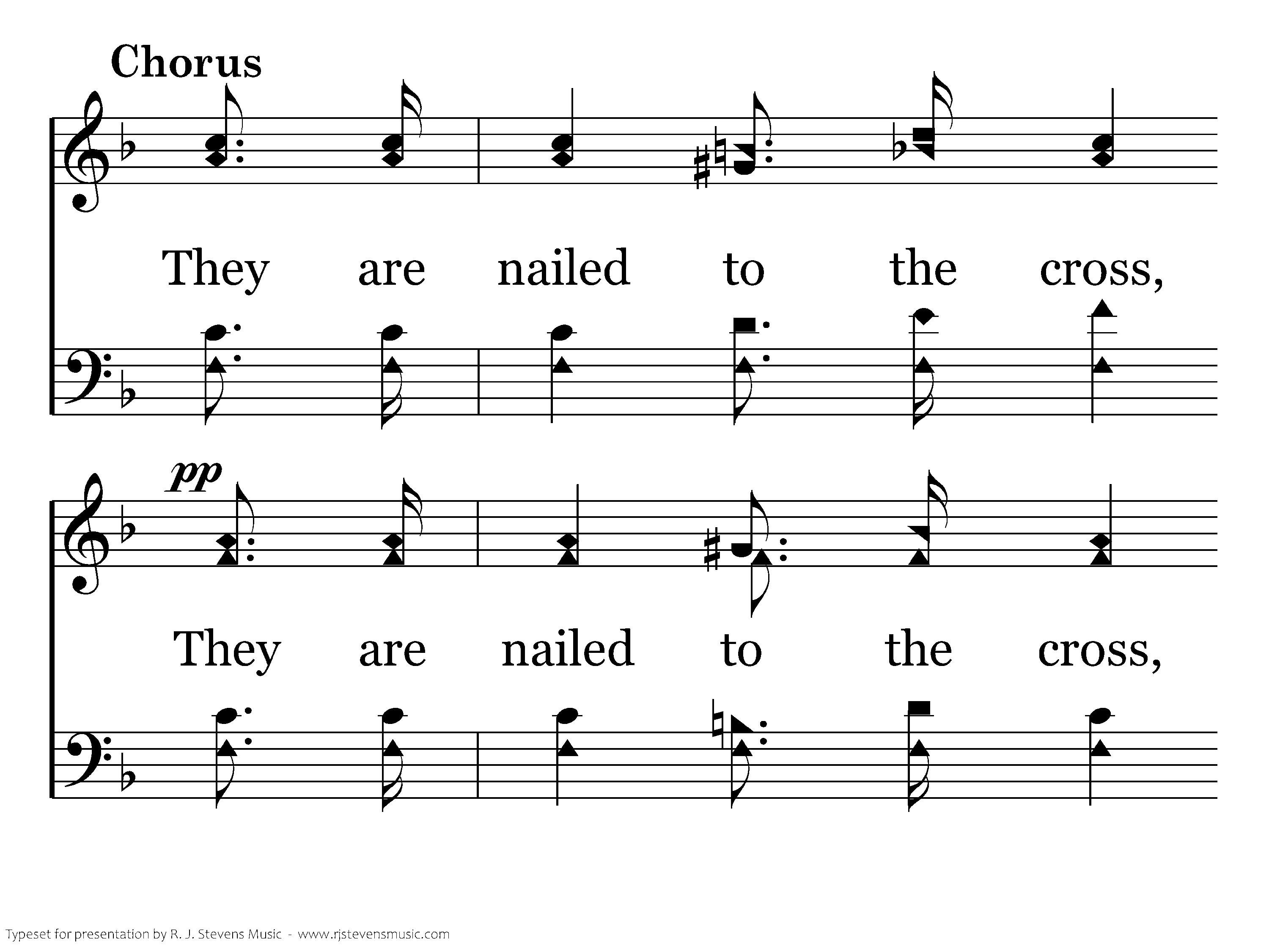 They are nailed to the cross, They are nailed to the cross, O how much He was willing to bear! With what anguish and loss, Jesus went to the cross! But He carried my sins with Him there.