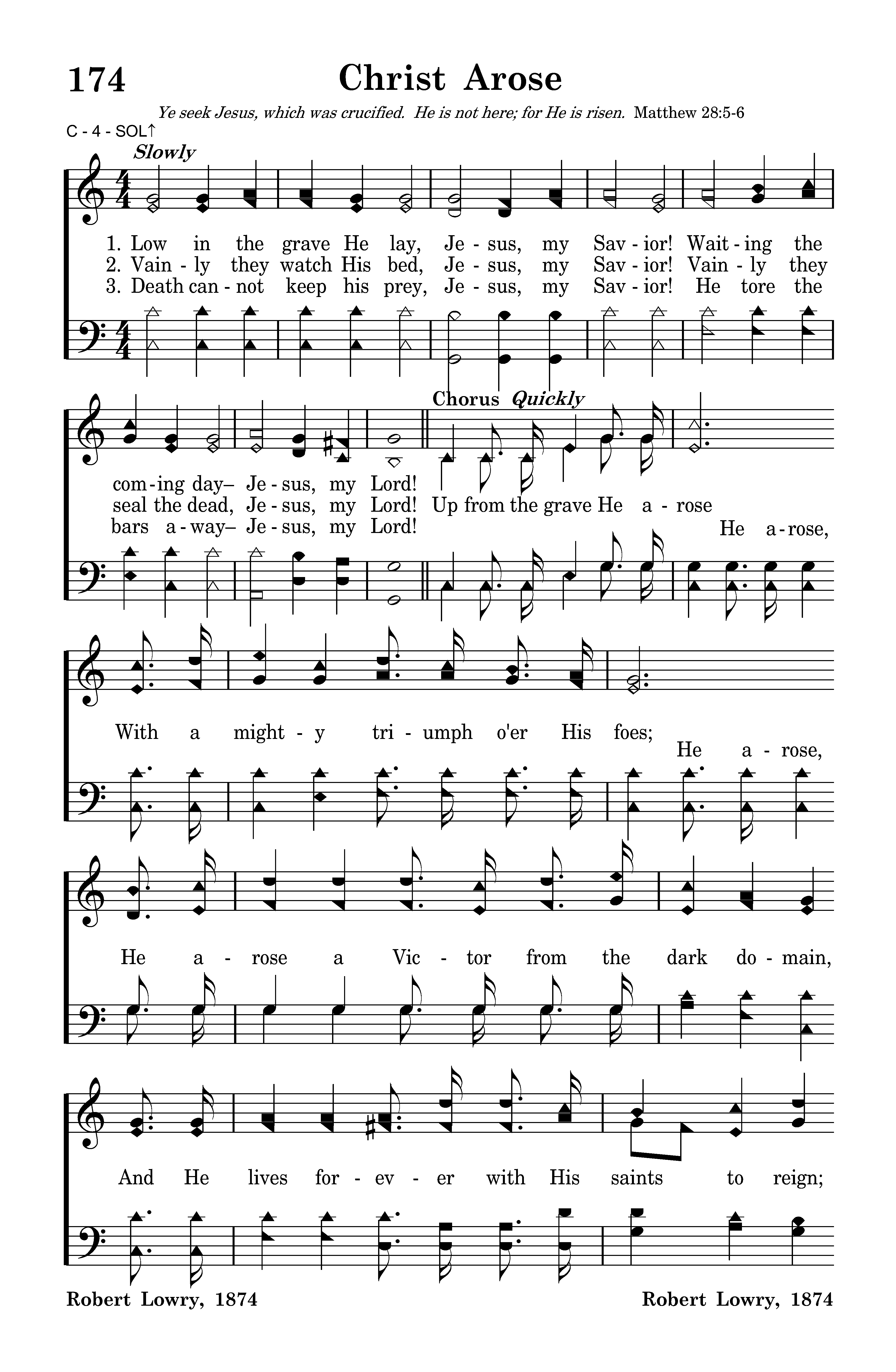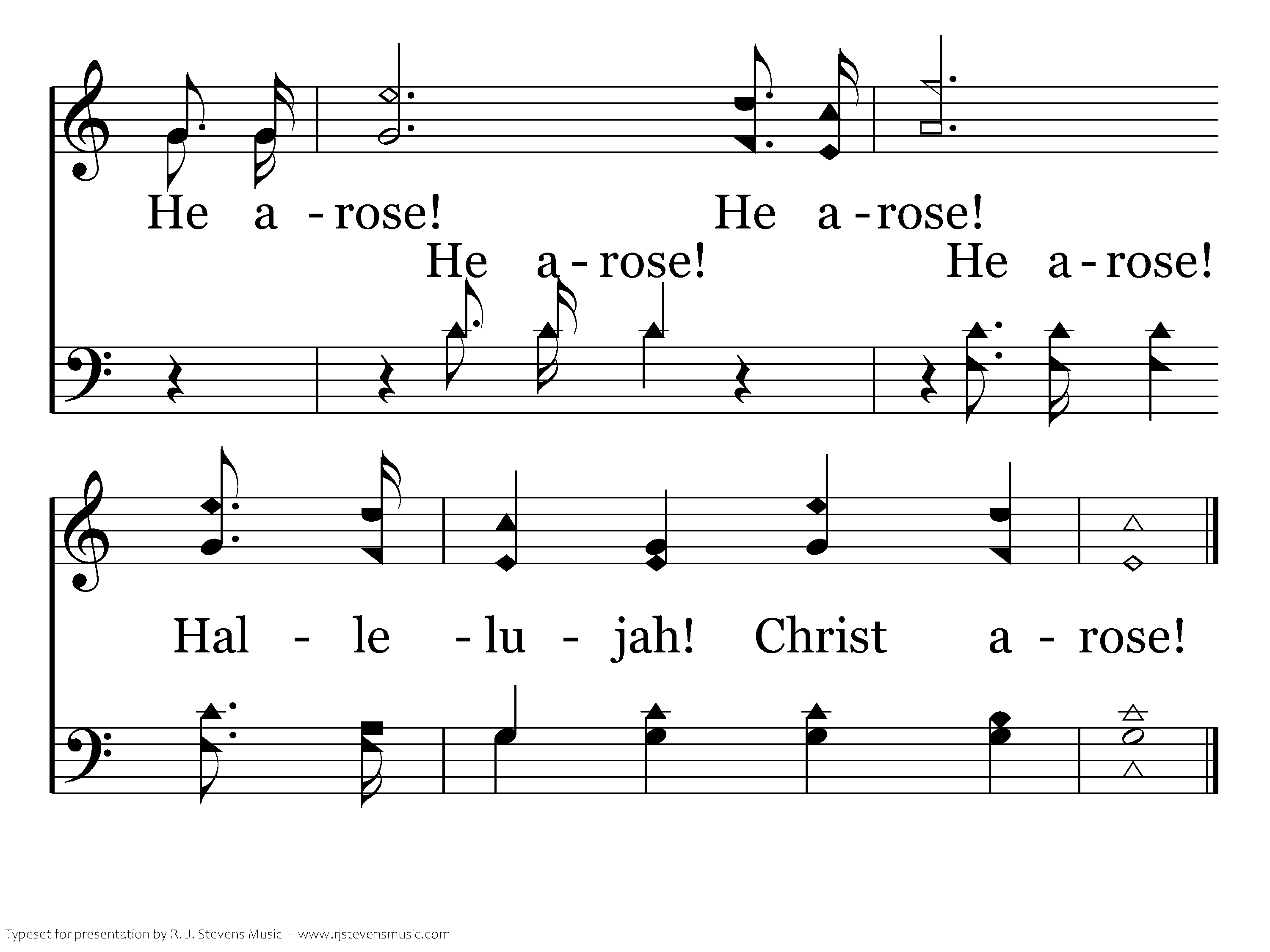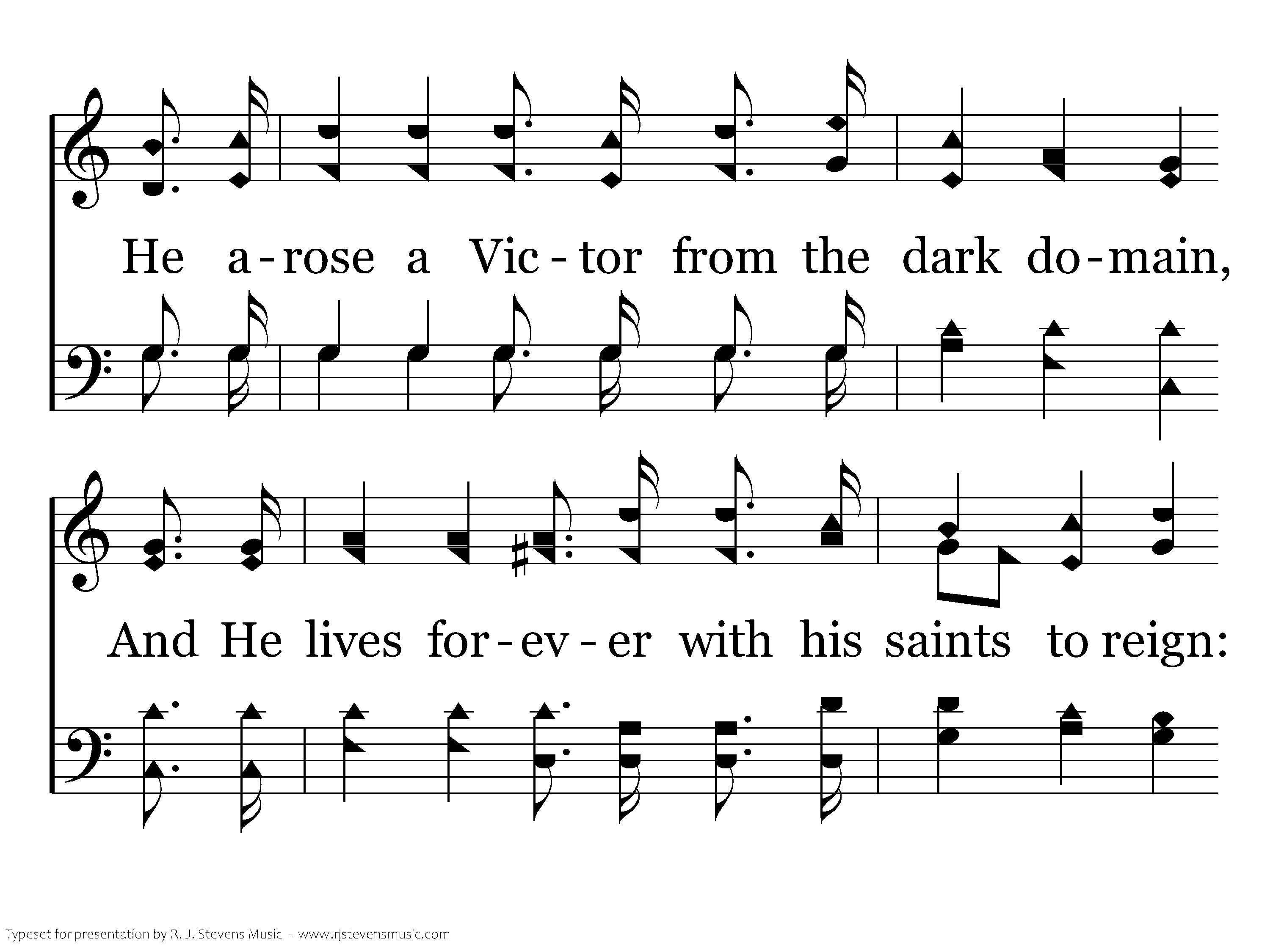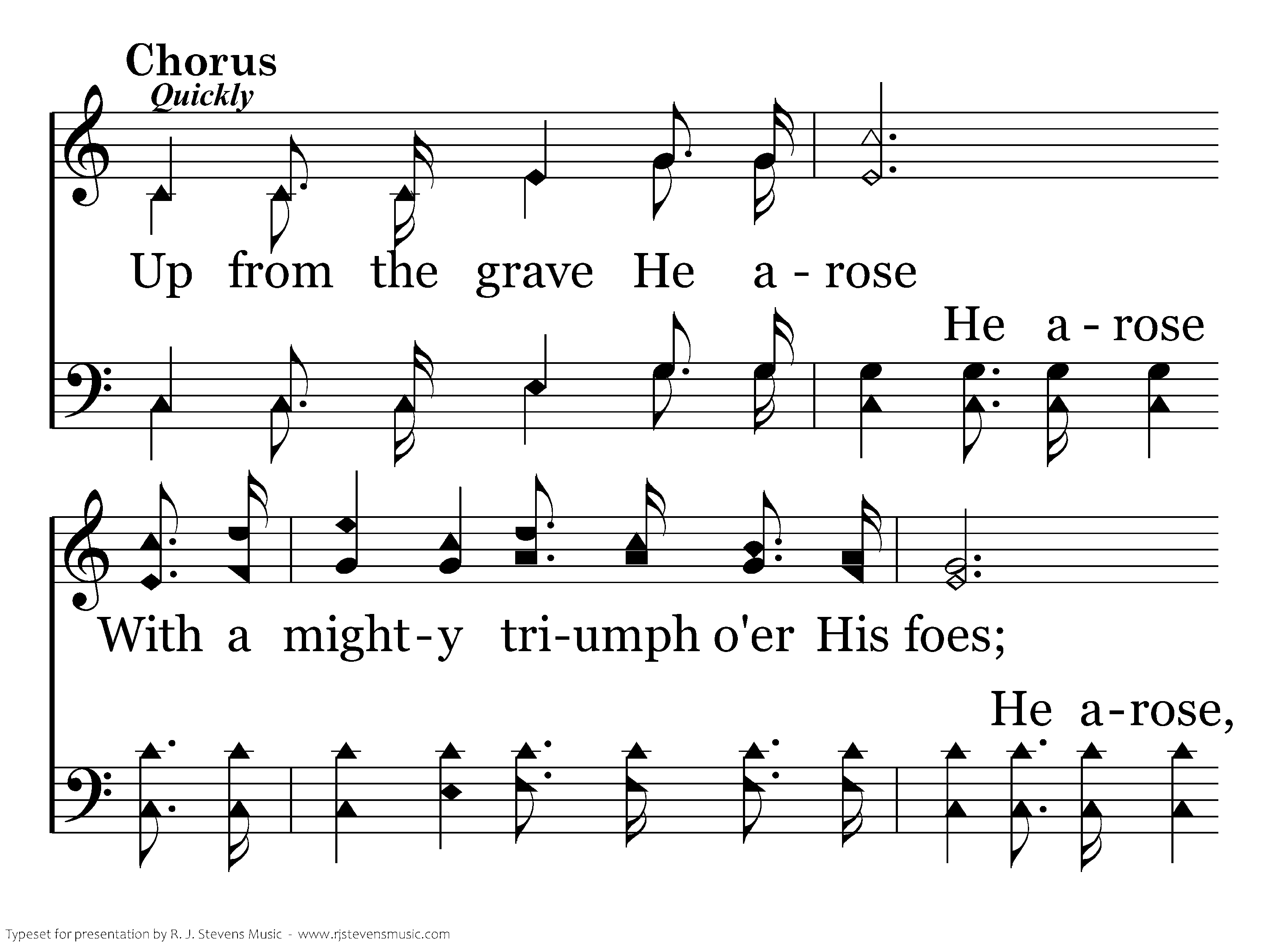 Up from the grave He arose With a mighty triumph o'er His foes, He arose a Victor from the dark domain And He lives forever with His saints to reign; He arose, He arose! Hallelujah! Christ arose!