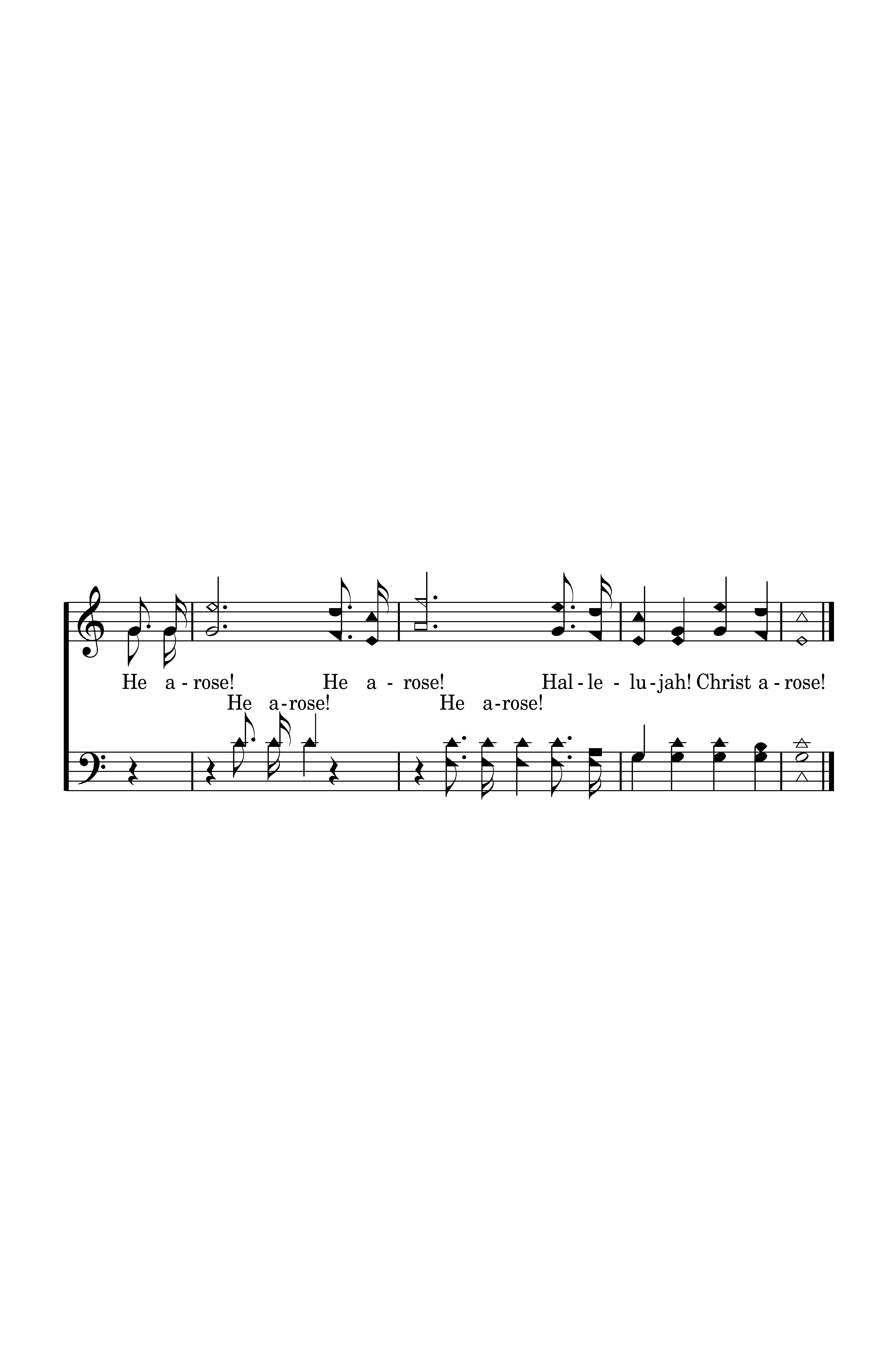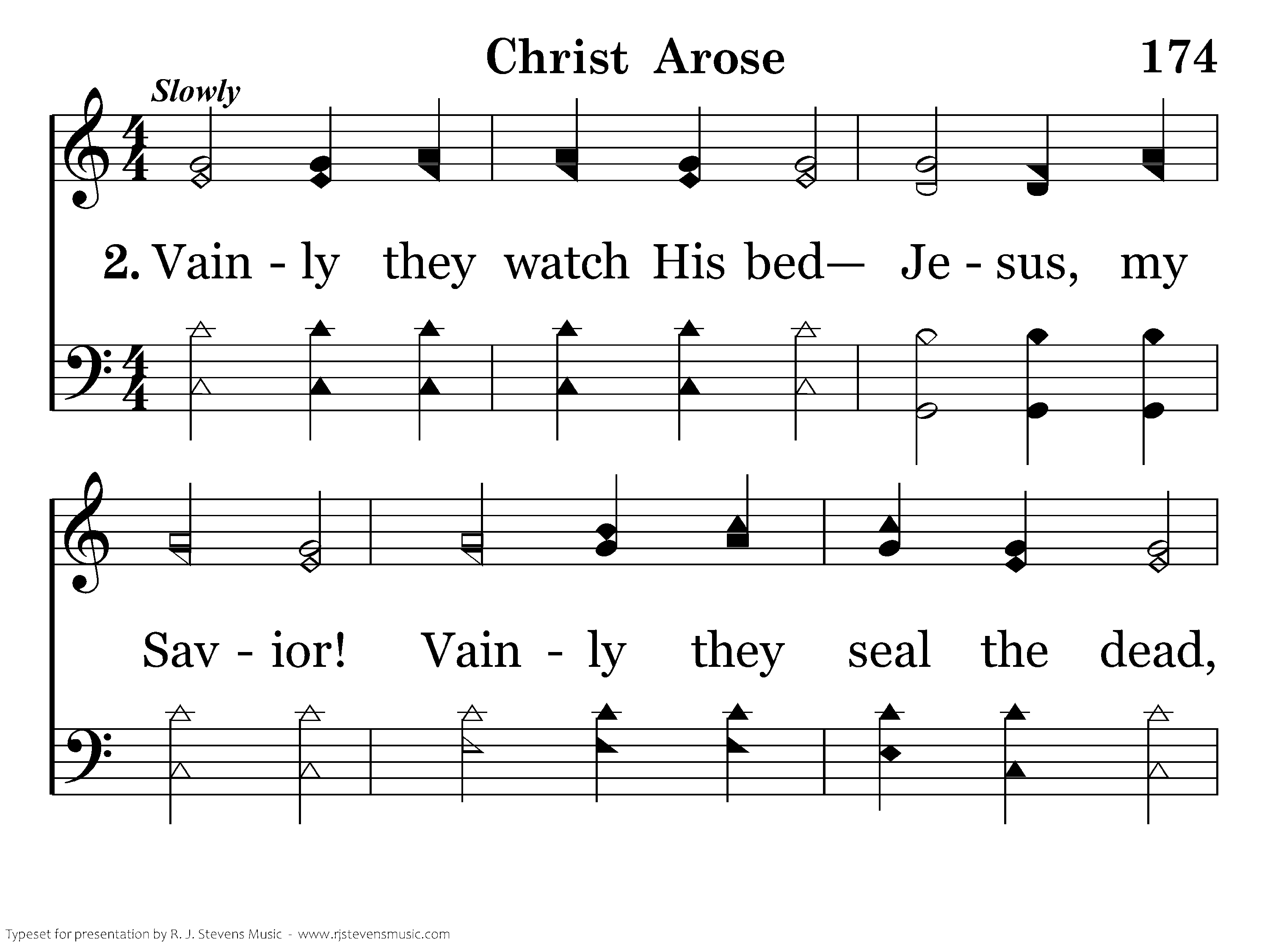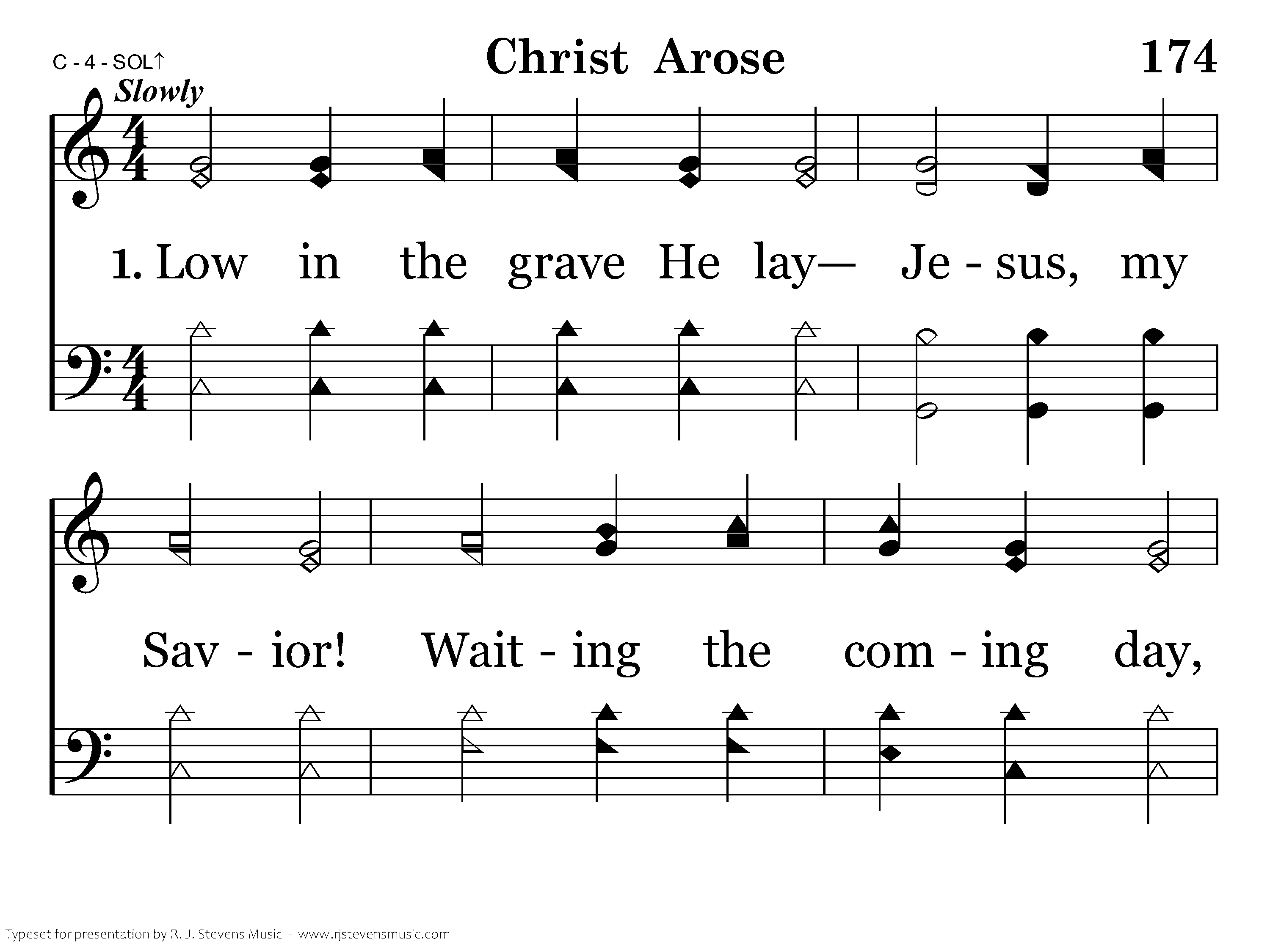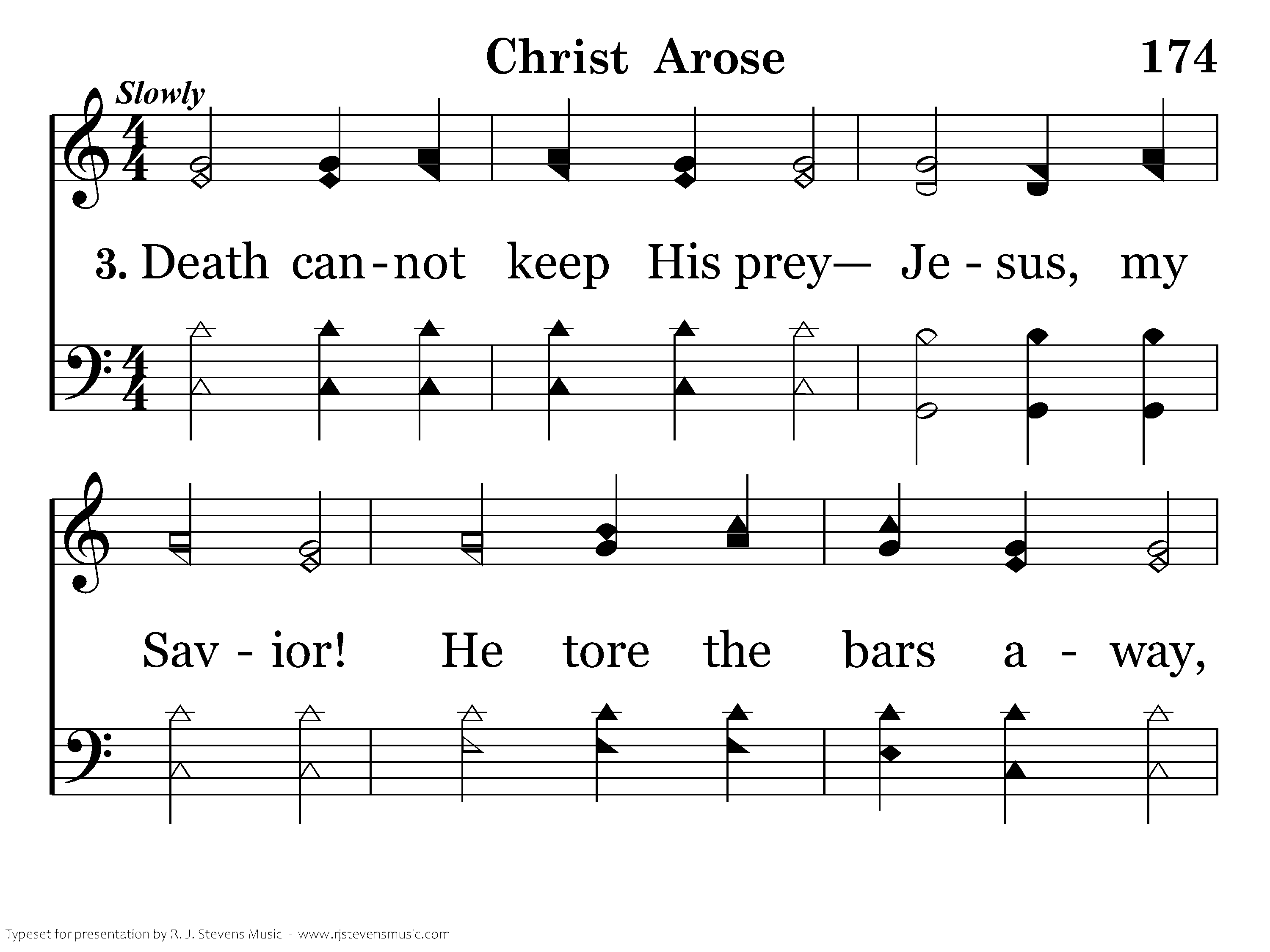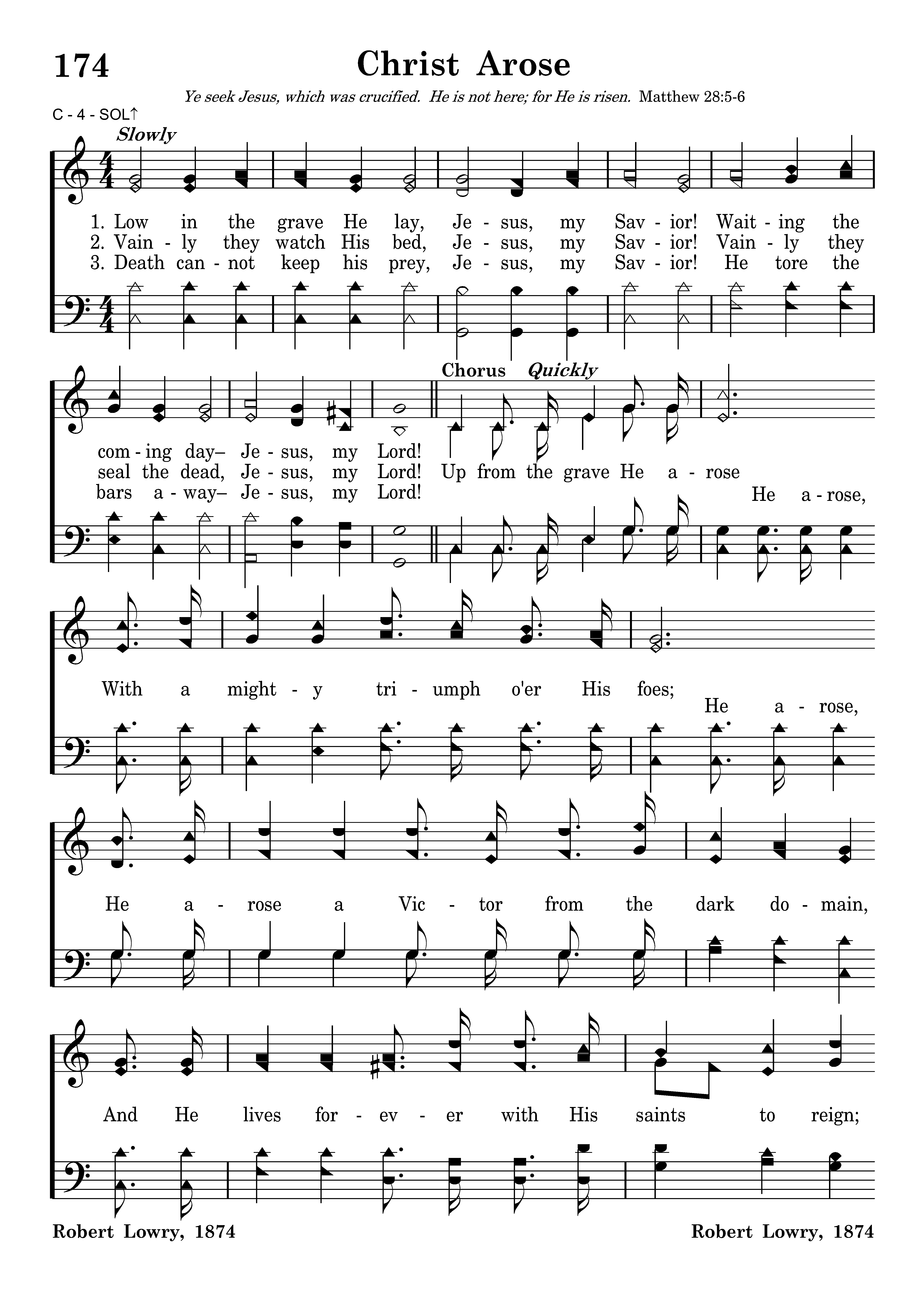 Up from the grave He arose With a mighty triumph o'er His foes, He arose a Victor from the dark domain And He lives forever with His saints to reign; He arose, He arose! Hallelujah! Christ arose!