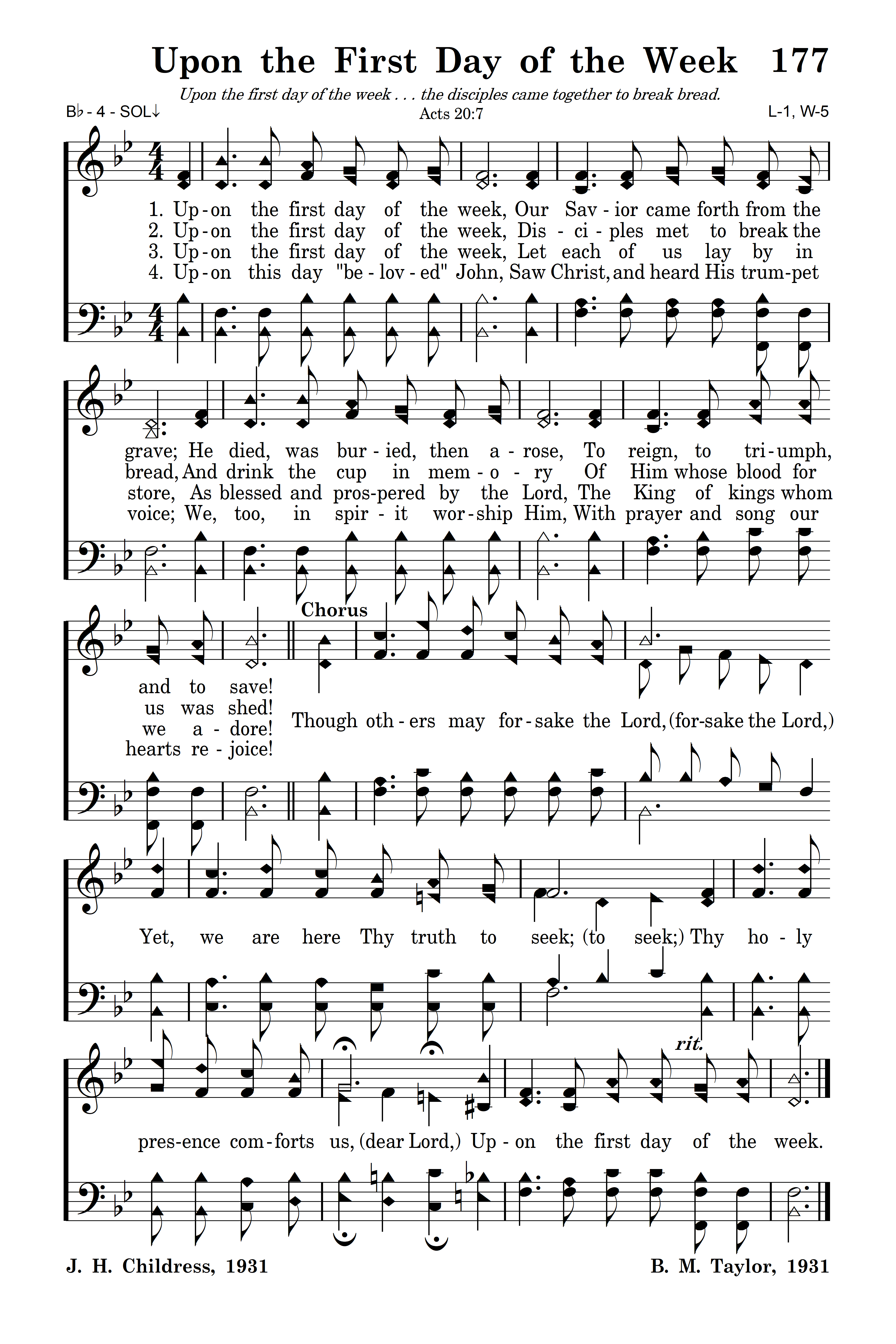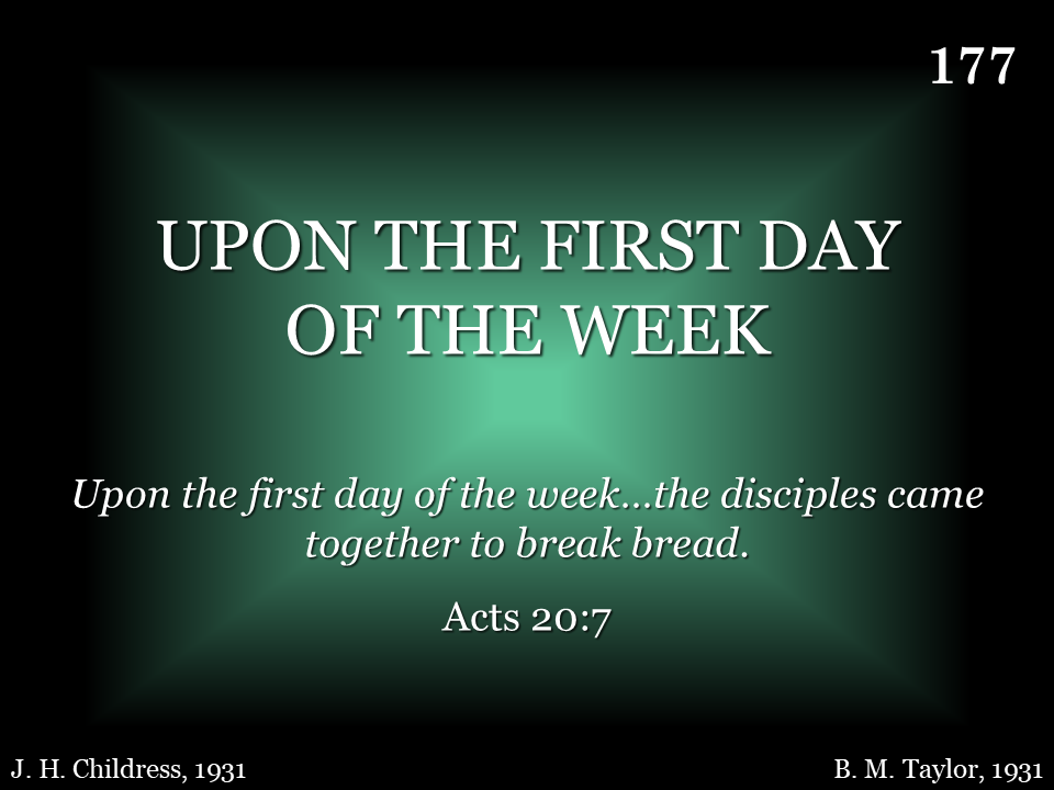 Upon the first day of the week, Disciples met to break the bread, And drink the cup in memory Of Him whose blood for us was shed!