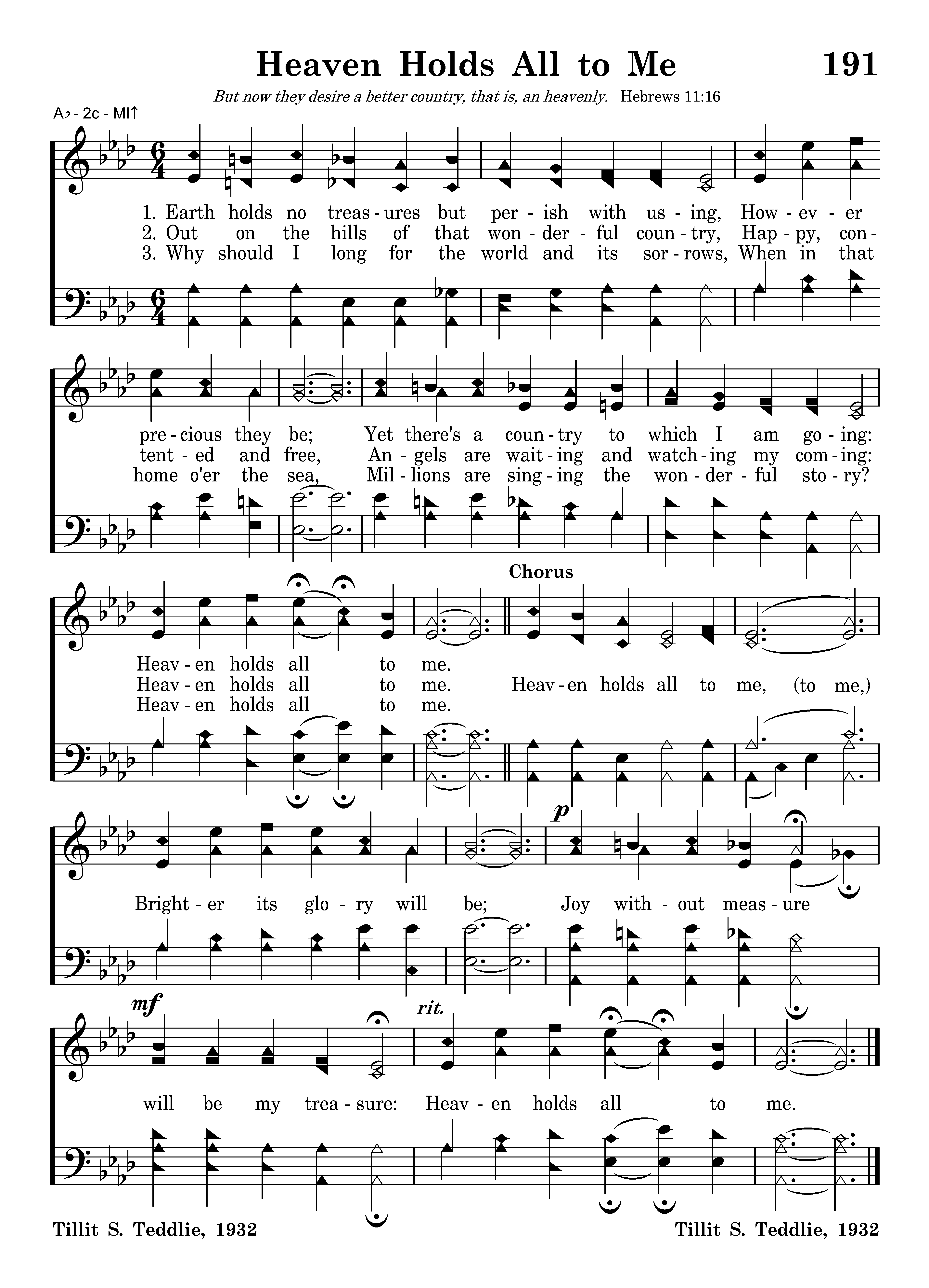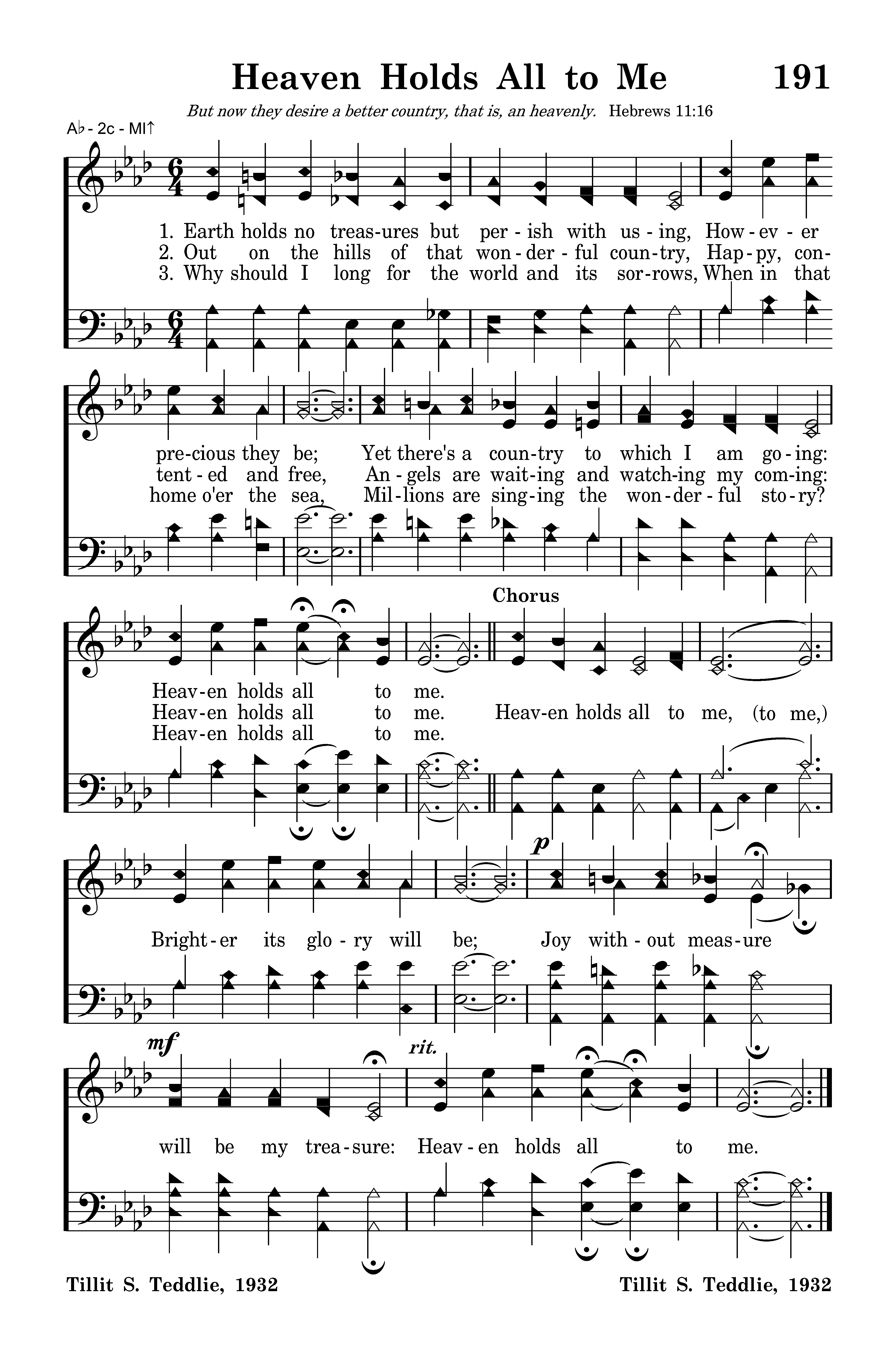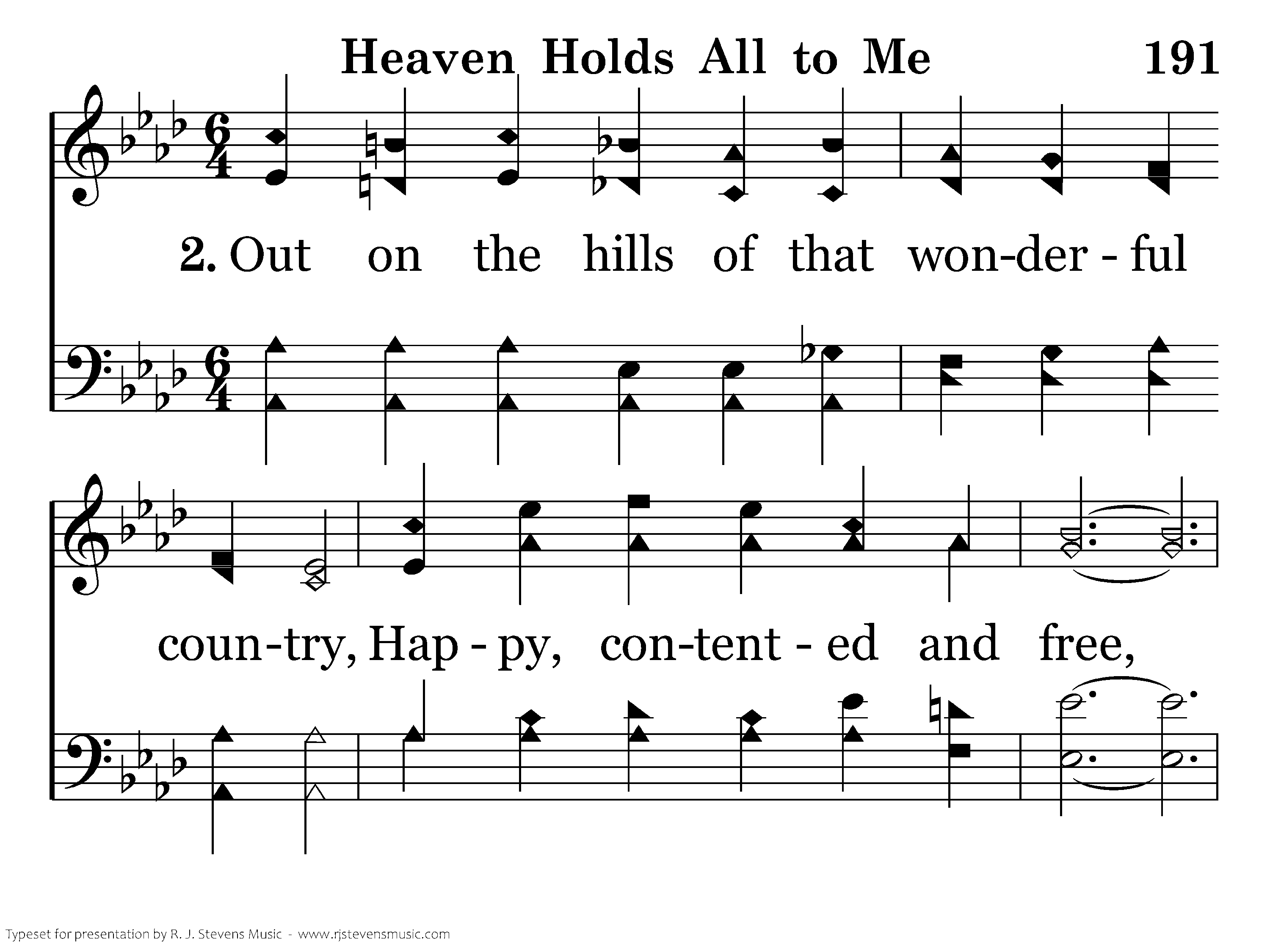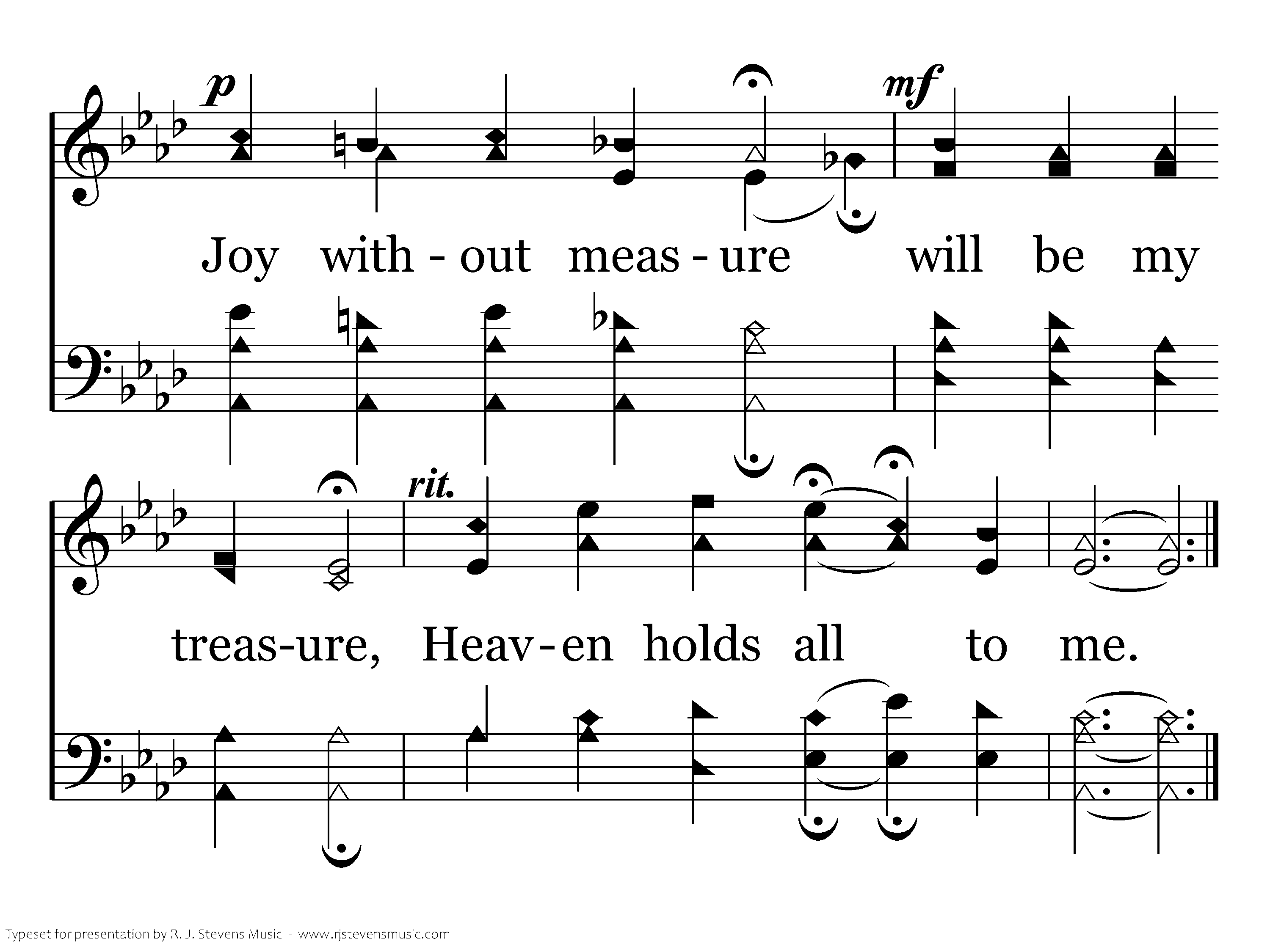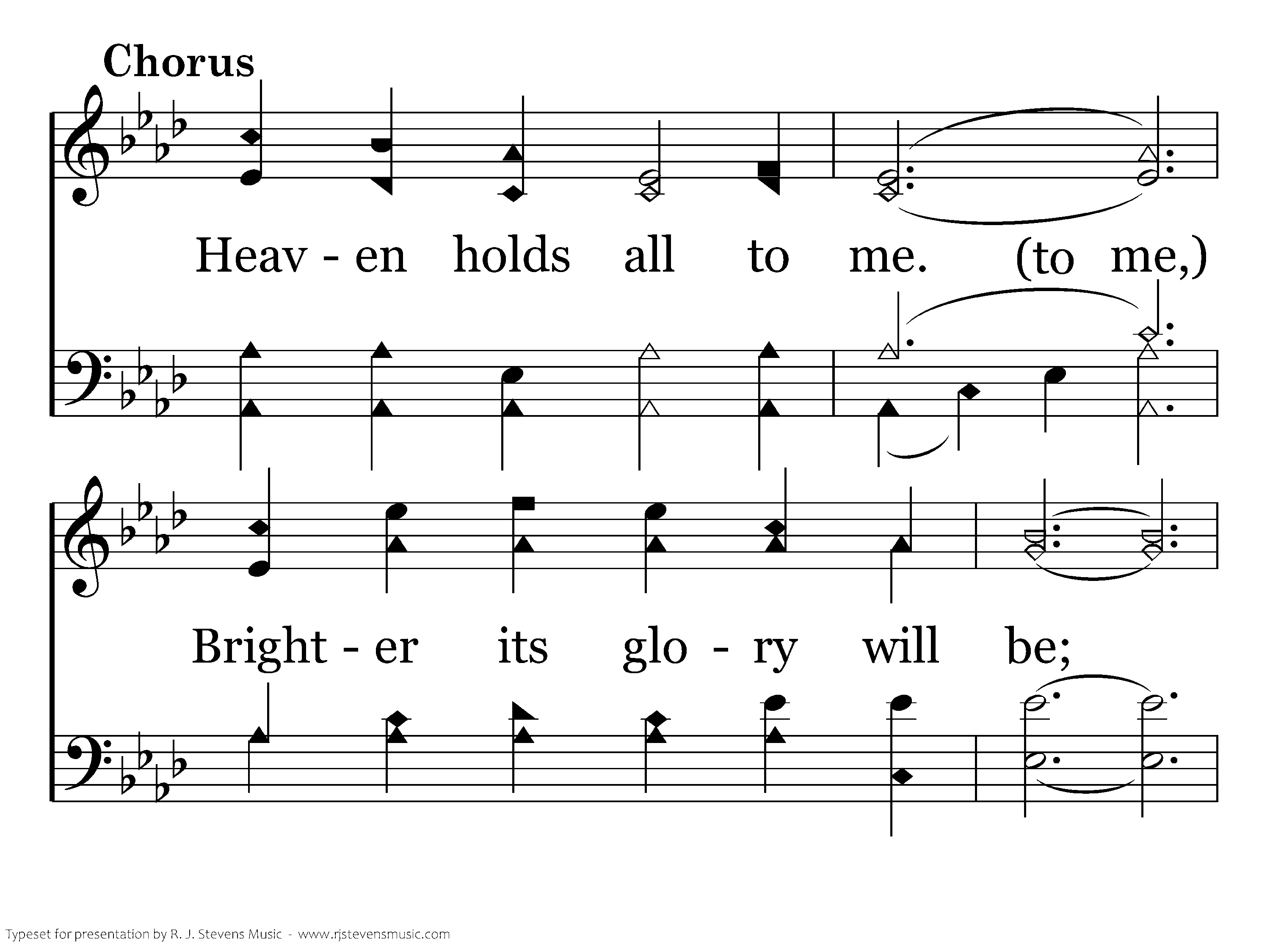 Heaven holds all to me, brighter its glory will be; Joy without measure will be my treasure: Heaven holds all to me.