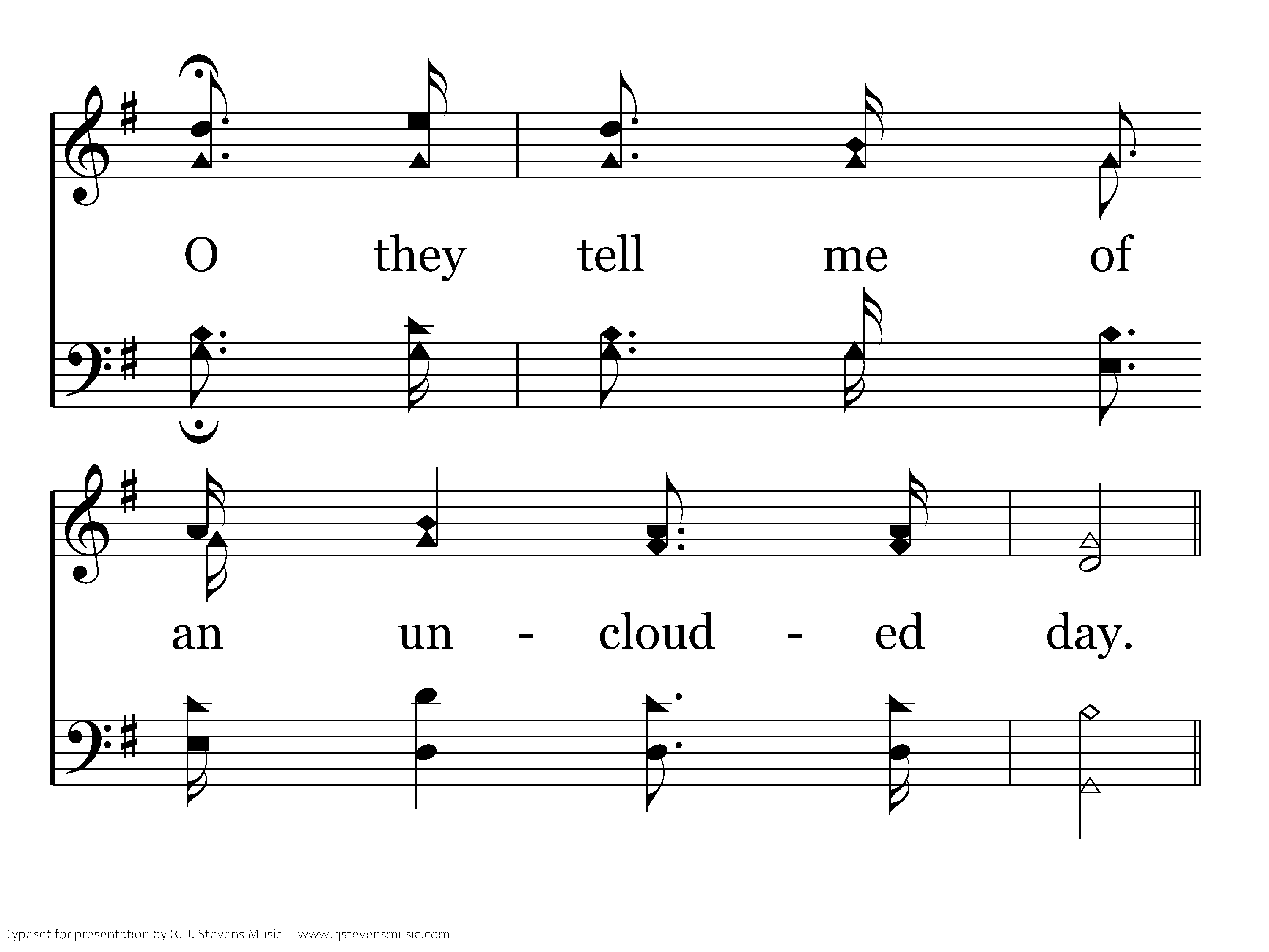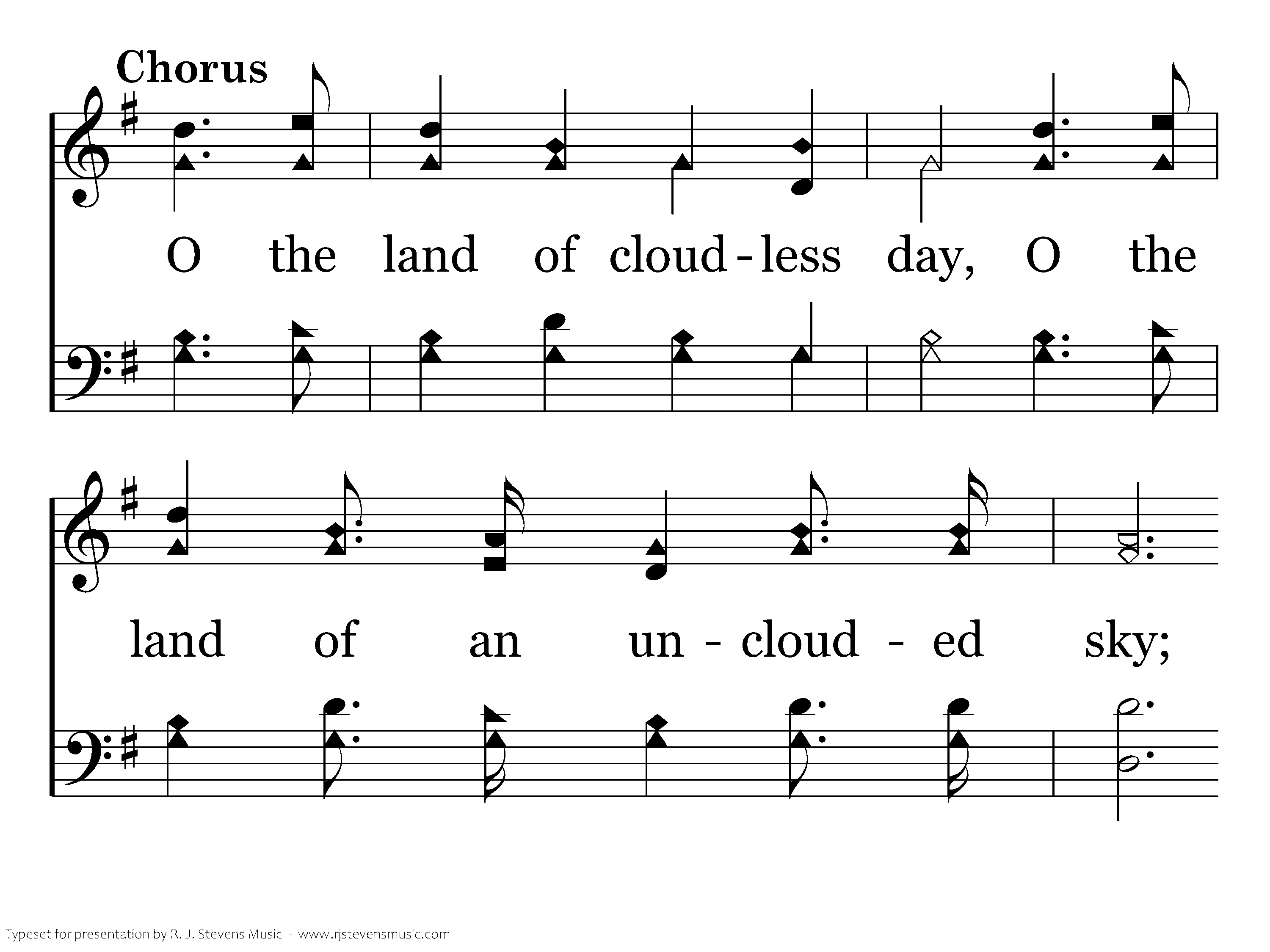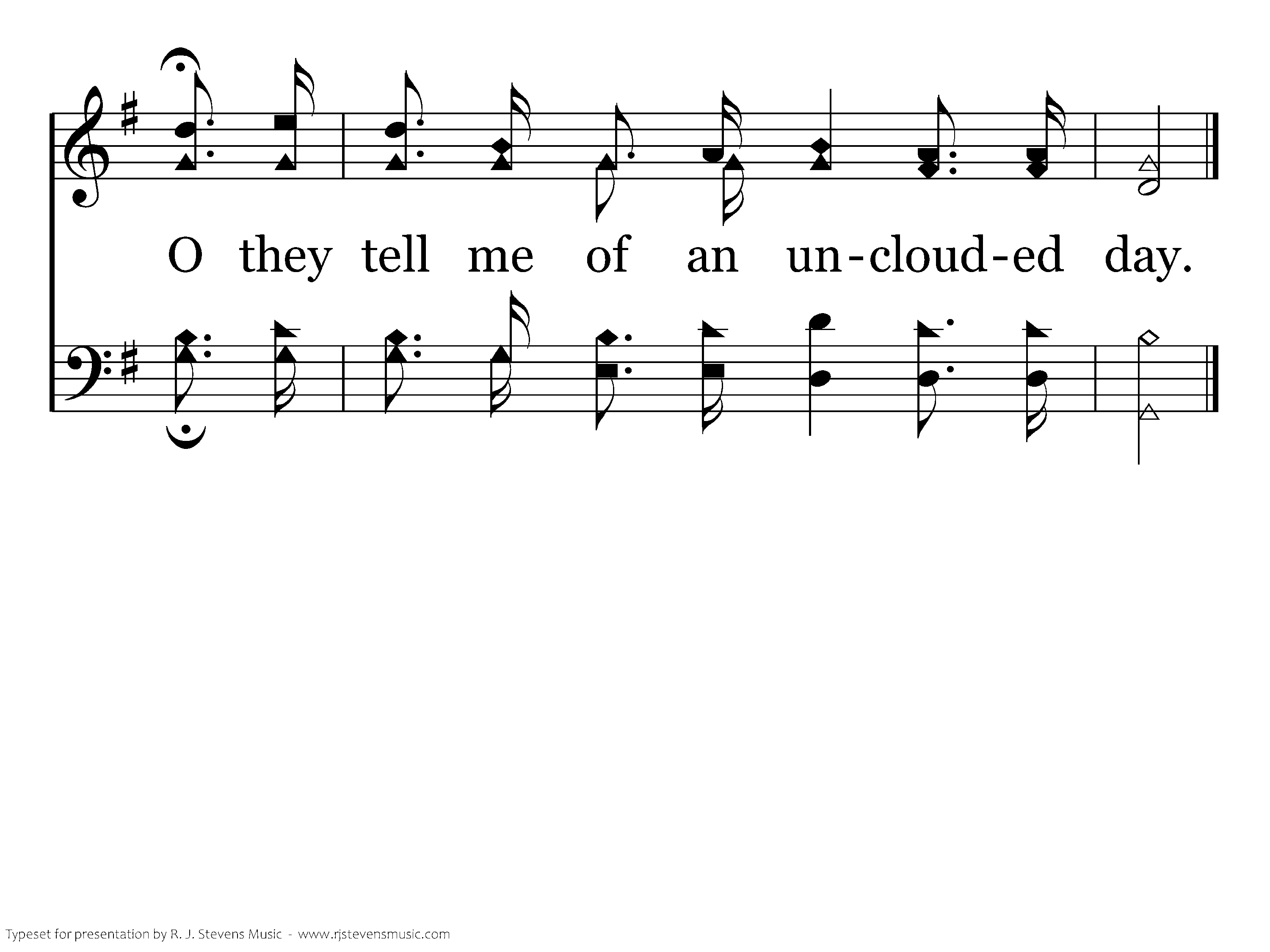 O the land of cloudless day, O the land of unclouded sky; O they tell me of a home where no stormclouds lie, O they tell me of an unclouded day.