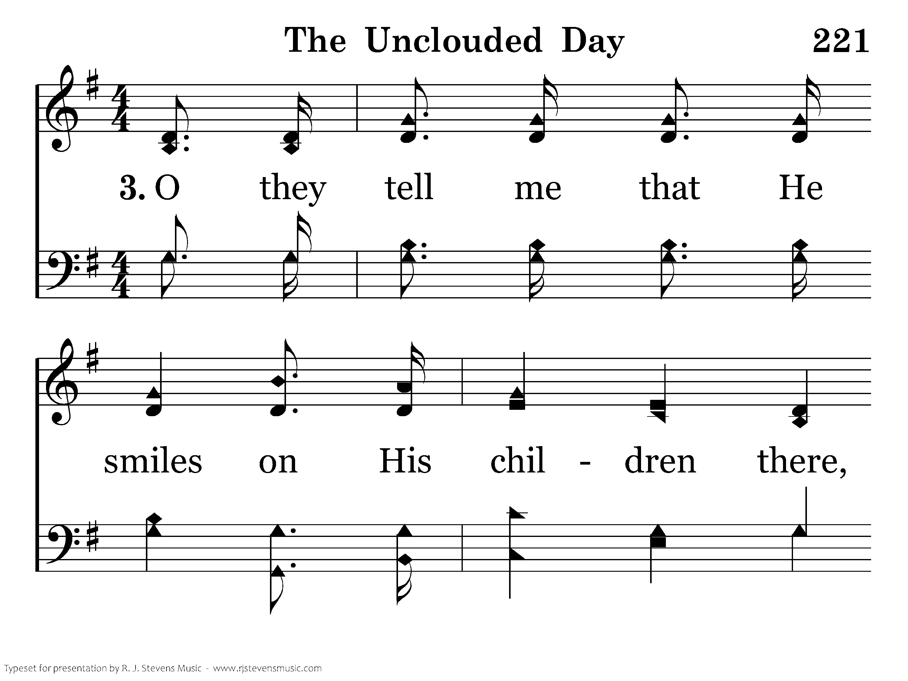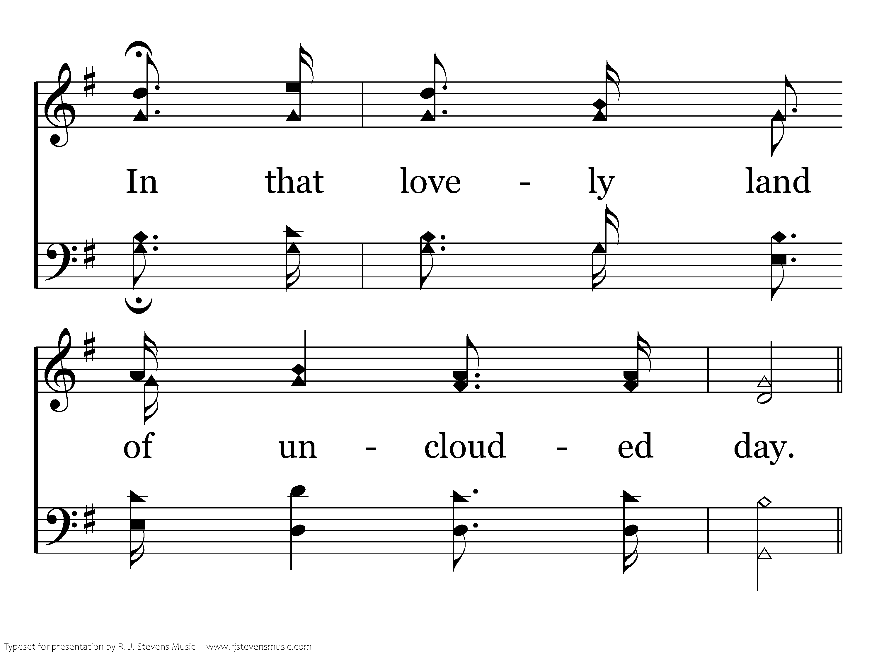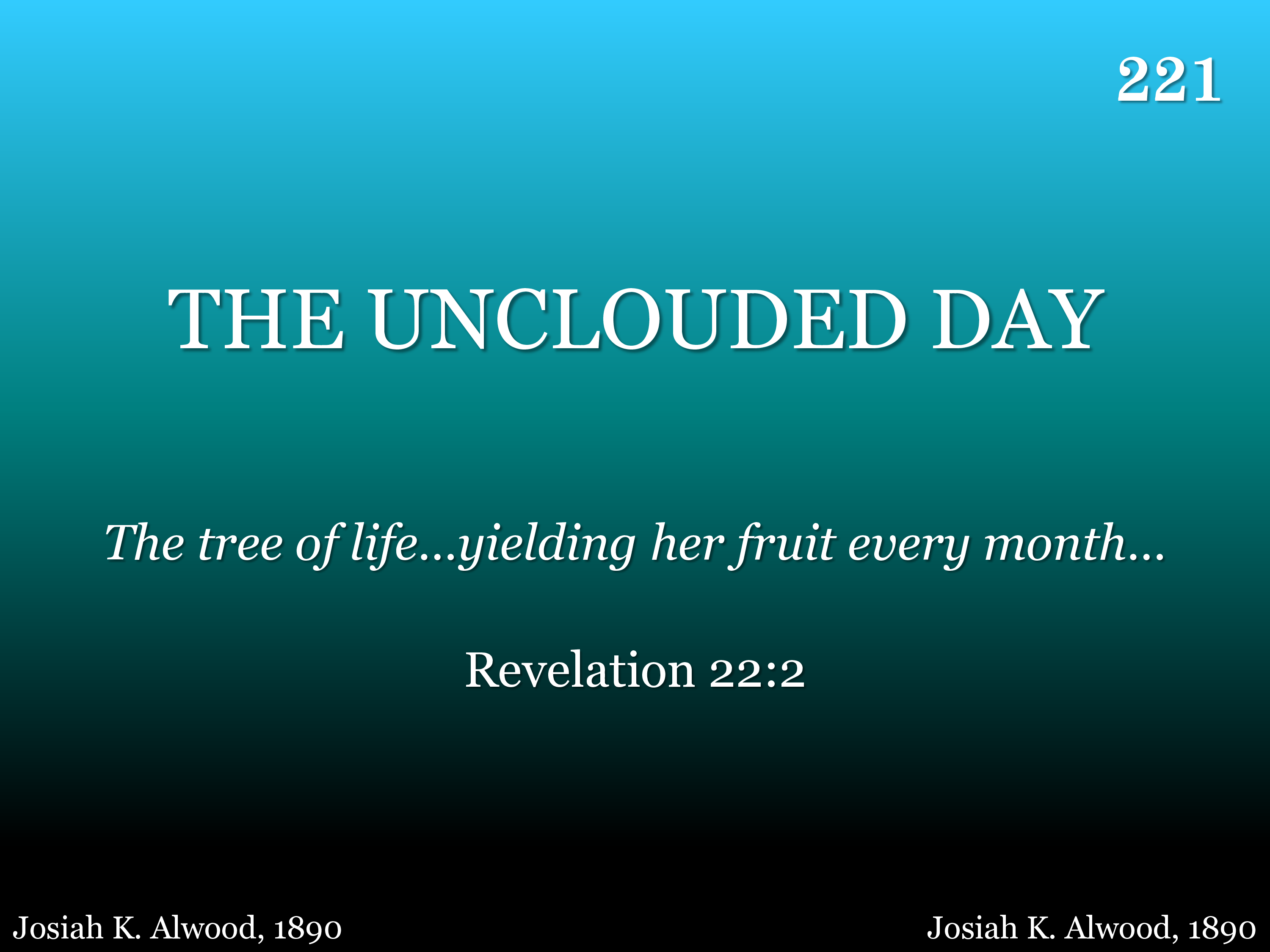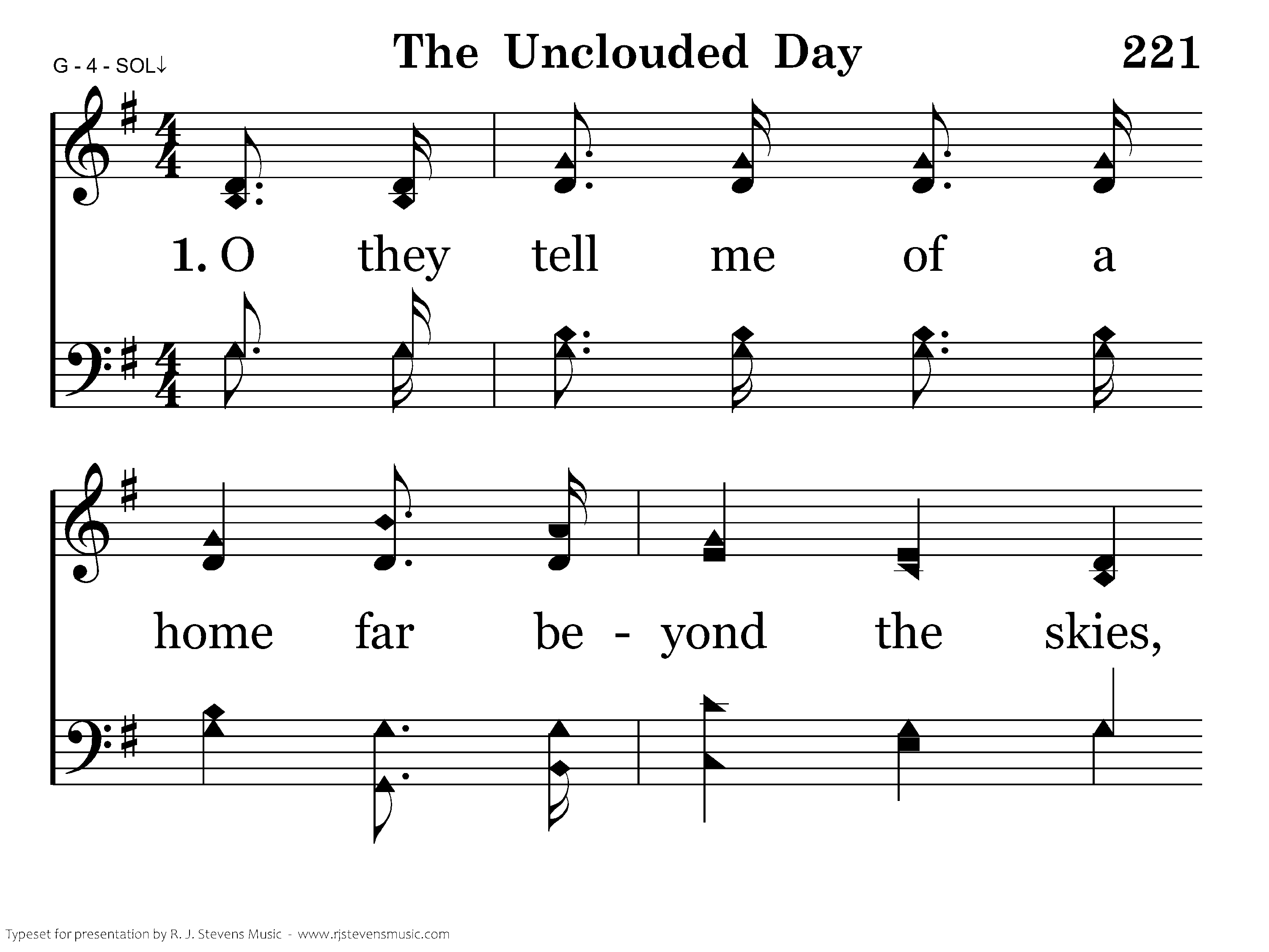 O the land of cloudless day, O the land of unclouded sky; O they tell me of a home where no stormclouds lie, O they tell me of an unclouded day.