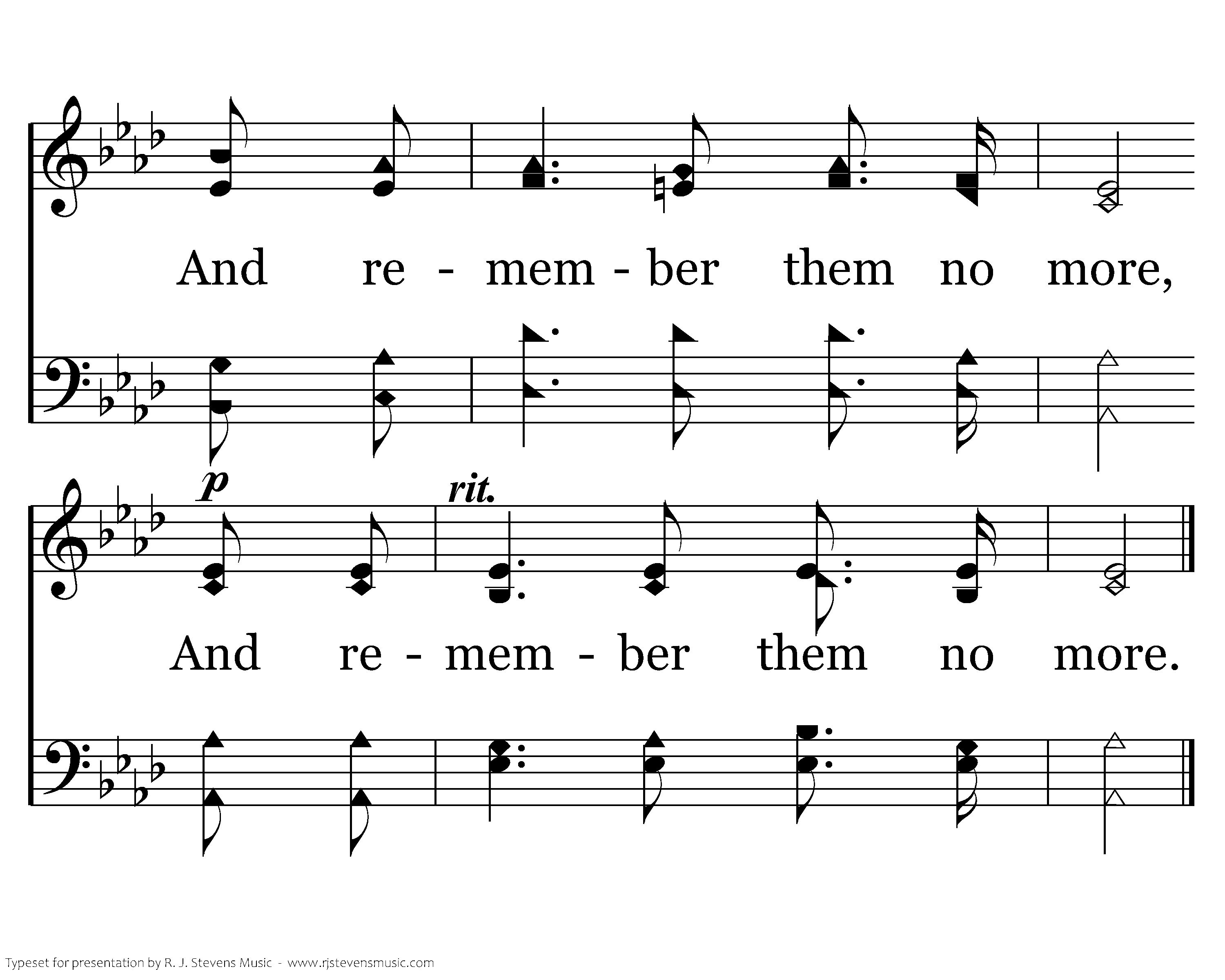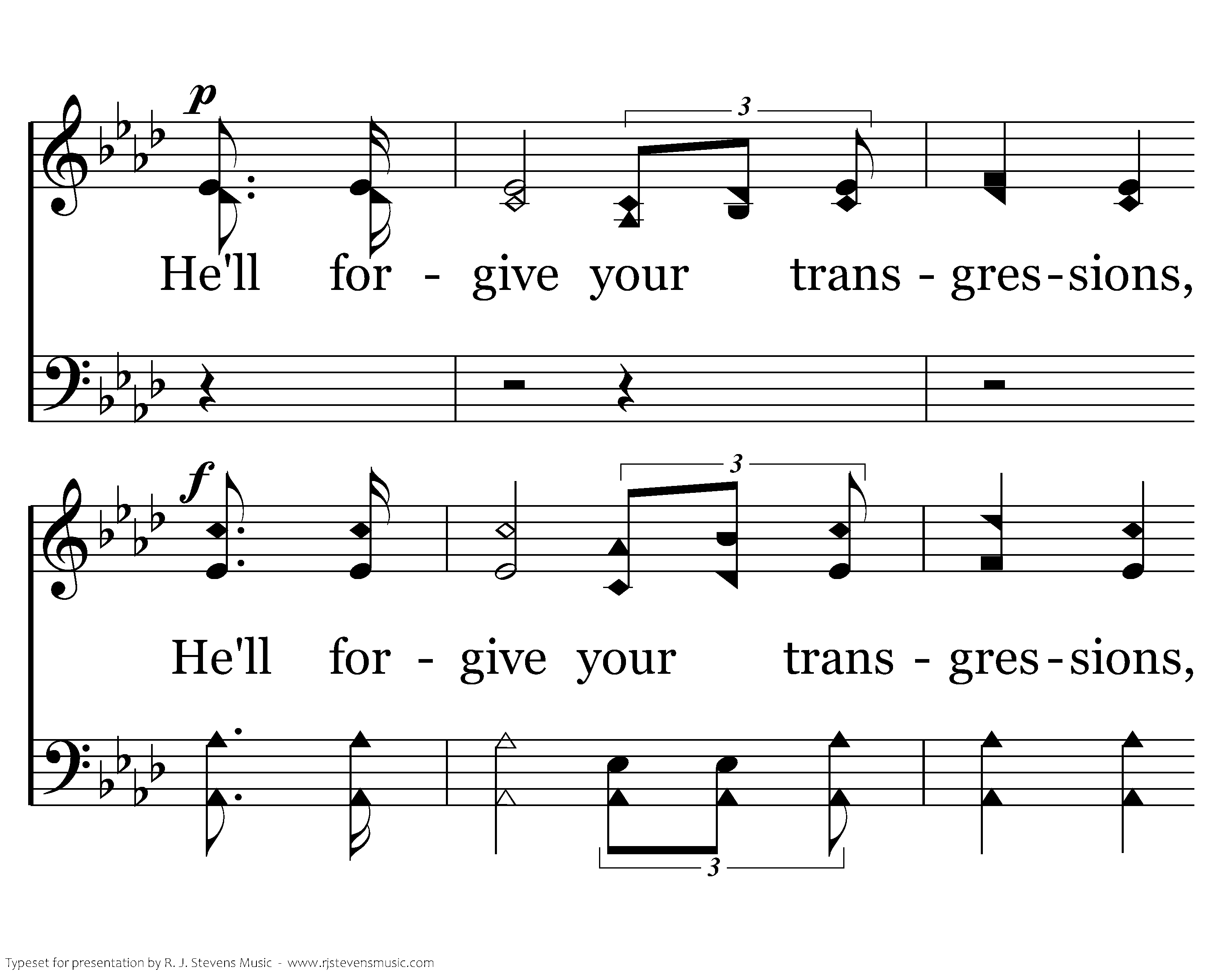 He'll forgive your transgressions And remember them no more, He'll forgive your transgressions And remember them no more; Look unto Me ye people, Saith the Lord your God; He'll forgive your transgressions, He'll forgive your transgressions, And remember them no more,And remember them no more.