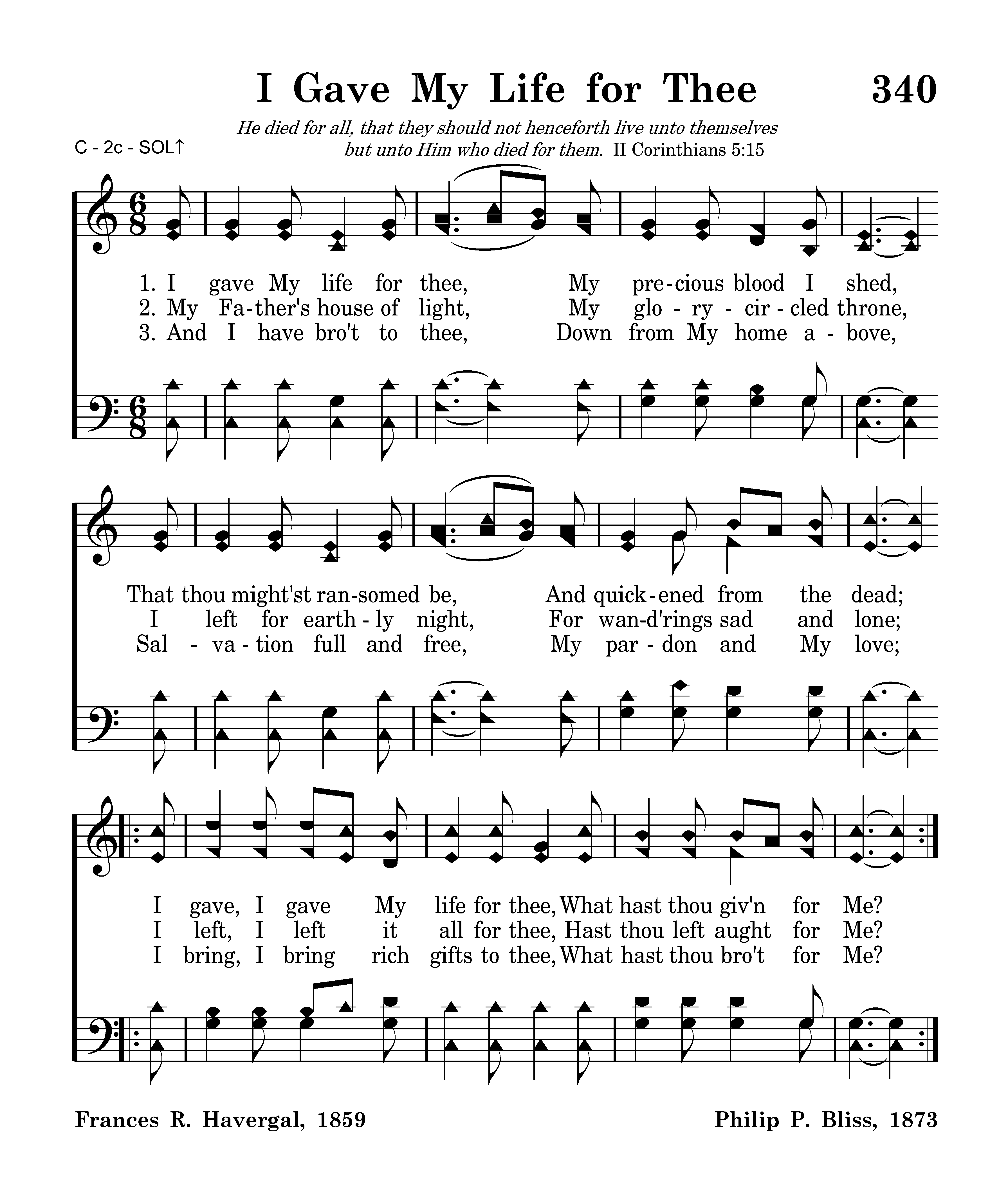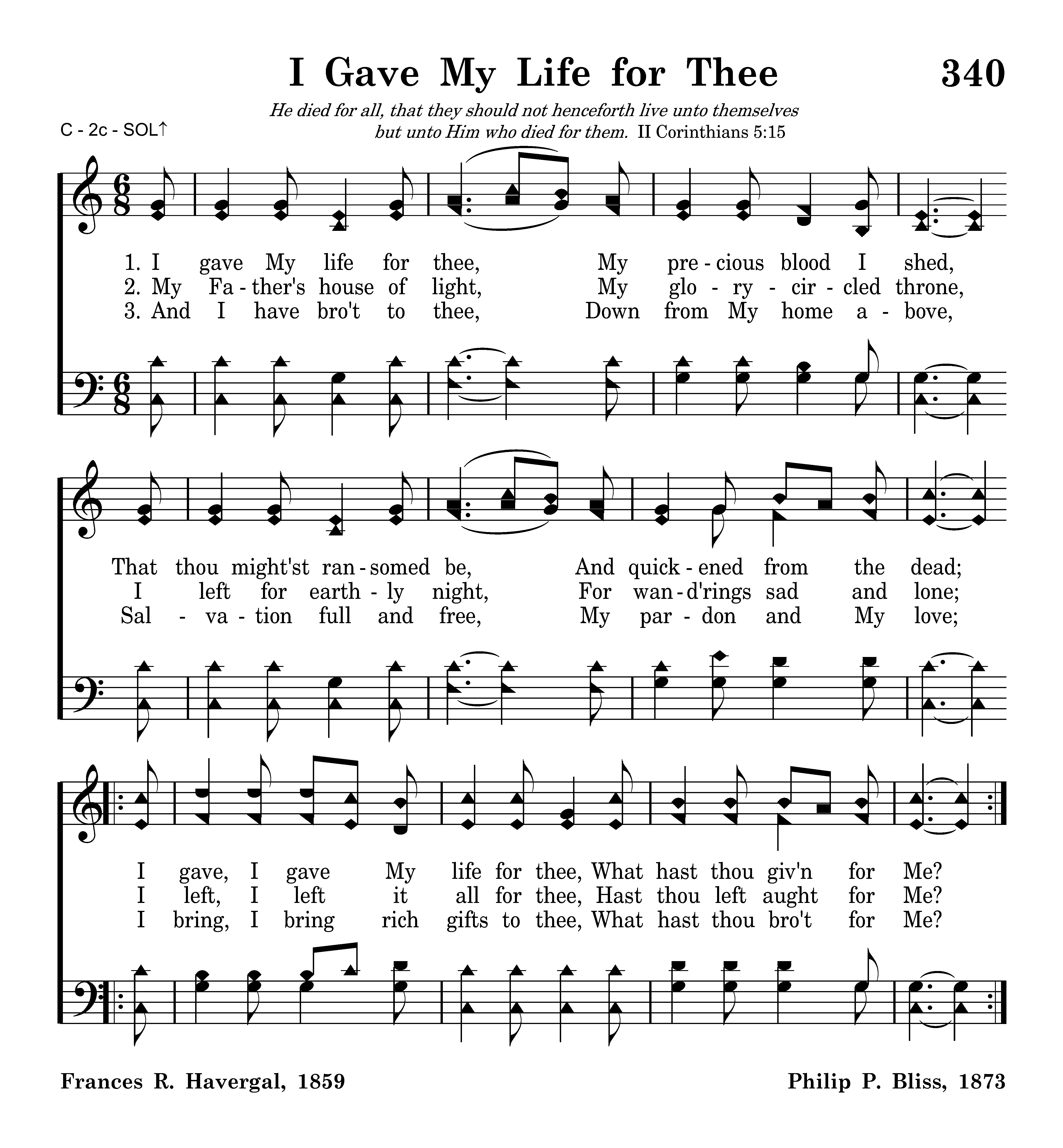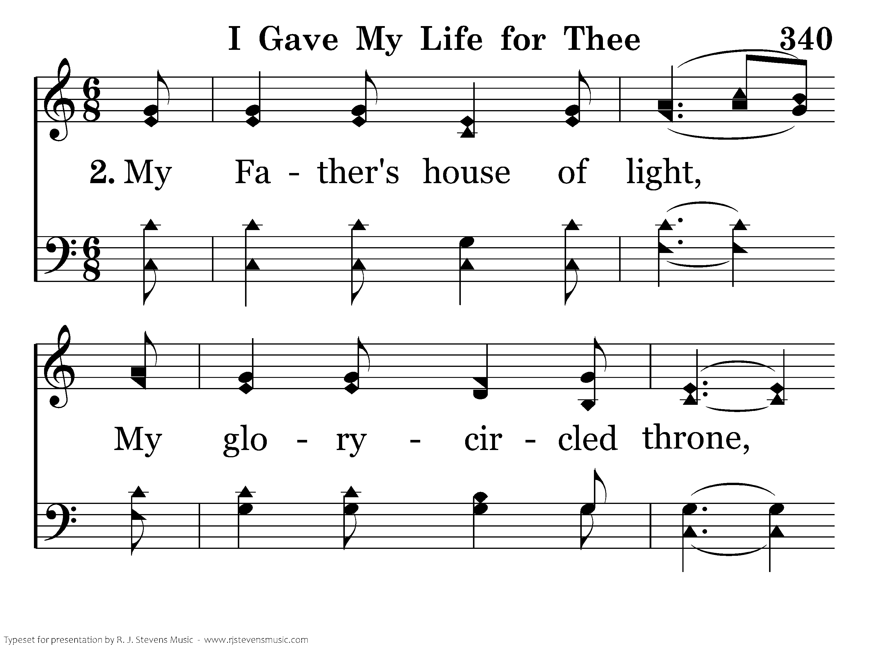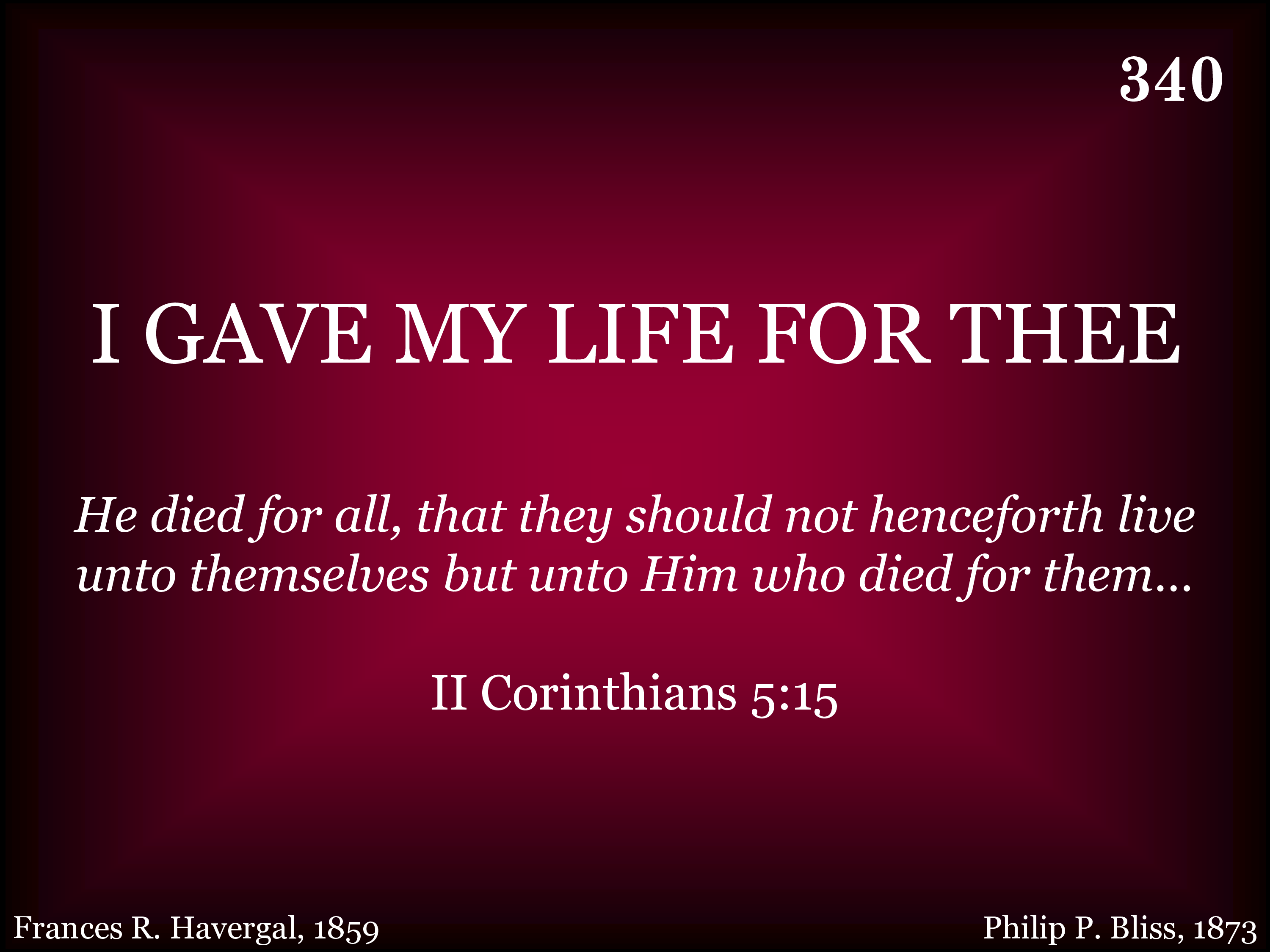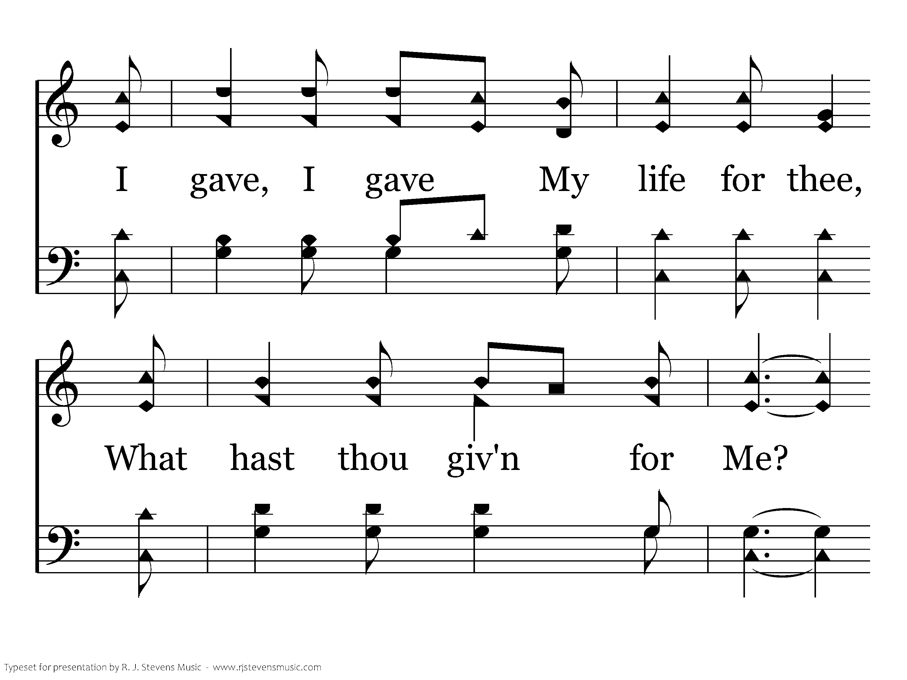 I gave My life for thee, My precious blood I shed, That thou might ransomed be And quickened from the dead, I gave, I gave My life for thee, What hast thou giv'n for Me? I gave, I gave My life for thee, What hast thou giv'n for Me?