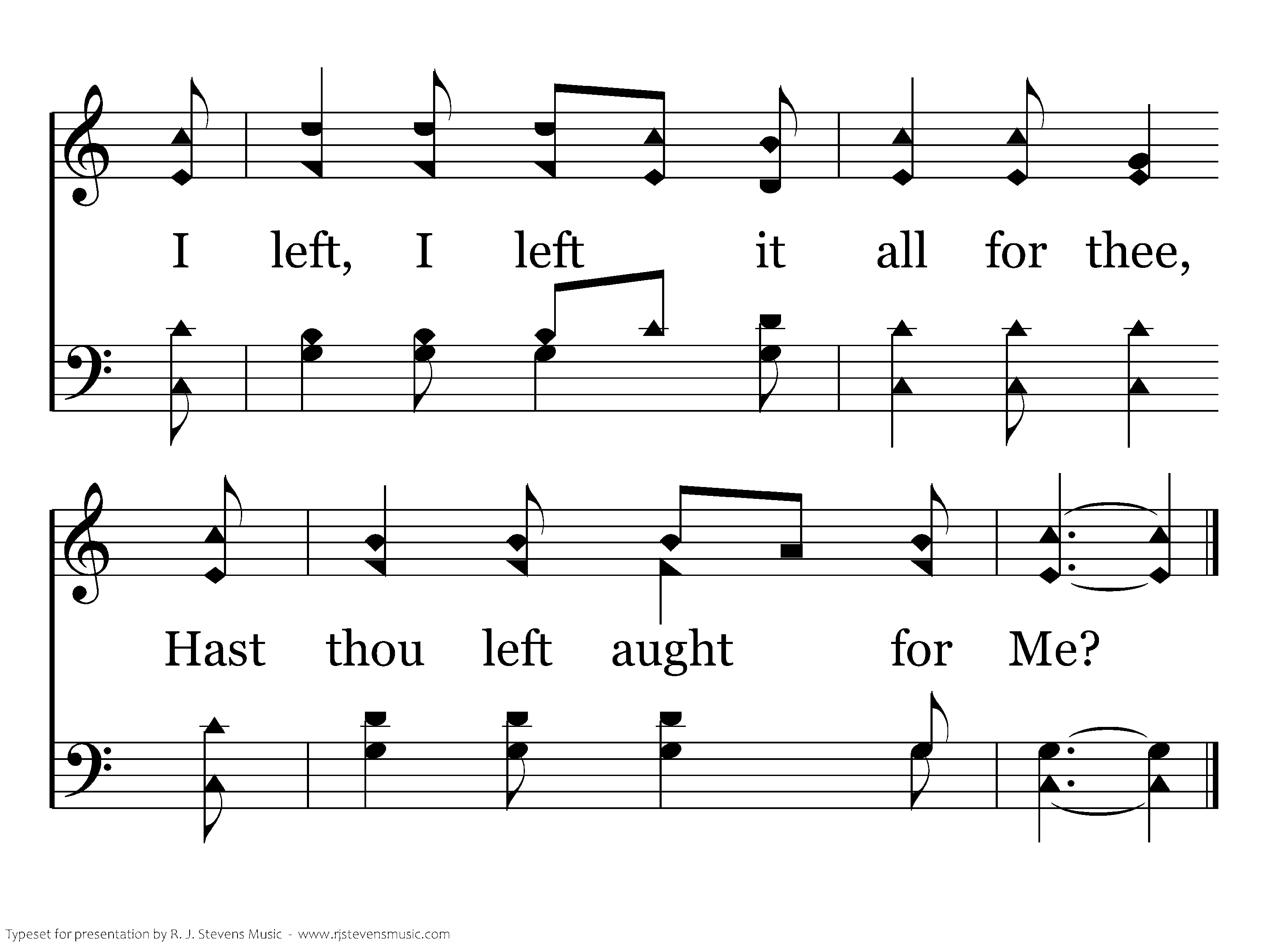 My Father's house of light, My glory'circled throne, I left for earthly night, For wandring sad and lone; I left, I left, it all for thee hast thou left ought for Me? I left I left it all for thee, hast thou left ought for Me?