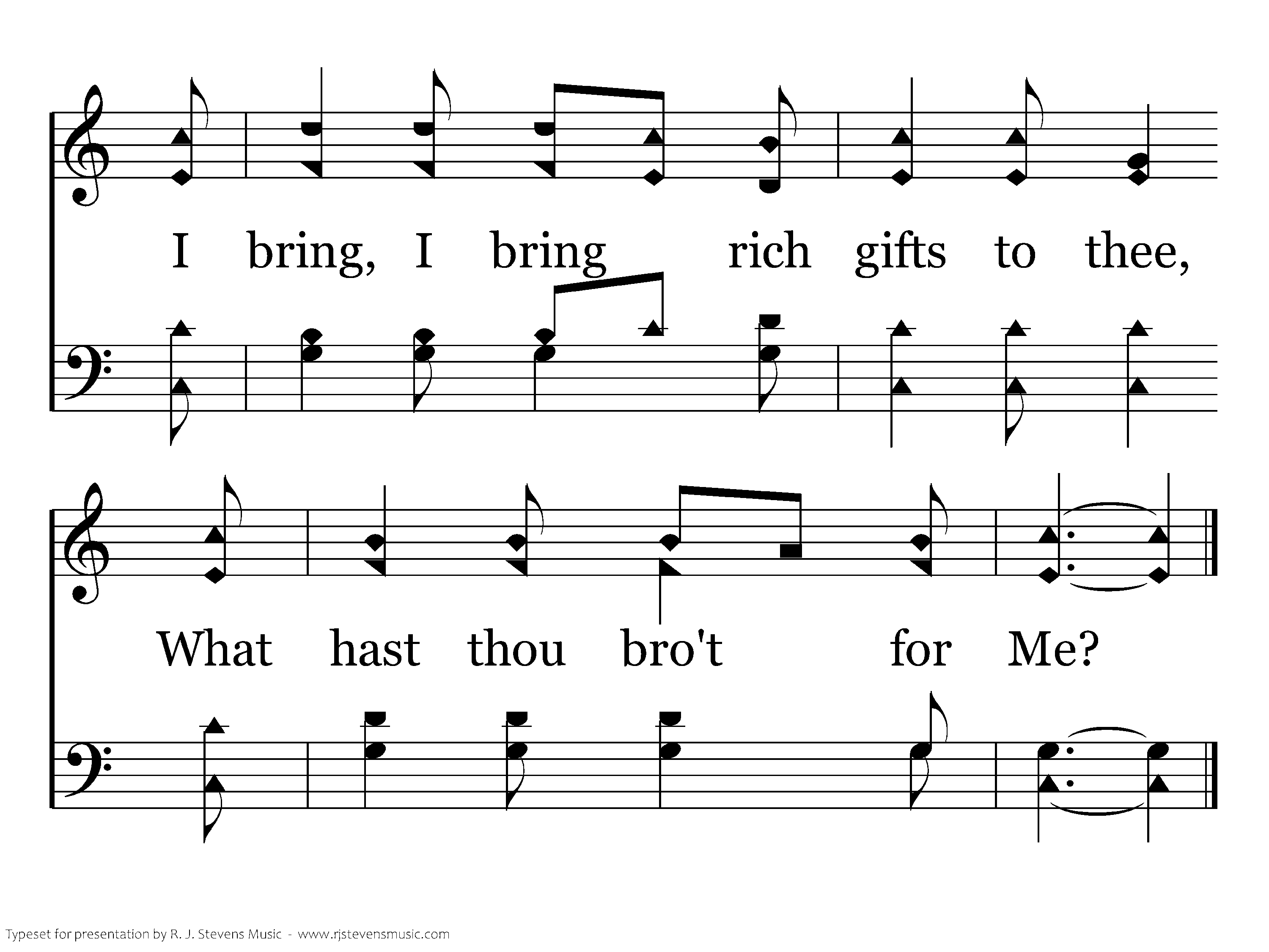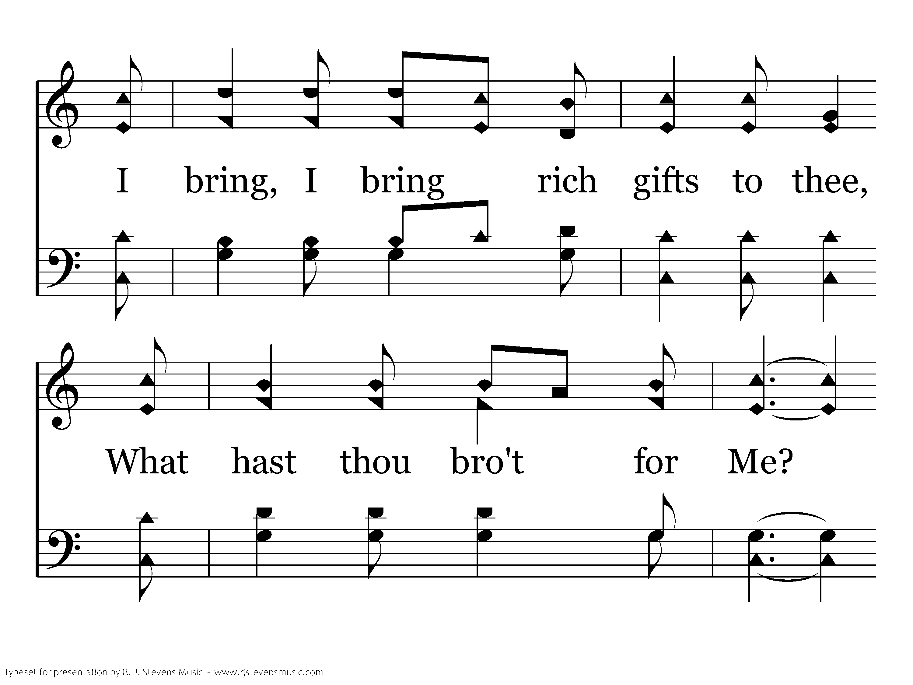 And I have bro't to thee, Down from My home above, Salvation full and free, My pardon and My love, I bring, I bring, rich gifts to the, what hast thou bro't for Me? I bring, I bring rich gifts to thee, what hast thou bro't for Me?