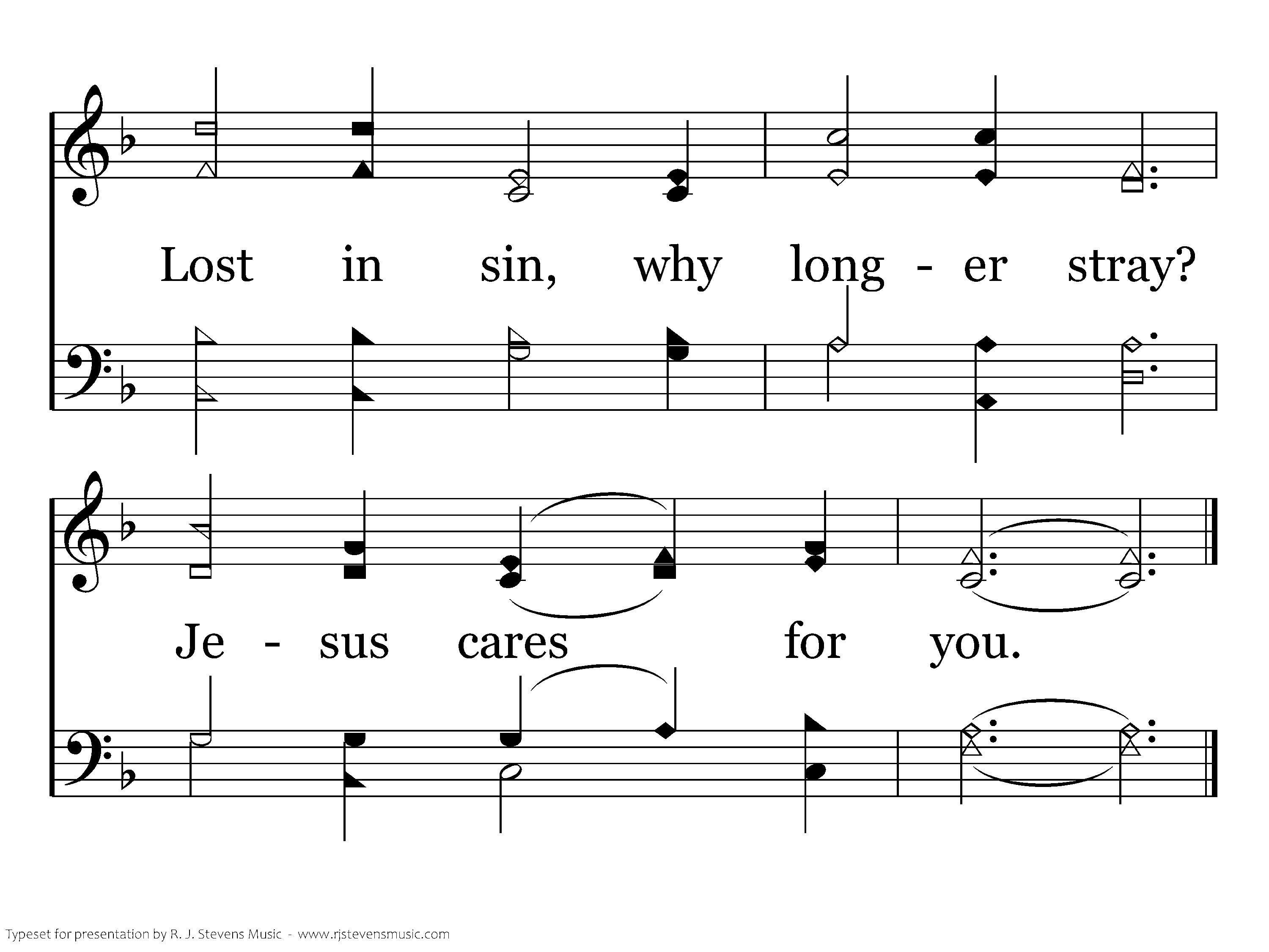He can take your guilt away, give your life anew, Lost in sin, why longer stray? Jesus cares for you?