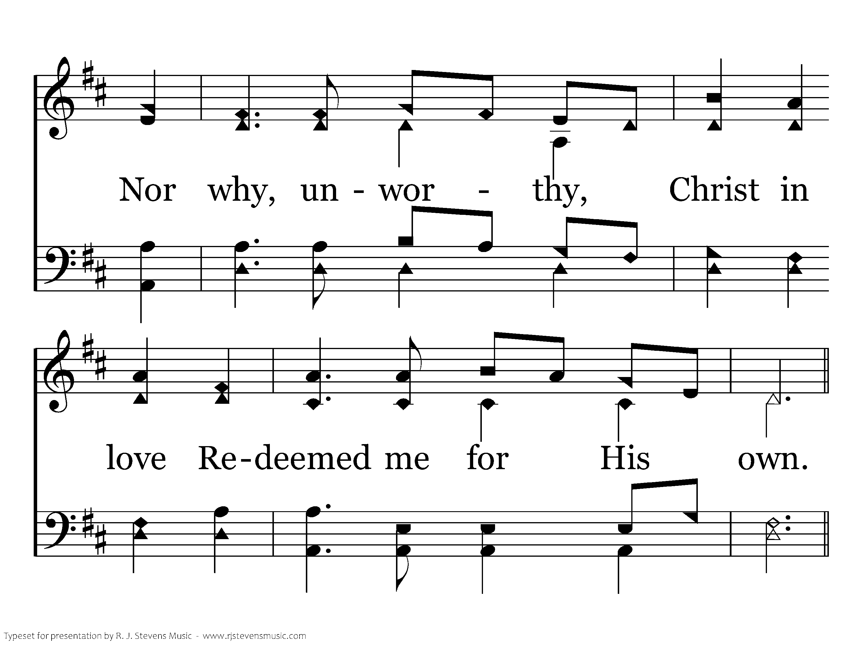 I know not why God's wondrous grace To me He has made known, Nor why unworthy, Christ in love, Redeemed me for his own.