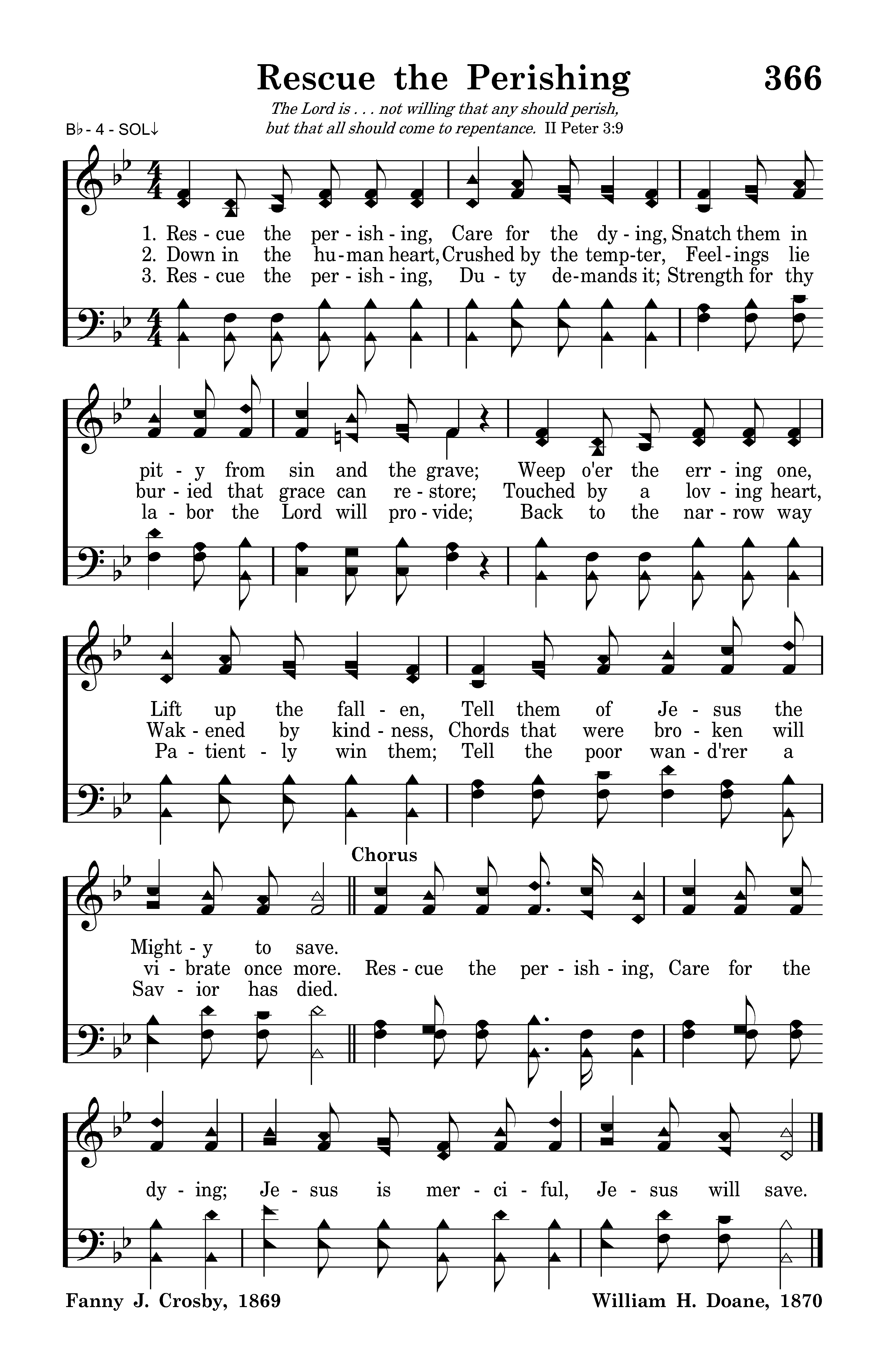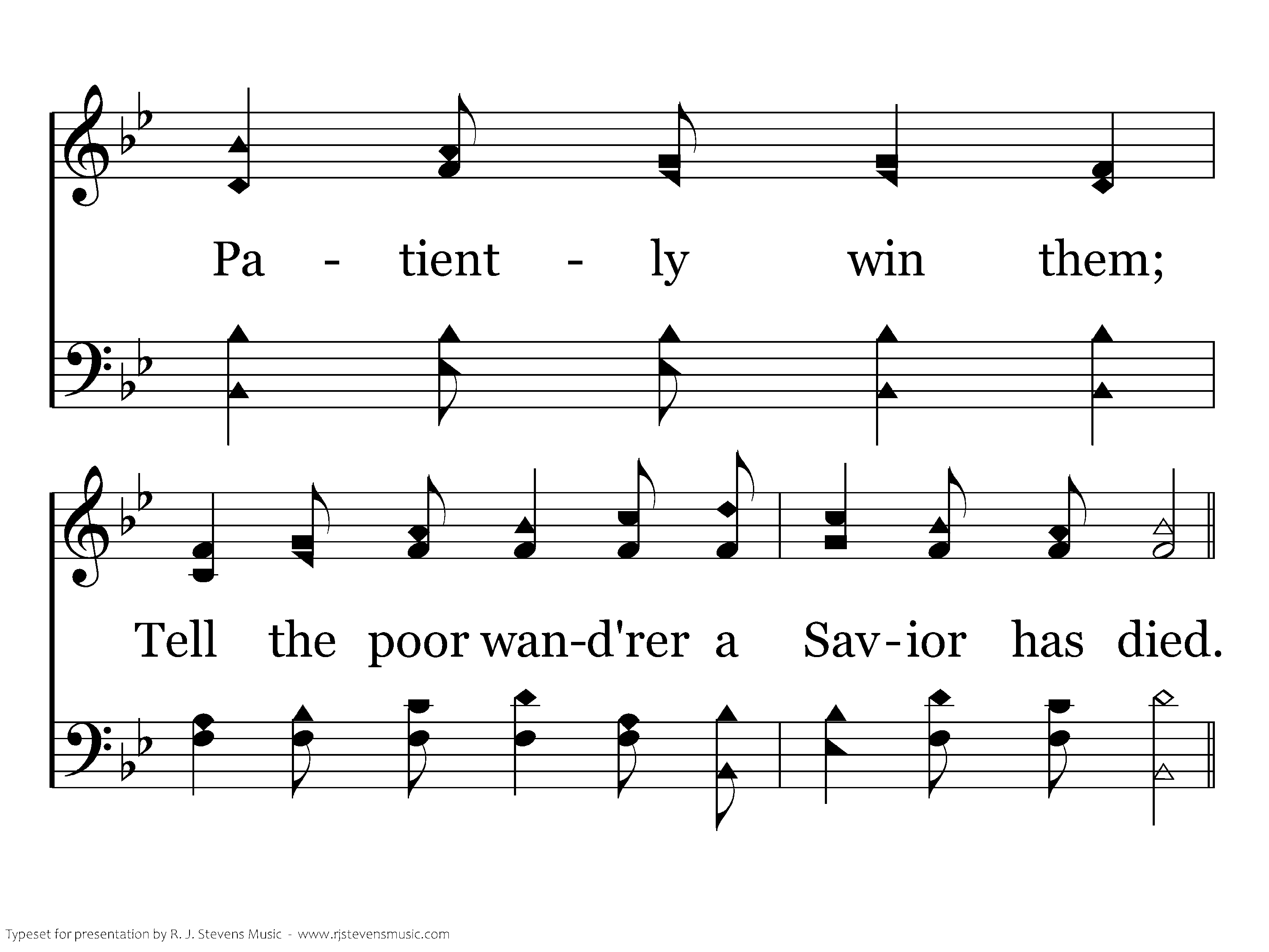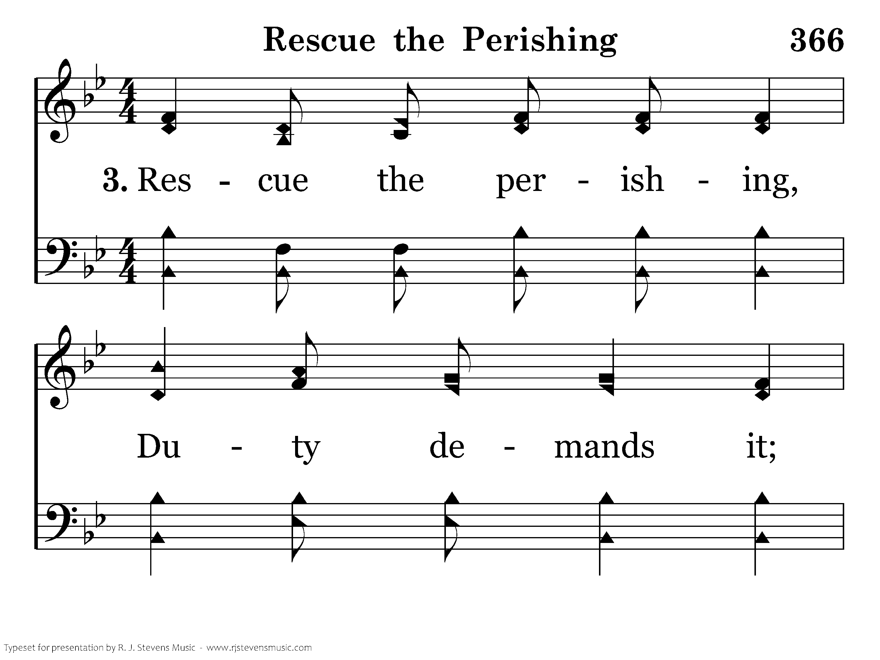 Rescue the perishing, Duty demands it; Strength for thy labor the Lord will provide; Back to the narrow way Patiently win them; Tell the poor wand'rer a Savior has died.
