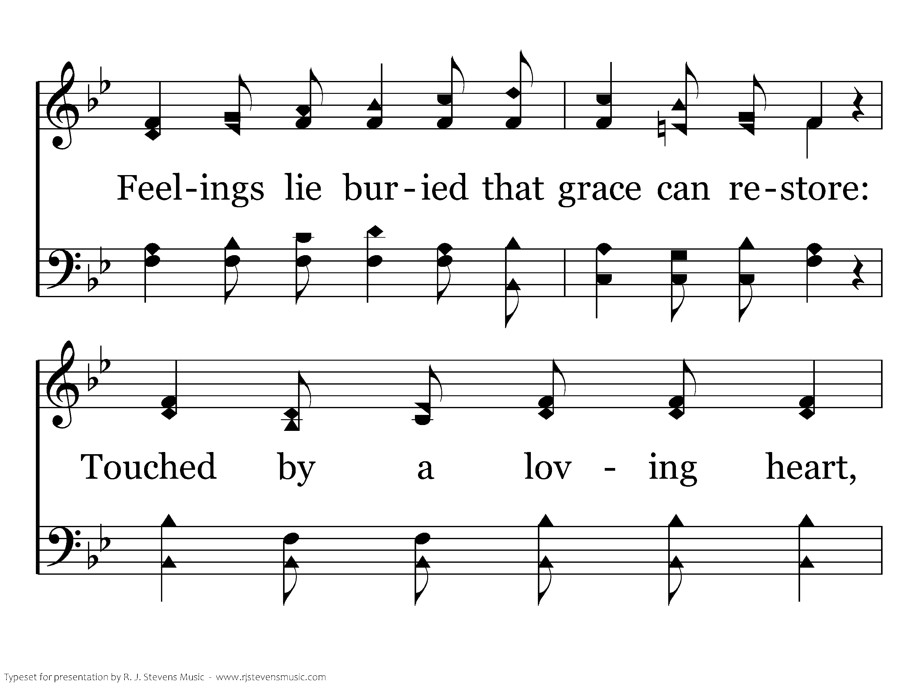 Down in the human heart, Crushed by the tempter, Feelings lie buried that grace can restore; Touched by a loving heart, Wakened by kindness, Chords that were broken will vibrate once more.