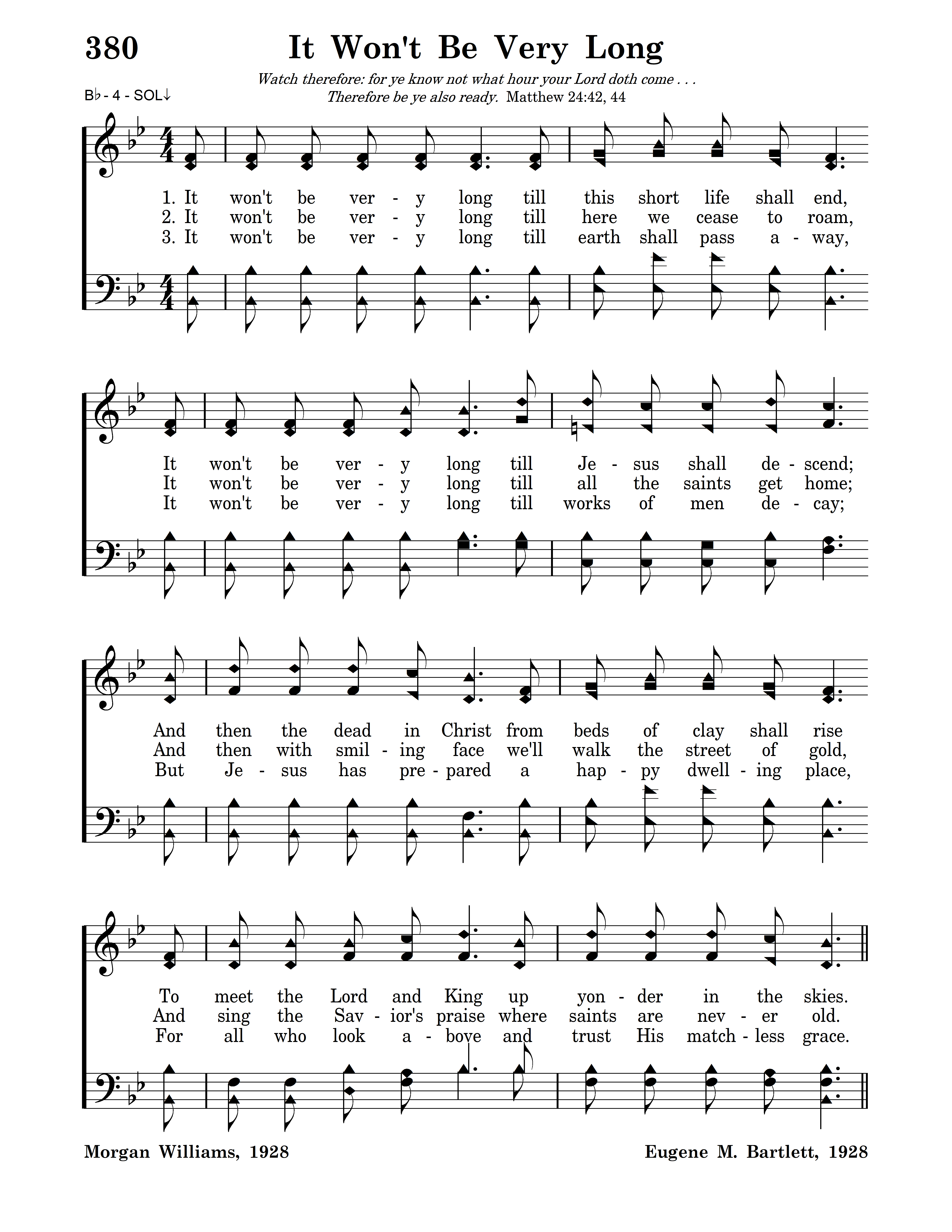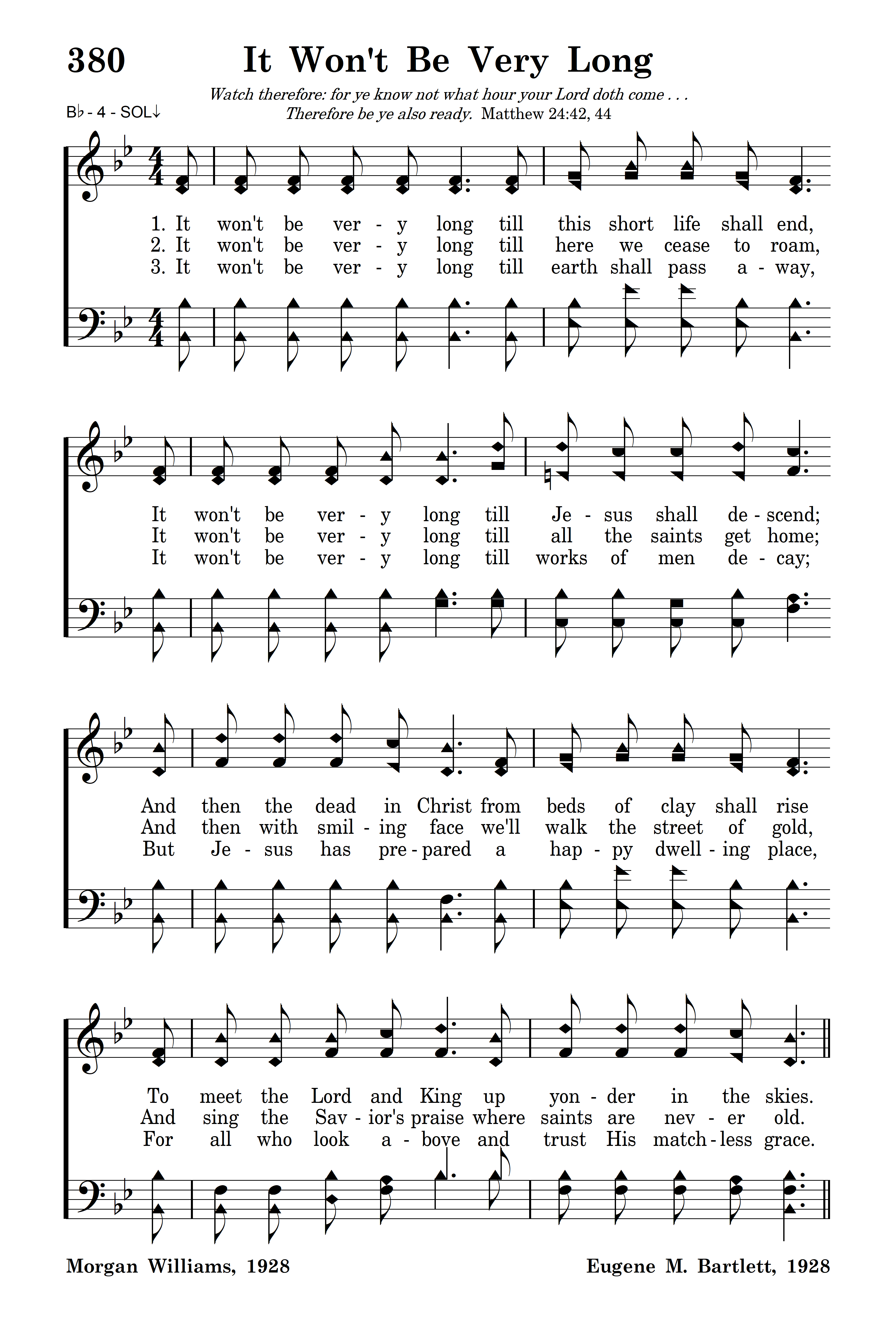 It won't be very long till this short life shall end, It won't be very long till Jesus shall descend; And then the dead in Christ from beds of clay shall rise To meet the Lord and King up yonder in the skies.