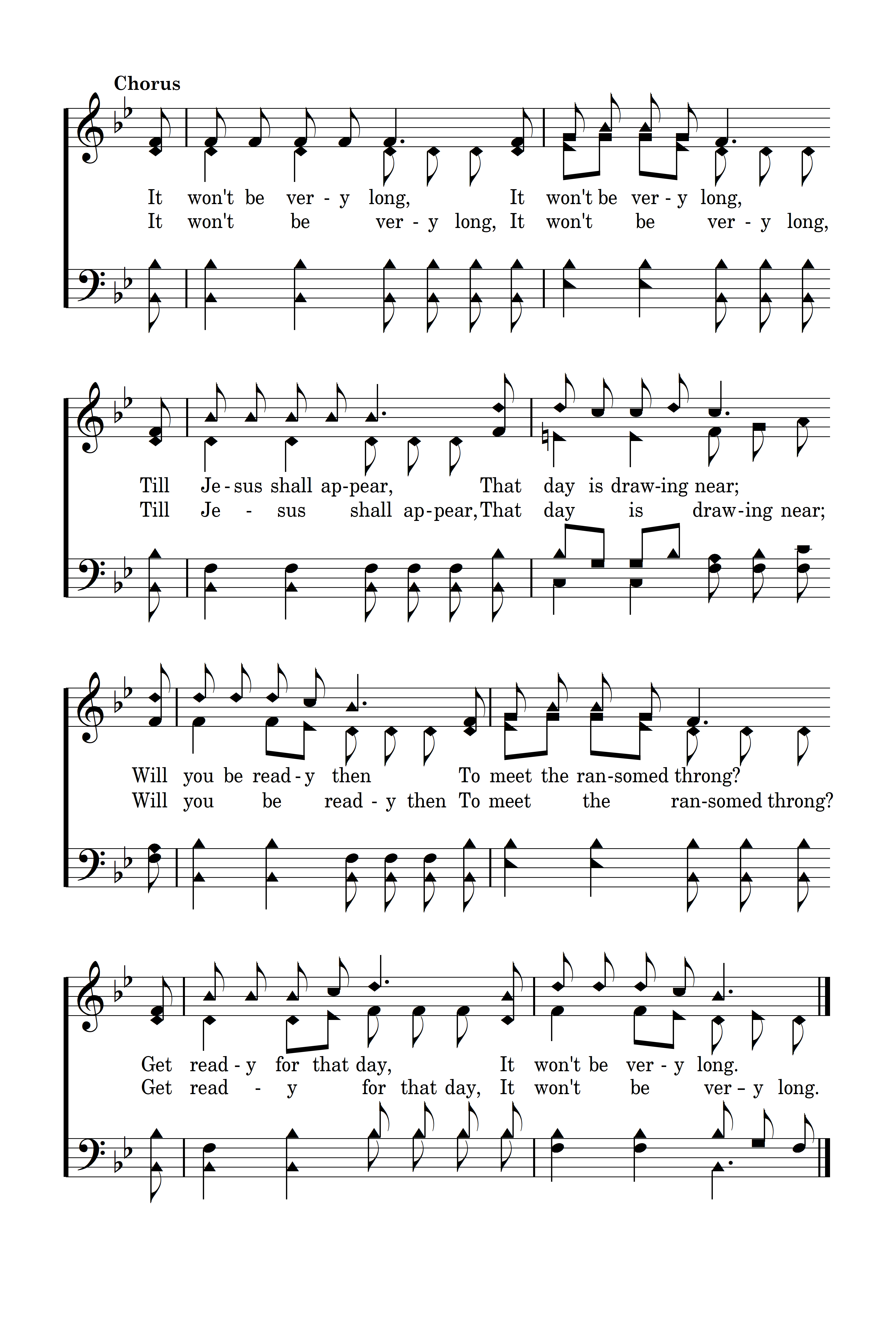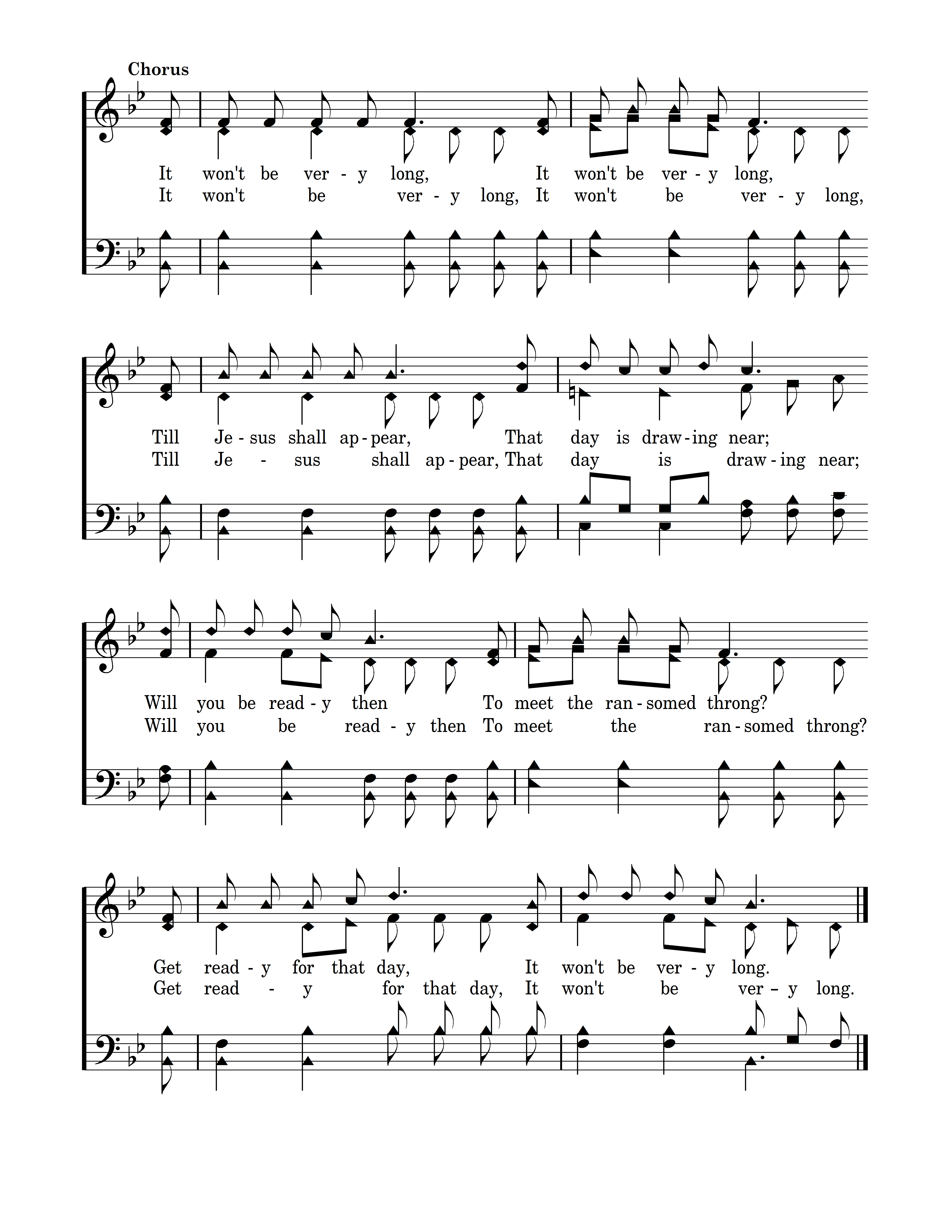 It won't be very long It won't be very long Till Jesus shall appear, That day is drawing near; Will you be ready then To meet the ransomed throng? Get ready for that day, It won't be very long.