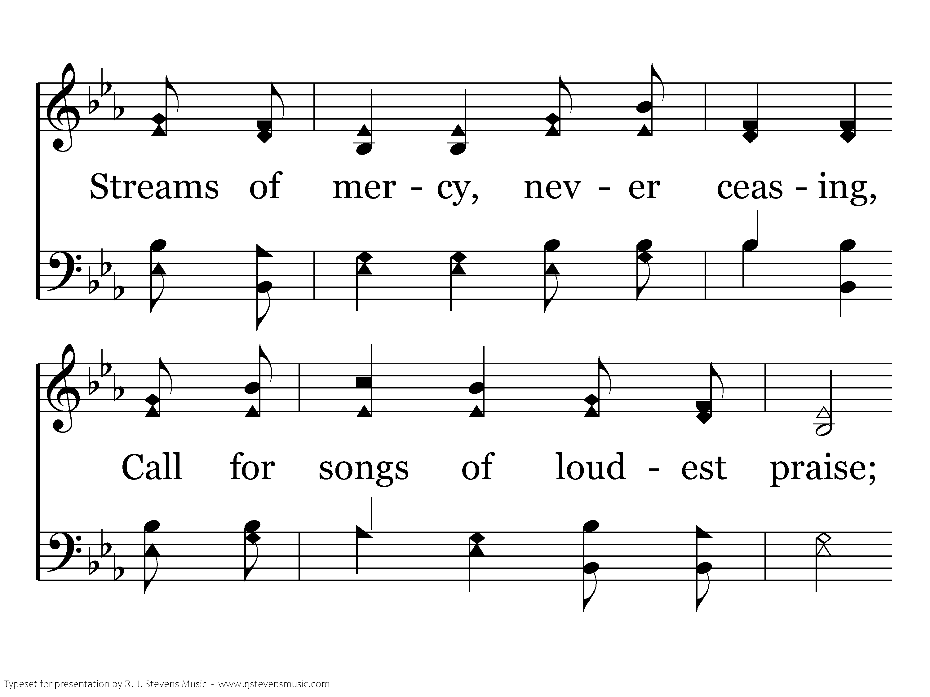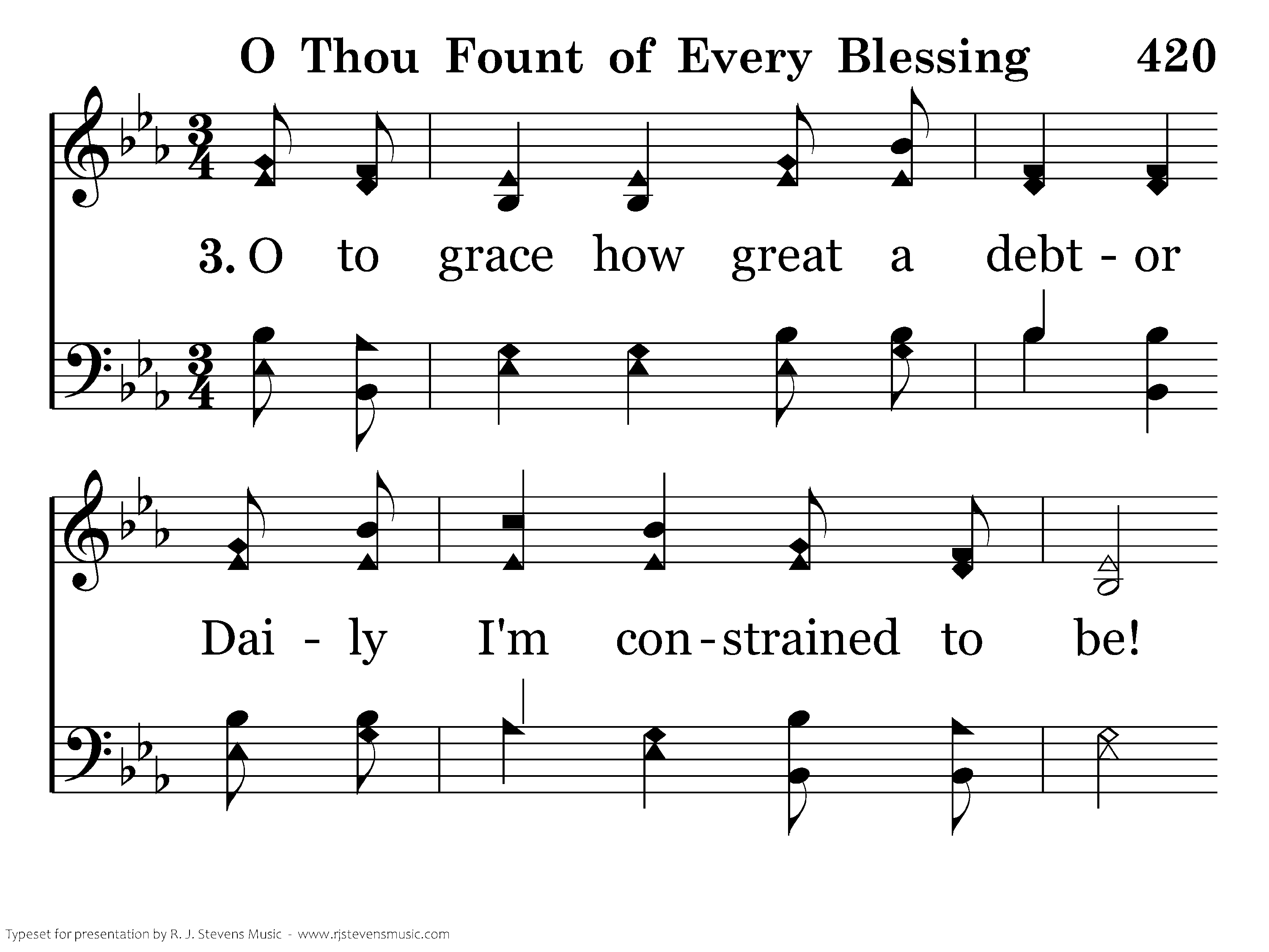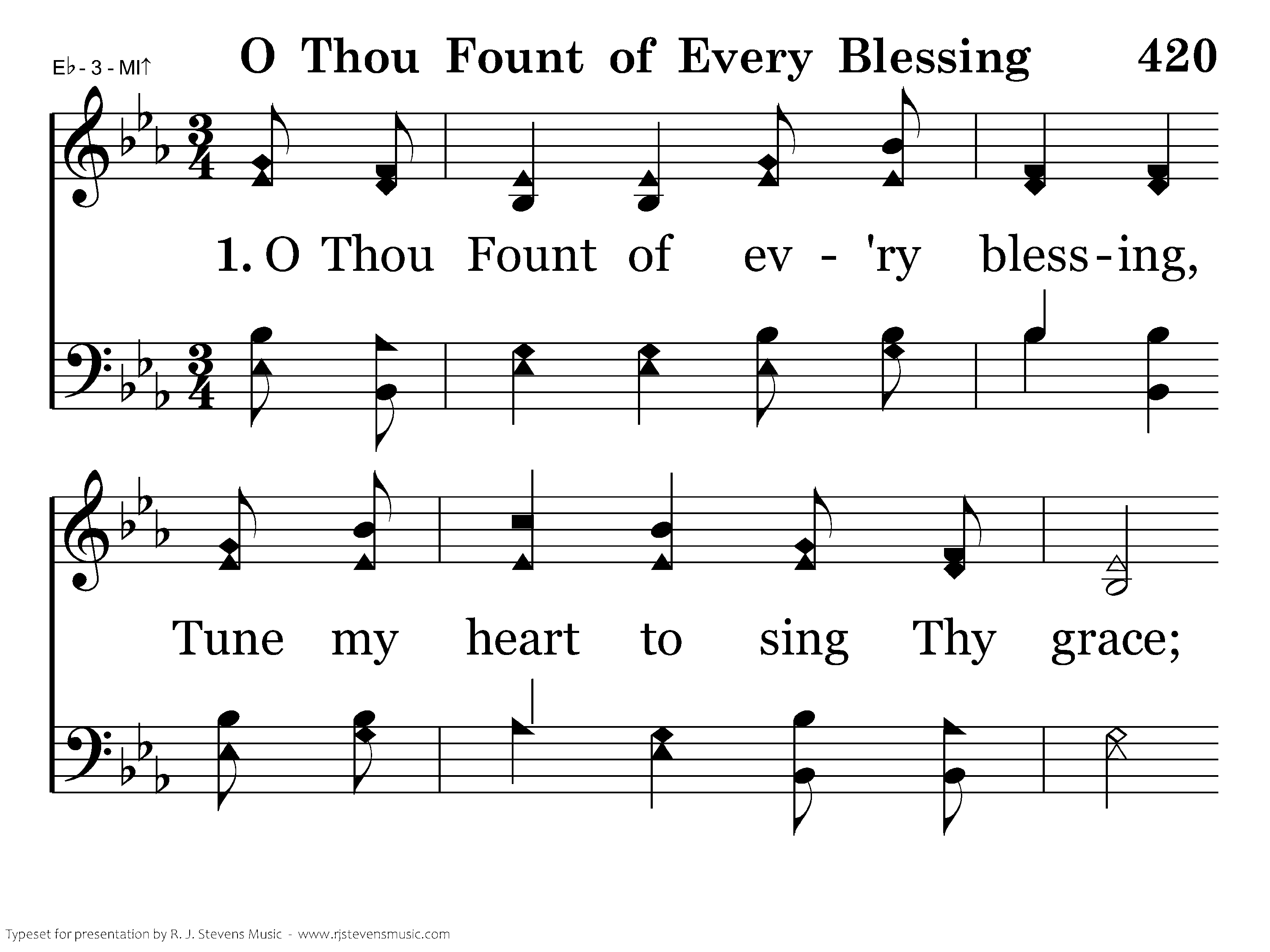 O Thou Fount of ev'ry blessing, Tune my heart to sing Thy grace; Streams of mercy, never ceasing, Call for songs of loudest praise; Teach me ever to adore Thee; May I still Thy goodness prove; While the hope of endless glory, Fills my heart with joy and love.