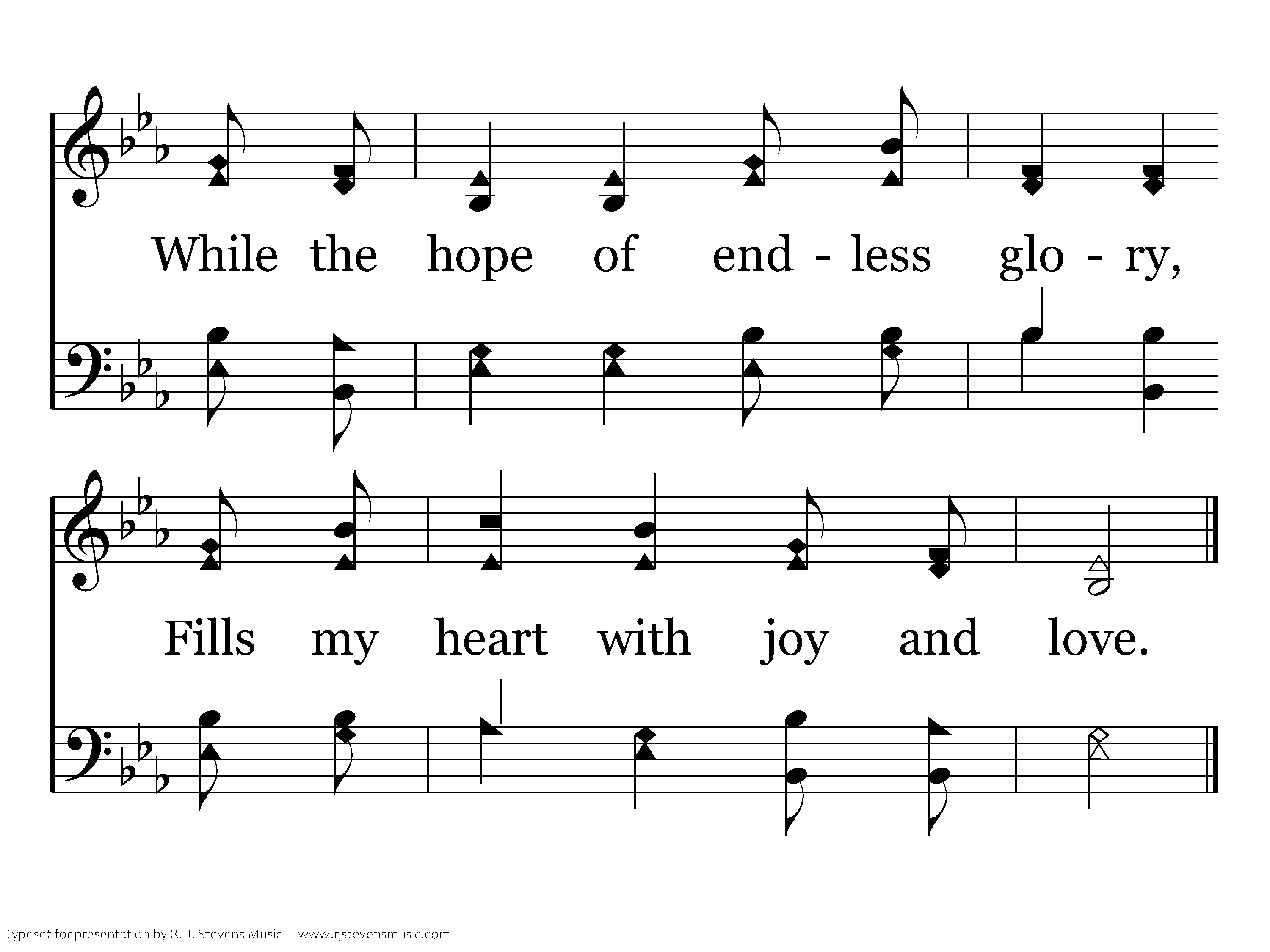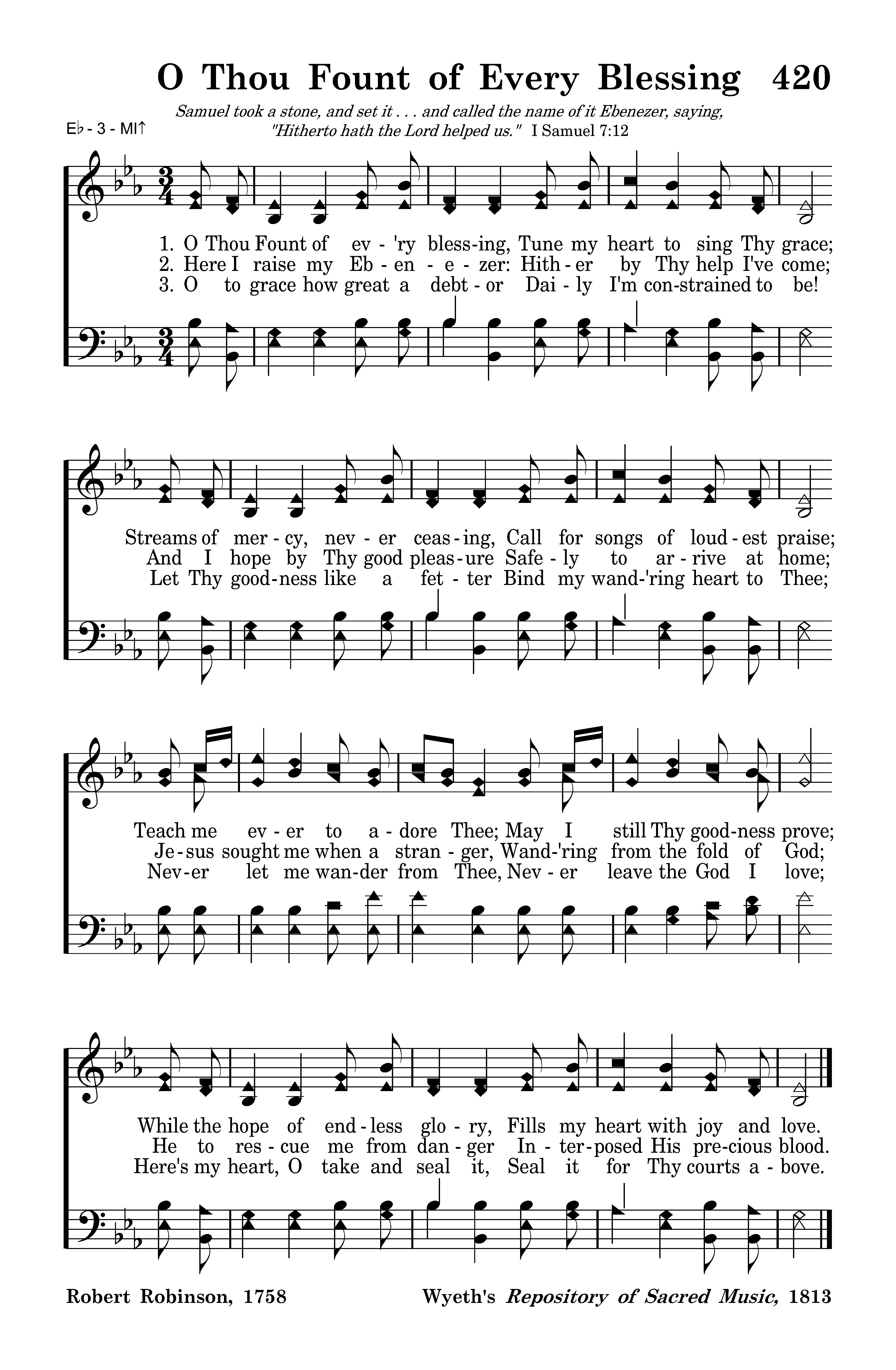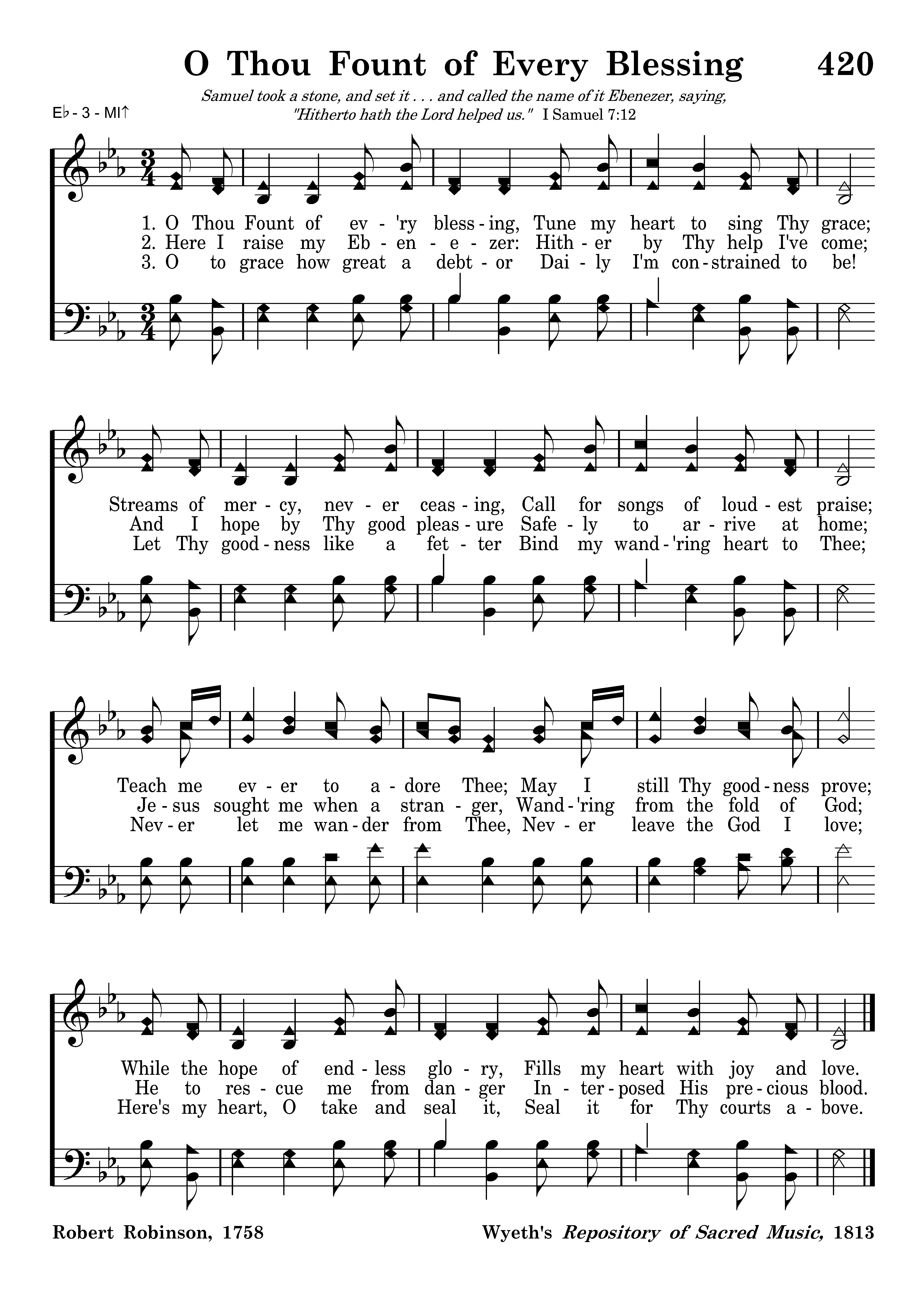 O Thou Fount of ev'ry blessing, Tune my heart to sing Thy grace; Streams of mercy, never ceasing, Call for songs of loudest praise; Teach me ever to adore Thee; May I still Thy goodness prove; While the hope of endless glory, Fills my heart with joy and love.