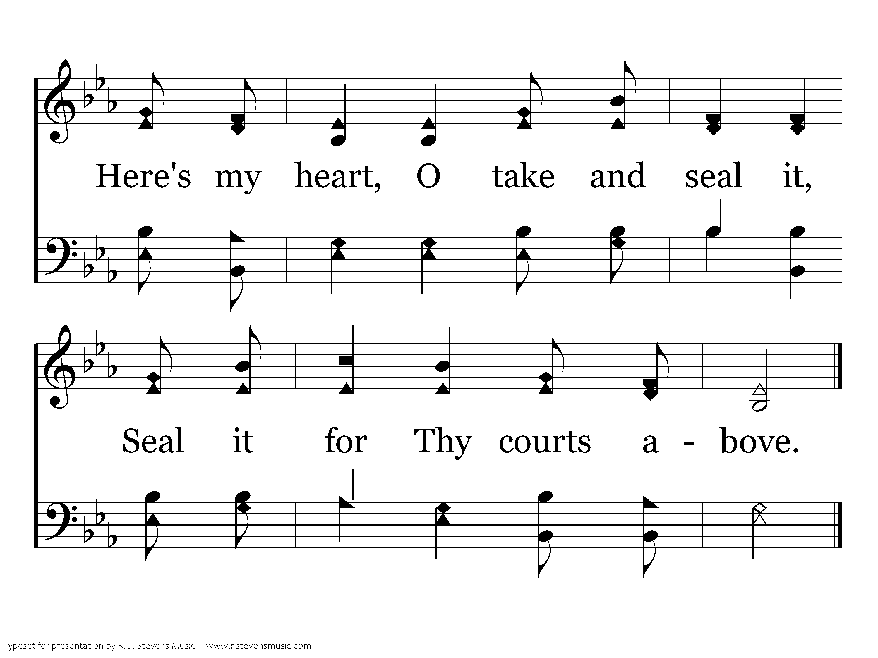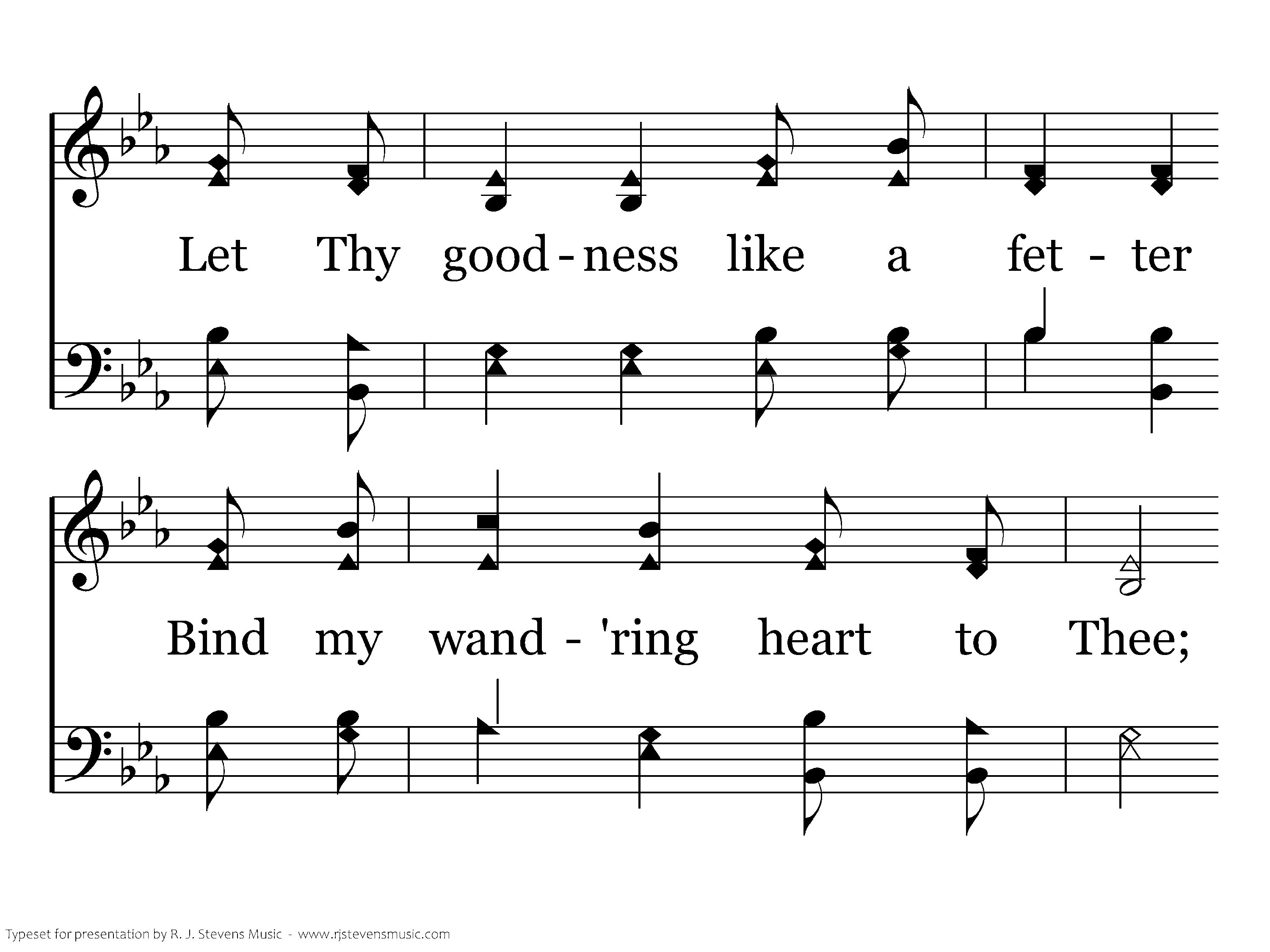 O to grace how great a debtor Daily I'm constrained to be! Let Thy goodness like a fetter Bind my wand'ring heart to Thee; Never let me wander from Thee, Never leave the God I love; Here's my heart, O take and seal it, Seal it for Thy courts above.