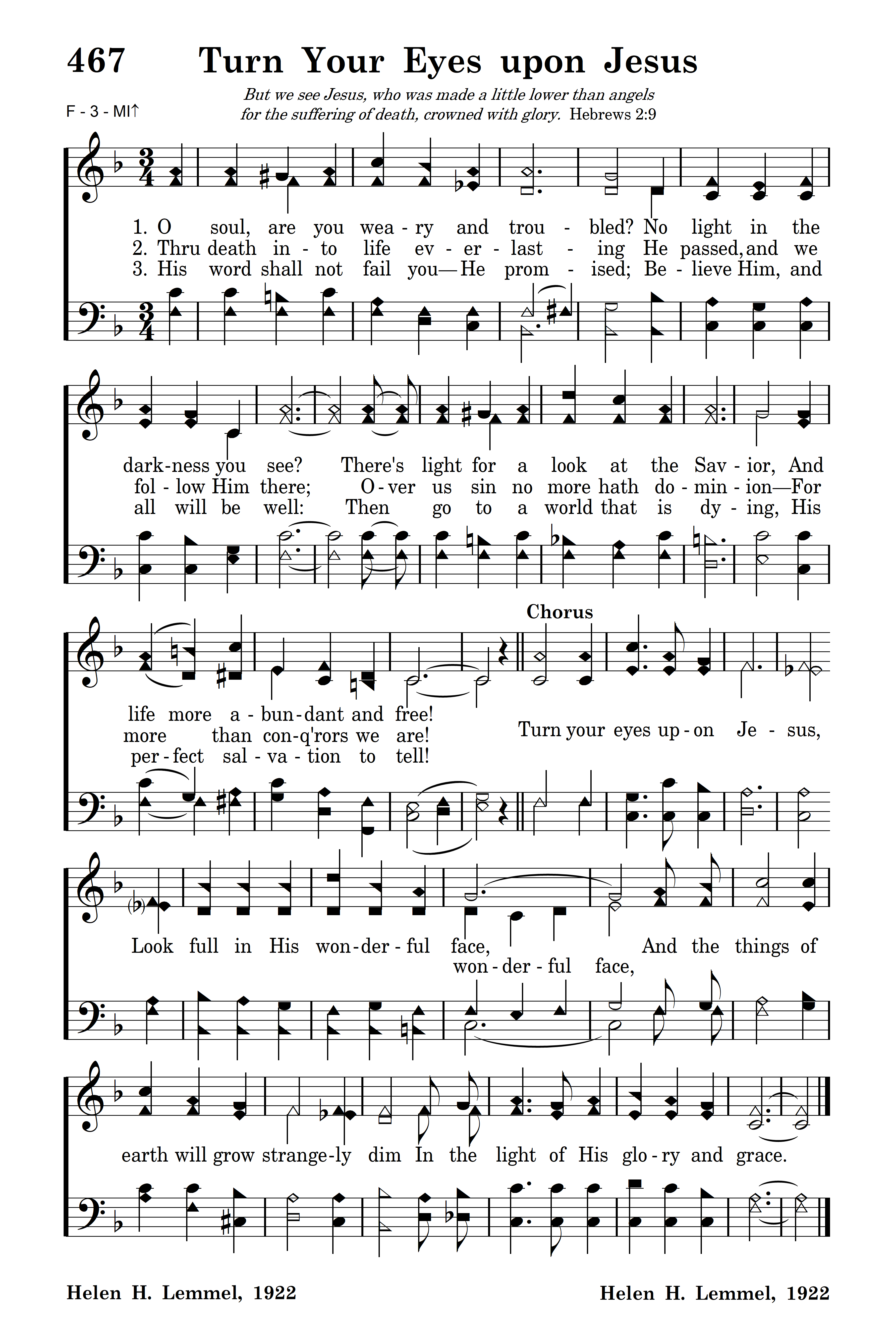 Turn your eyes upon Jesus, Look full in His wonderful face, And the things of earth will grow strangely dim In the light of His glory and grace.