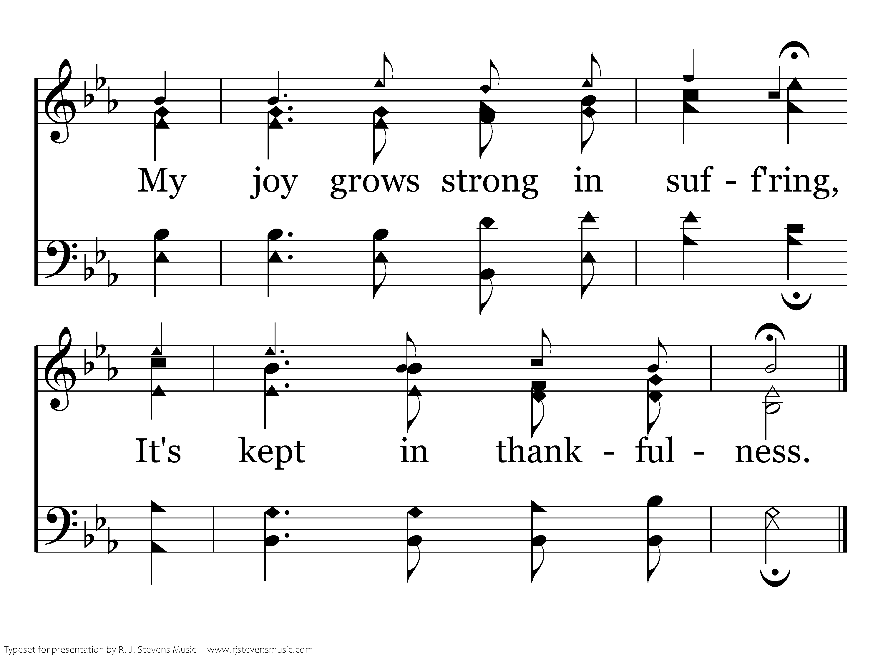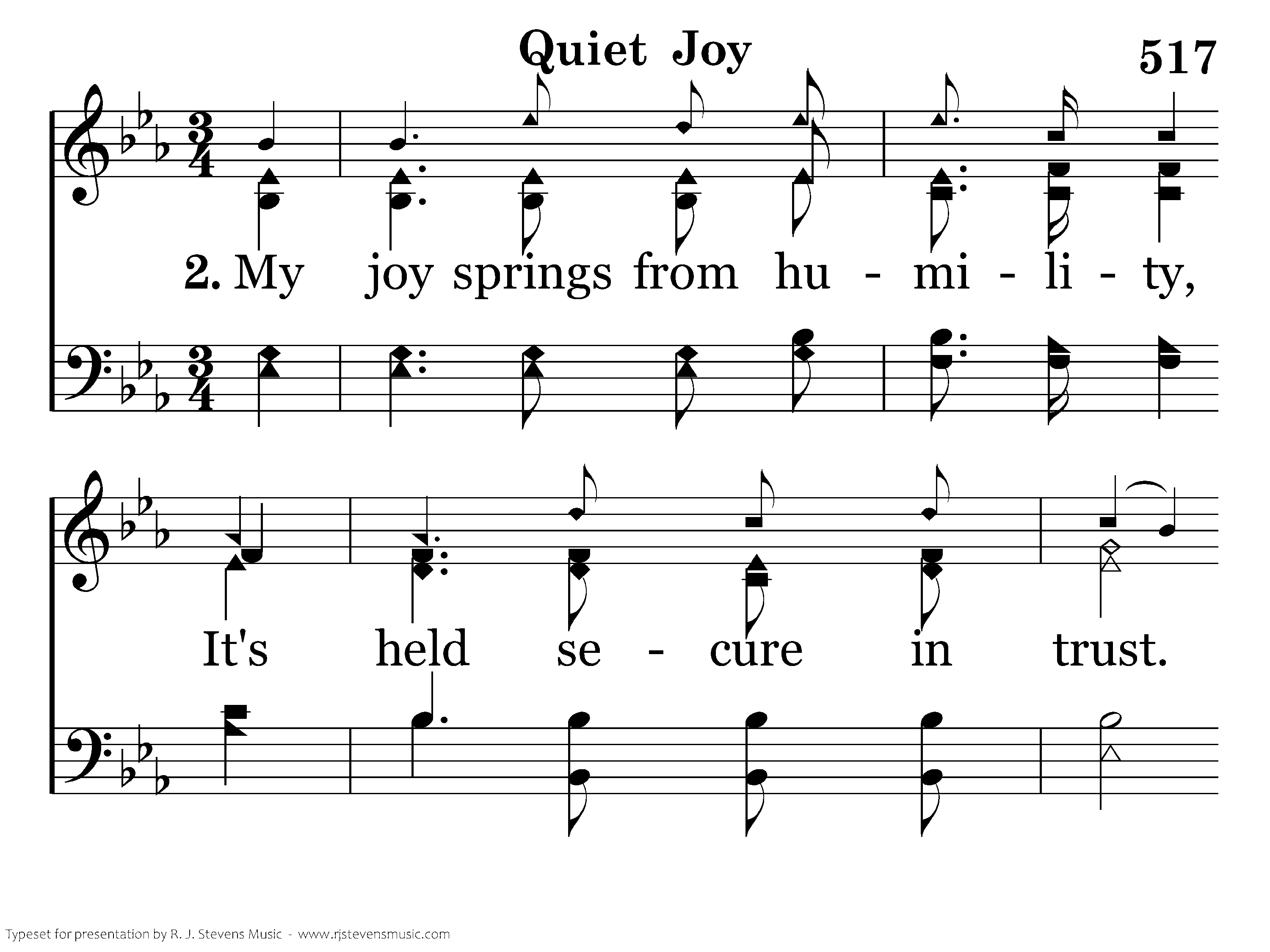 My joy springs from humility, It's held secure in trust. My joy grows strong in suff'ring, It's kept in thankfulness.