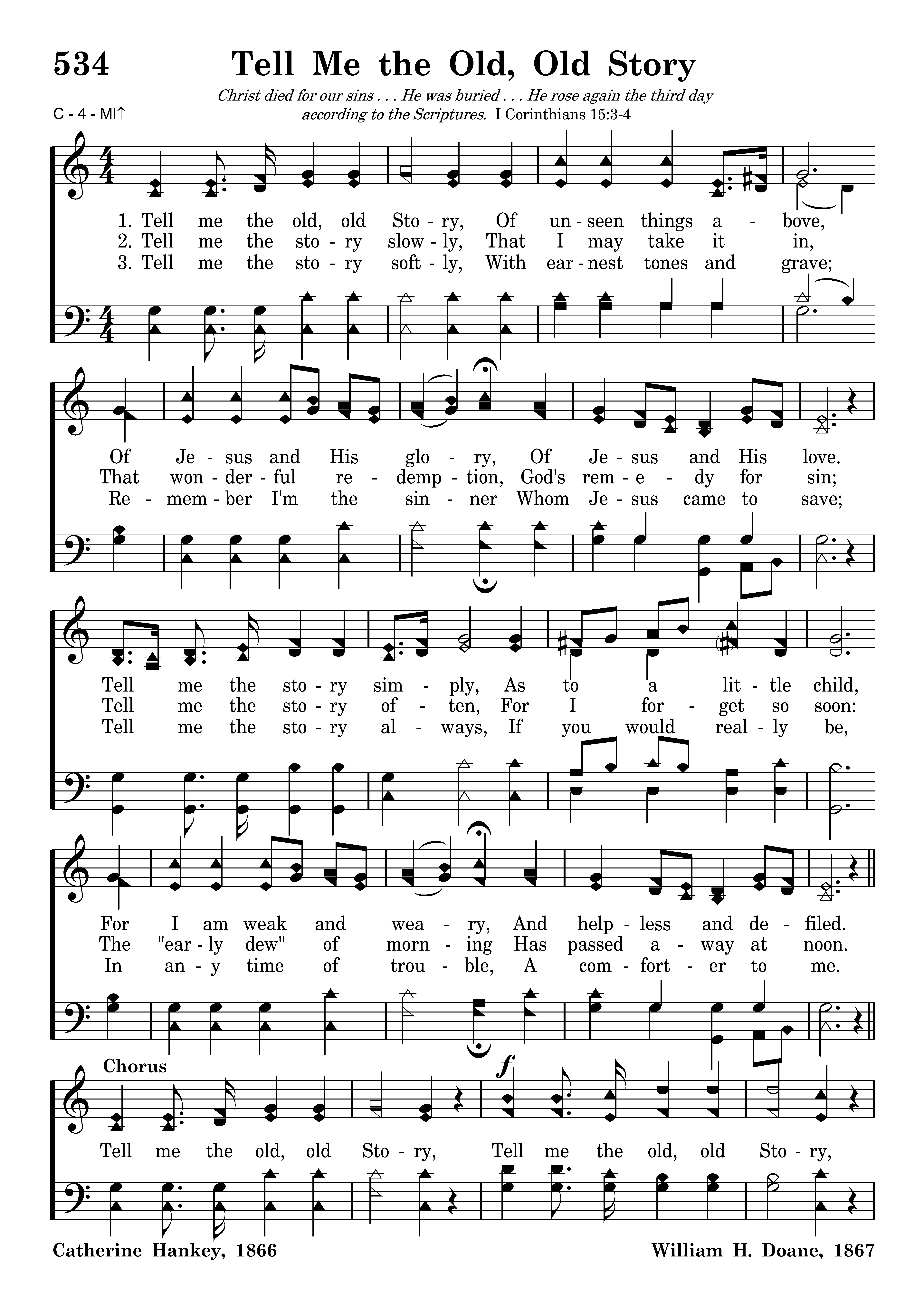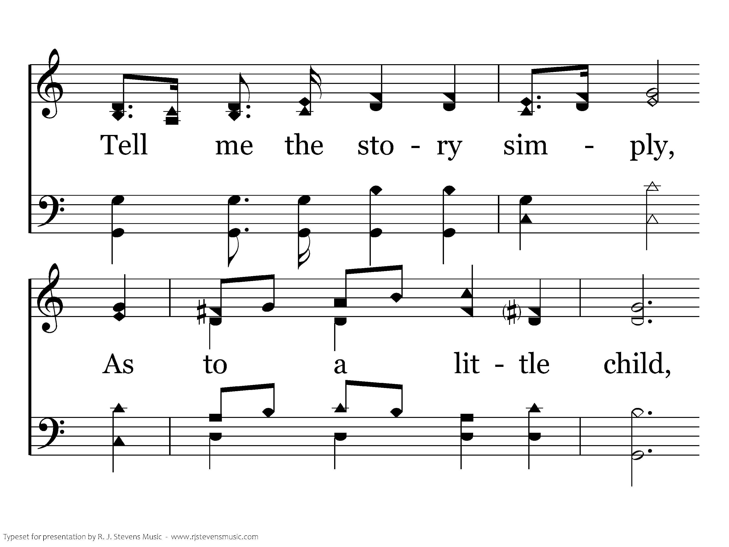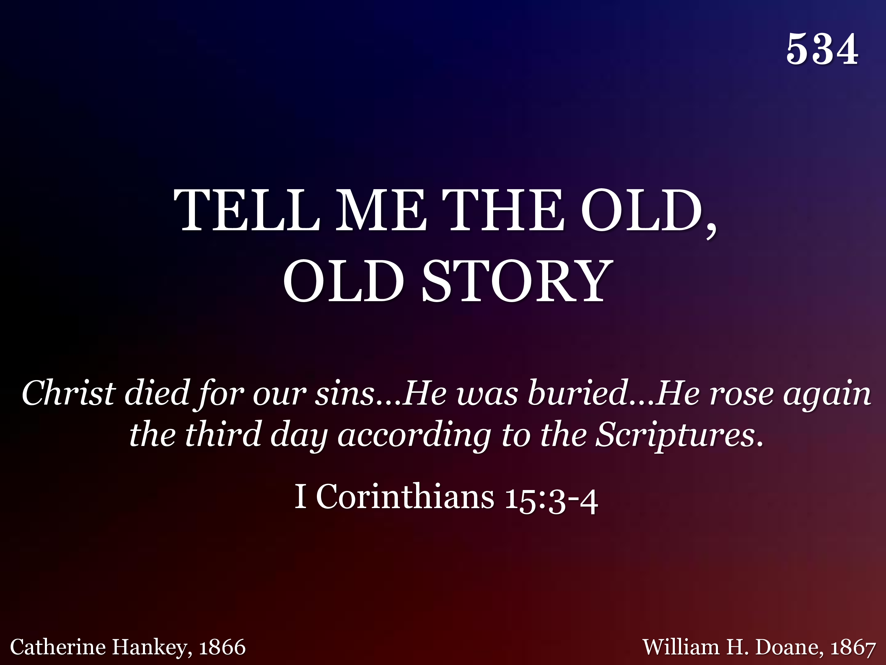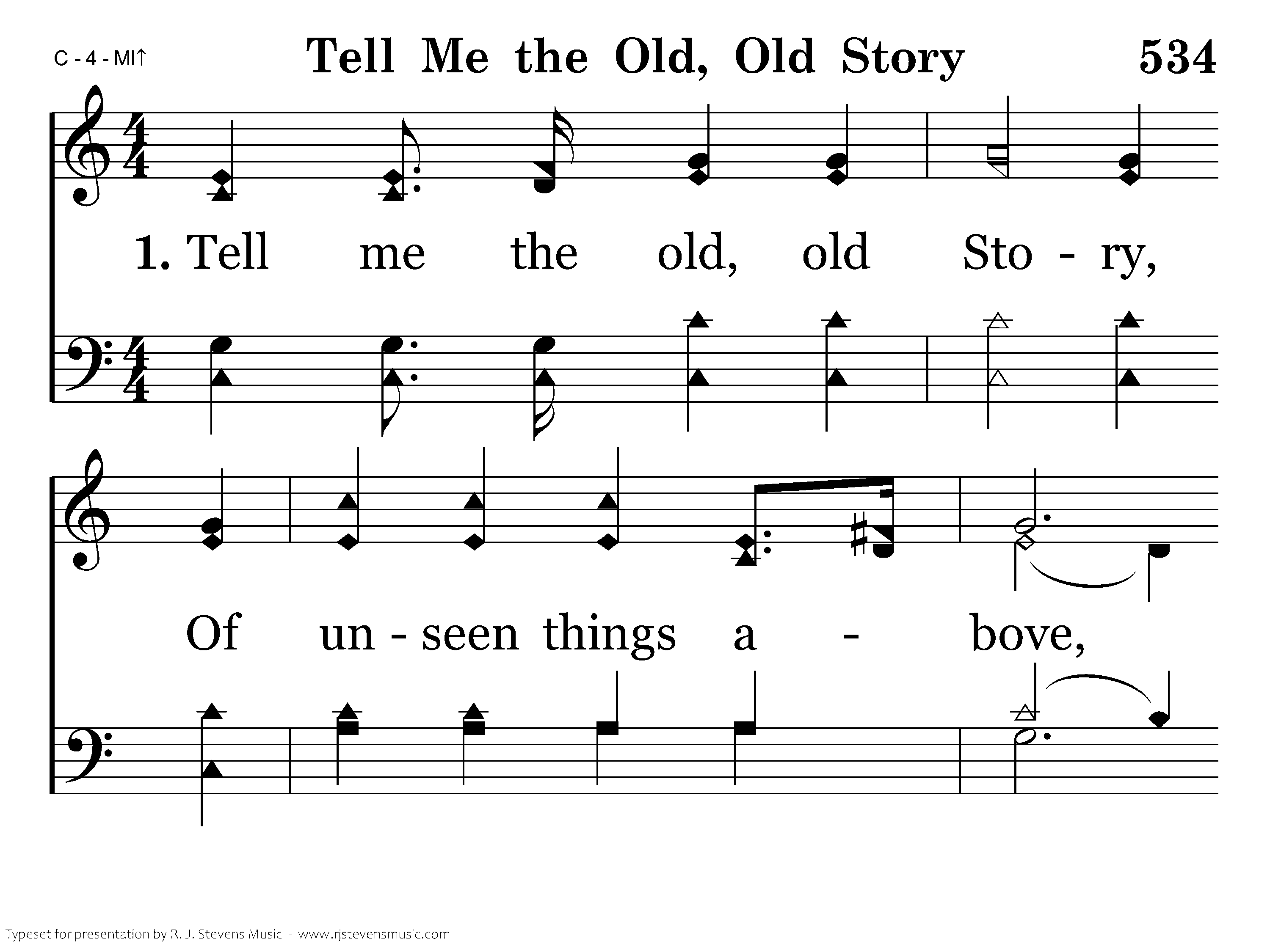 Tell me the old, old Story, Of unseen things above, Of Jesus and His glory, Of Jesus and His love. Tell me the story simply, As to a little child, For I am weak and weary, And helpless and defiled.