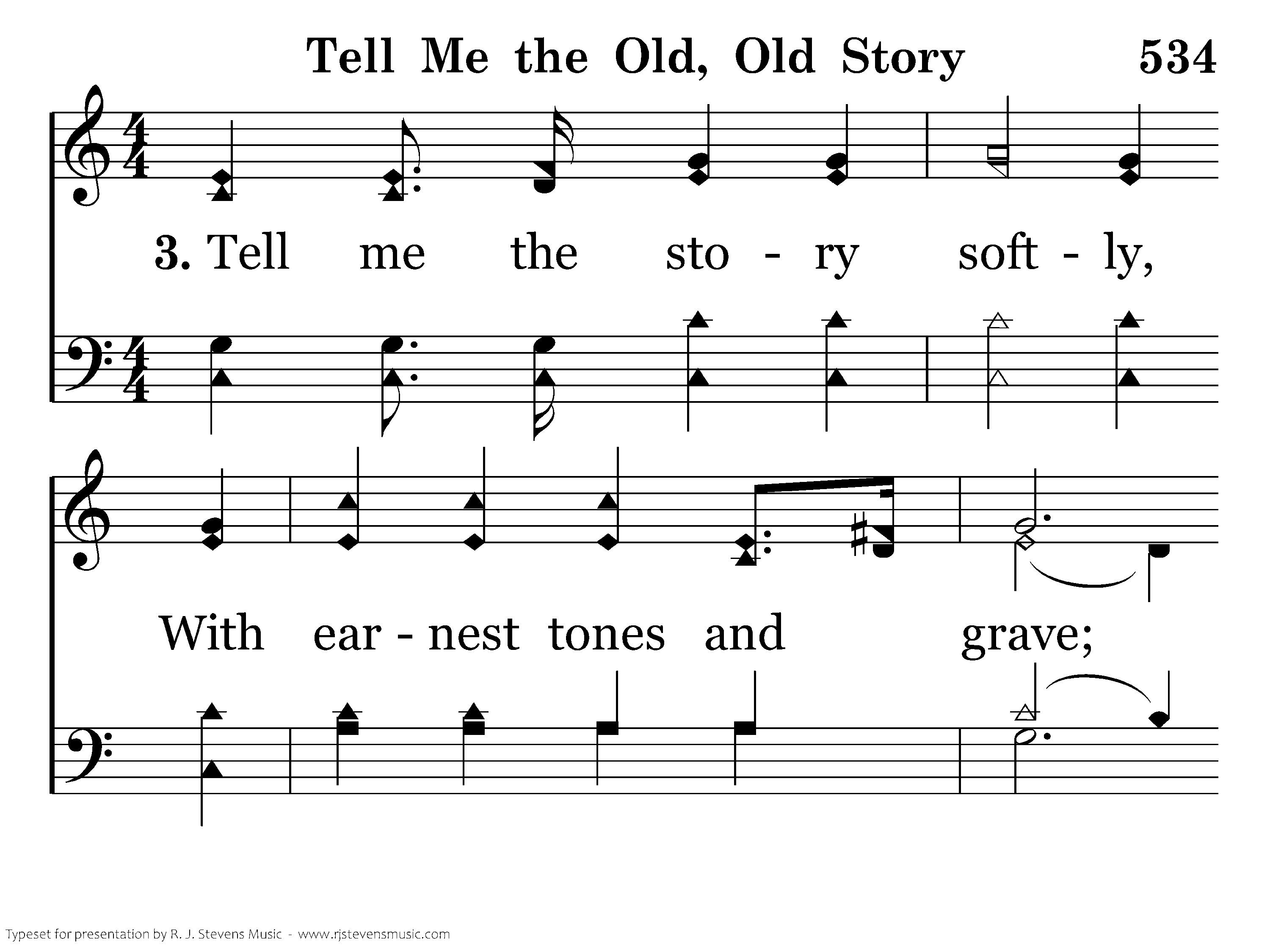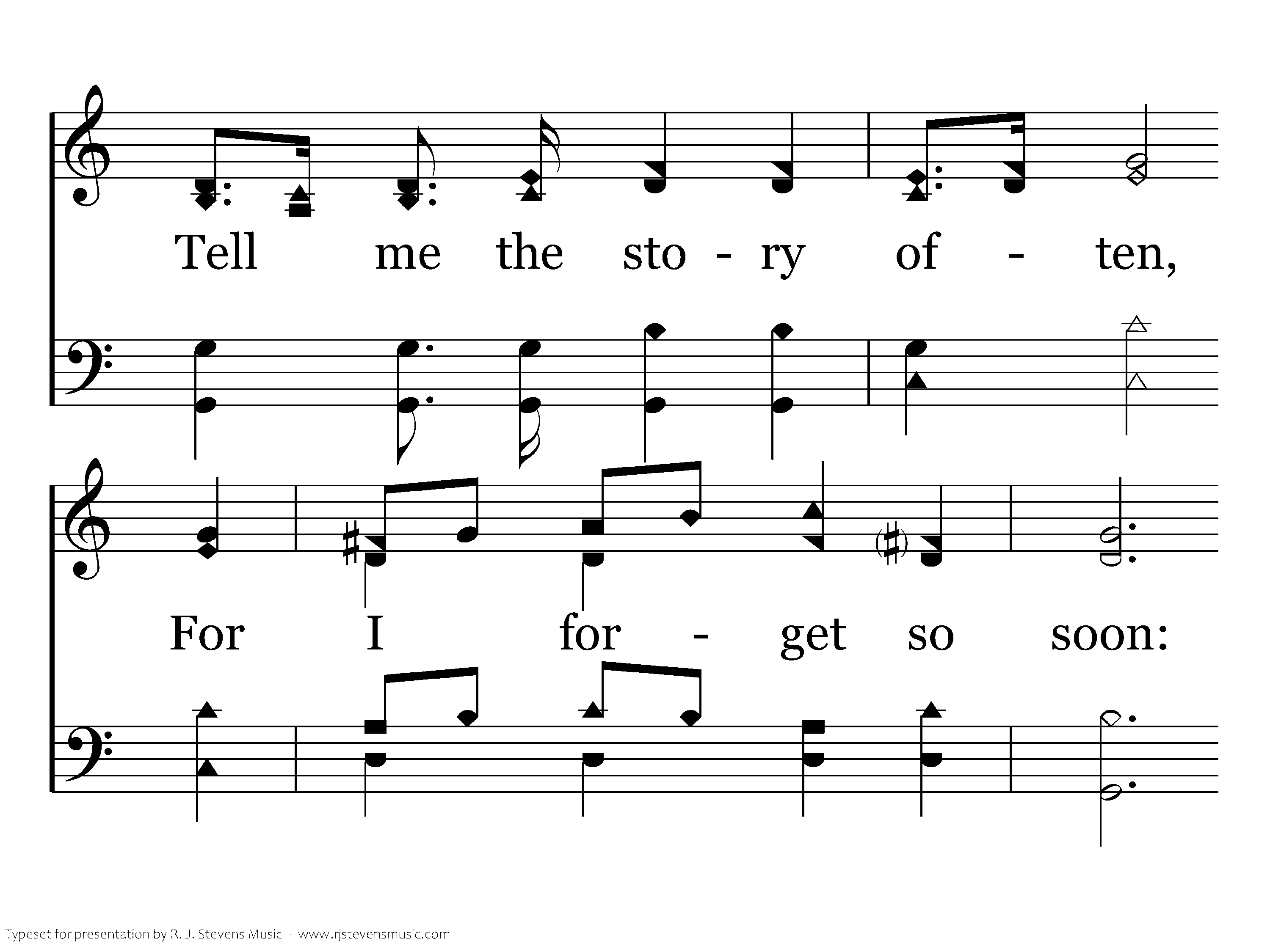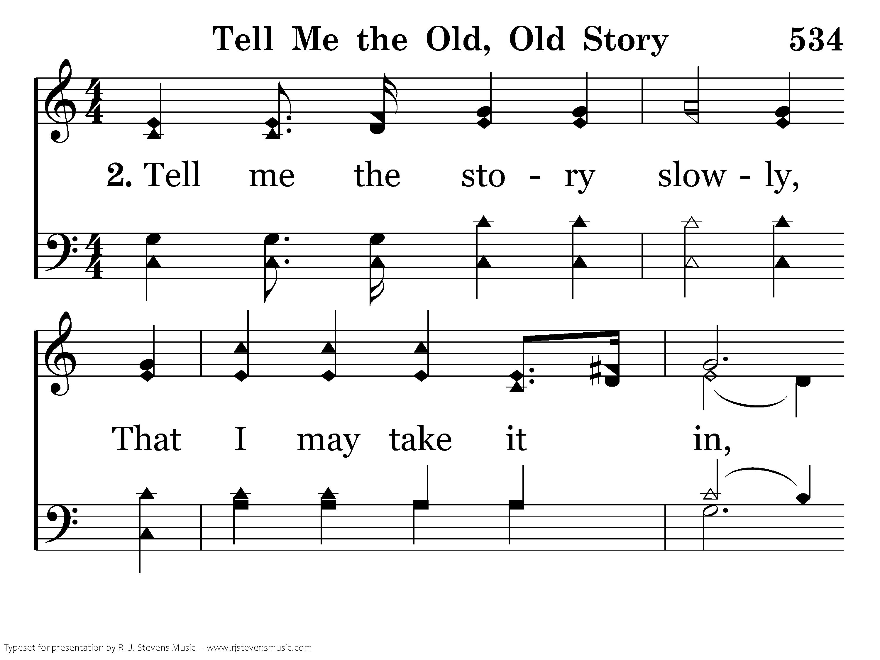 Tell me the story slowly, That I may take it in, That wonderful redemption, God's remedy for sin; Tell me the story often, For I forget so soon: The "early dew" of morning Has passed away at noon.