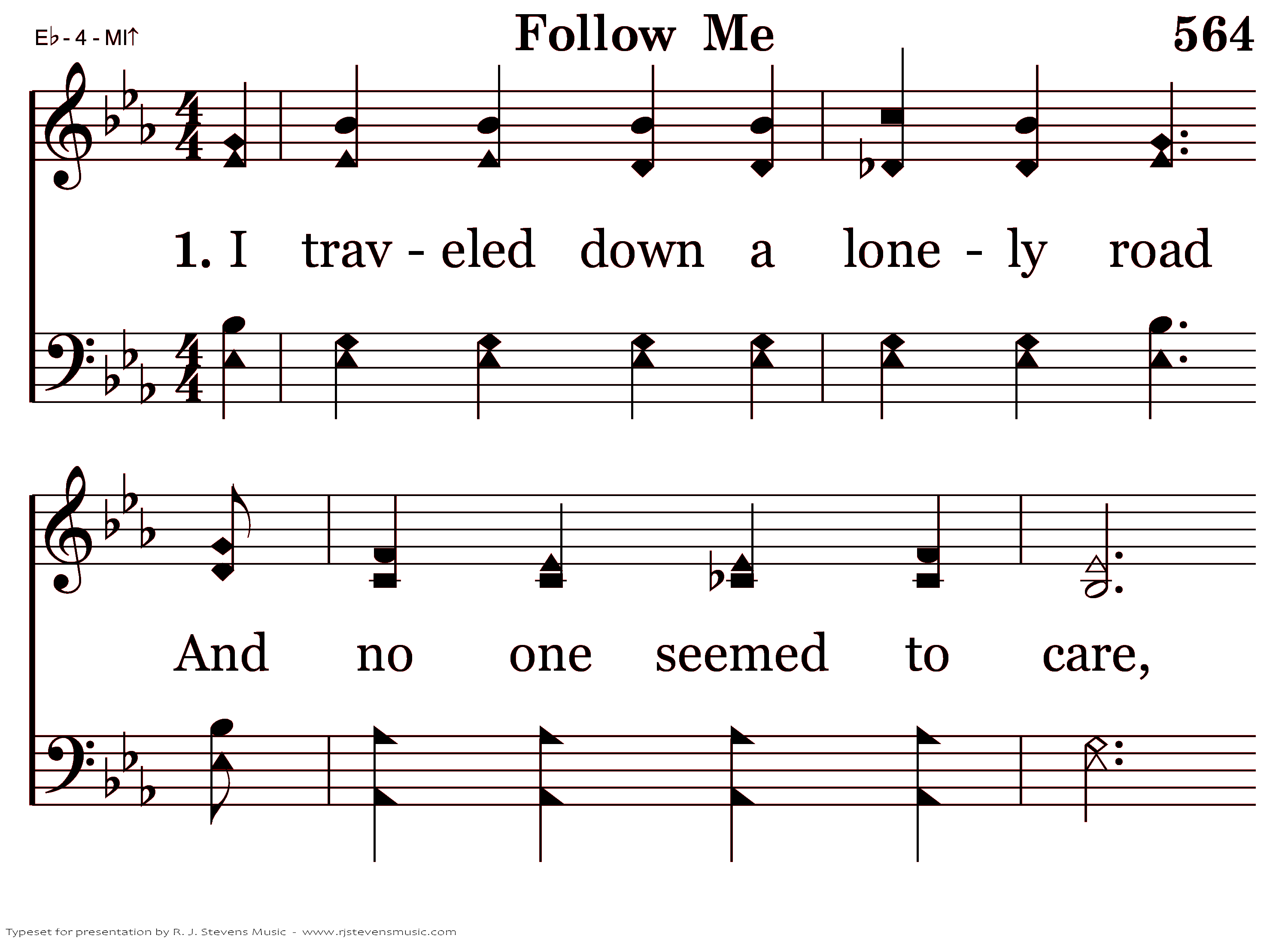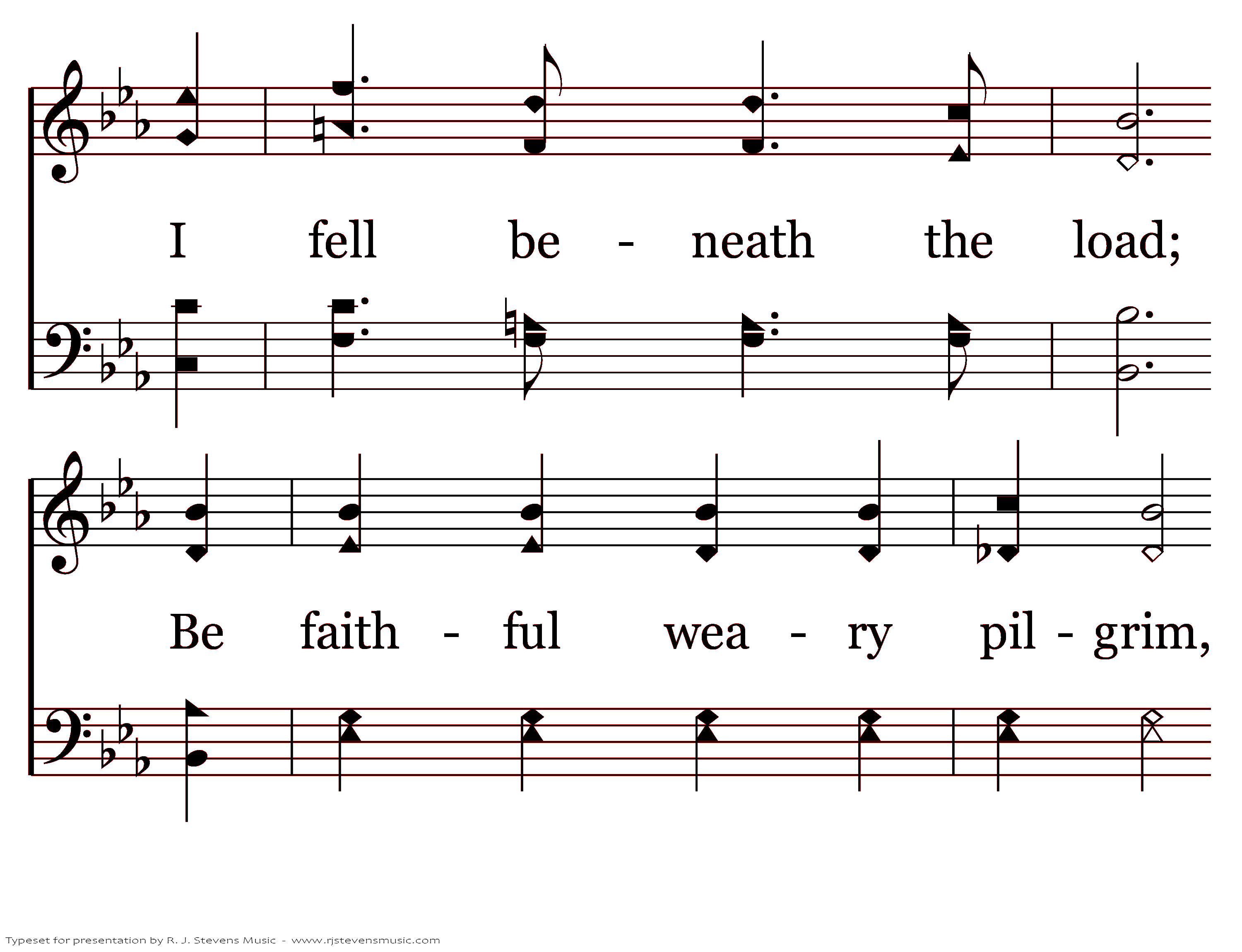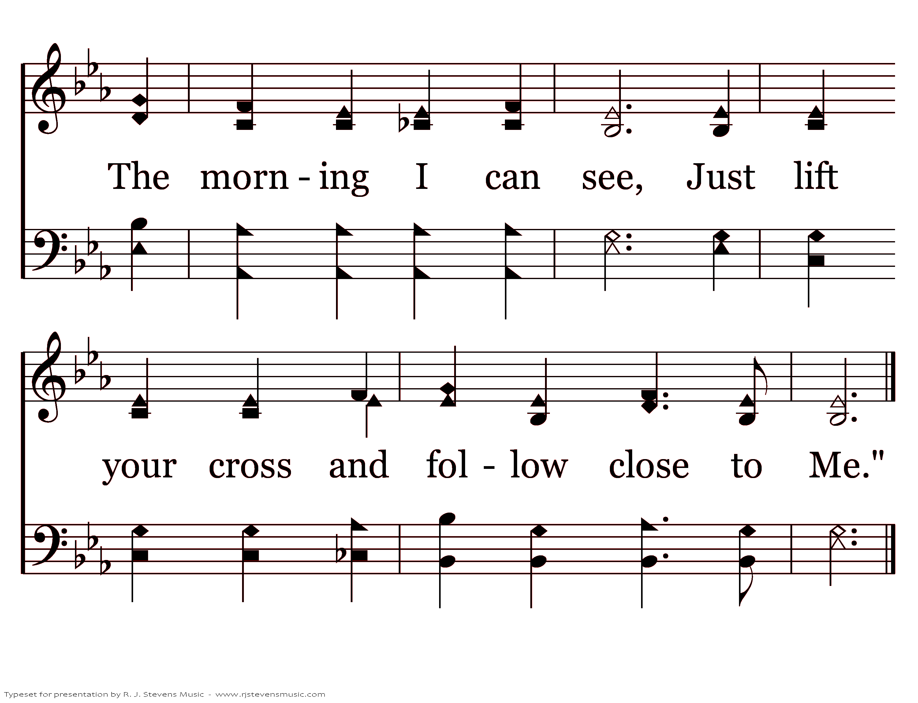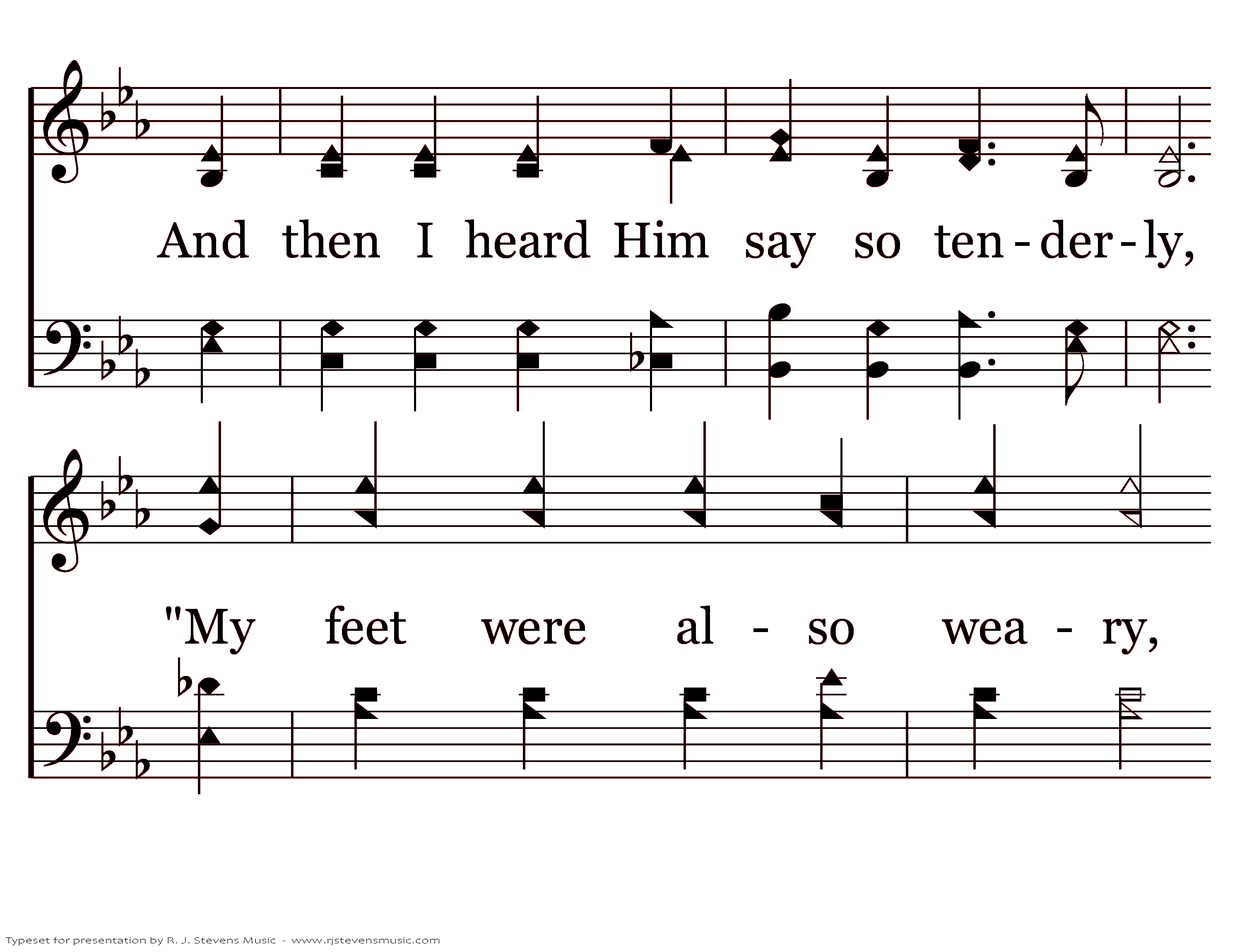 I traveled down a lonely road And no one seemed to care, The burden on my weary back Had bowed me to despair; I oft complained to Jesus How folks were treating me, And then I heard Him say so tenderly: "My feet were also weary, Upon the Calv'ry road; The cross became so heavy I fell beneath the load; Be faithful weary pilgrim, The morning I can see, Just lift your cross and follow close to Me."