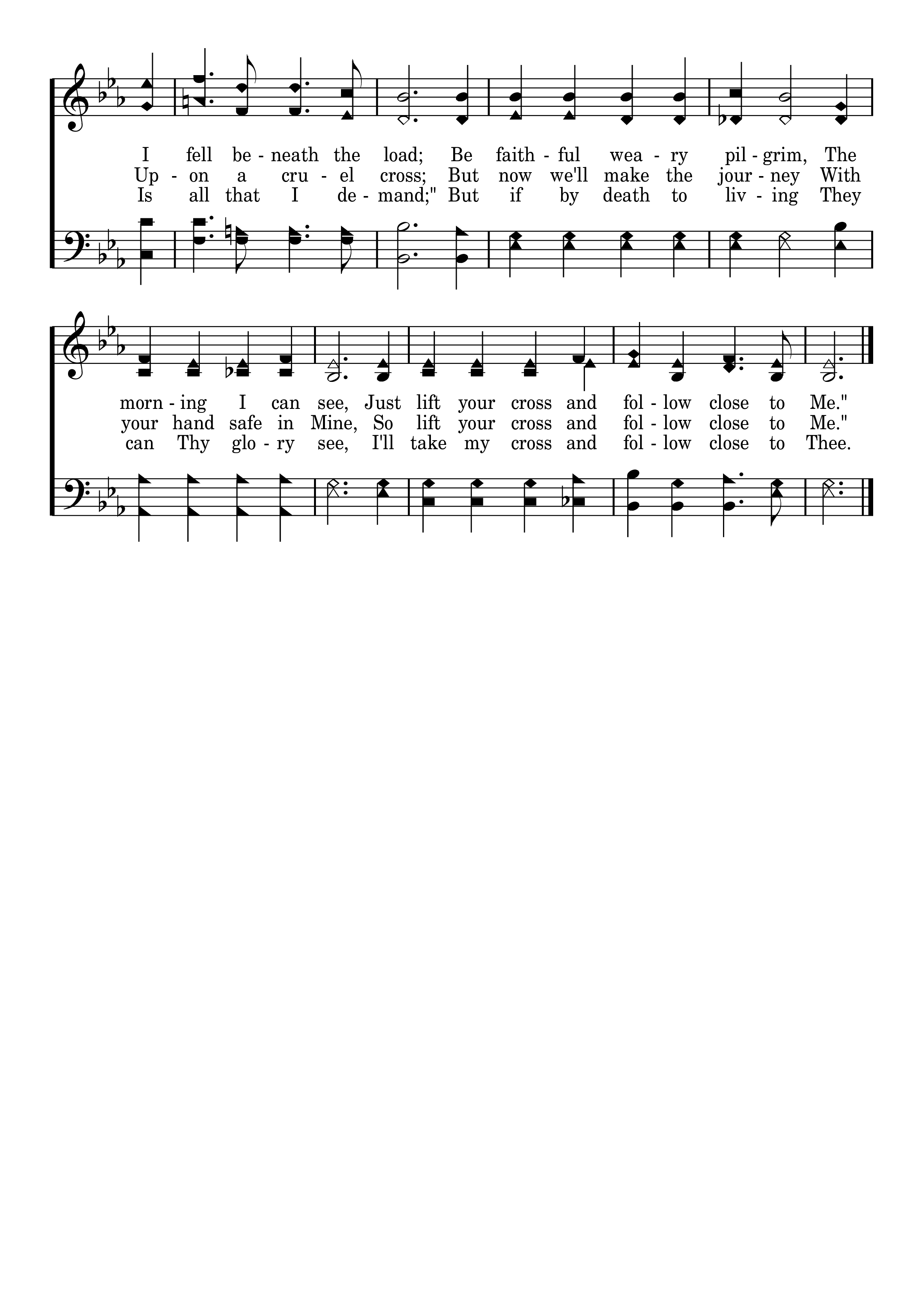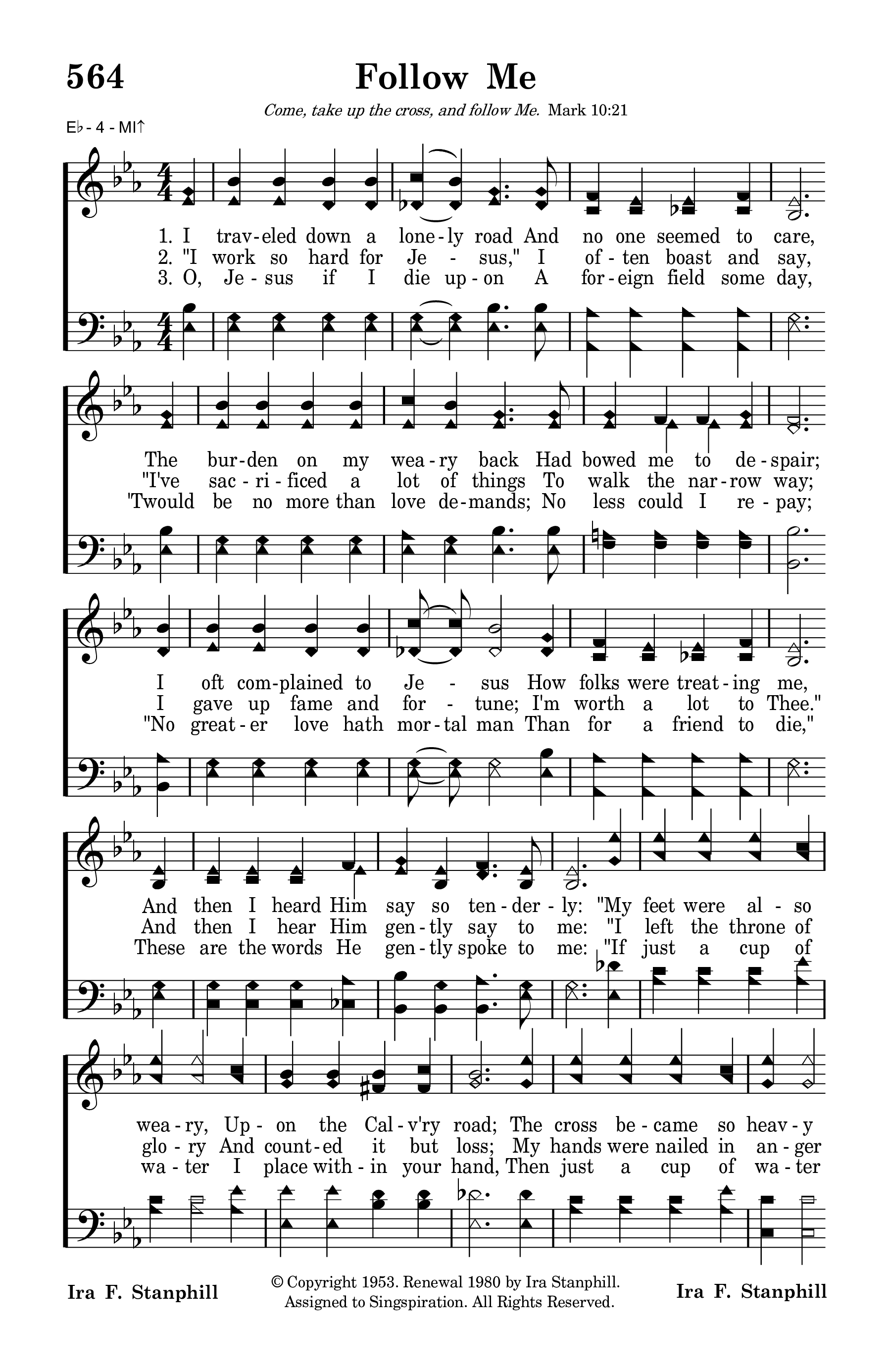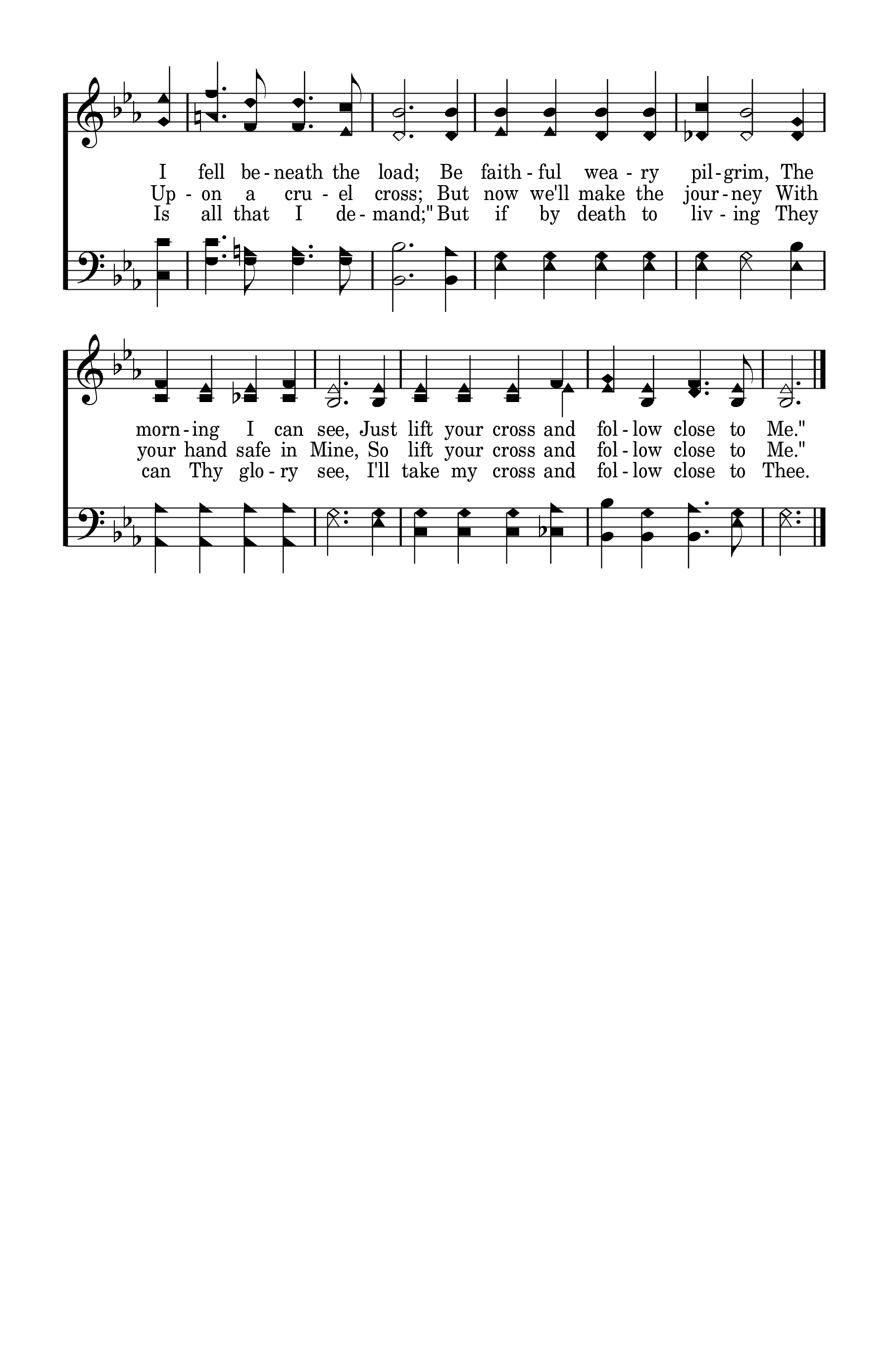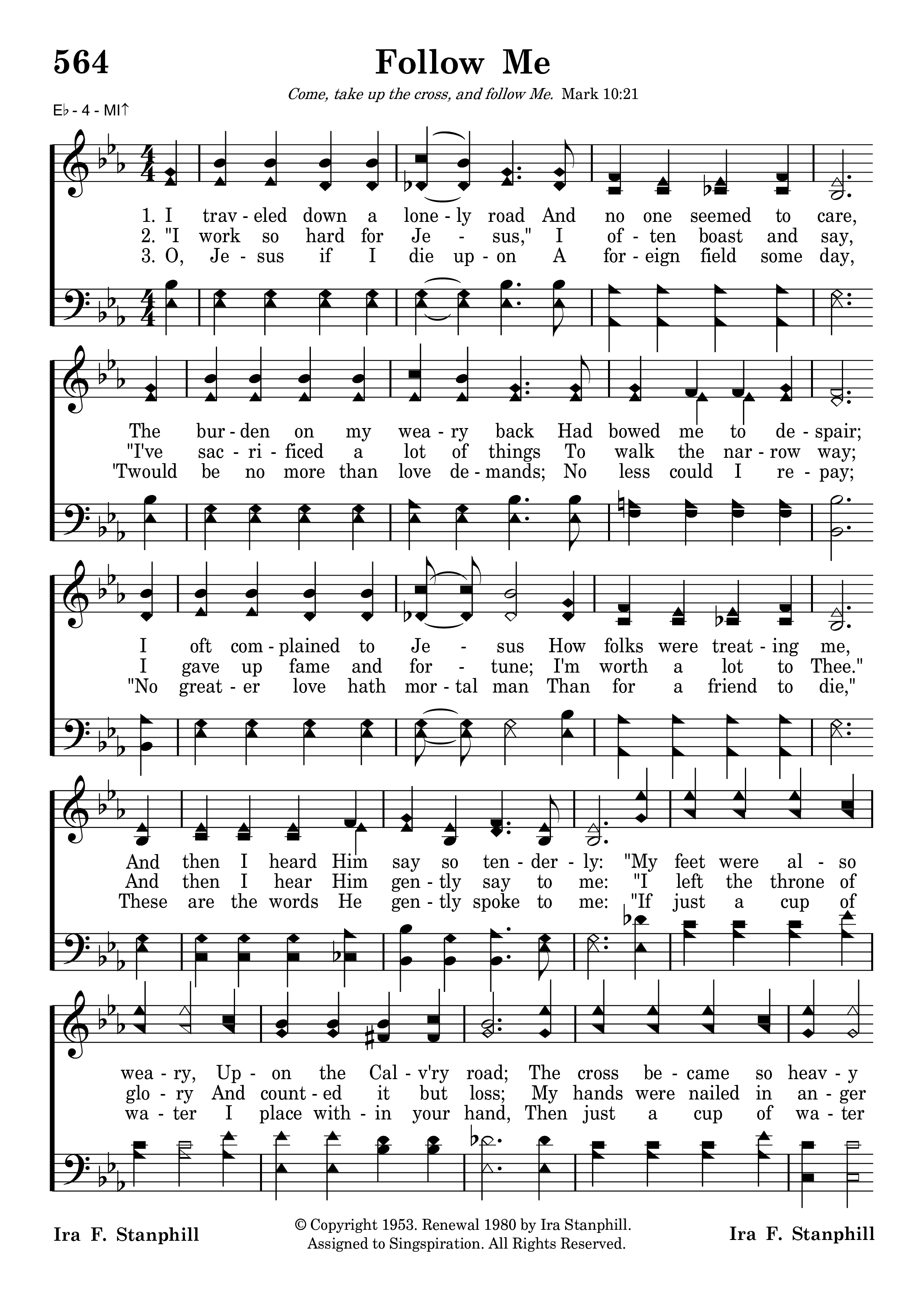 I traveled down a lonely road And no one seemed to care, The burden on my weary back Had bowed me to despair; I oft complained to Jesus How folks were treating me, And then I heard Him say so tenderly: "My feet were also weary, Upon the Calv'ry road; The cross became so heavy I fell beneath the load; Be faithful weary pilgrim, The morning I can see, Just lift your cross and follow close to Me."