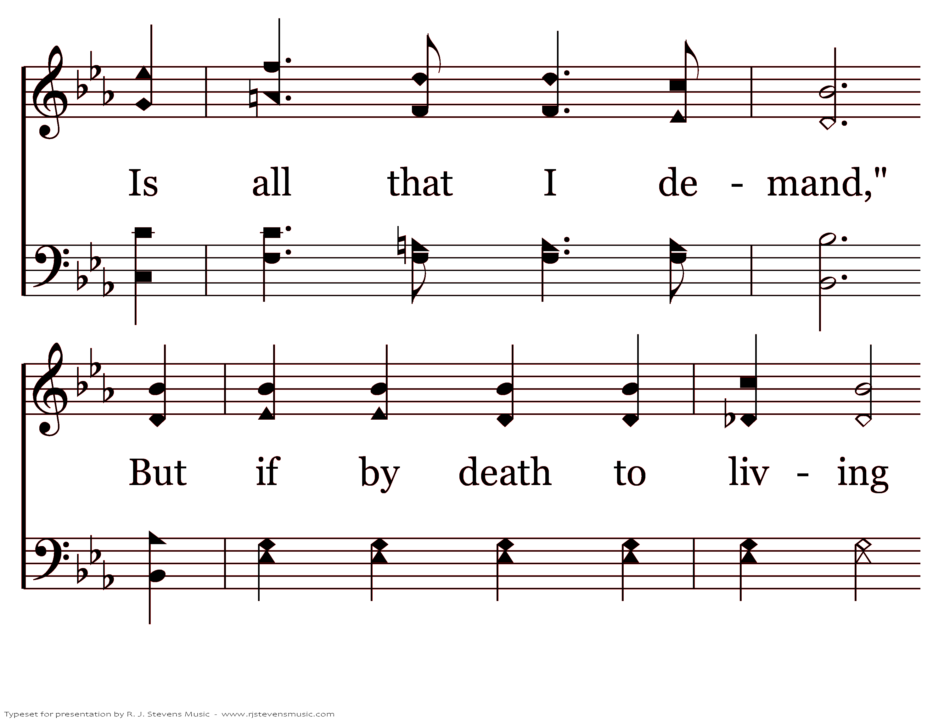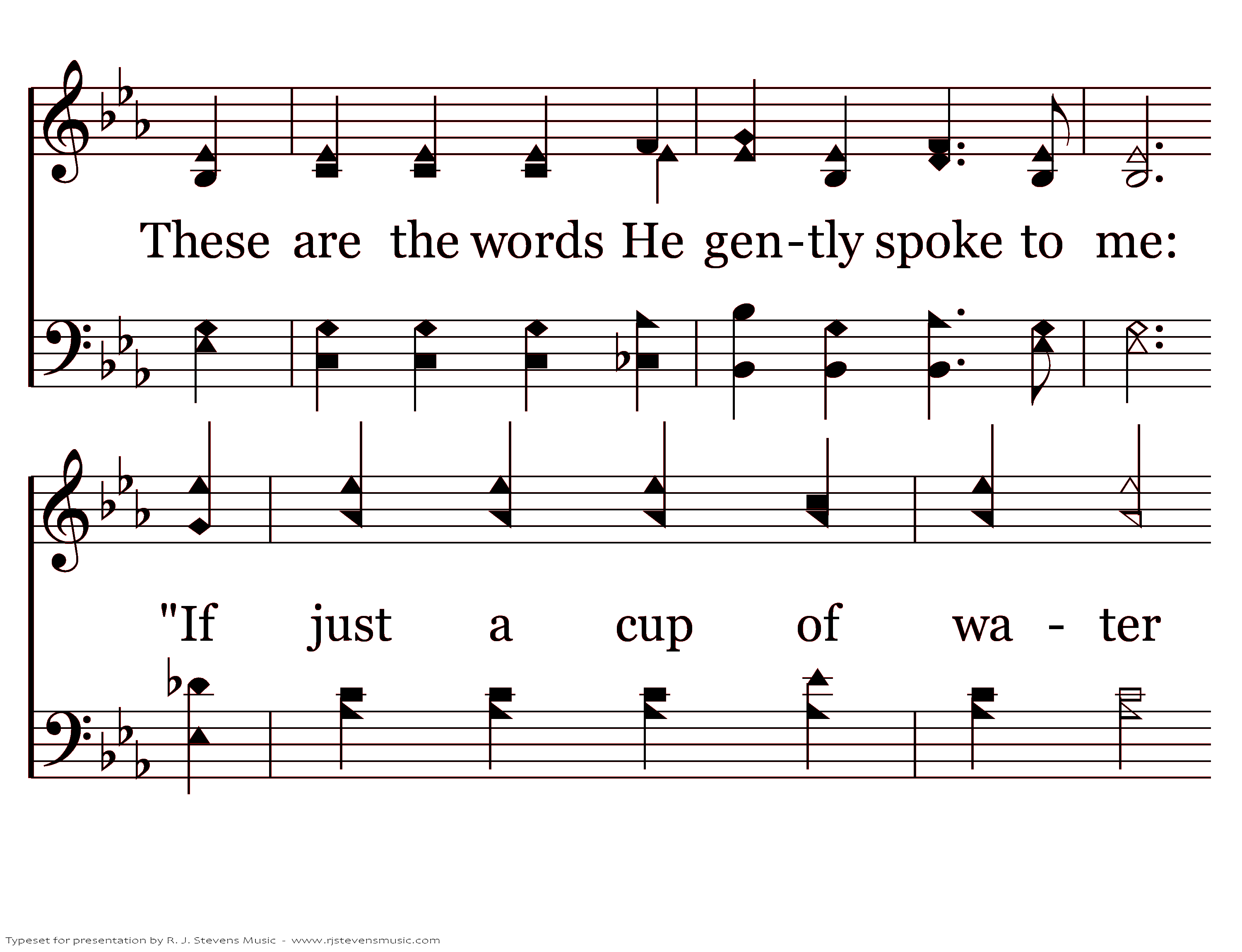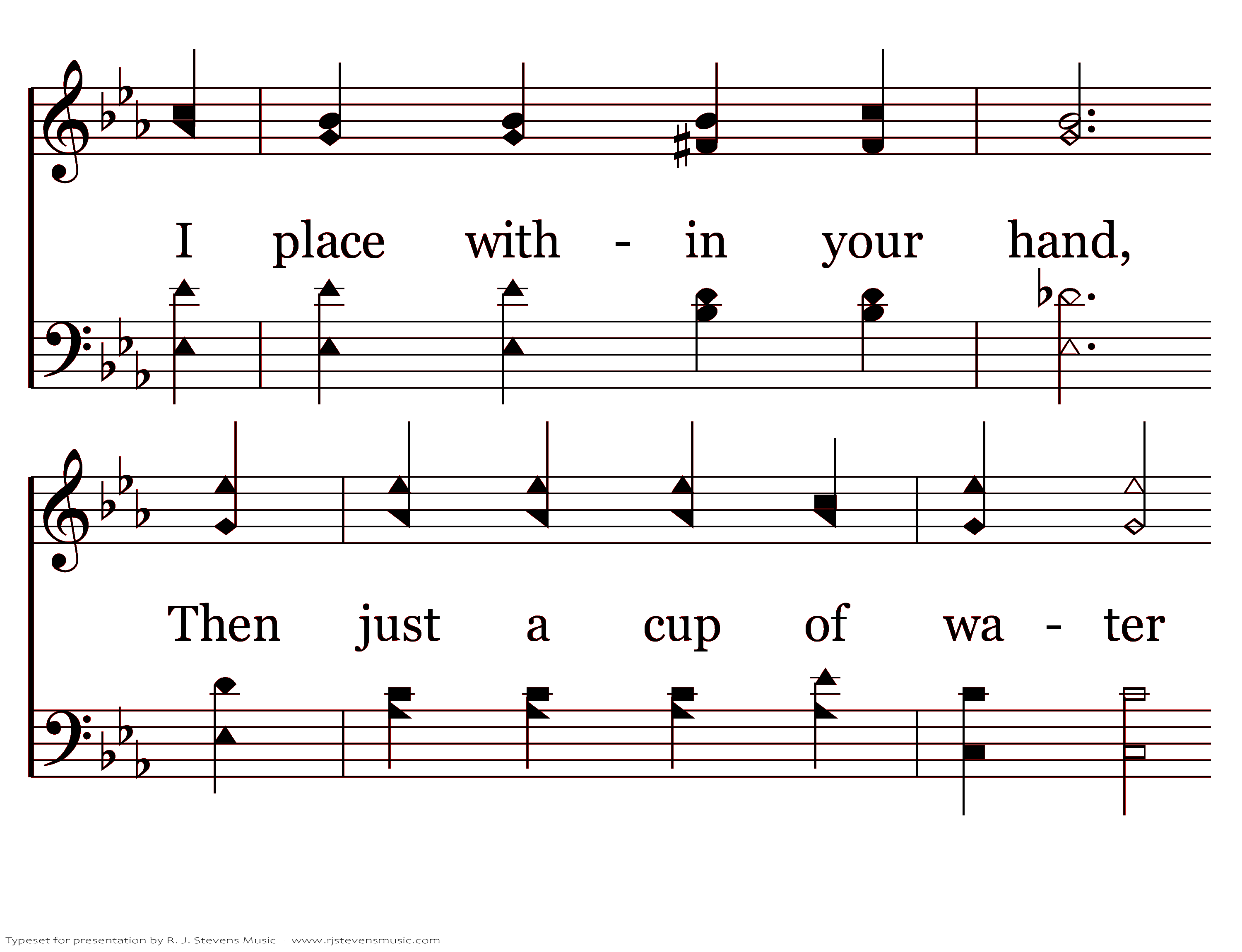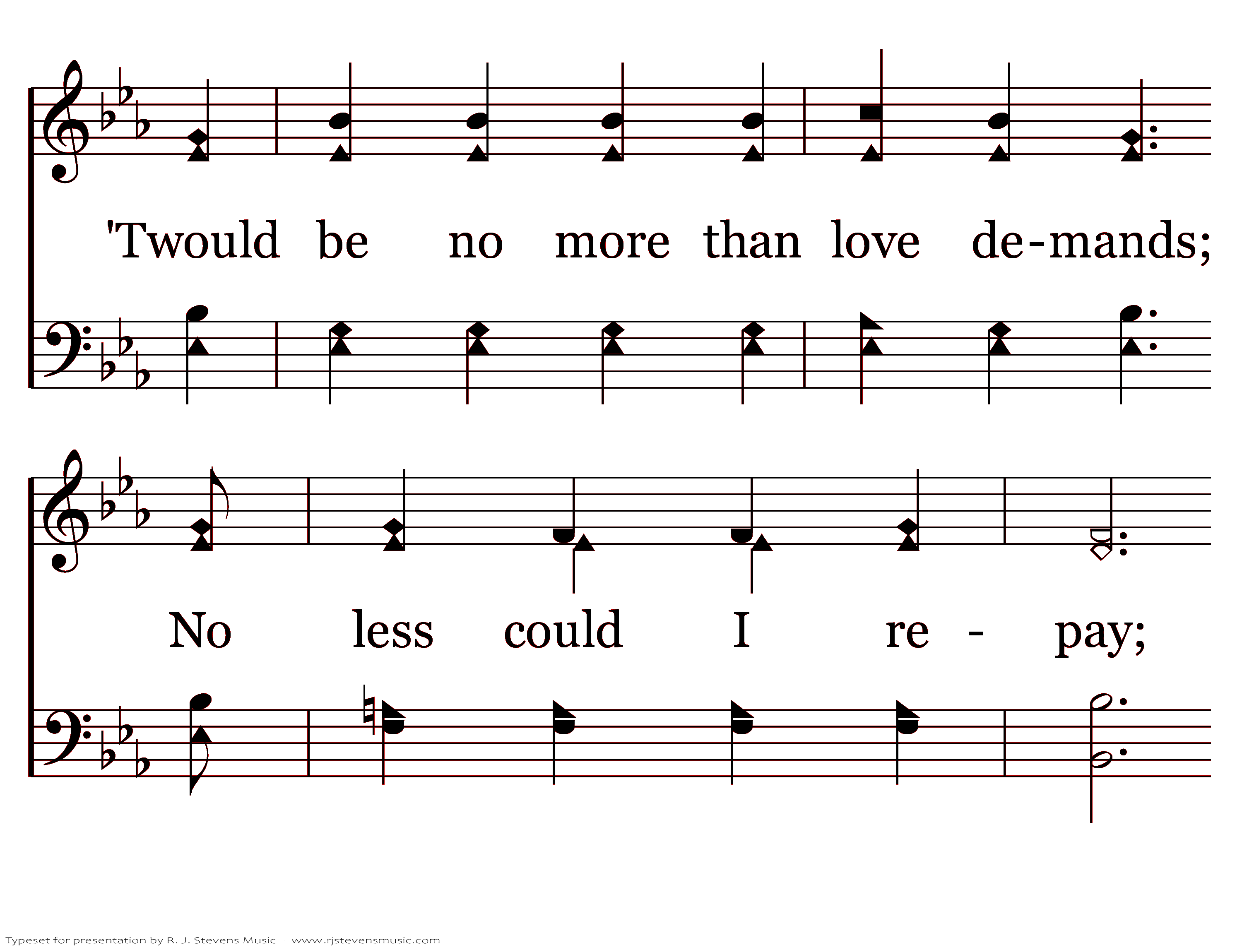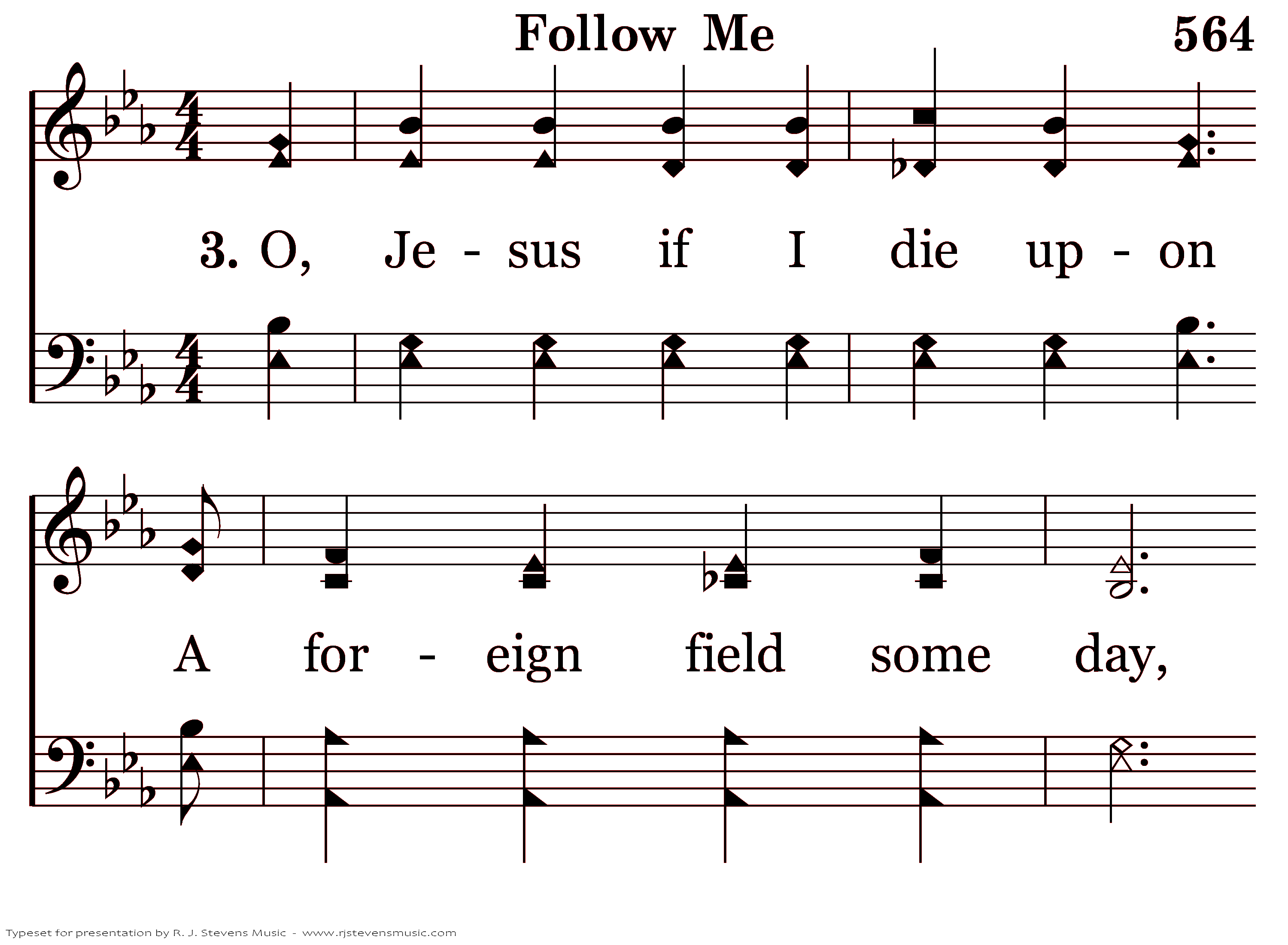 O, Jesus if I die upon A foreign field some day, 'Twould be no more than love demands; No less could I repay; "No greater love hath mortal man Than for a friend to die," These are the words He gently spoke to me: "If just a cup of water I place within your hand, Then just a cup of water Is all that I demand;" But if by death to living They can Thy glory see, I'll take my cross and follow close to Thee.