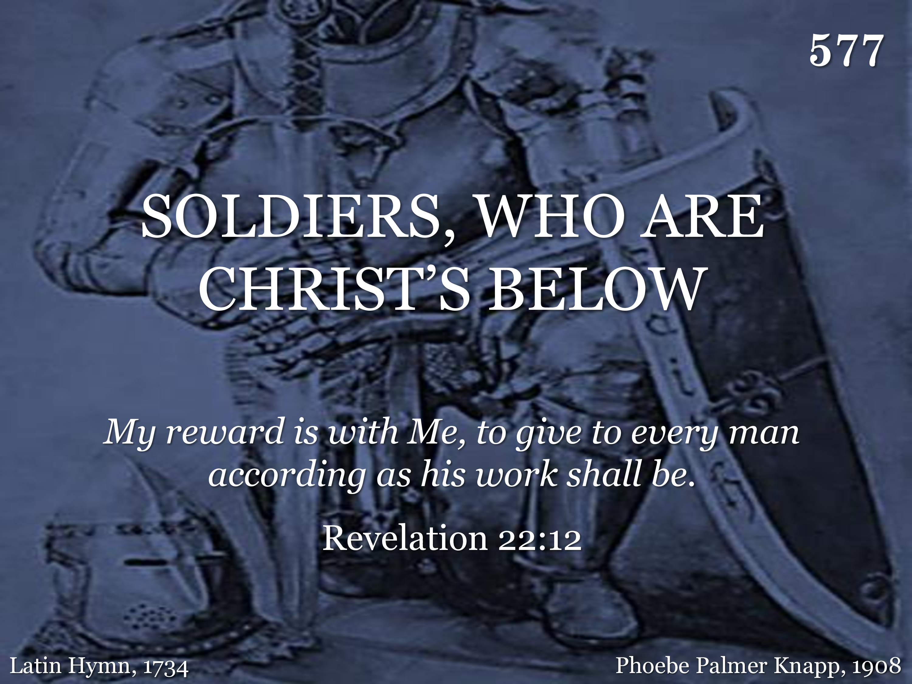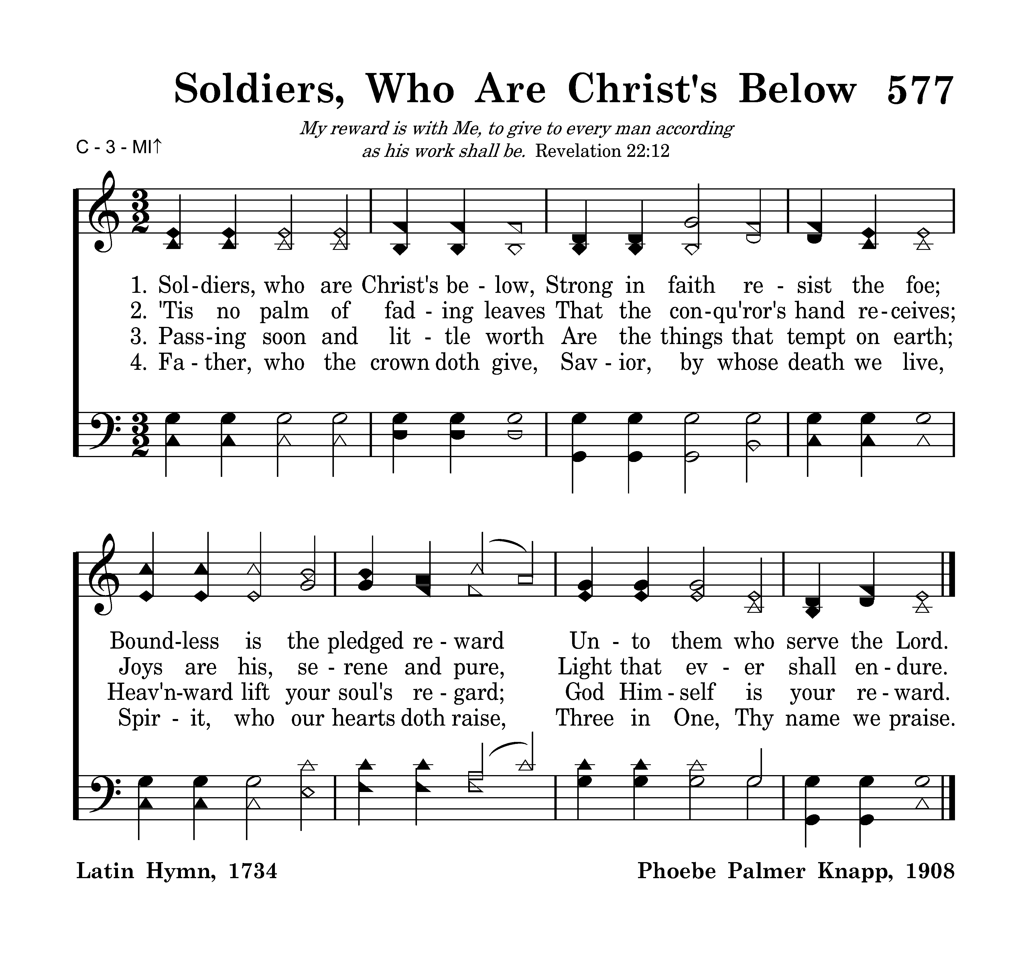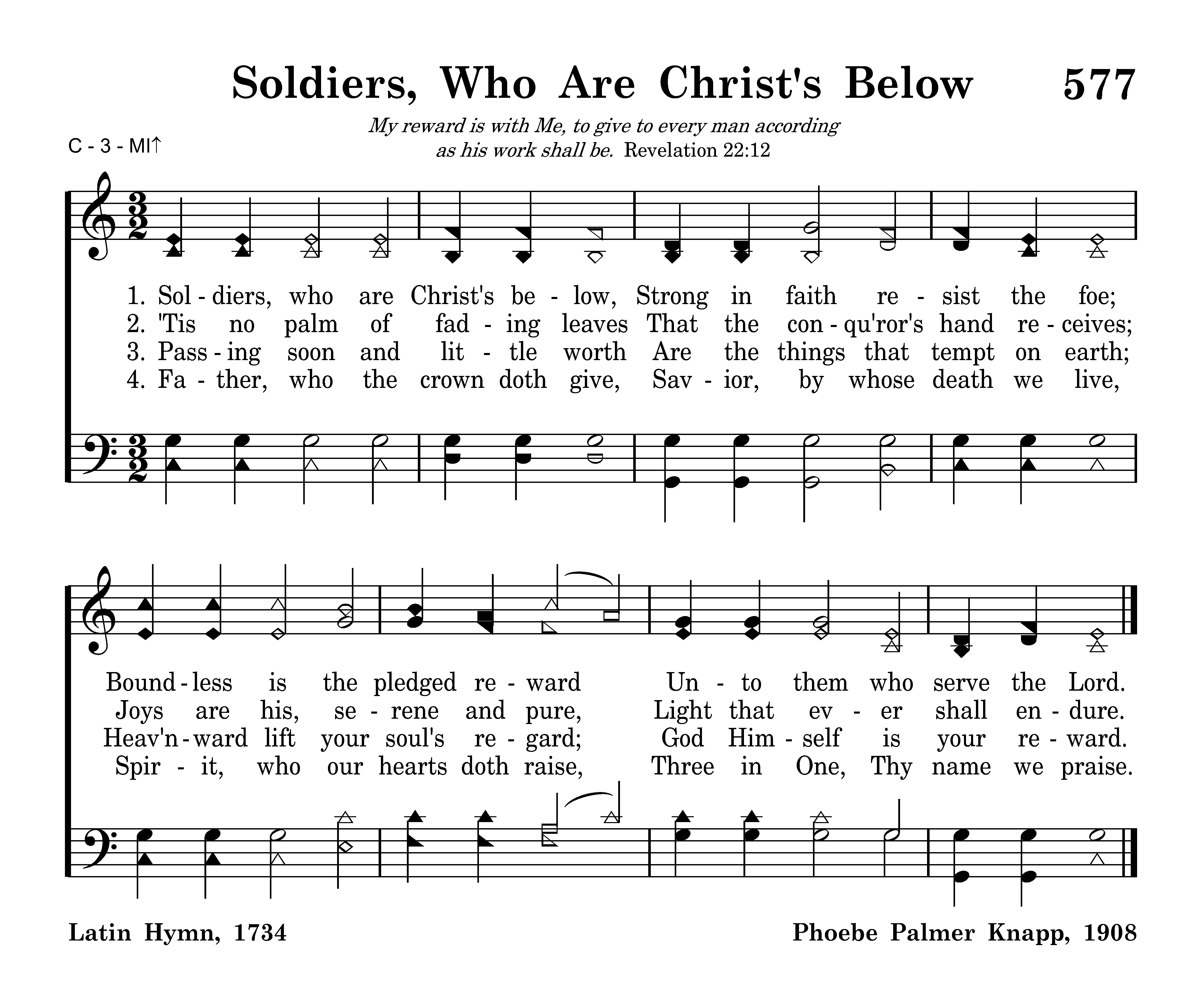 Soldiers, who are Christ's below, Strong in faith resist the foe; Boundless is the pledged reward Unto them who serve the Lord.