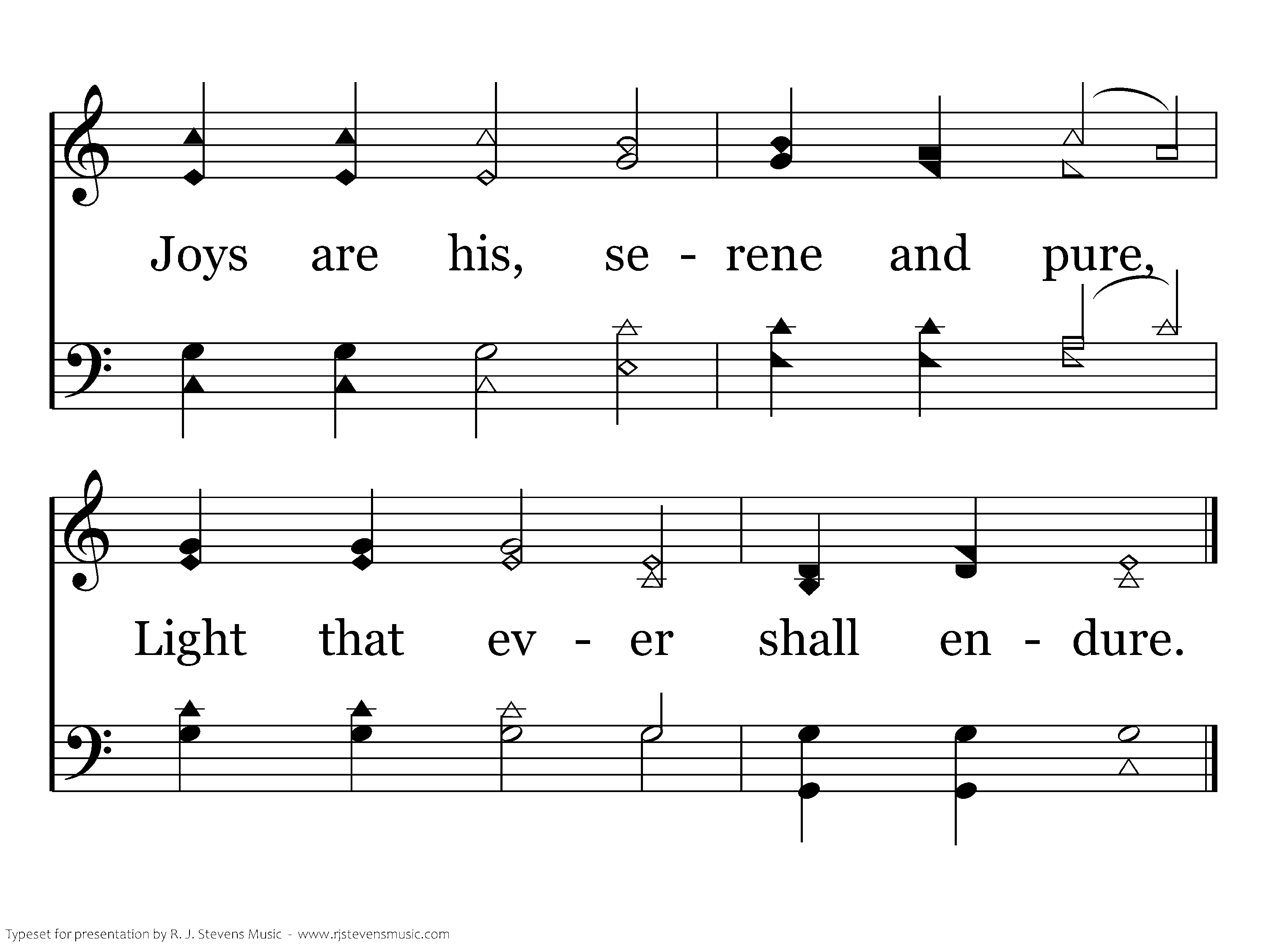 'Tis no palm of fading leaves That the conqu'ror's hand receives; Joys are his, serene and pure, Light that ever shall endure.