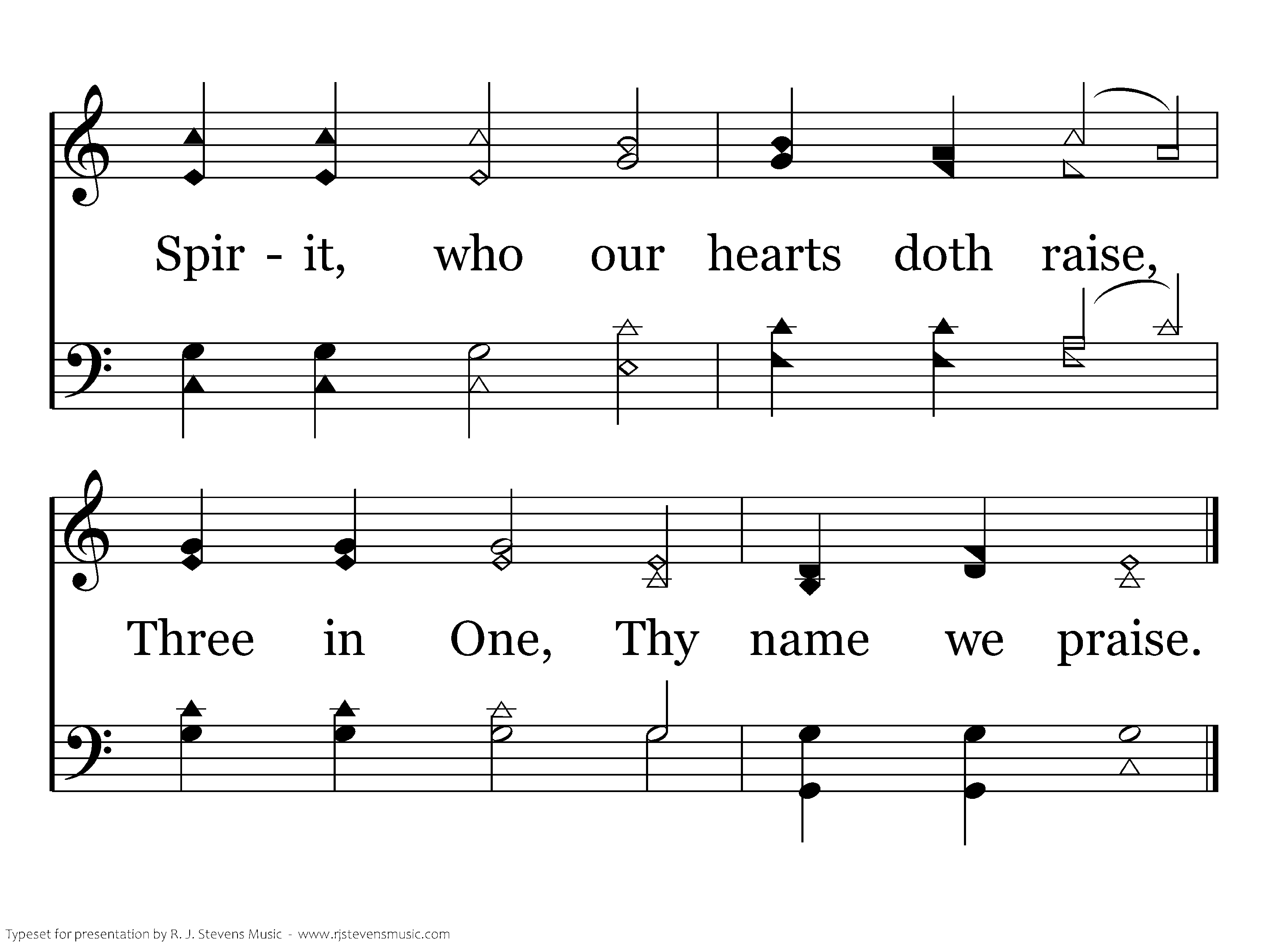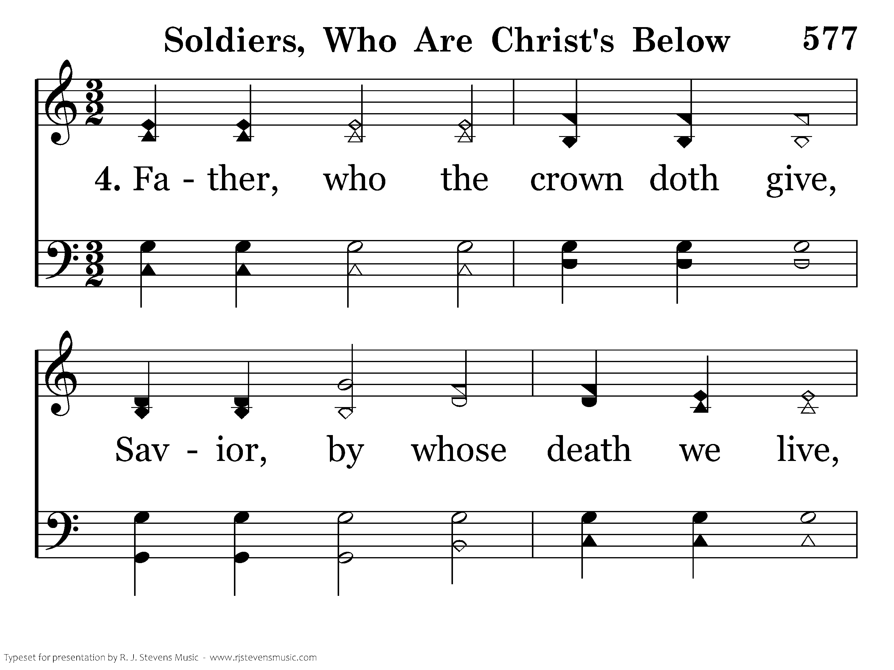 Father, who the crown doth give, Savior, by whose death we live, Spirit, who our hearts doth raise, Three in One, Thy name we praise.