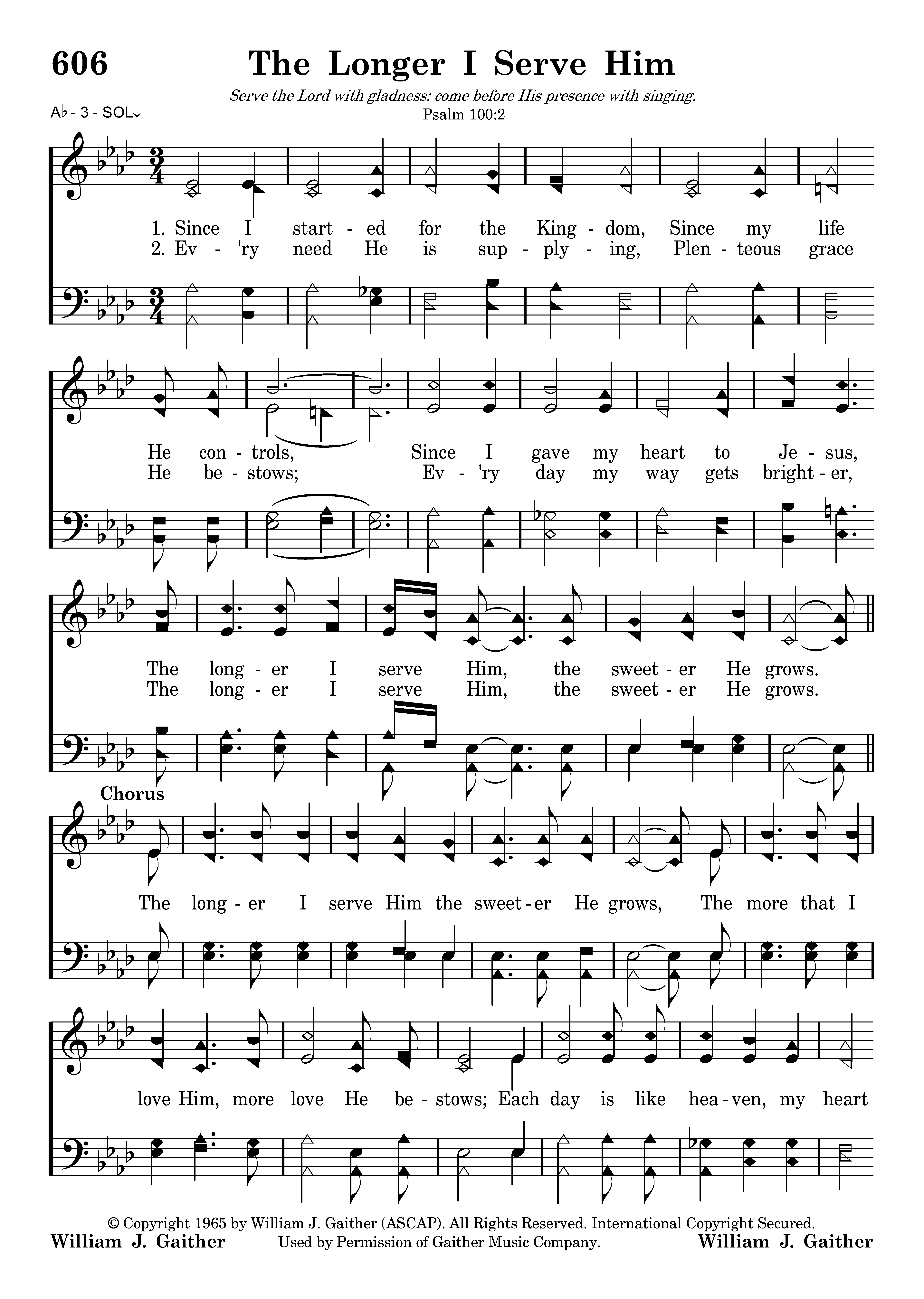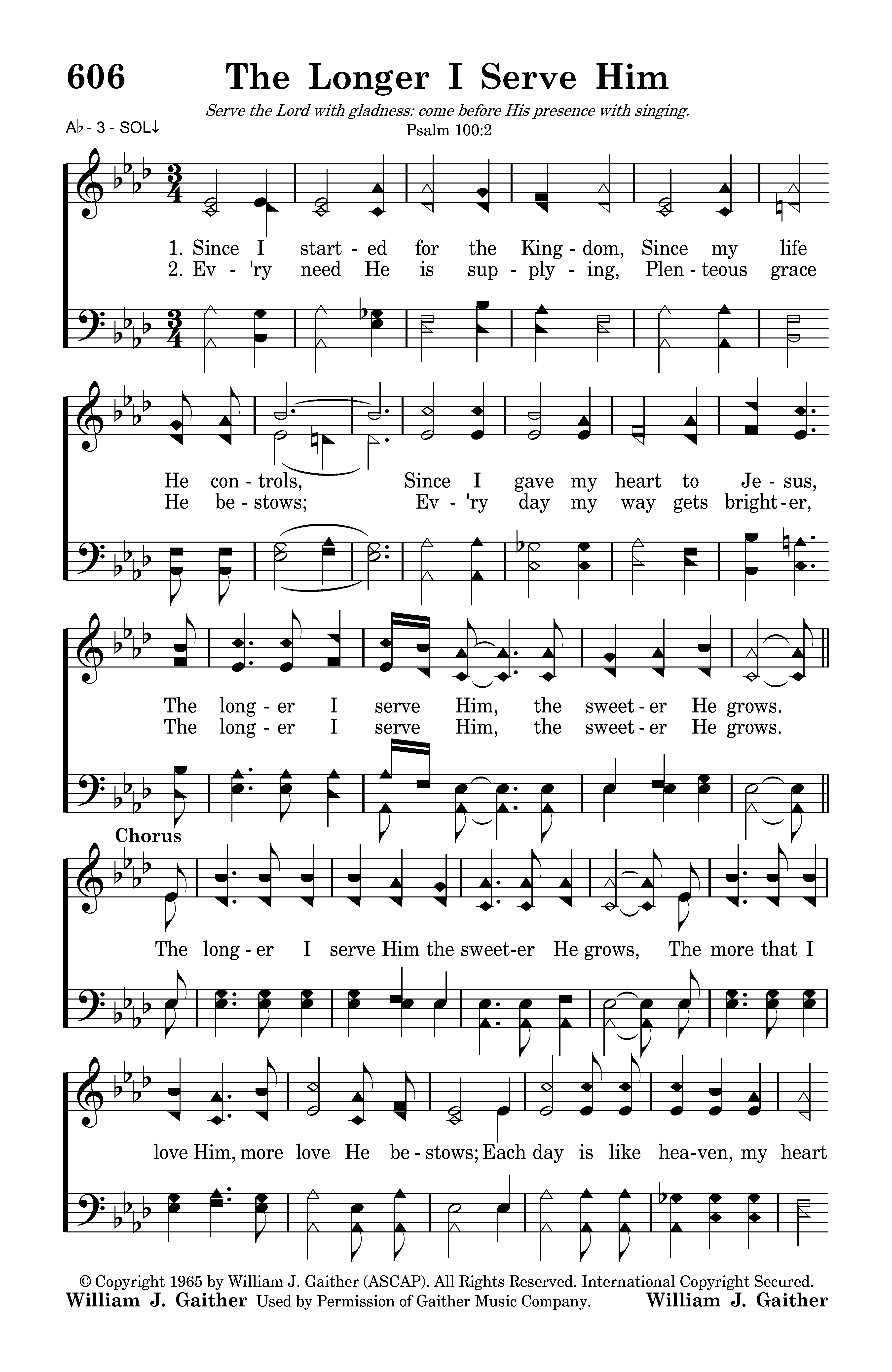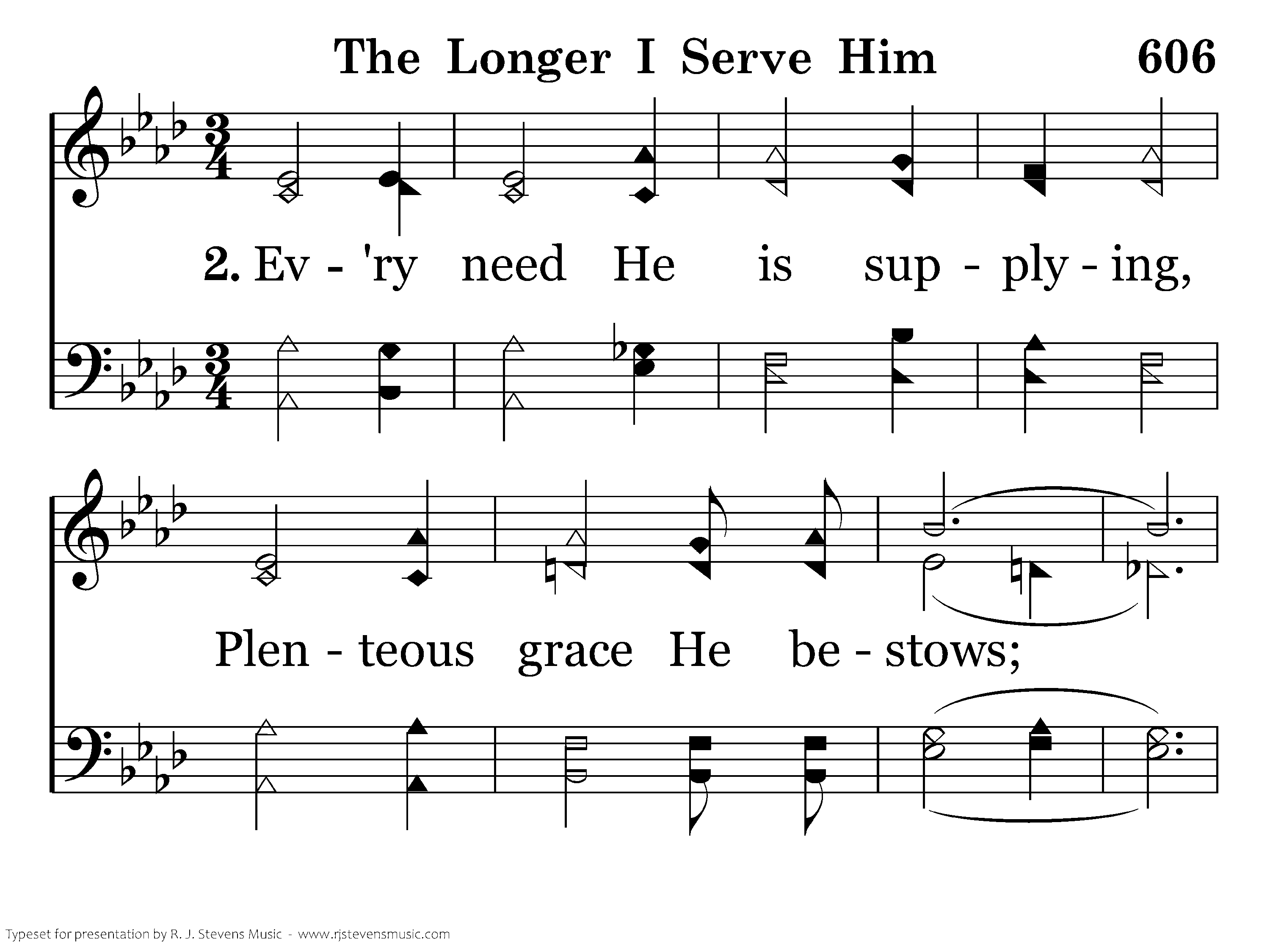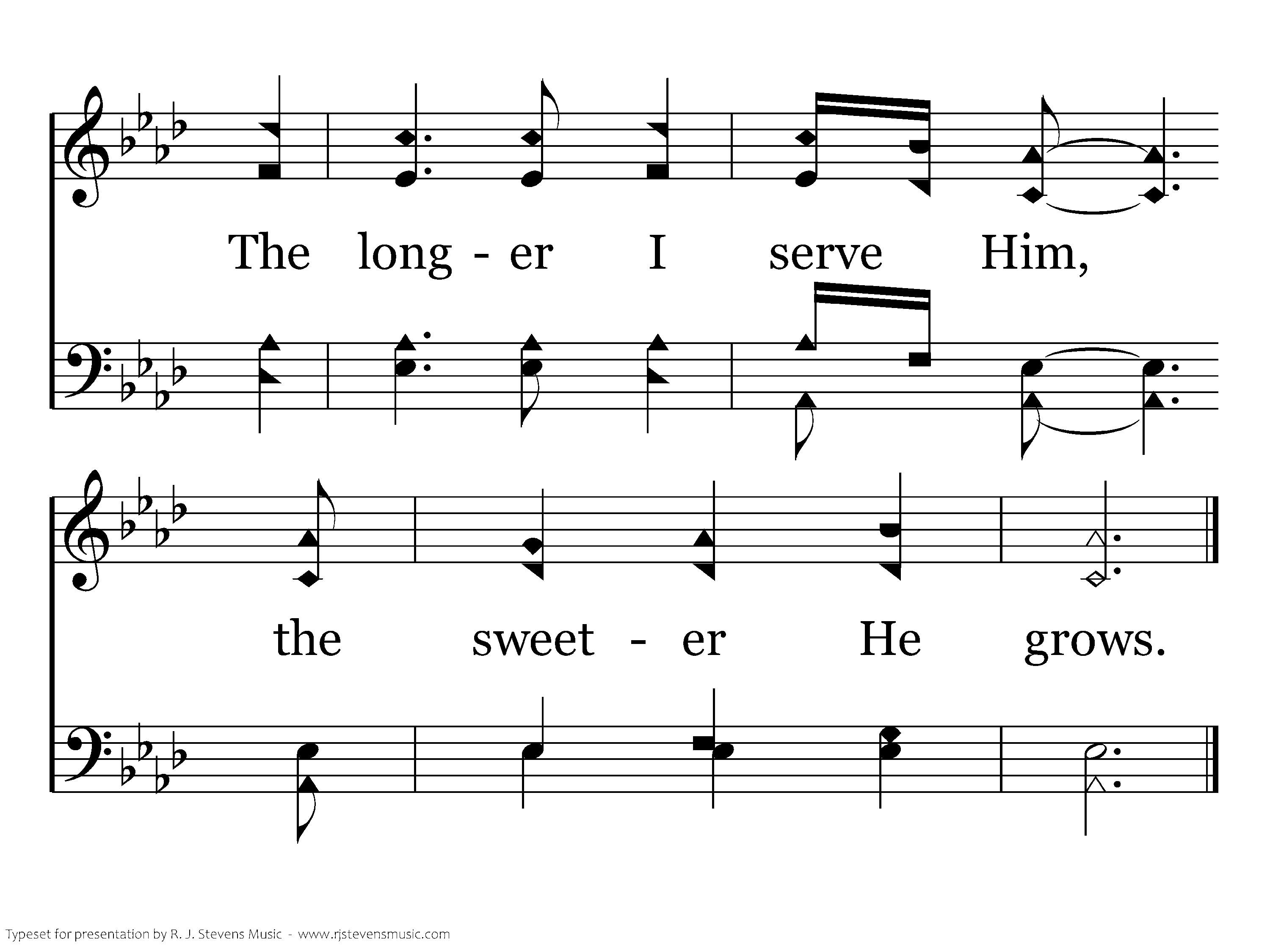 The longer I serve Him the sweeter He grows, The more that I love Him, more love He bestows; Each day is like heaven, my heart overflows, The longer I serve Him, the sweeter He grows.