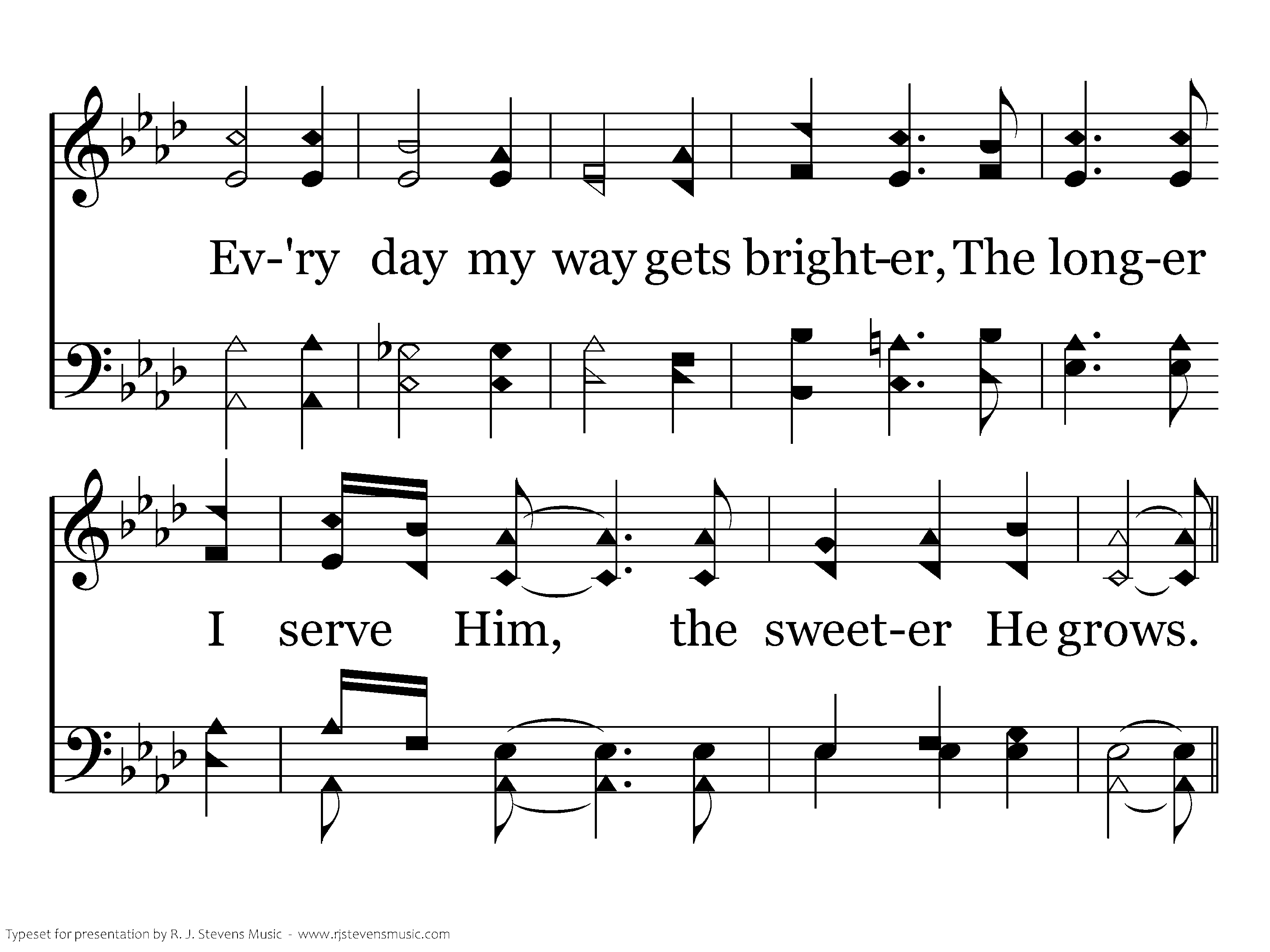 Ev'ry need He is supplying, Plenteous grace He bestows; Ev'ry day my way gets brighter, The longer I serve Him, the sweeter He grows.