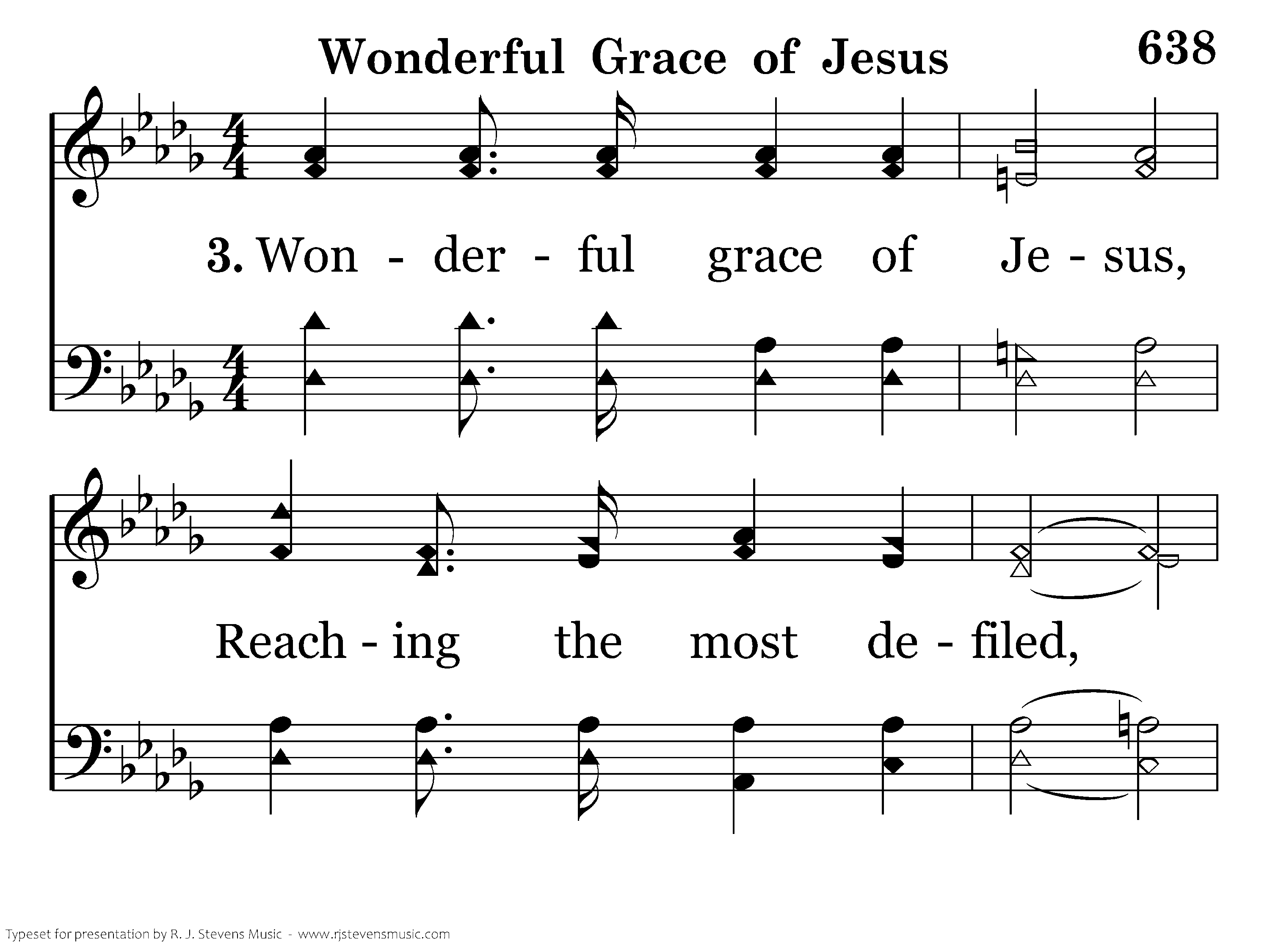 Wonderful grace of Jesus, Reaching the most defiled, By its transforming power, Making him God's dear child, Purchasing peace and heaven, For all eternity; And the wonderful grace of Jesus reaches me.
