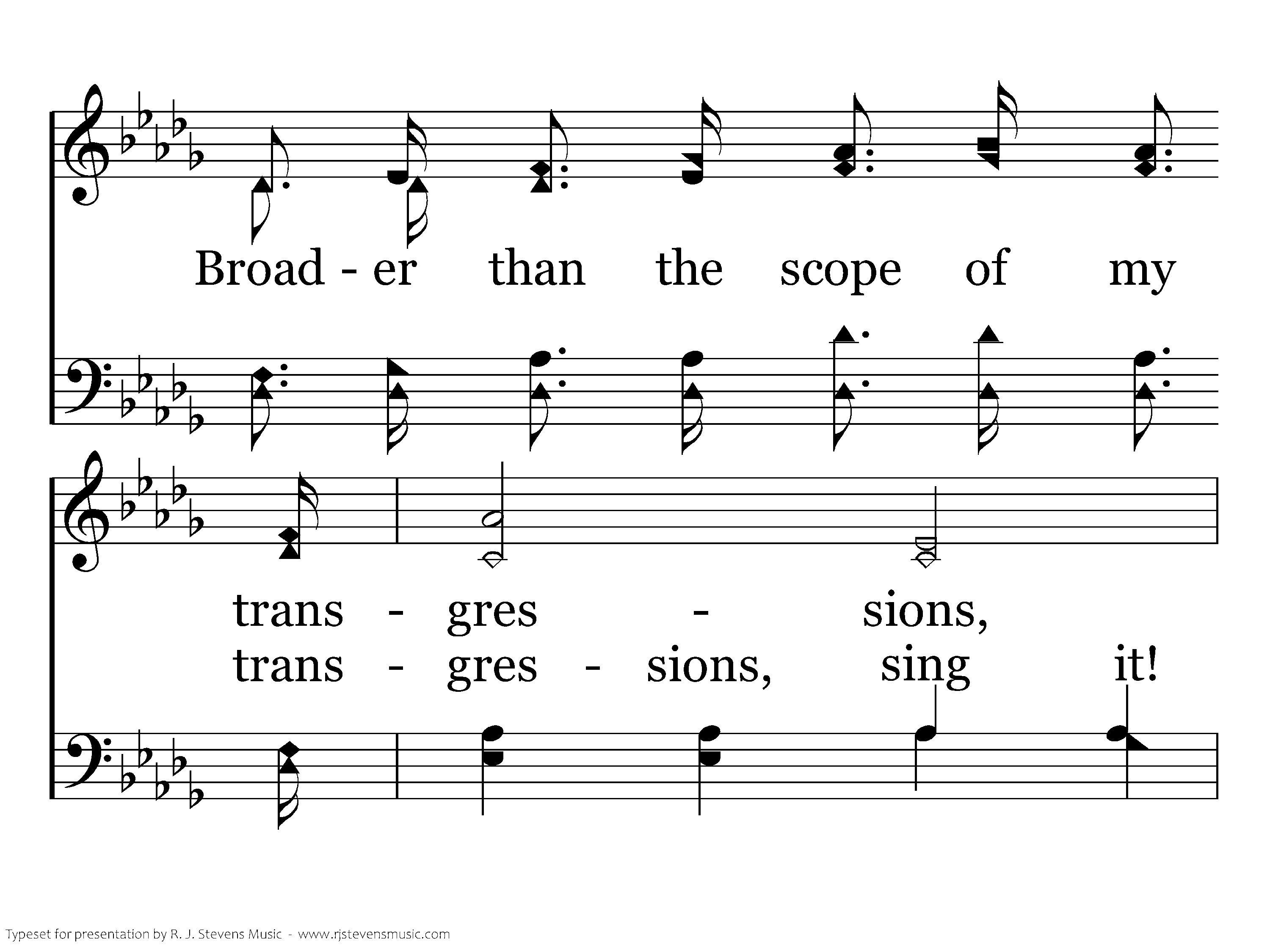 Wonderful the matchless grace of Jesus, Deeper than the mighy rolling sea; Wonderful grace all sufficient grace for even me, Broader than the scope of my transgressions, Greater far than all my sin and shame, O magnify the precious name of Jesus, Praise His name!