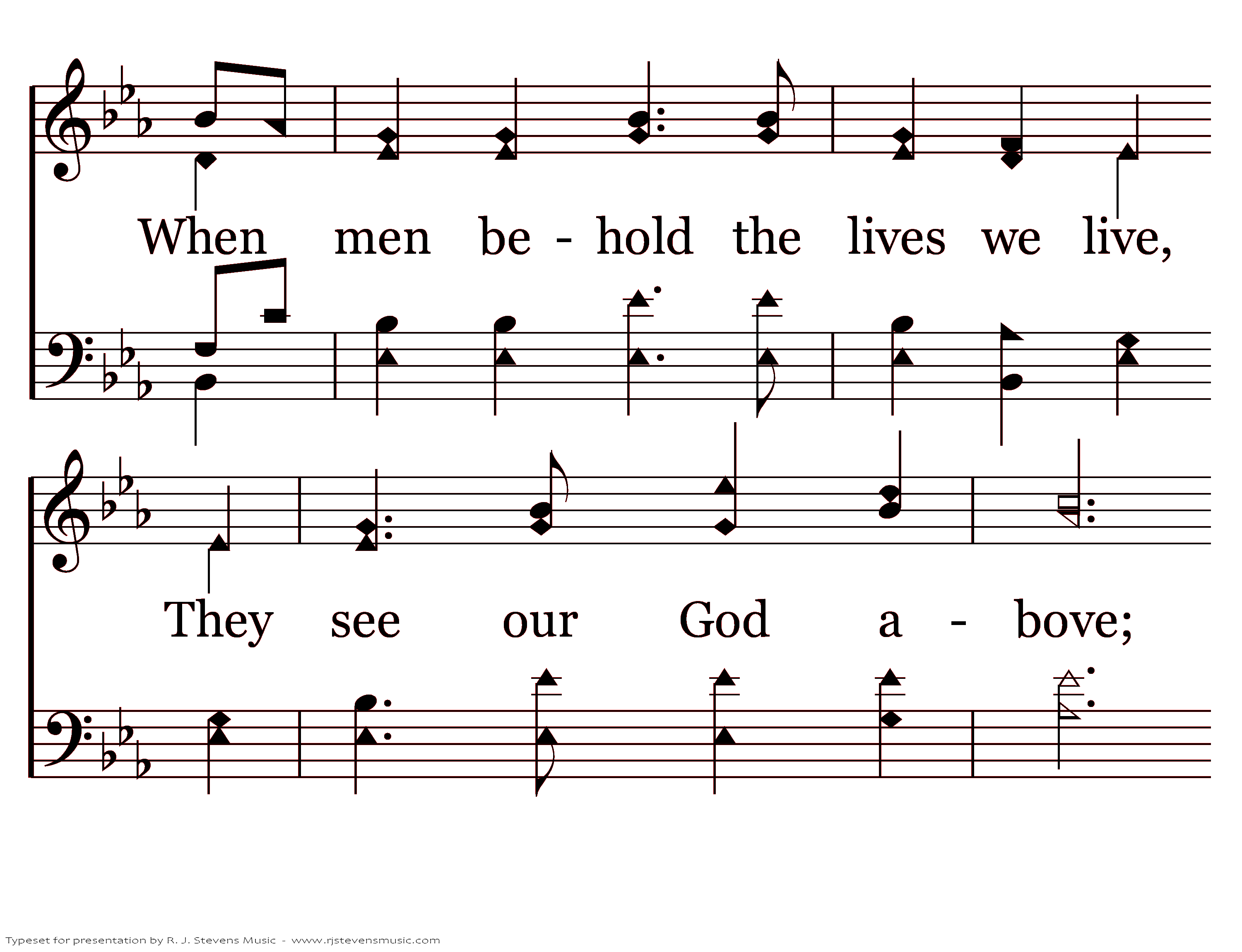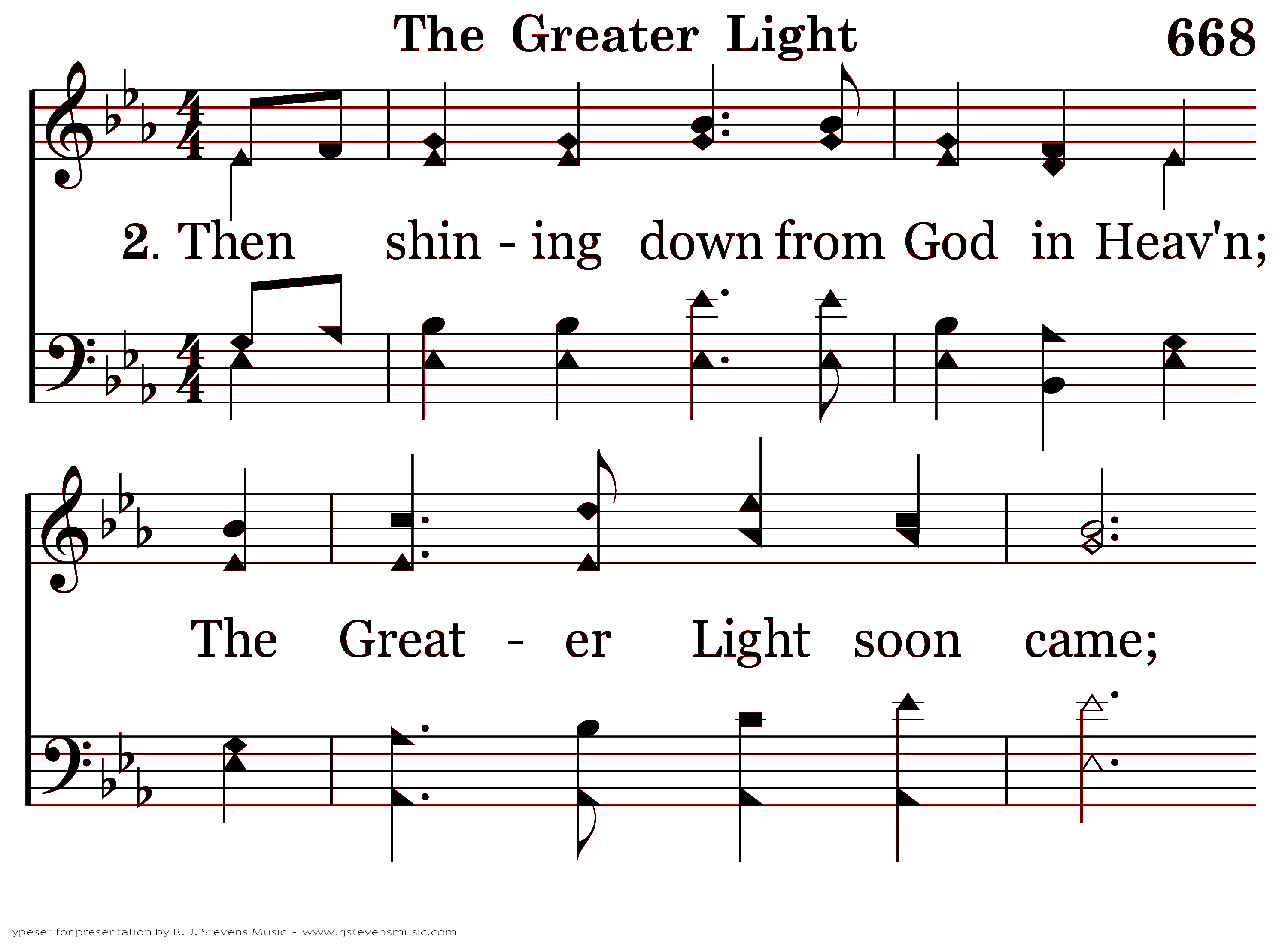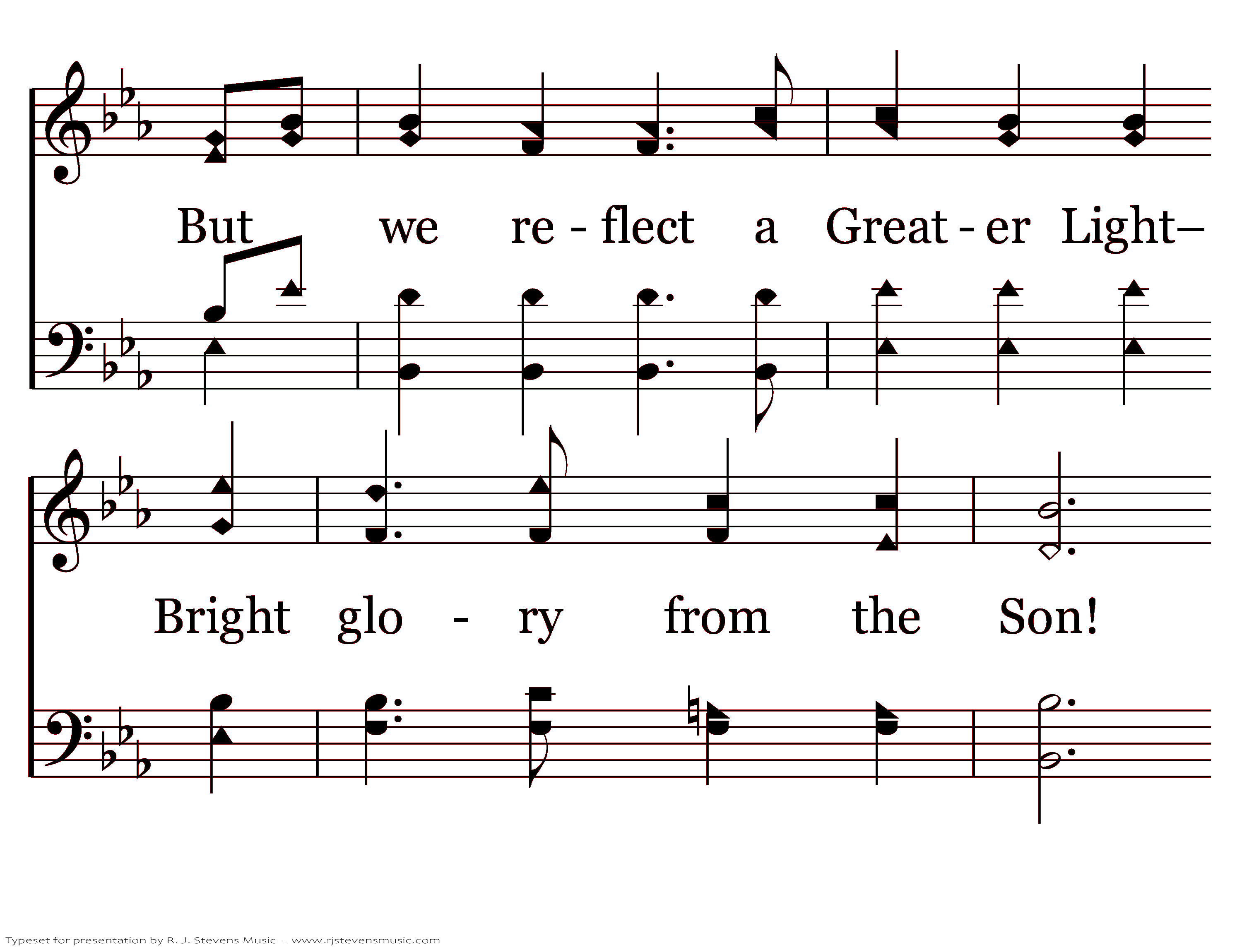 O lesser lights, we shine not bright With glory of our own, But we reflect a greater Light: Bright glory from the Son! When men behold the lives we live, They see the Light above; And when they feel the warmth we give, They touch His greater love.