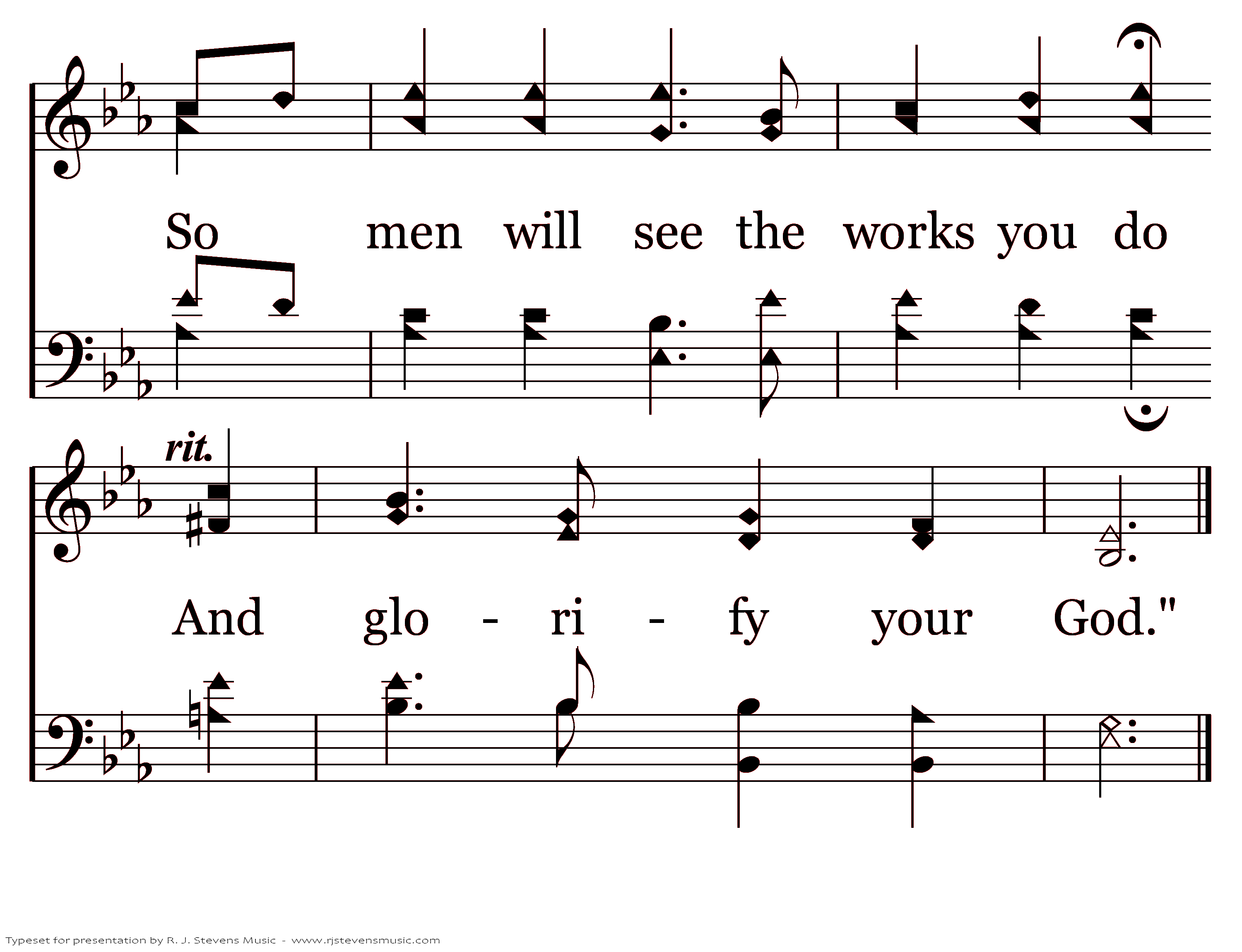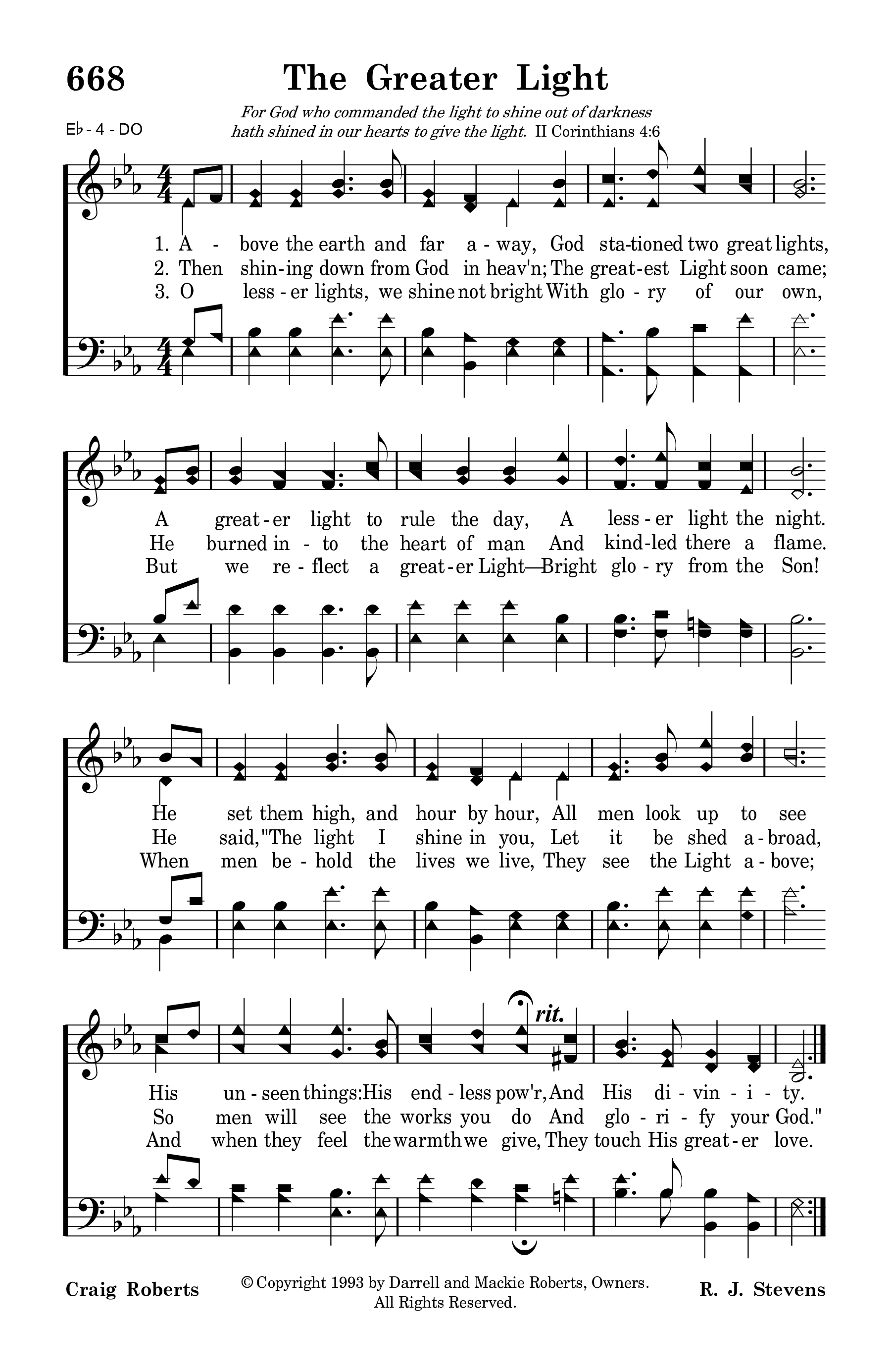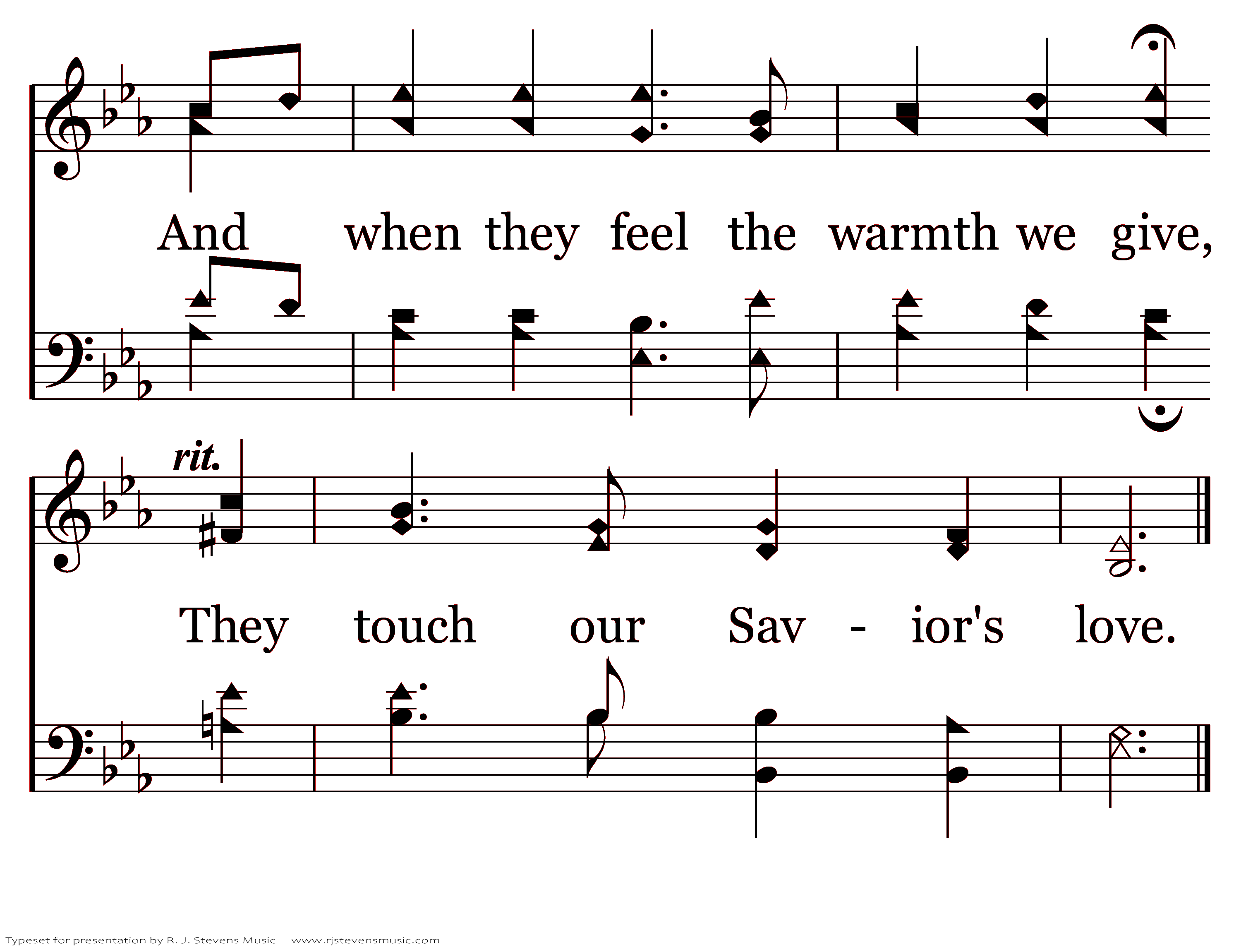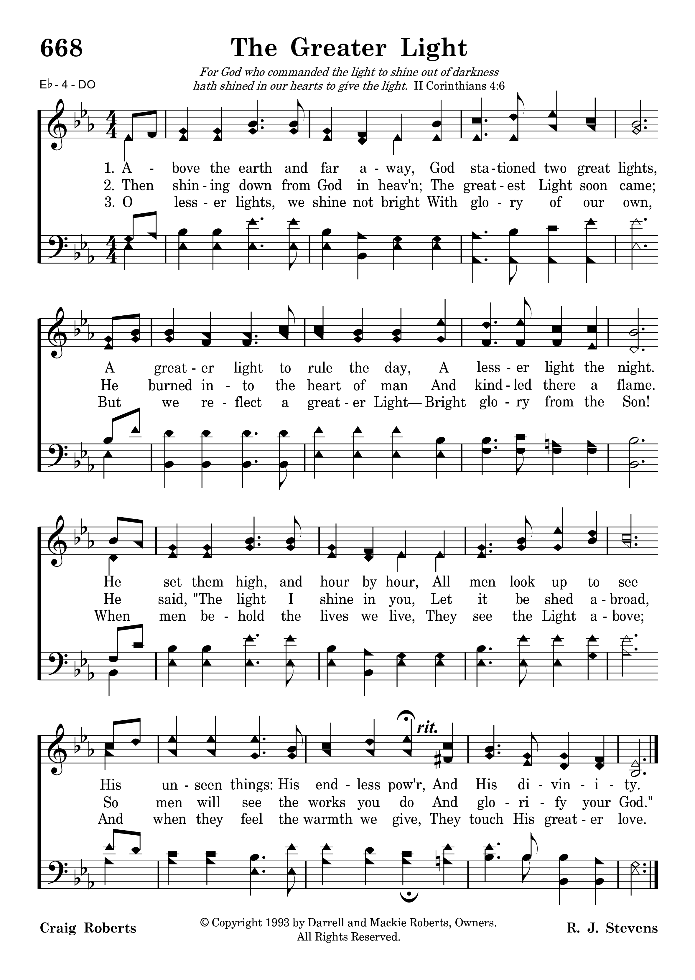 O lesser lights, we shine not bright With glory of our own, But we reflect a greater Light: Bright glory from the Son! When men behold the lives we live, They see the Light above; And when they feel the warmth we give, They touch His greater love.