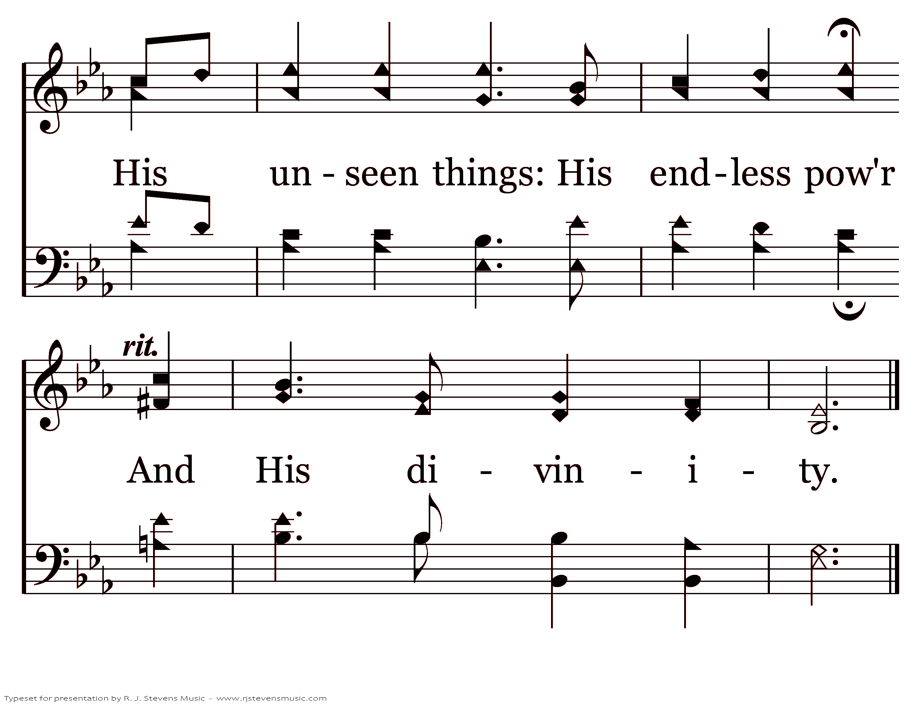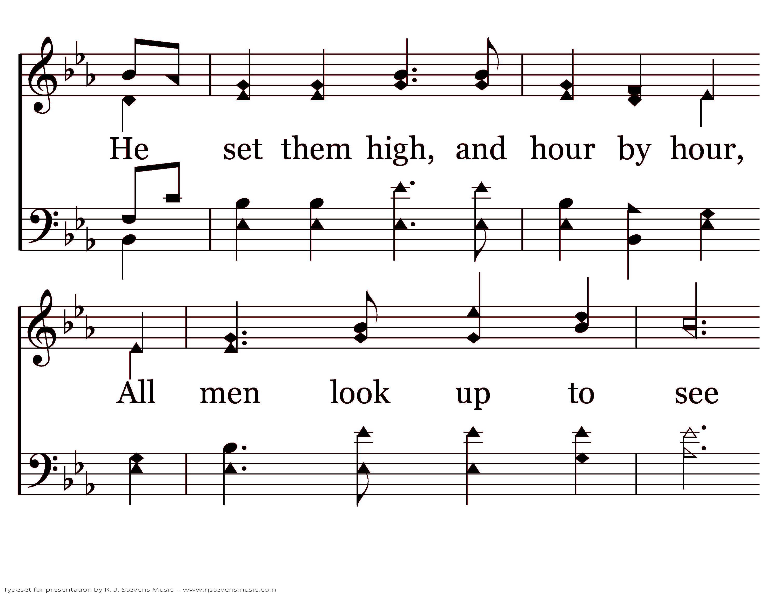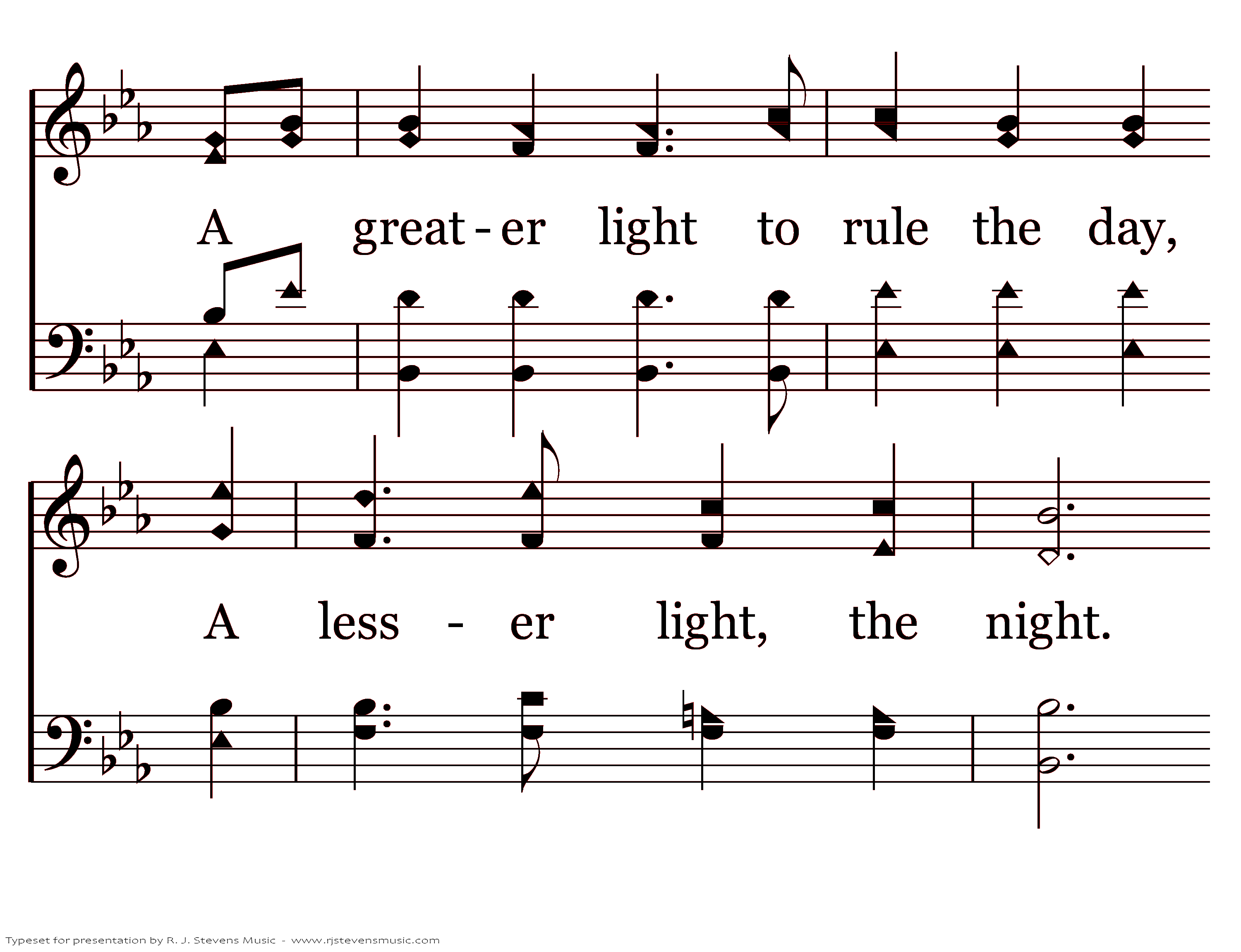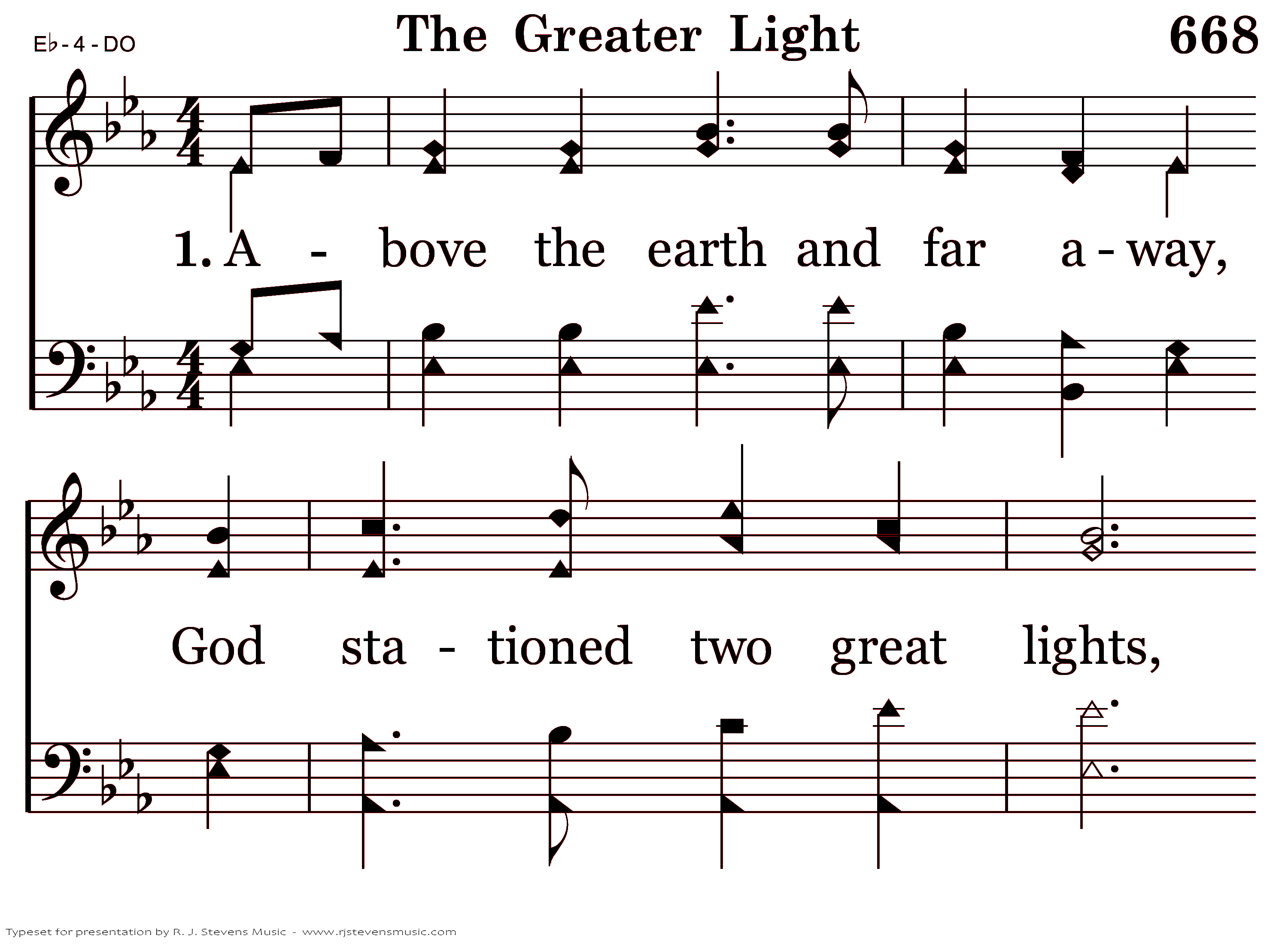 Above the earth and far away, God stationed two great lights, A greater light to rule the day, A lesser light the night. He set them high, and hour by hour, All men look up to see His unseen things: His endless pow'r, And His divinity.
