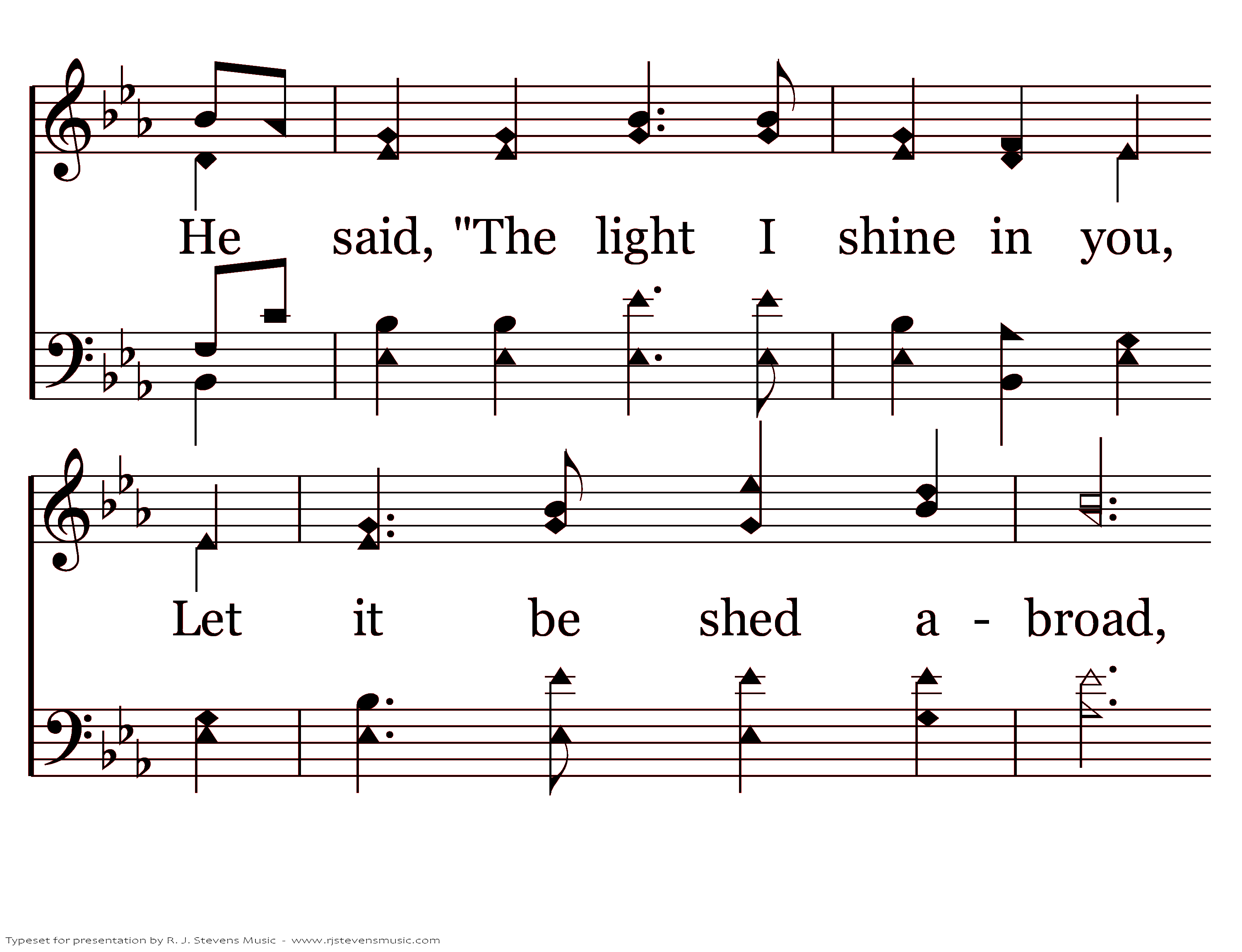 Then shining down from God in heav'n; The greatest Light soon came; He burned into the heart of man And kindled there a flame. He said, "The light I shine in you, let it be shed abroad, So men will see the works you do And glorify your God."