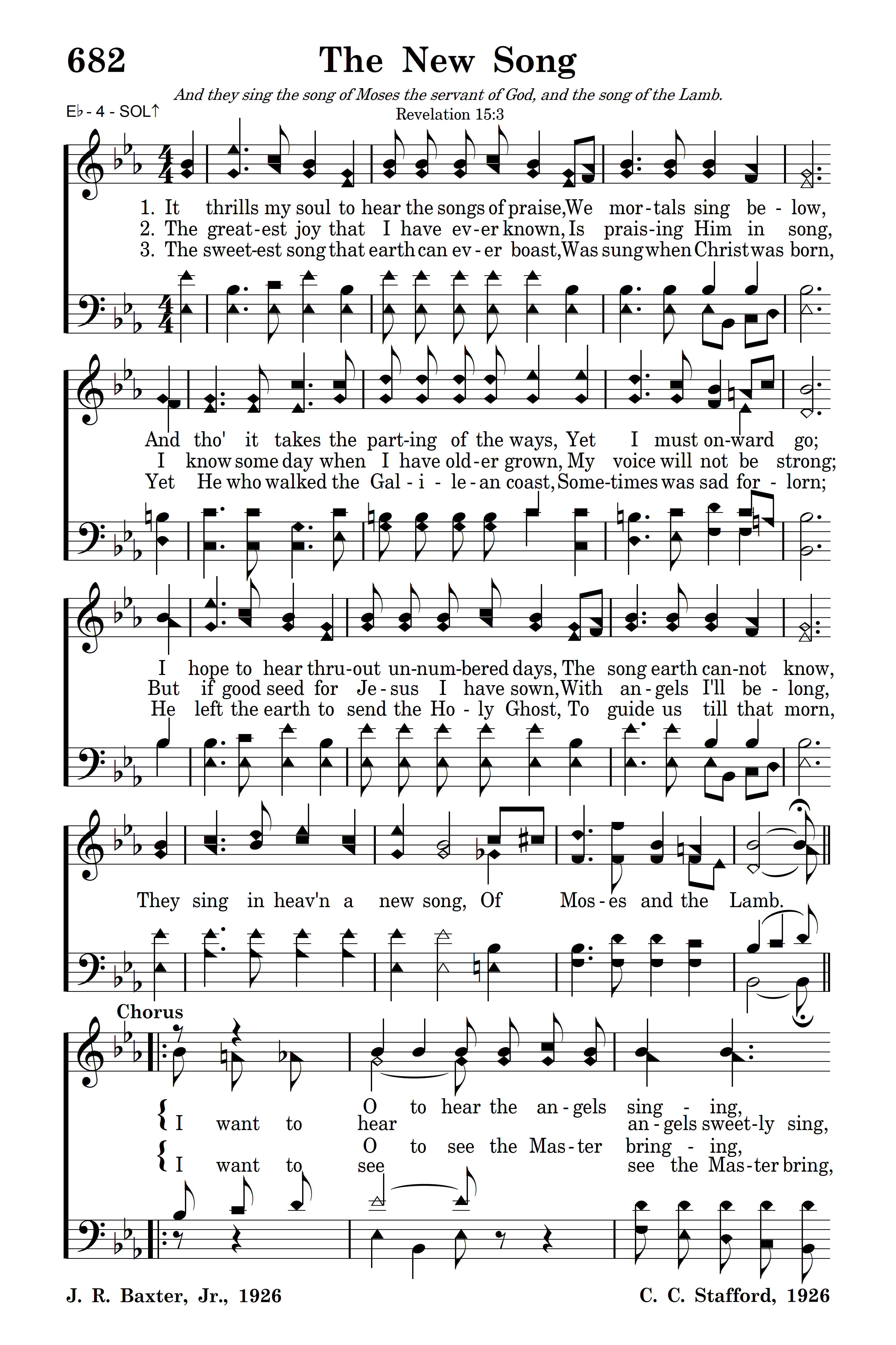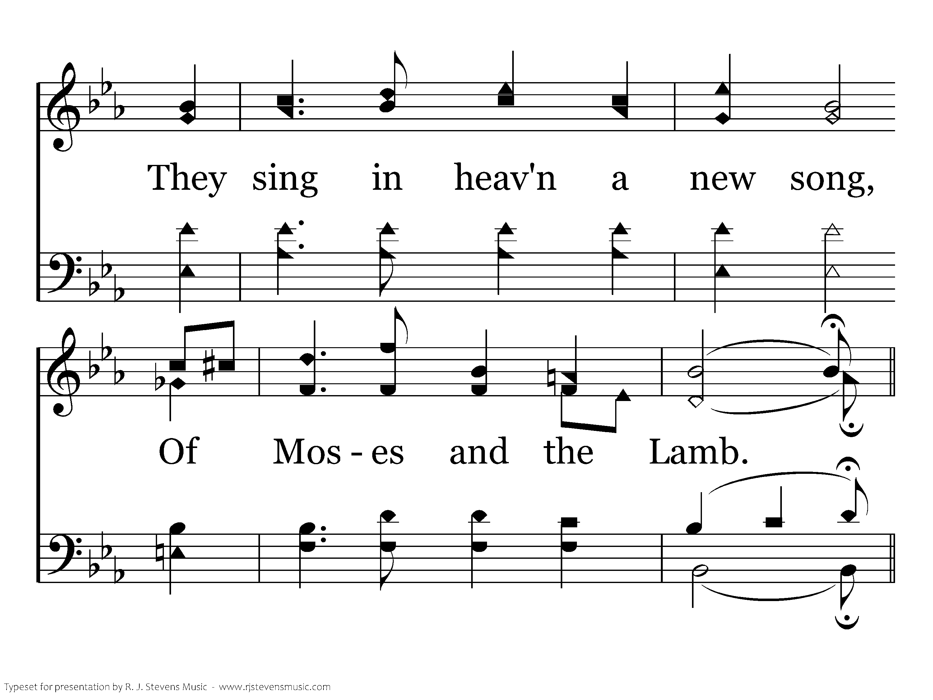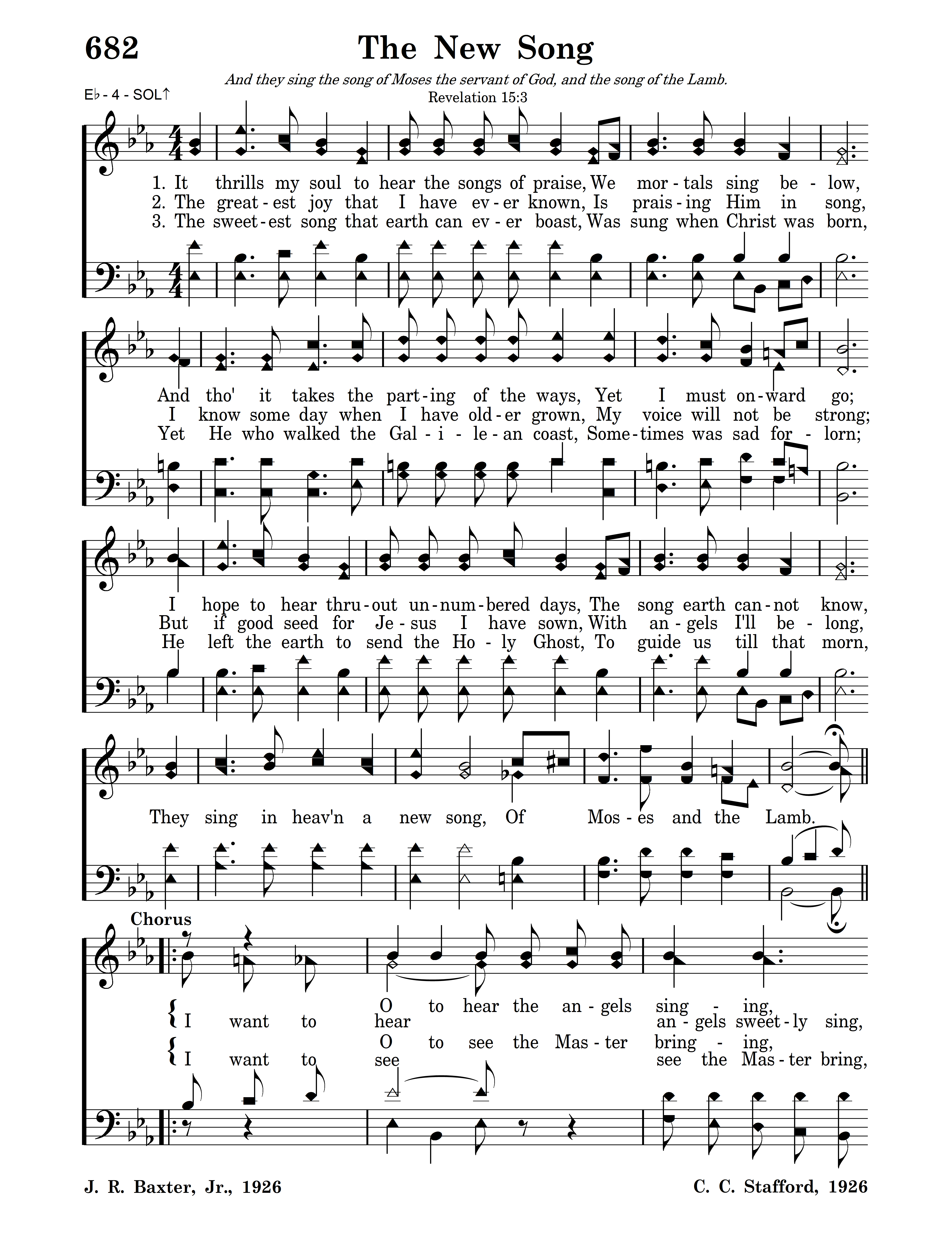 It thrills my soul to hear the songs of praise, We mortals sing below, And tho' it takes the parting of the ways, Yet I must onward go. I hope to hear thruout unnumbered days, The song earth cannot know, They sing in heav'n a new song, Of Moses and the Lamb,