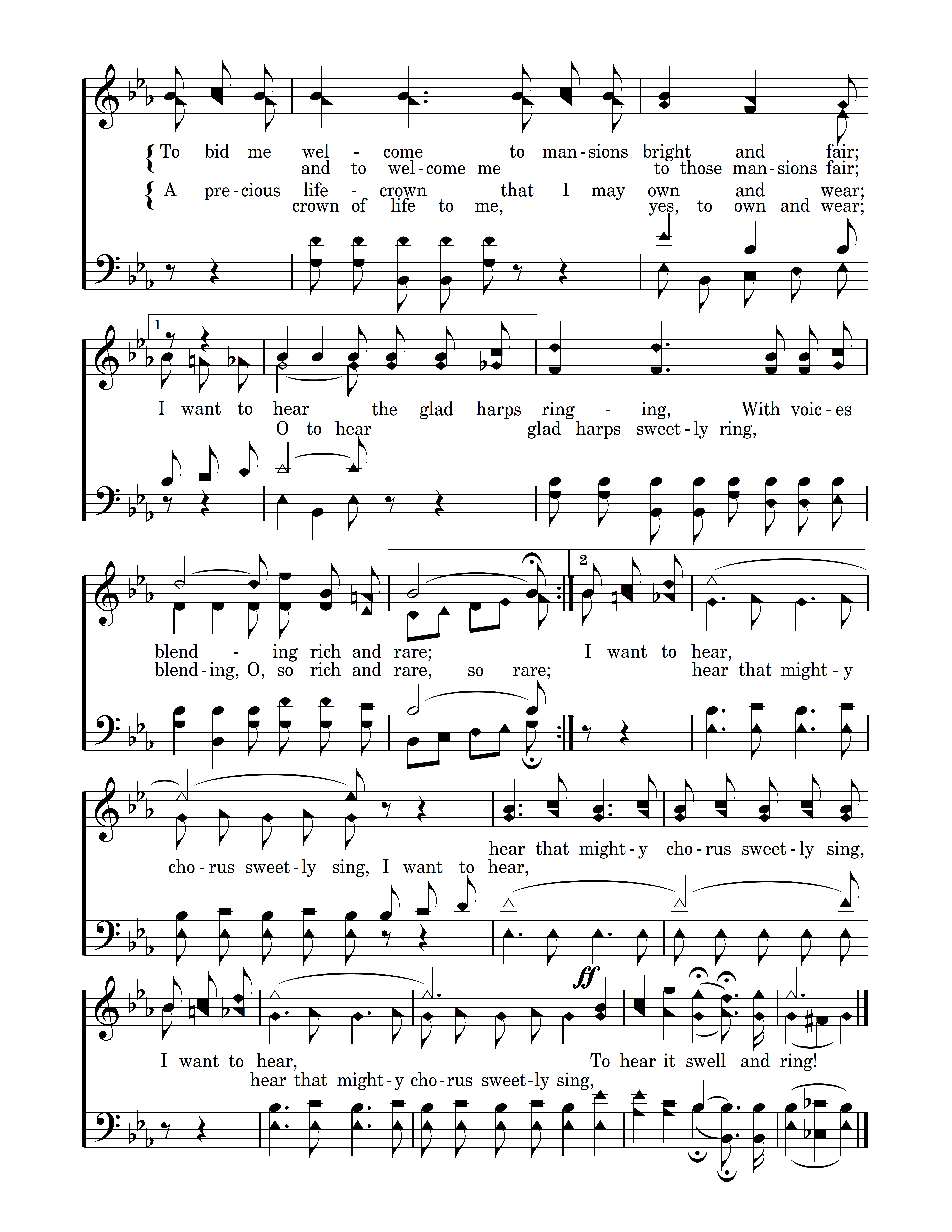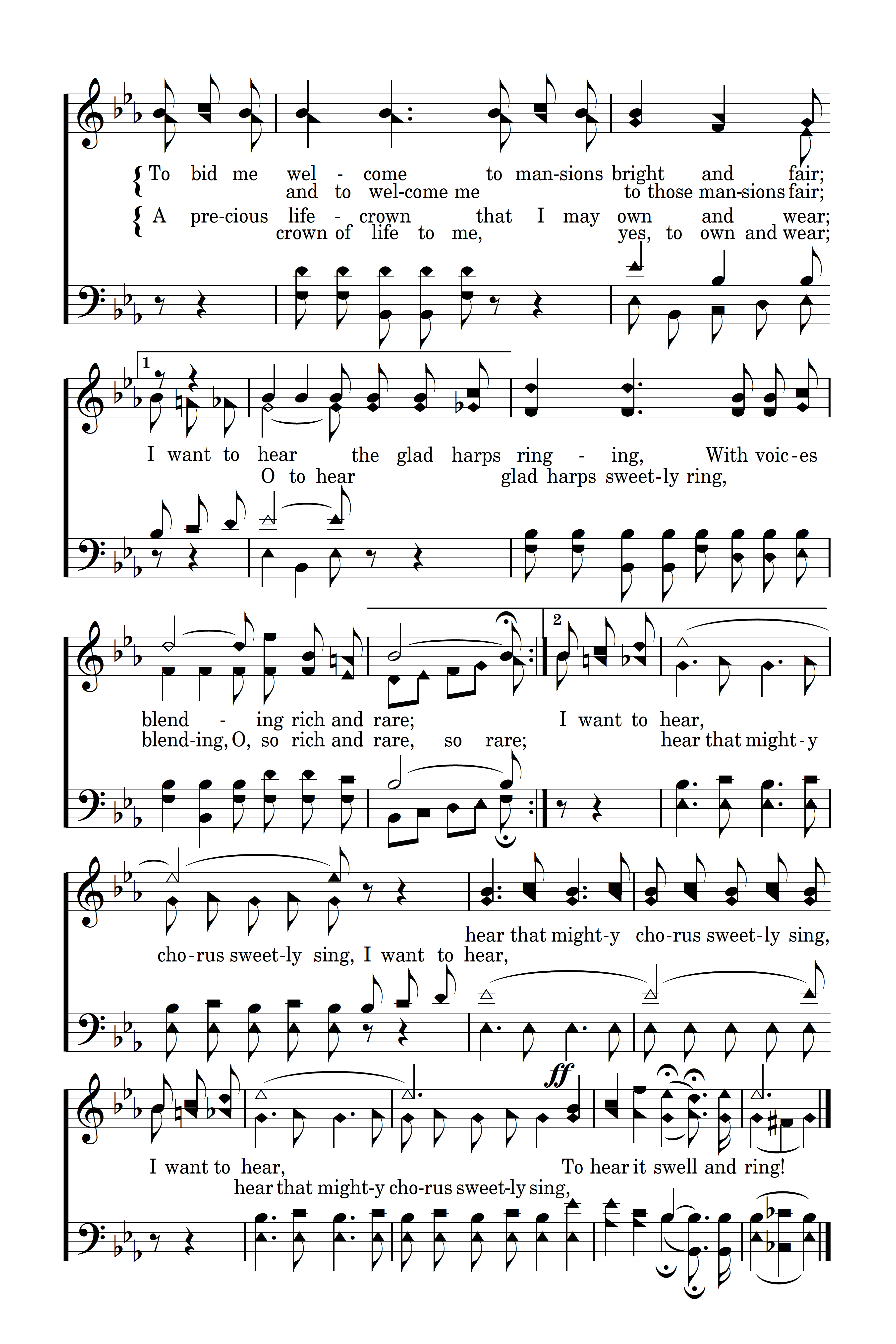 I want to hear angels singing, To bid me welcome to mansions bright and fair; I want to hear the glad harps ringing, with voices blending rich and rare; I want to see the Master bringing, A precious life crown that I may own and wear; I want to hear that mighty chorus sweetly sing, I want to hear that mighty chorus sweetly sing, I want to hear that mighty chorus sweetly sing, To hear it swell and ring.