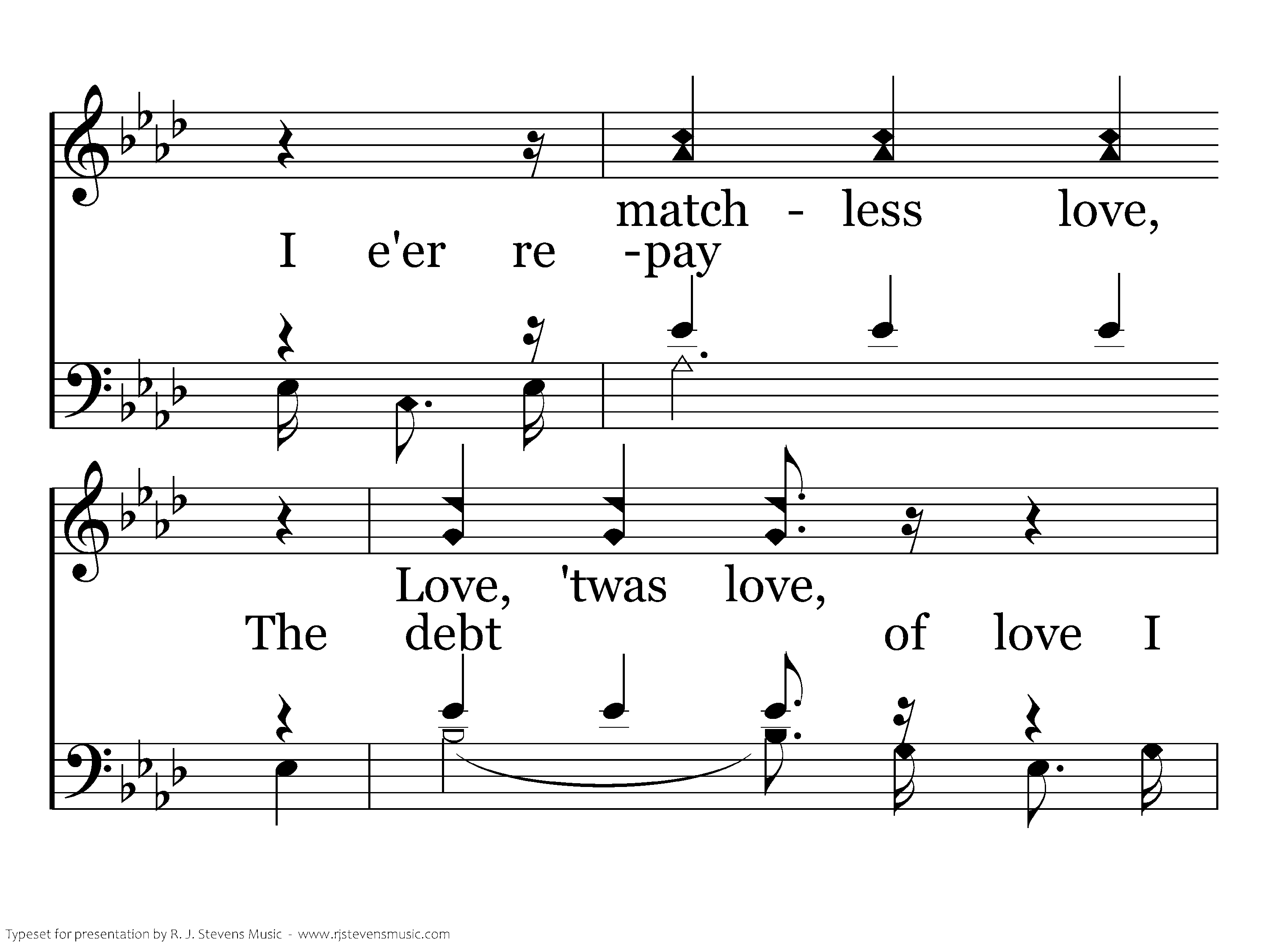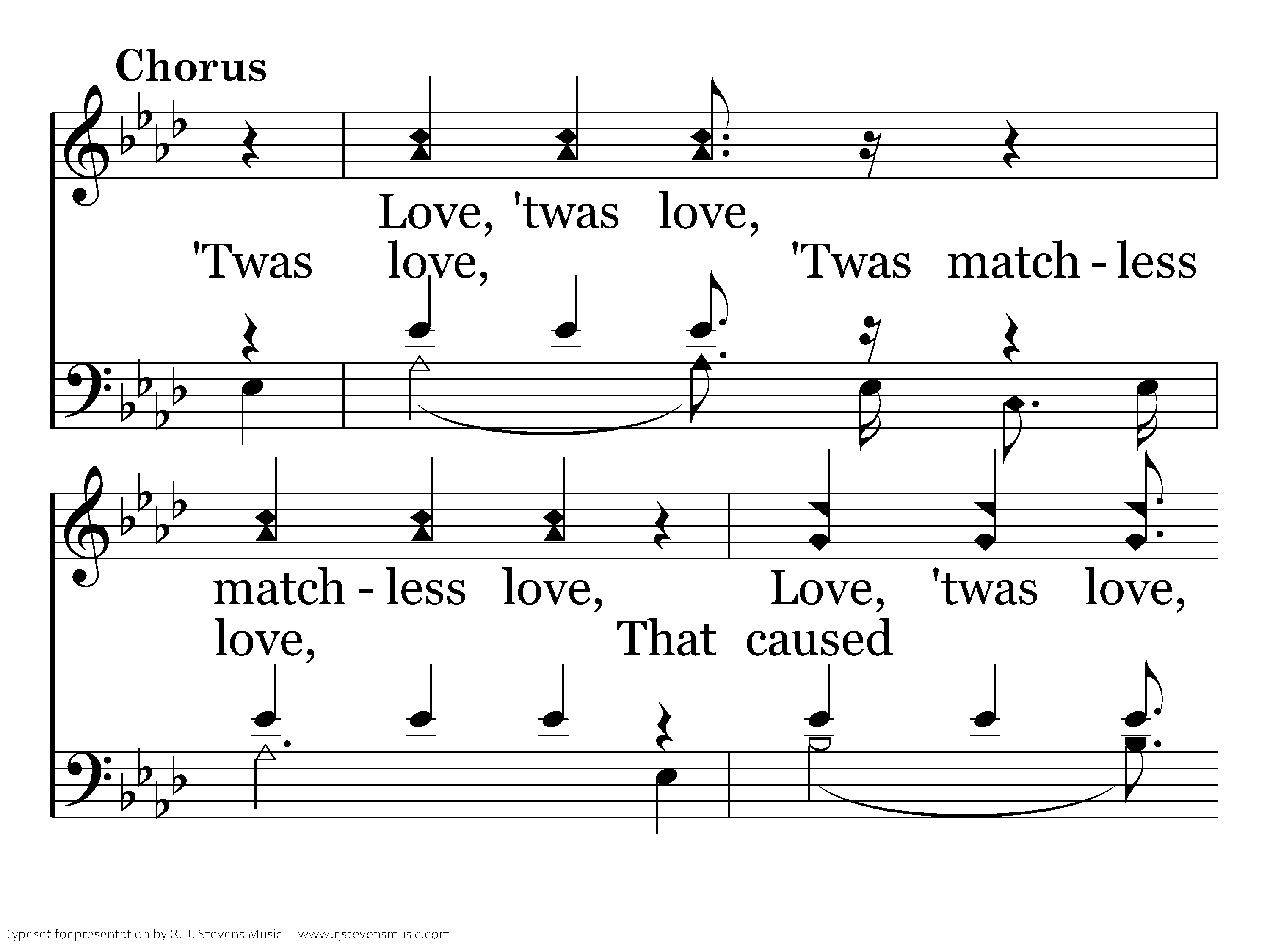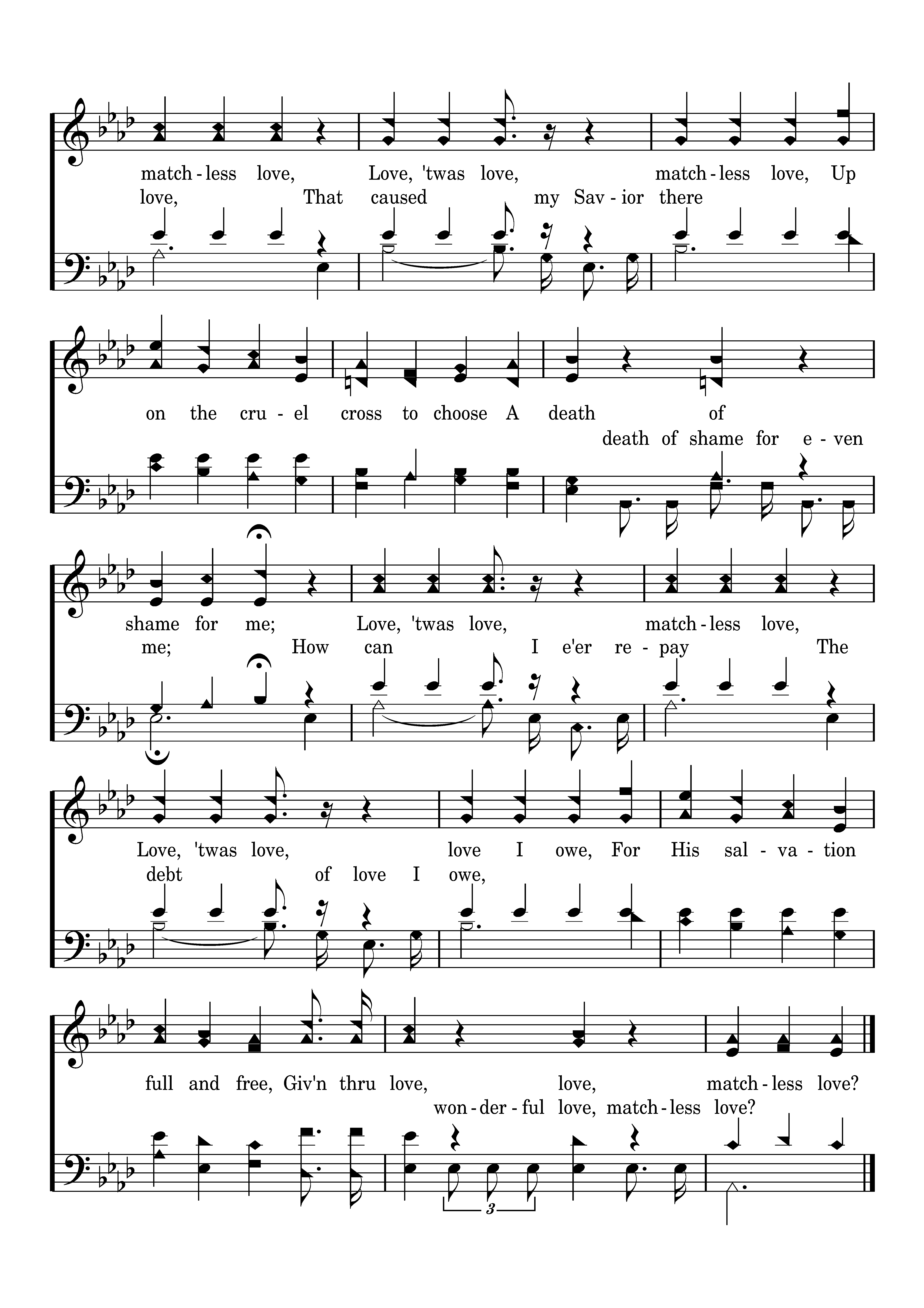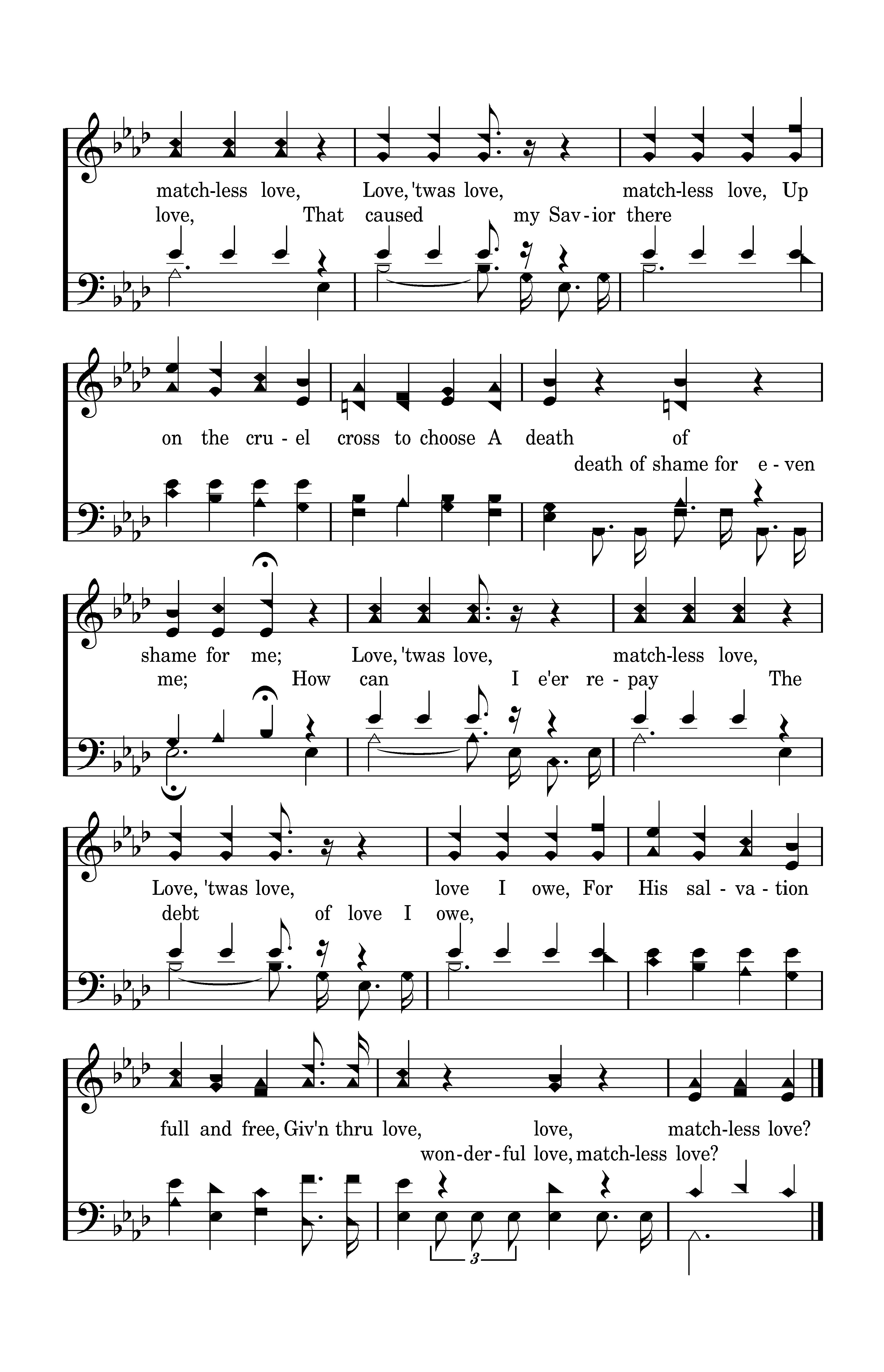 'Twas love, 'Twas matchless love, That caused my Savior there, Upon the cruel cross to choose A death of shame for even me; How can I e'er repay The debt of love I owe, For His salvation full and free, Giv'n thru love, wonderful love, matchless love?